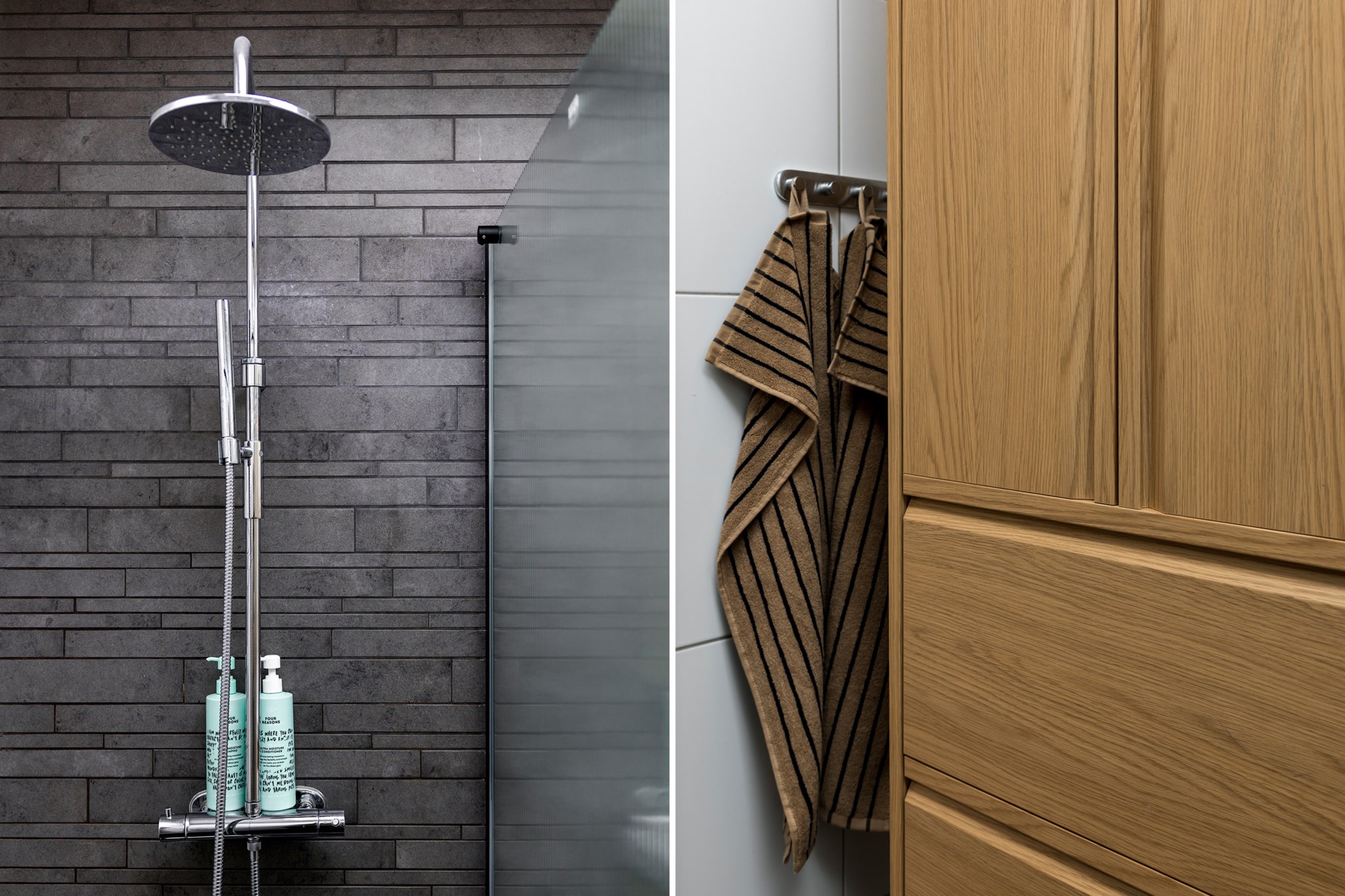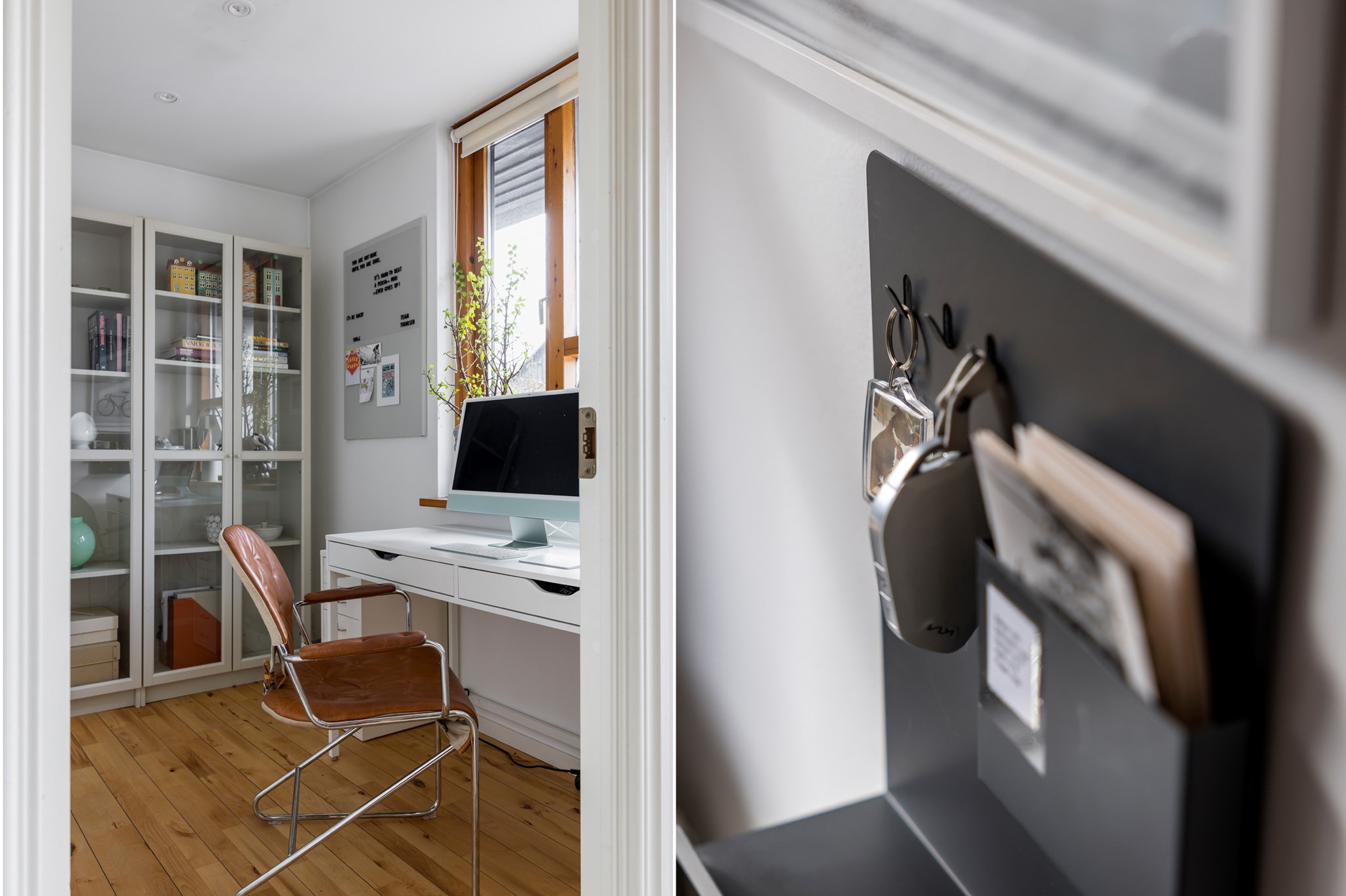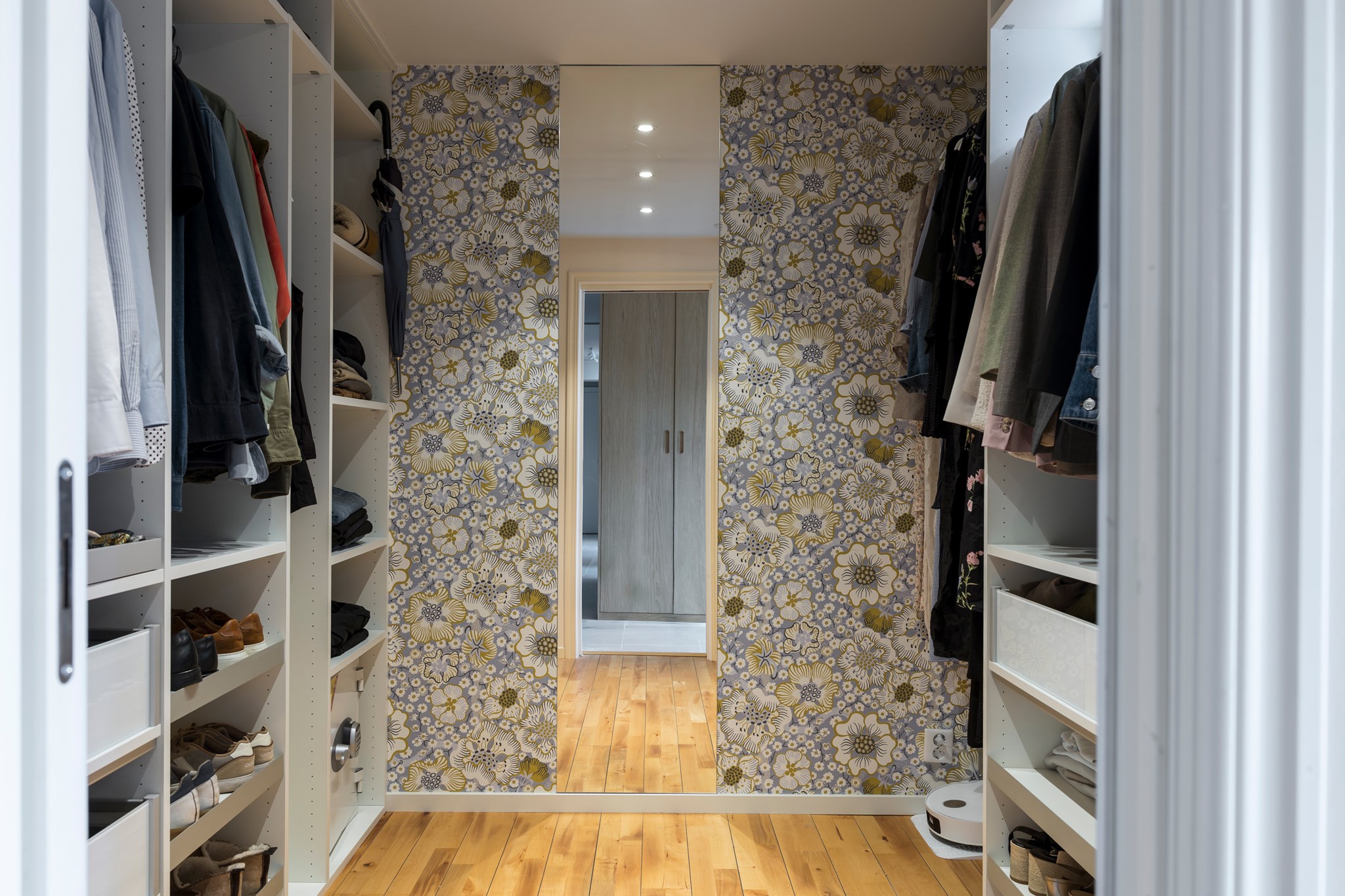 Grå klinker till golv och ljusa väggar. Generös förvaring i garderob med skjutdörrar. Utgång till inglasat uterum.