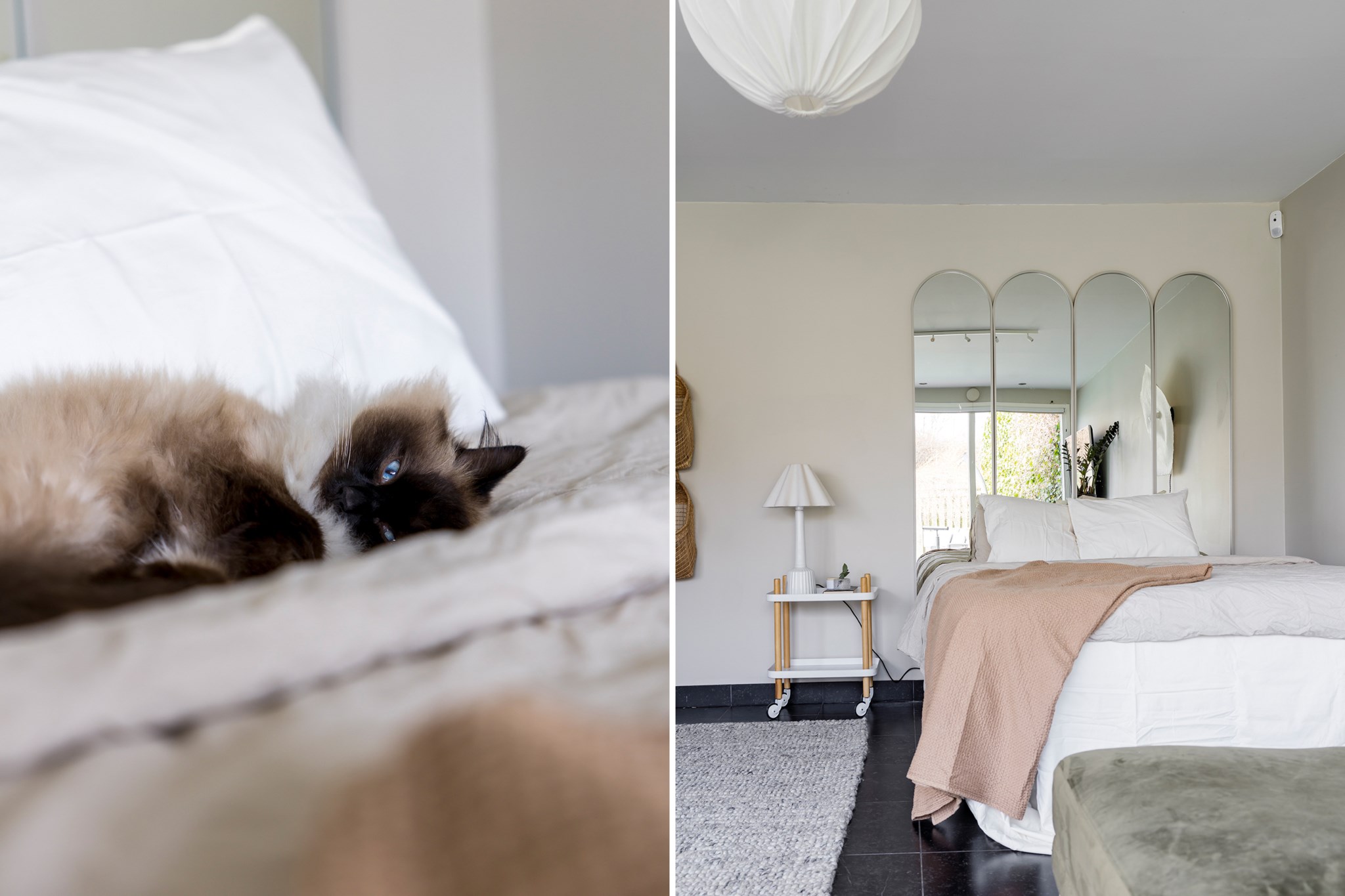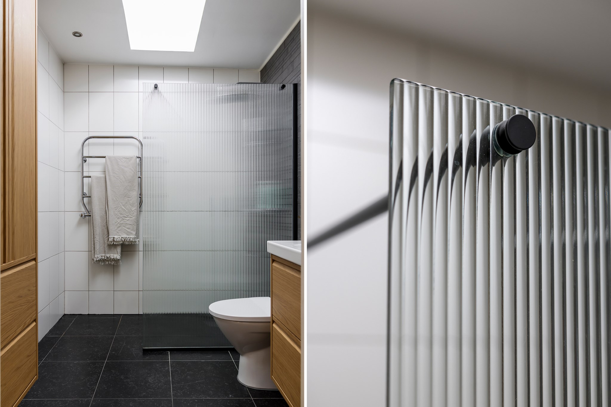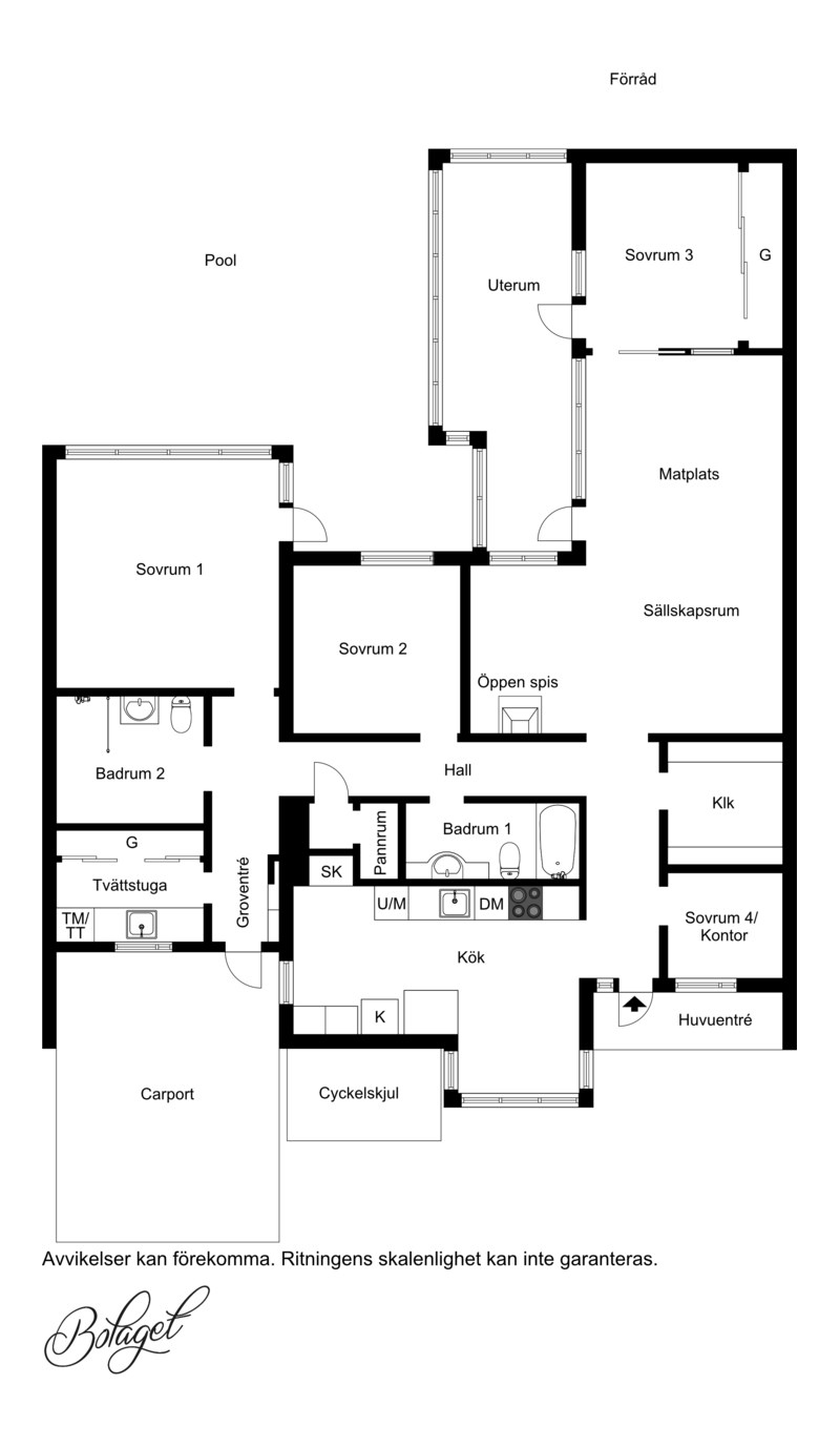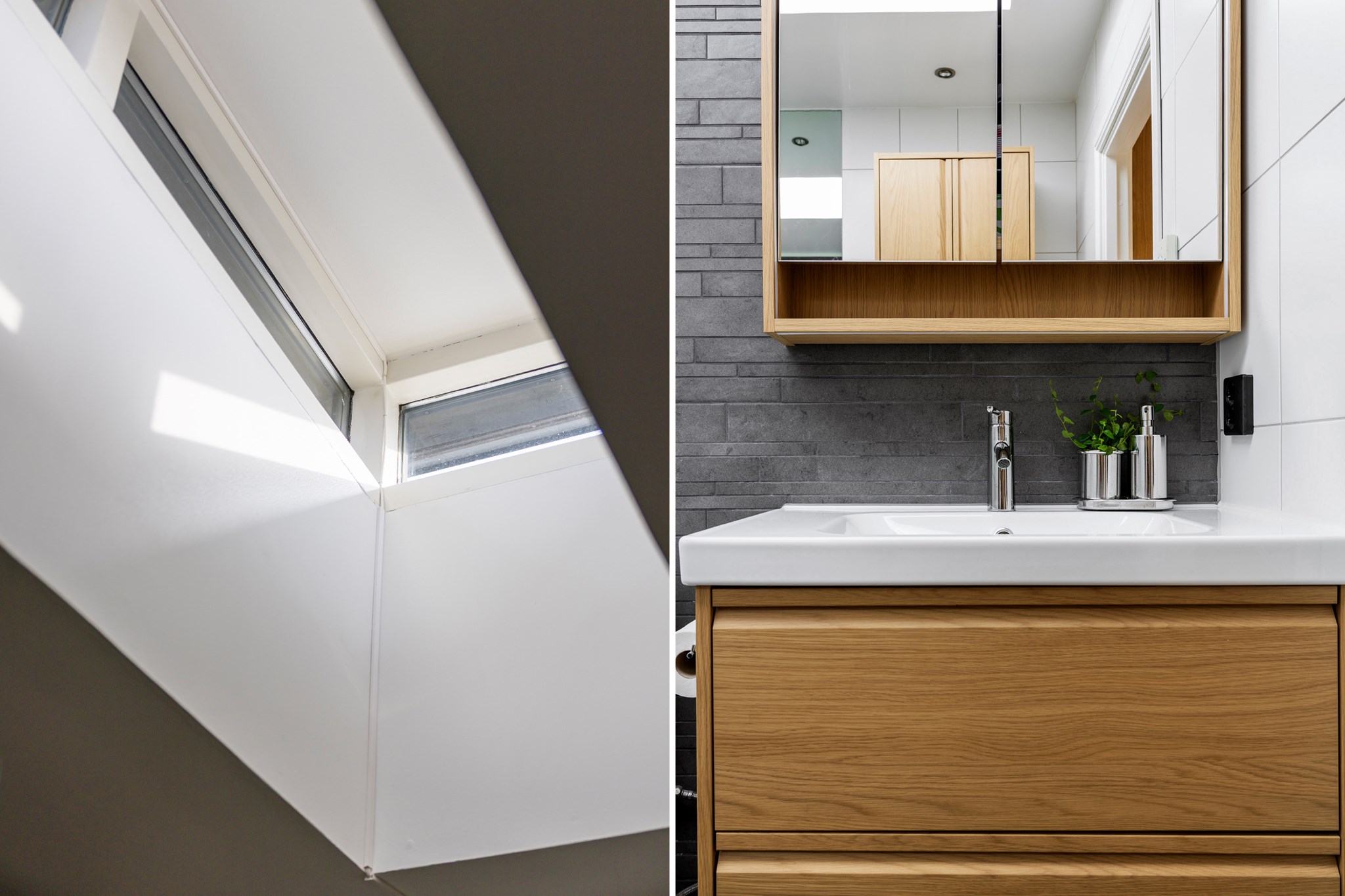 Grå klinker till golv och ljusa väggar. Generös förvaring i garderob med skjutdörrar. Utgång till inglasat uterum.