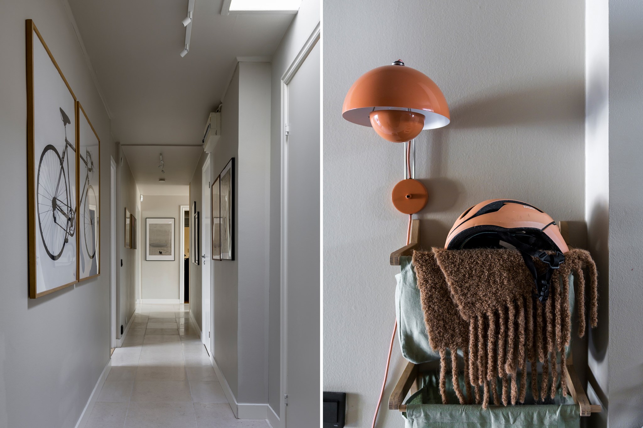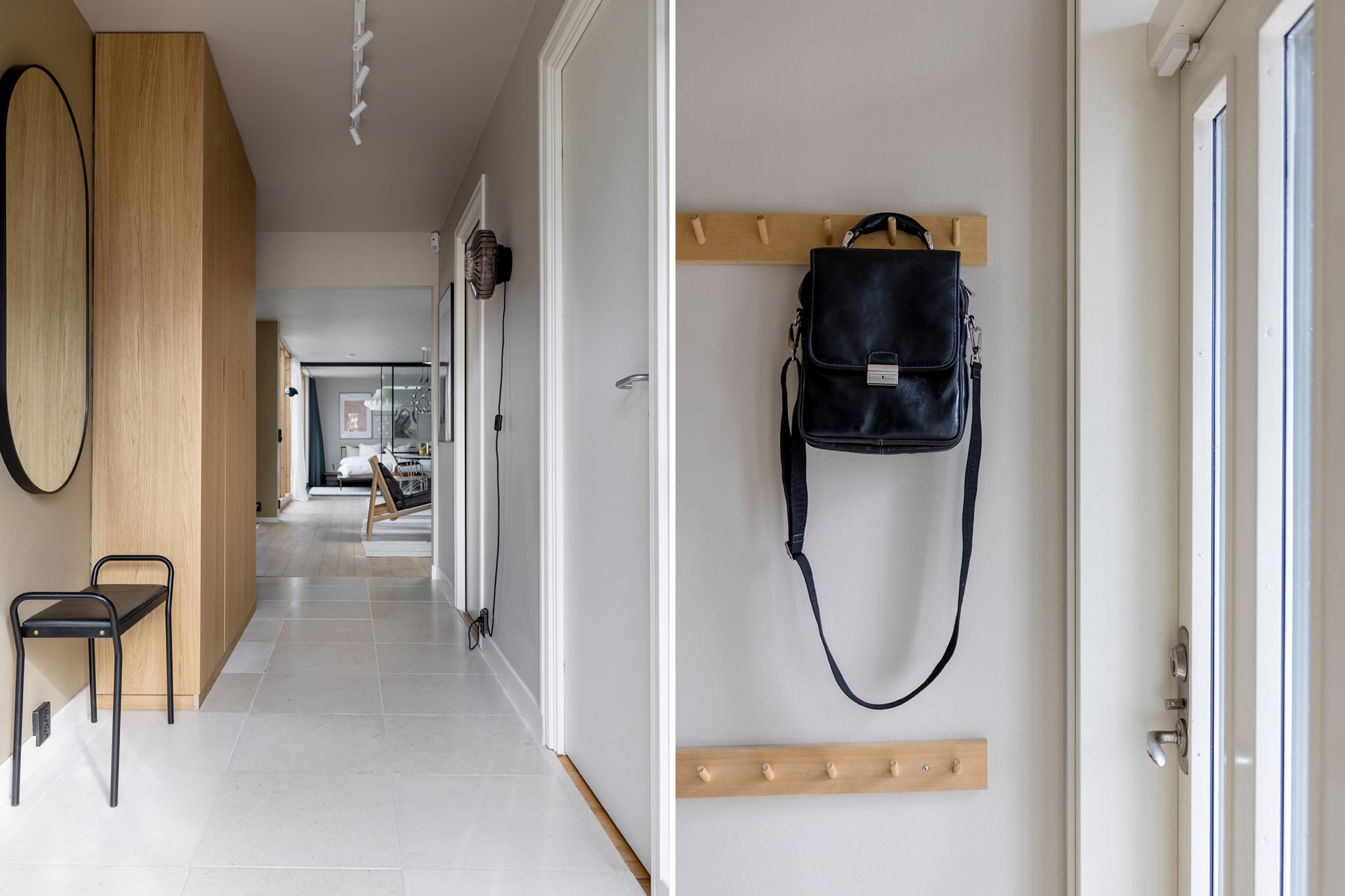 Kalkstensgolv och ljusa väggar. Plats för avhängning. Garderobsförvaring.