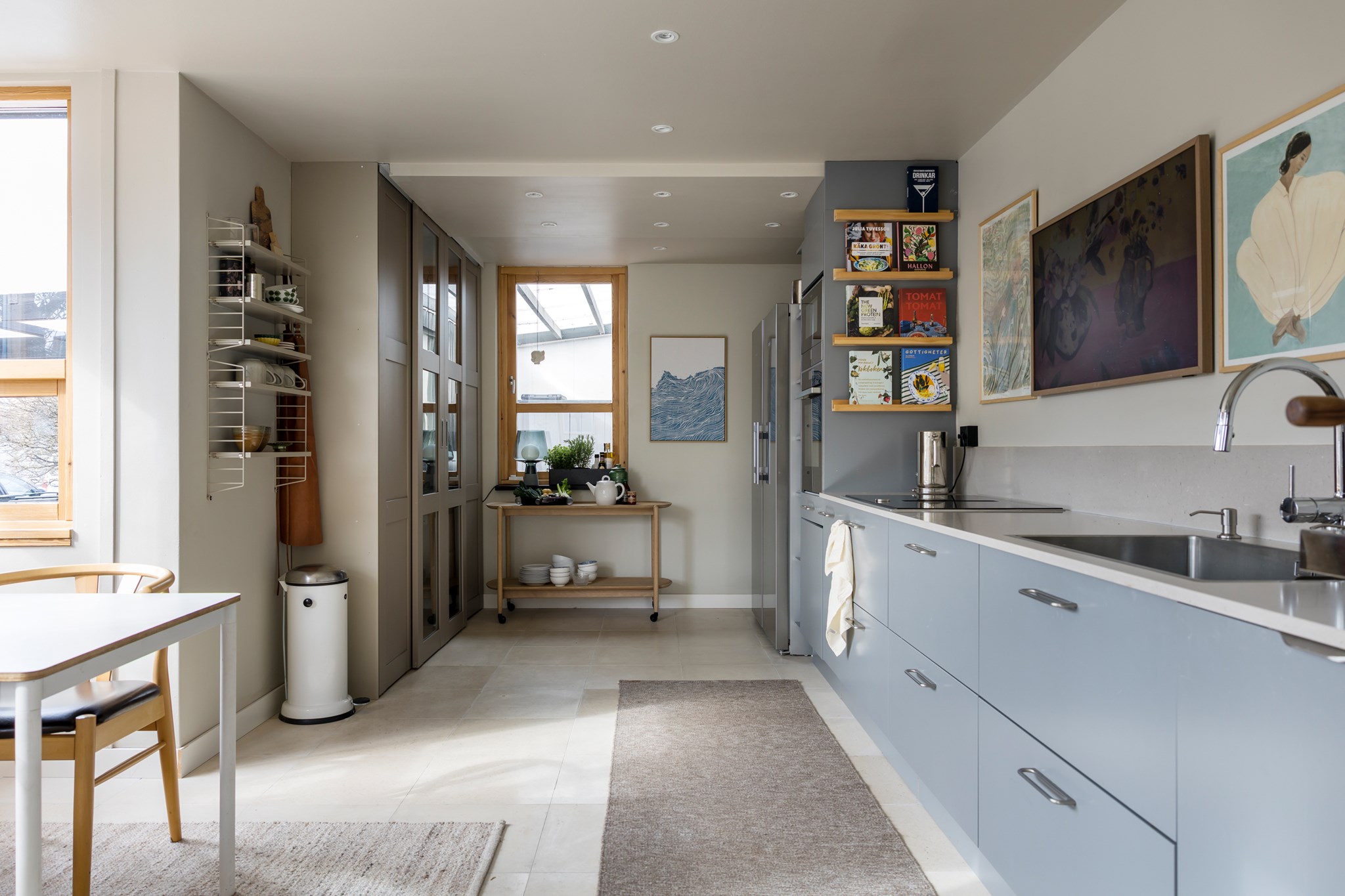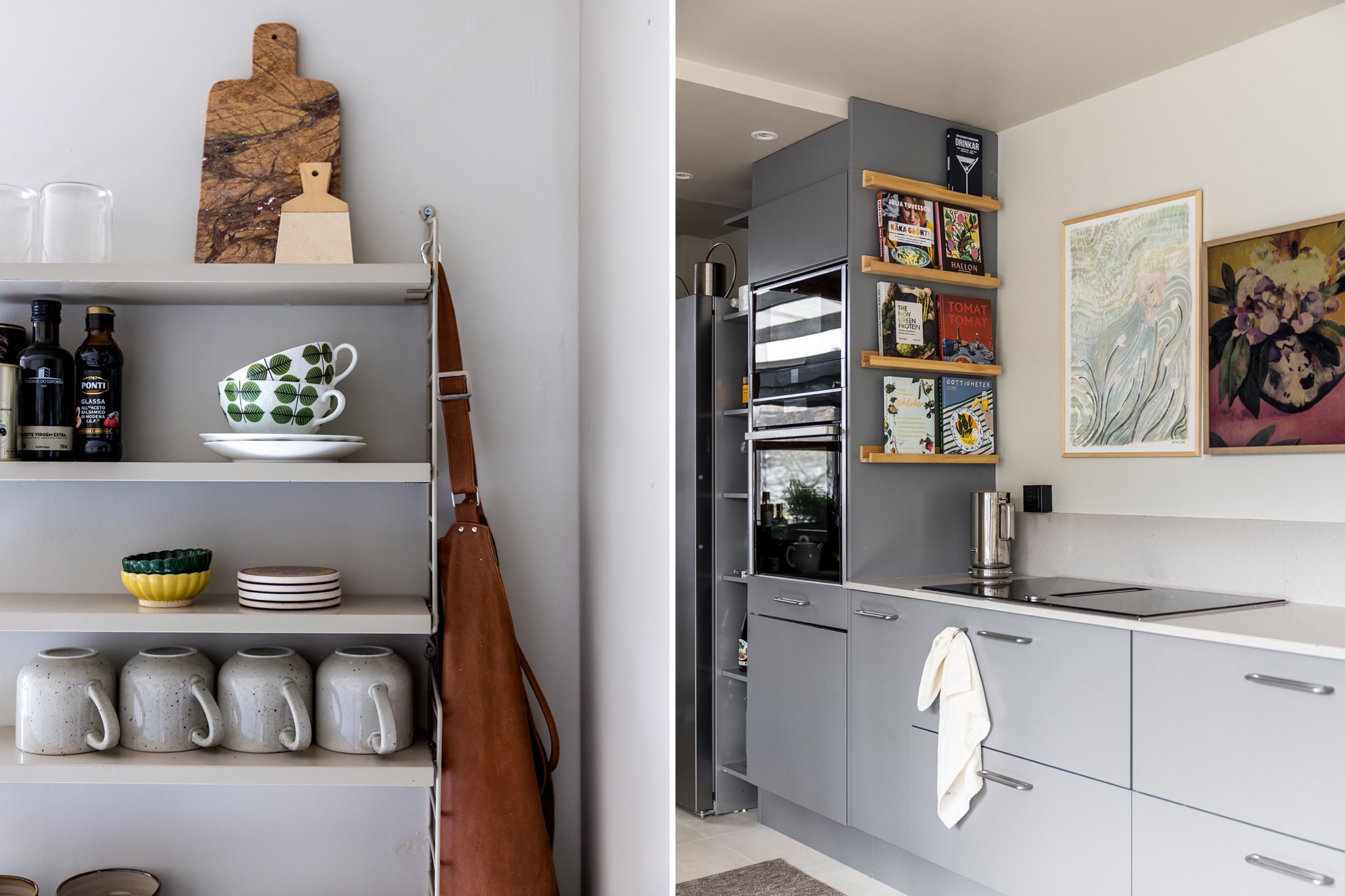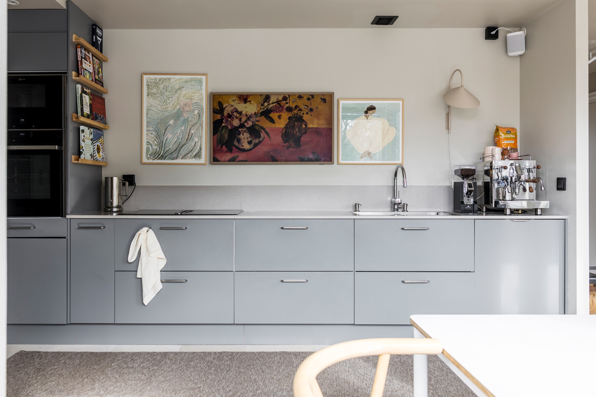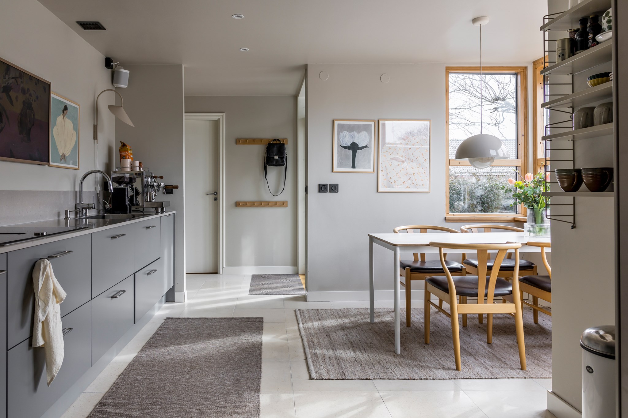Kalkstensgolv och ljusgrå väggar. Grå köksinredning från Marboda. Maskinell utrustning i form av induktionshäll med integrerad fläkt, ugn samt kombiugn (NEFF), diskmaskin (ASKO). Inredning och vitvaror från 2025. Plats för matgrupp.
