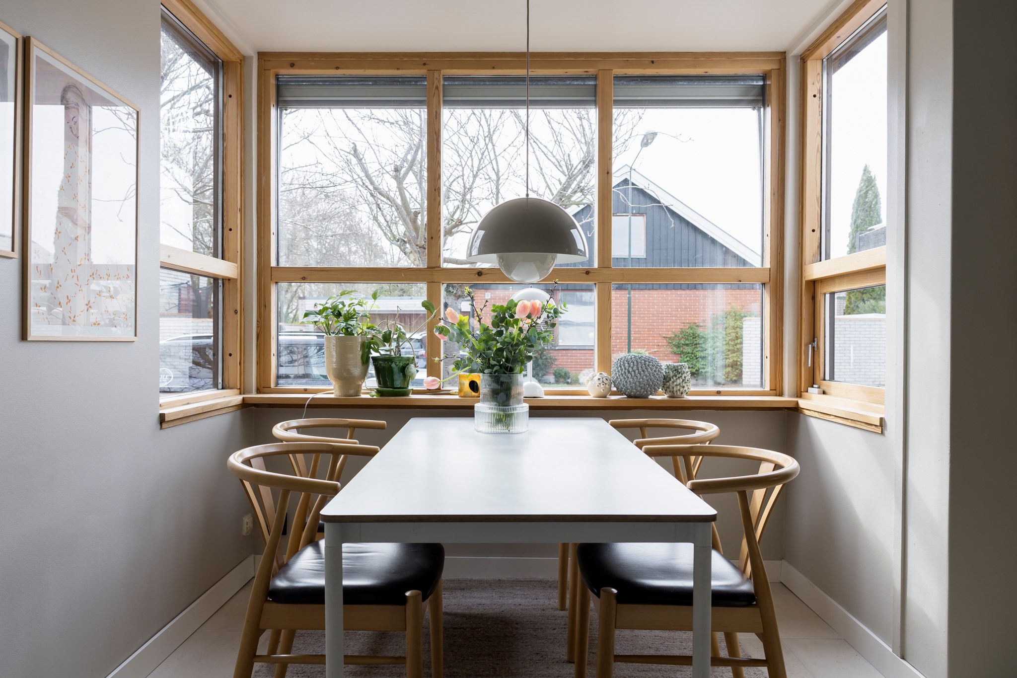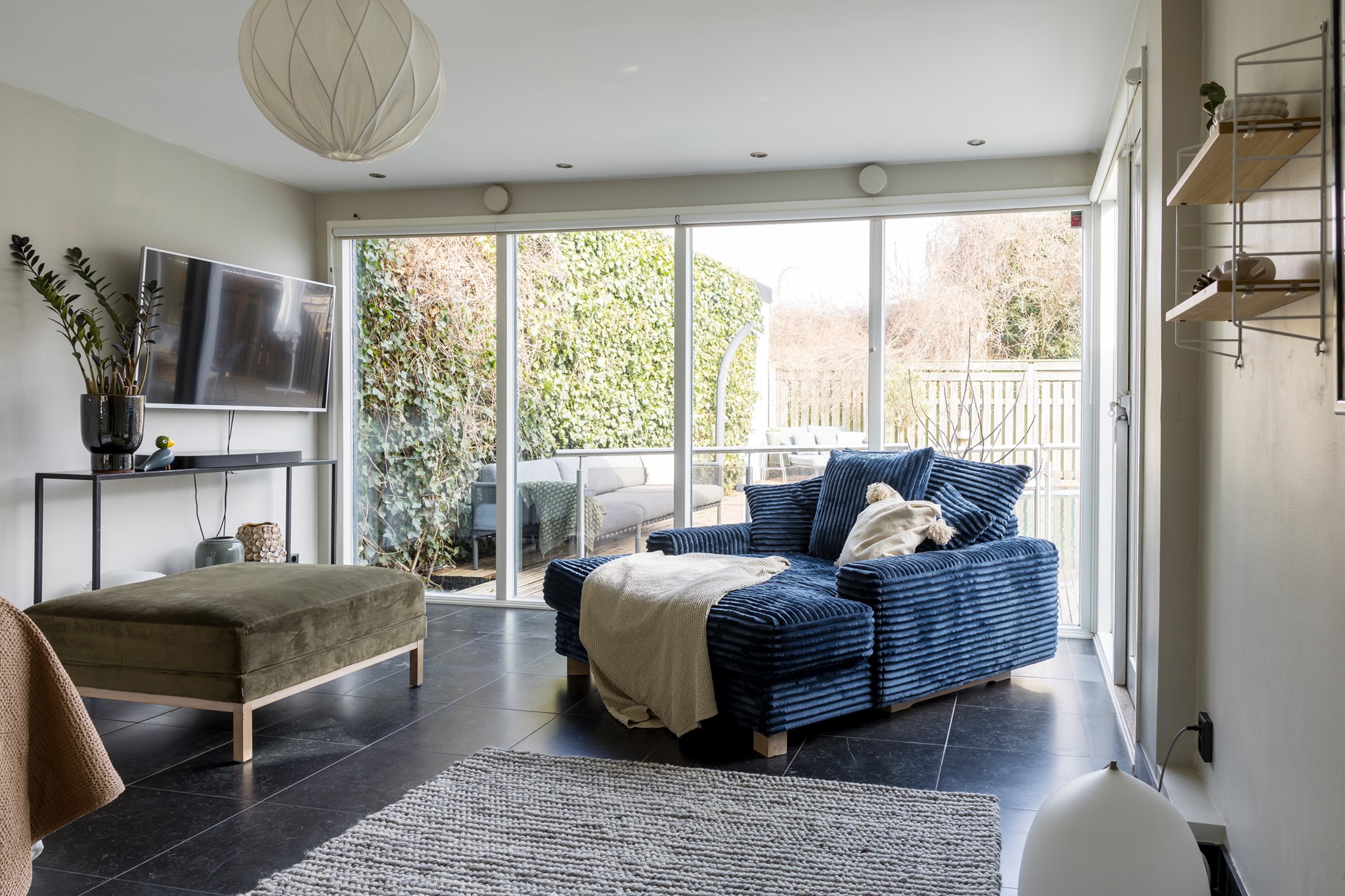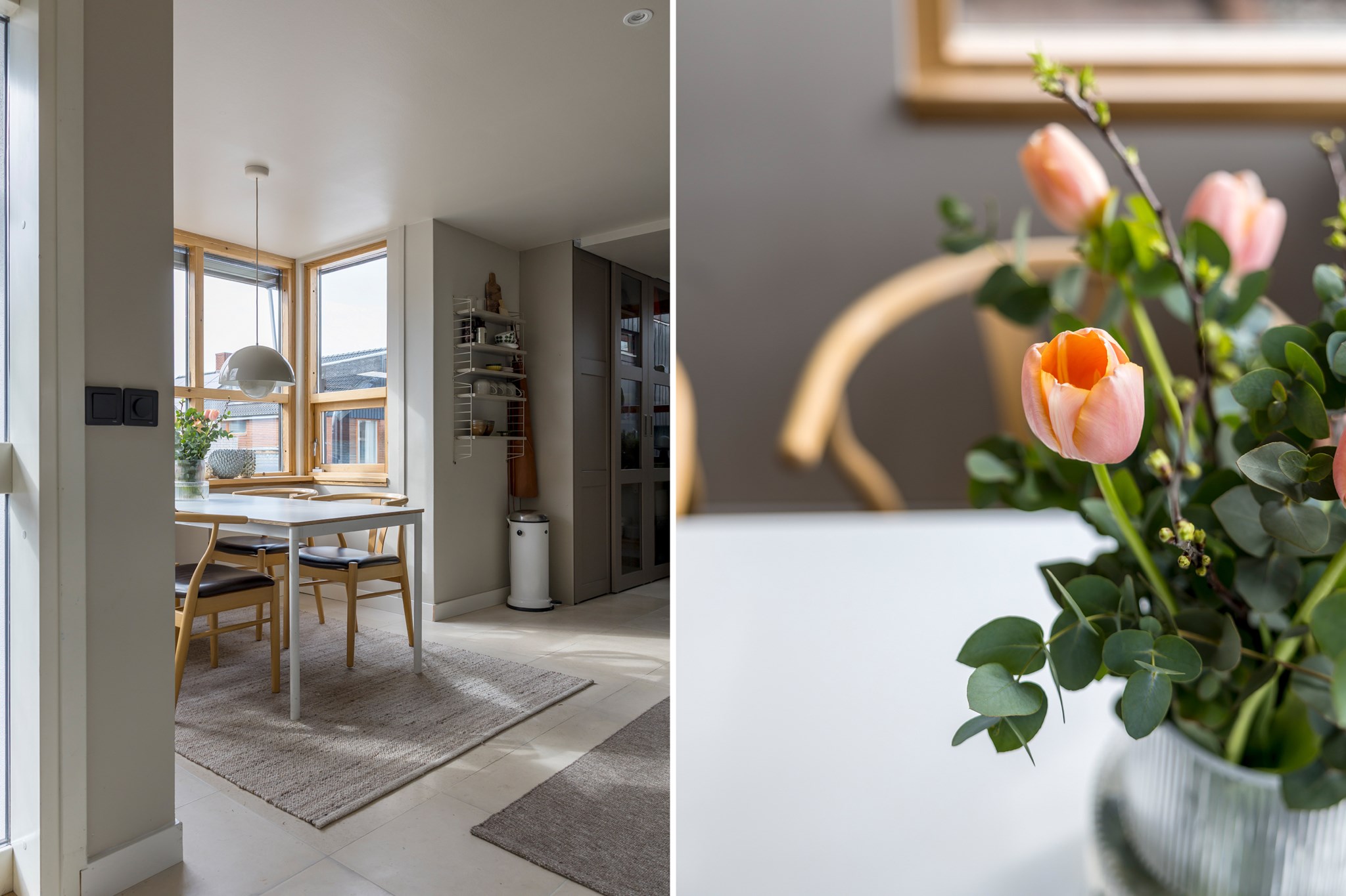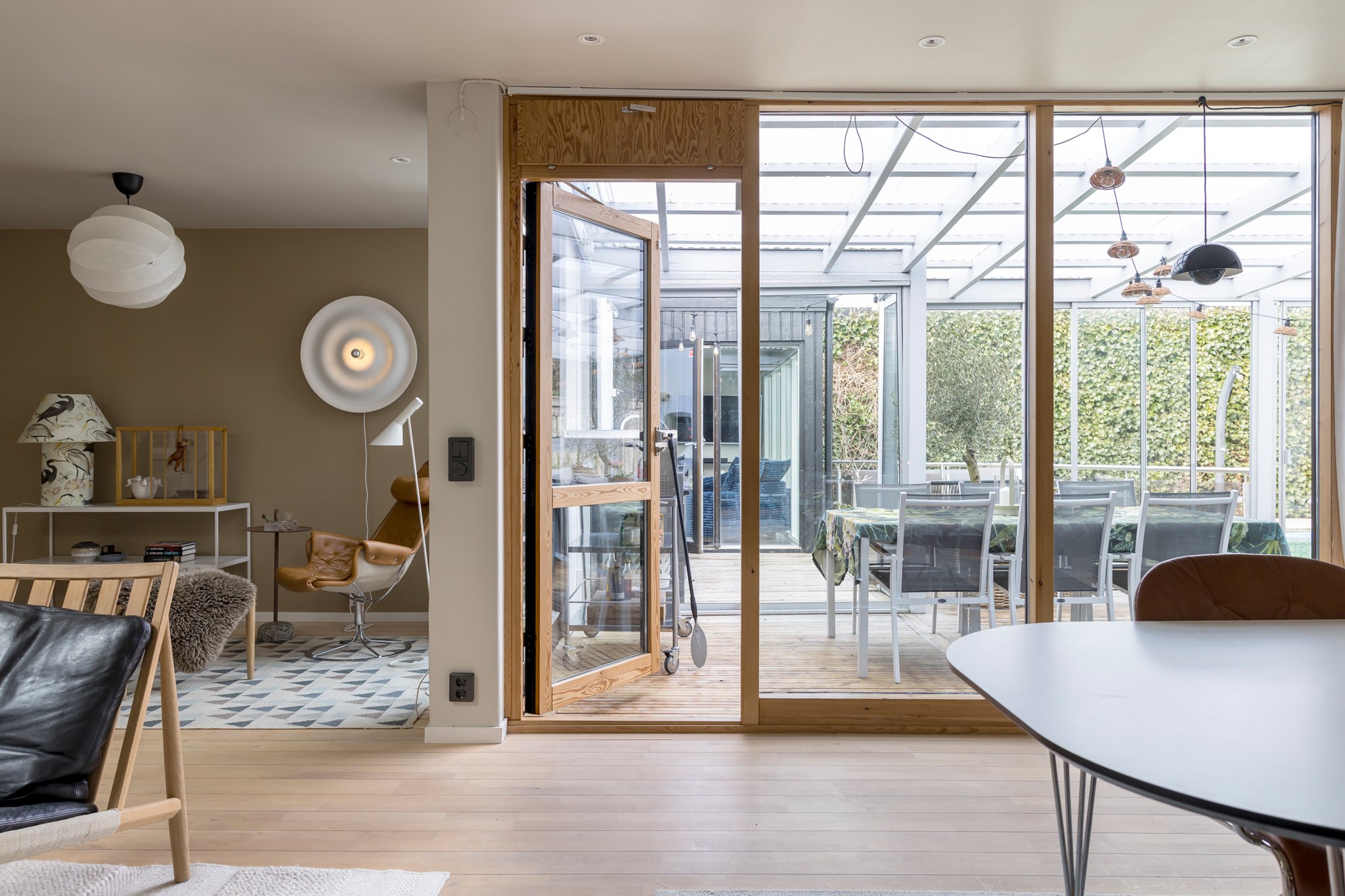 Grå klinker till golv och ljusa väggar med stort glasparti. Utgång till uteplats.