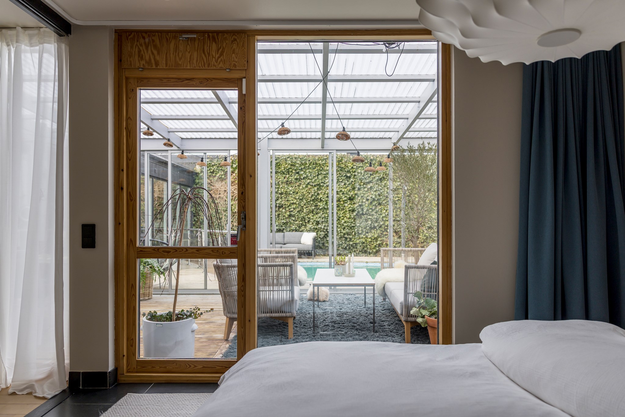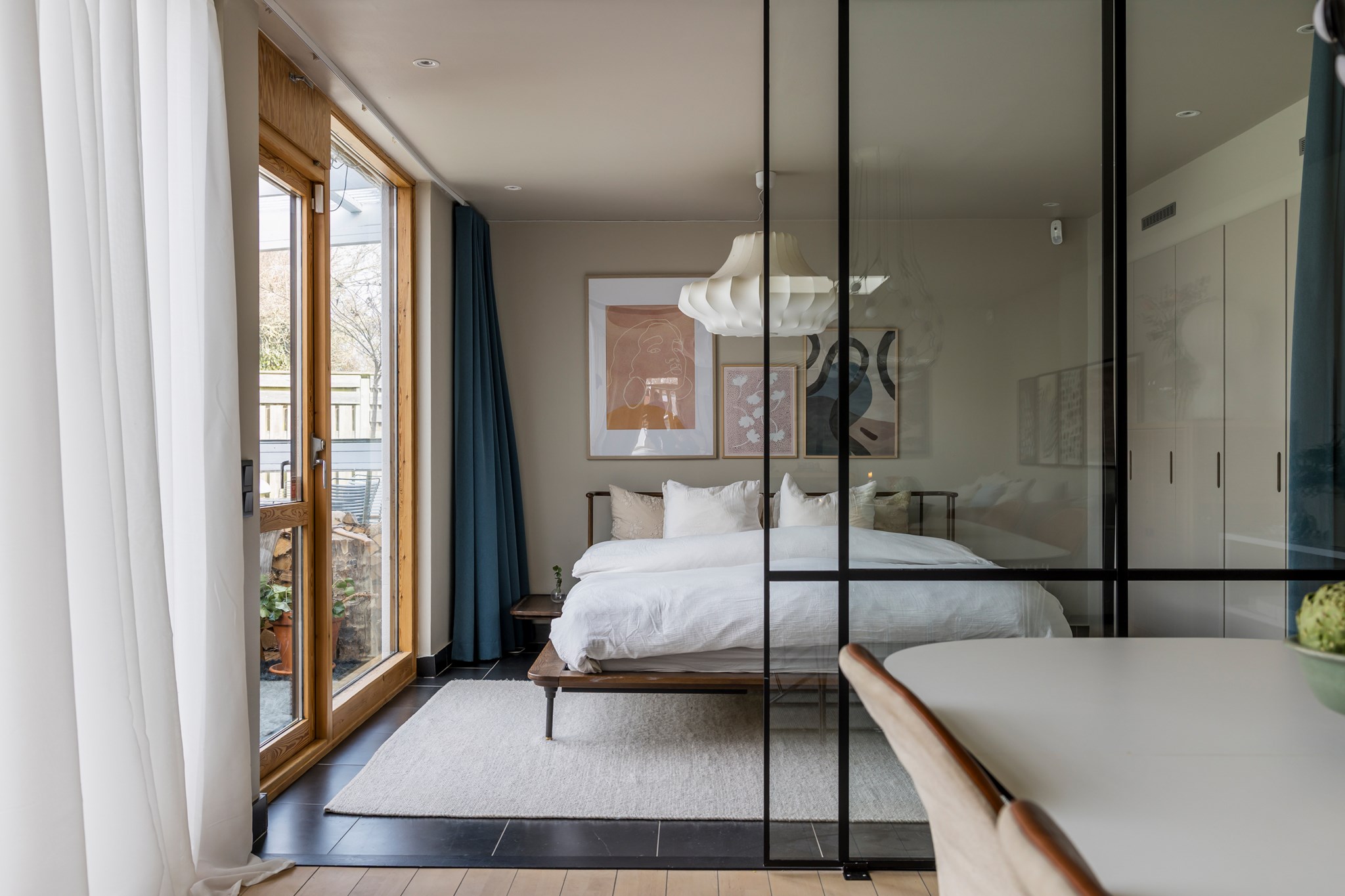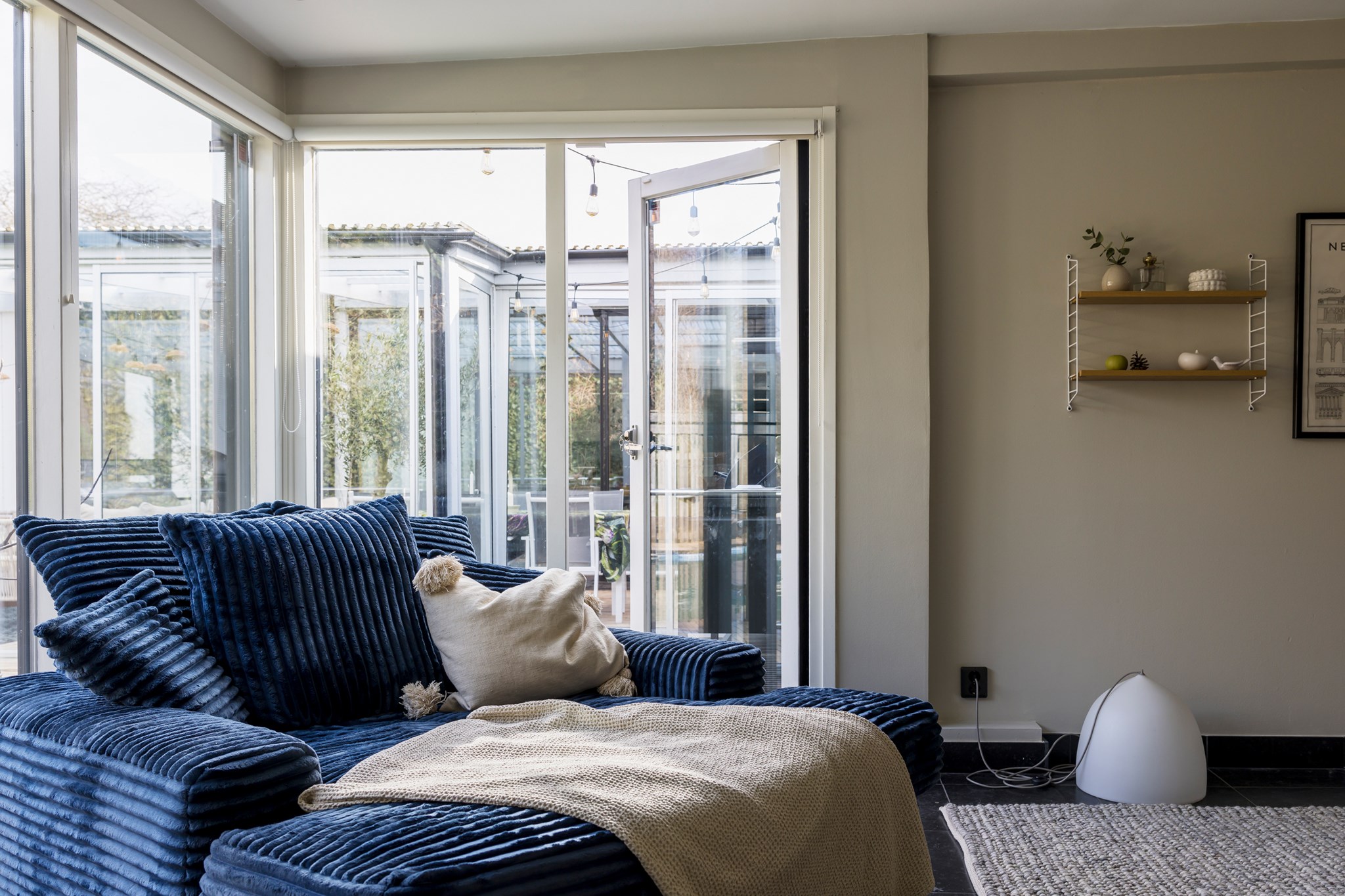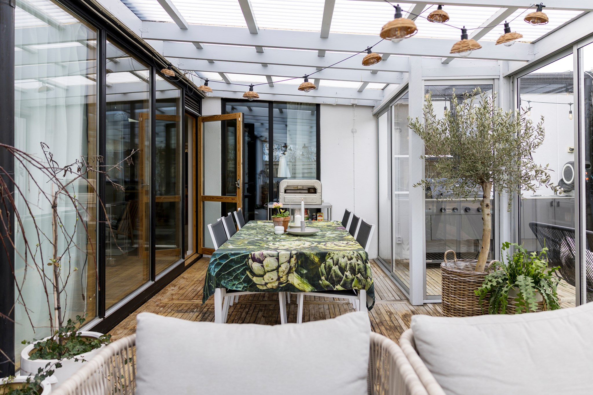 Grå klinker till golv och ljusa väggar med stort glasparti. Utgång till uteplats.