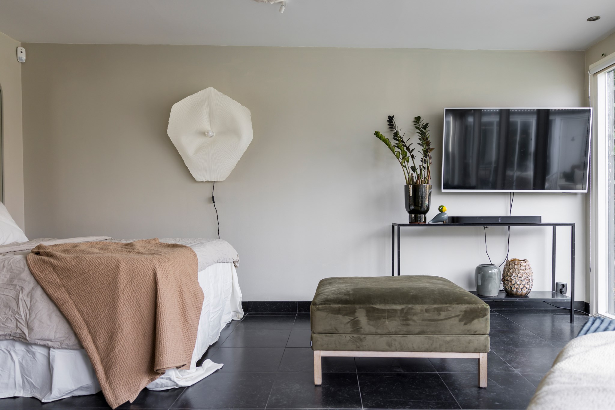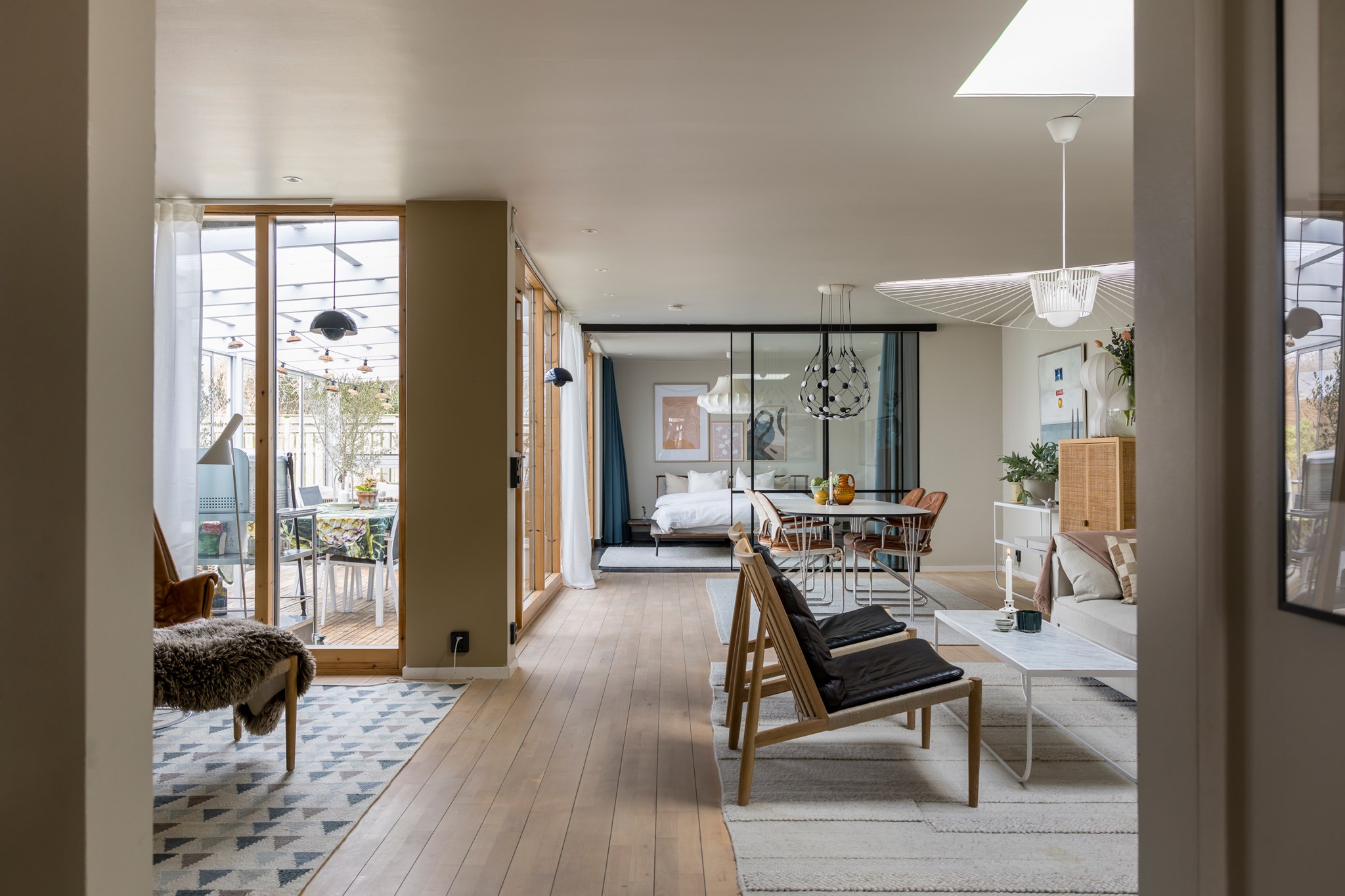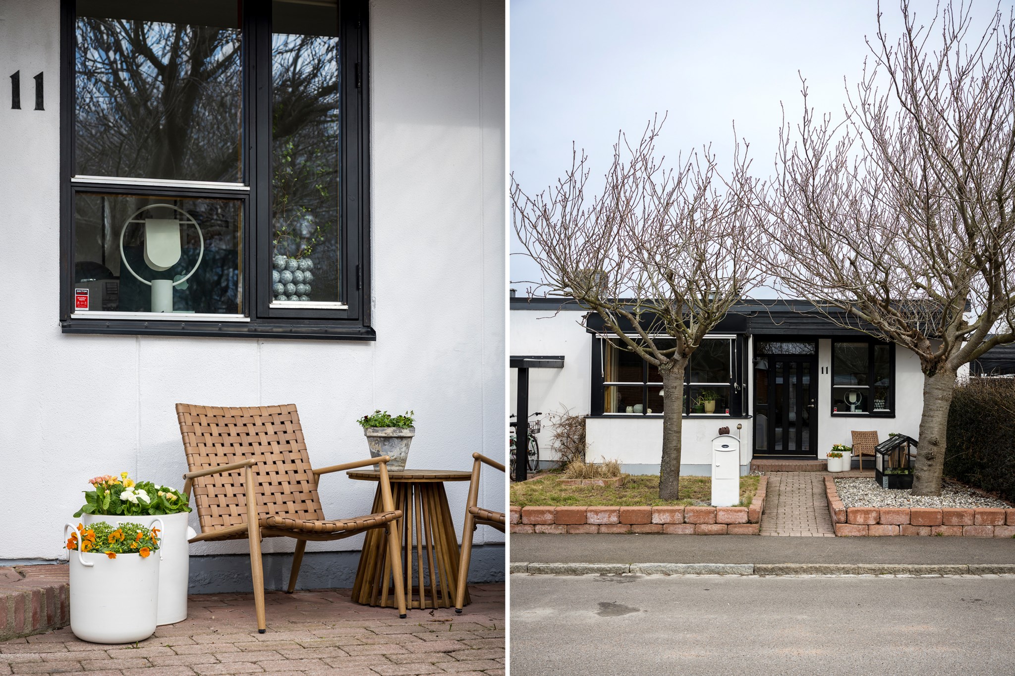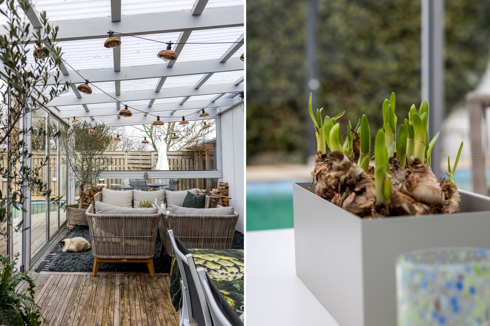 Grå klinker till golv och ljusa väggar med stort glasparti. Utgång till uteplats.