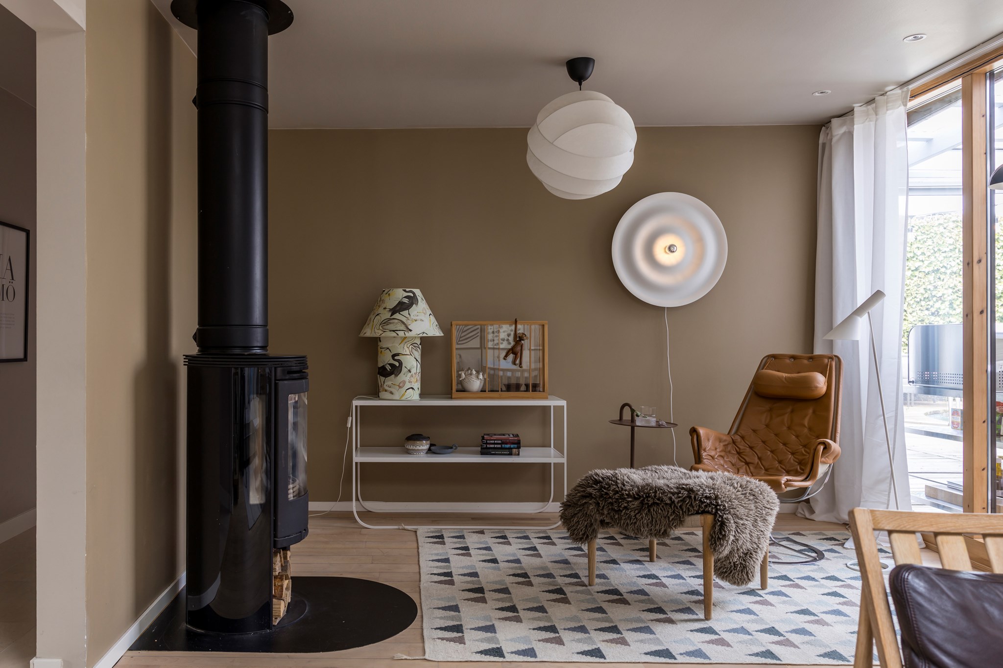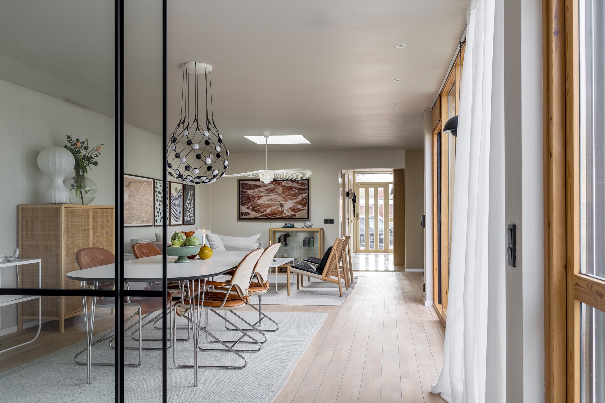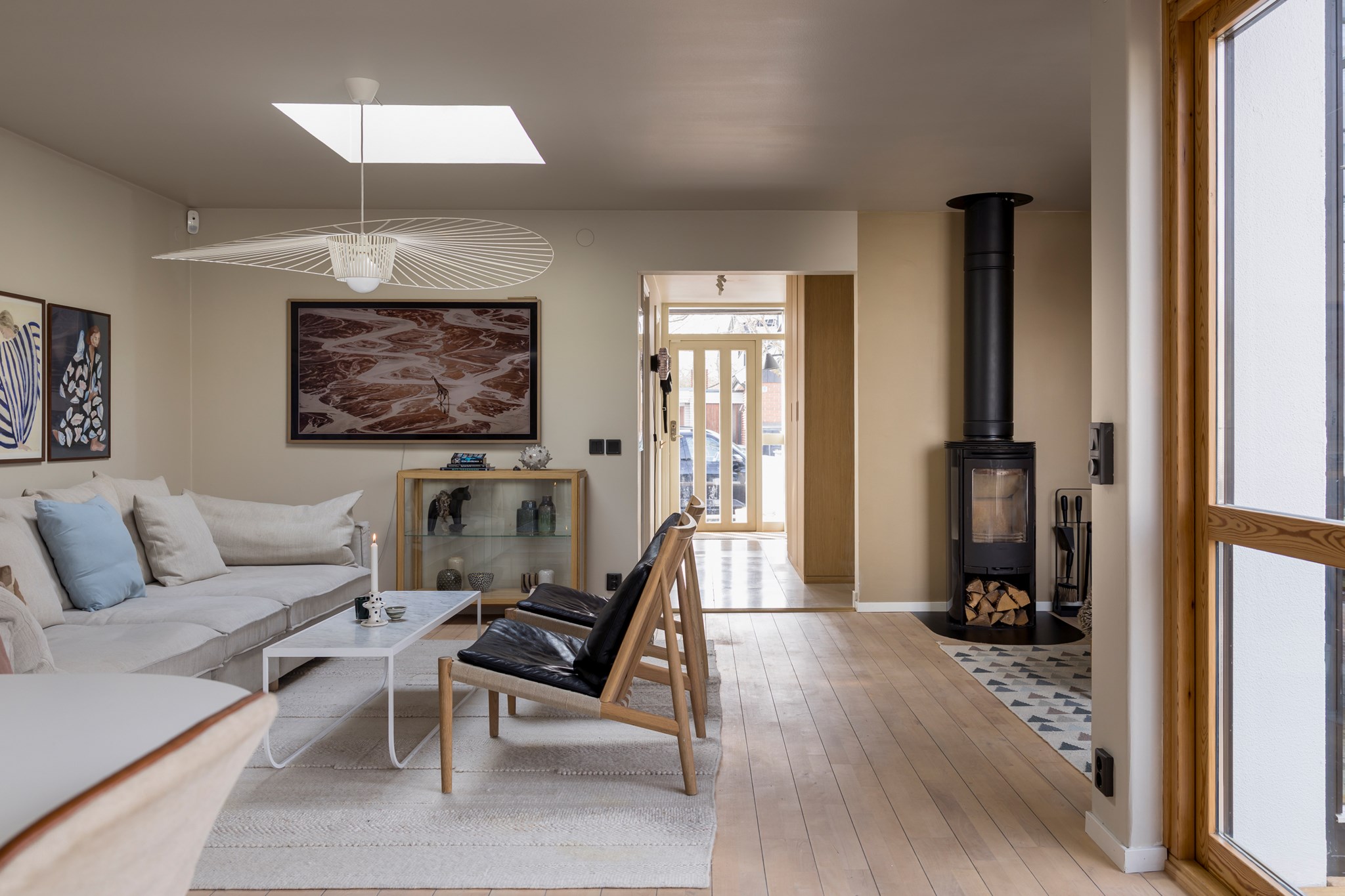 Skeppsgolv och ljusa väggar. Mörkare beige fondvägg. Möjliggör en möblering för matplats och sittyta. Öppen spis. Utgång till inglasat uterum.