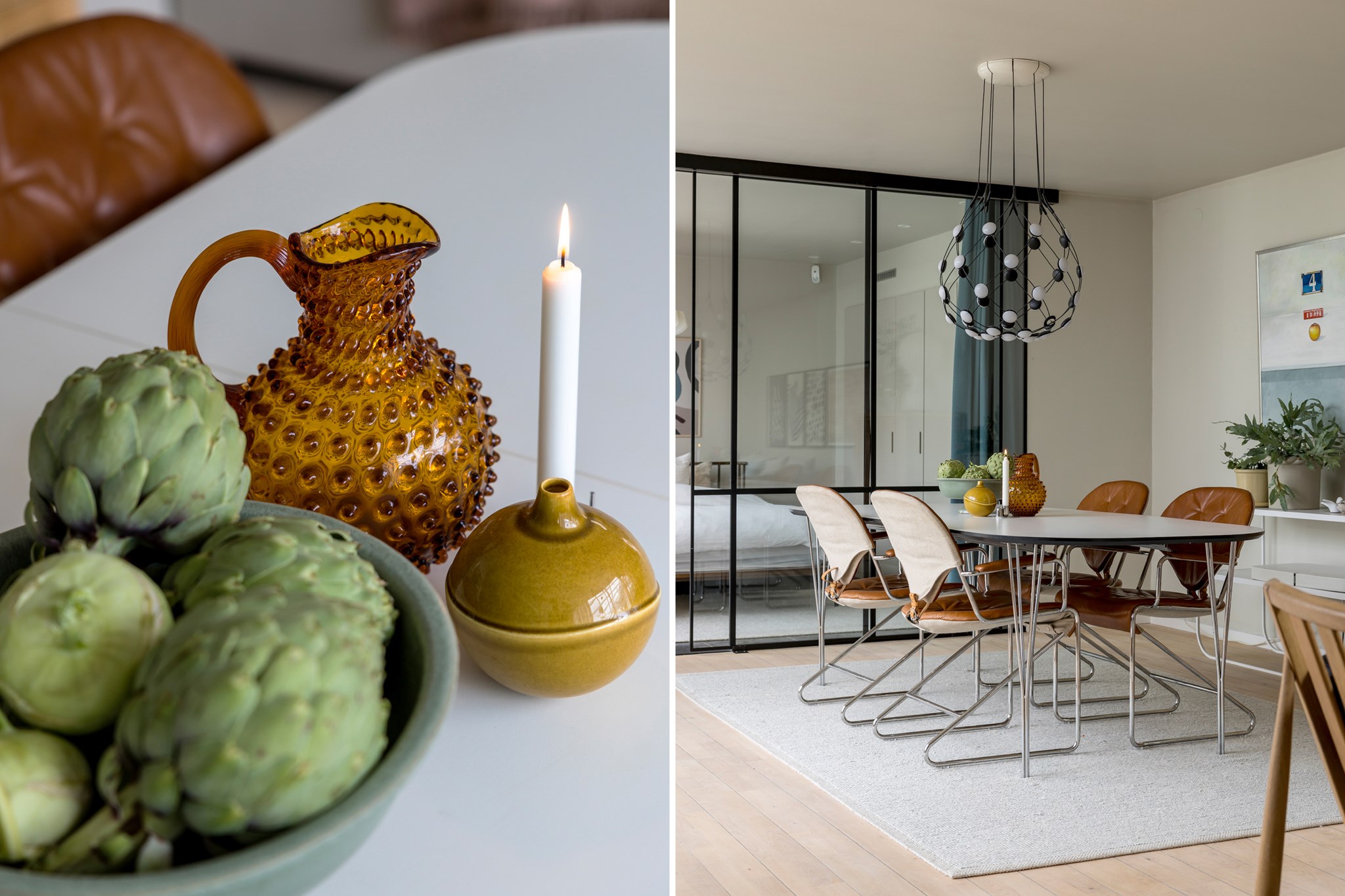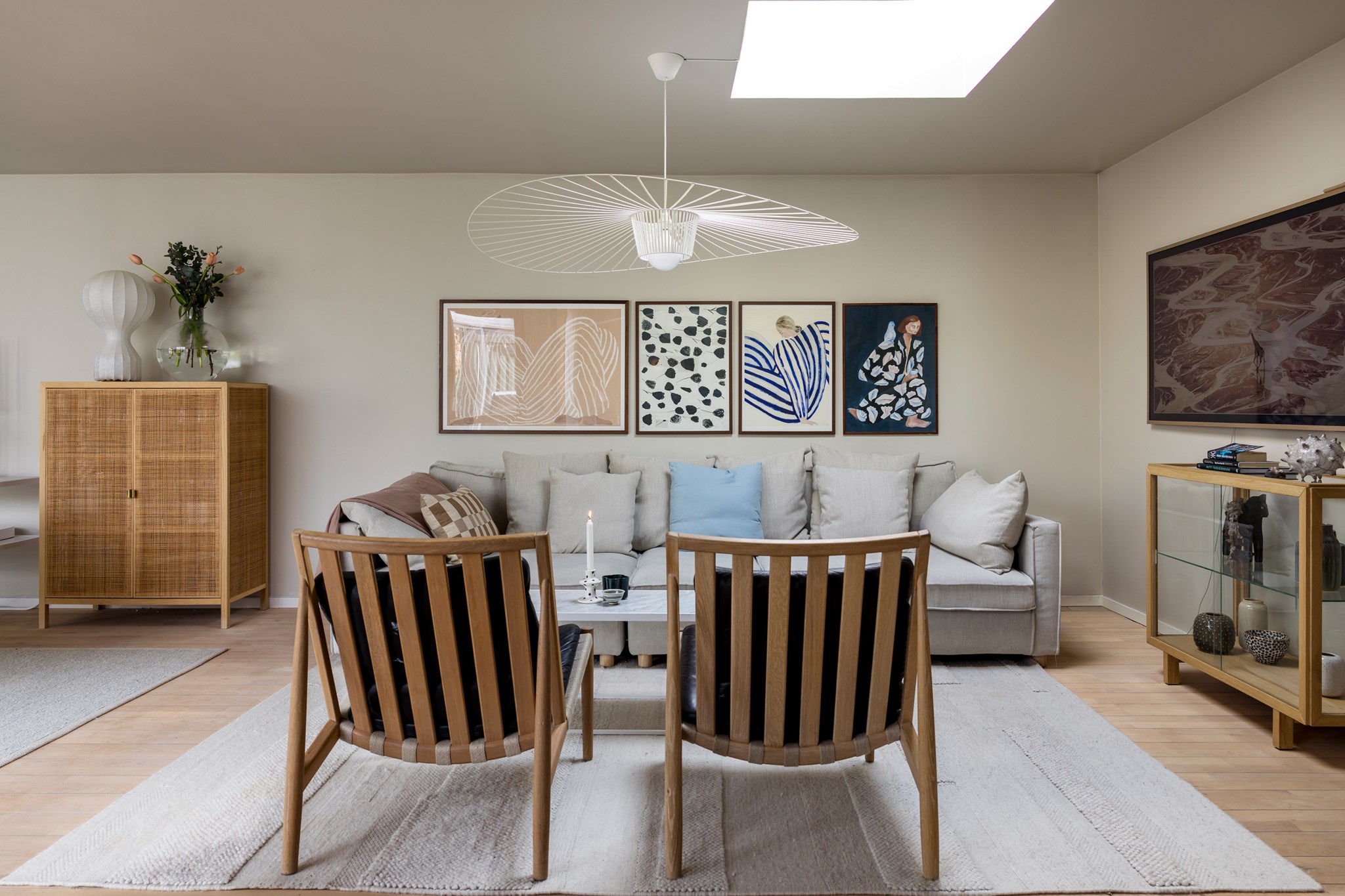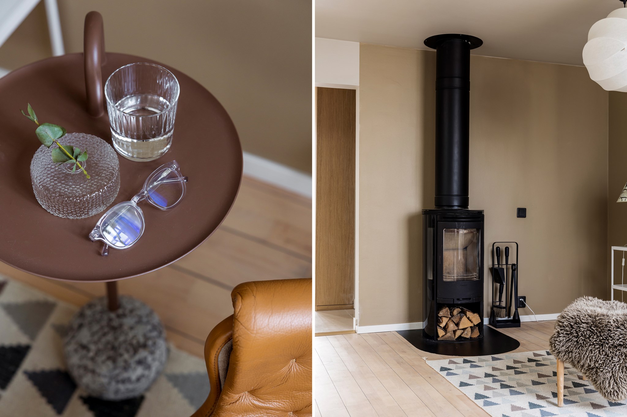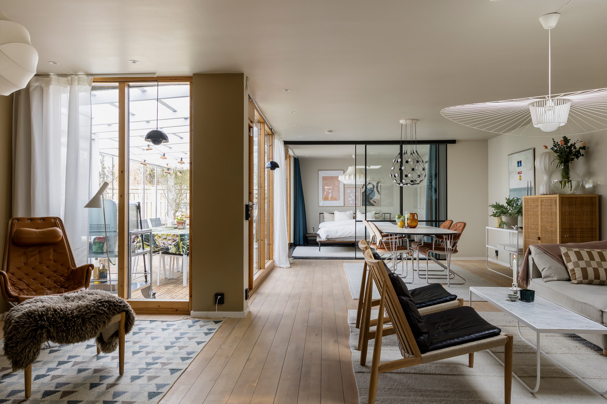 Skeppsgolv och ljusa väggar. Mörkare beige fondvägg. Möjliggör en möblering för matplats och sittyta. Öppen spis. Utgång till inglasat uterum.