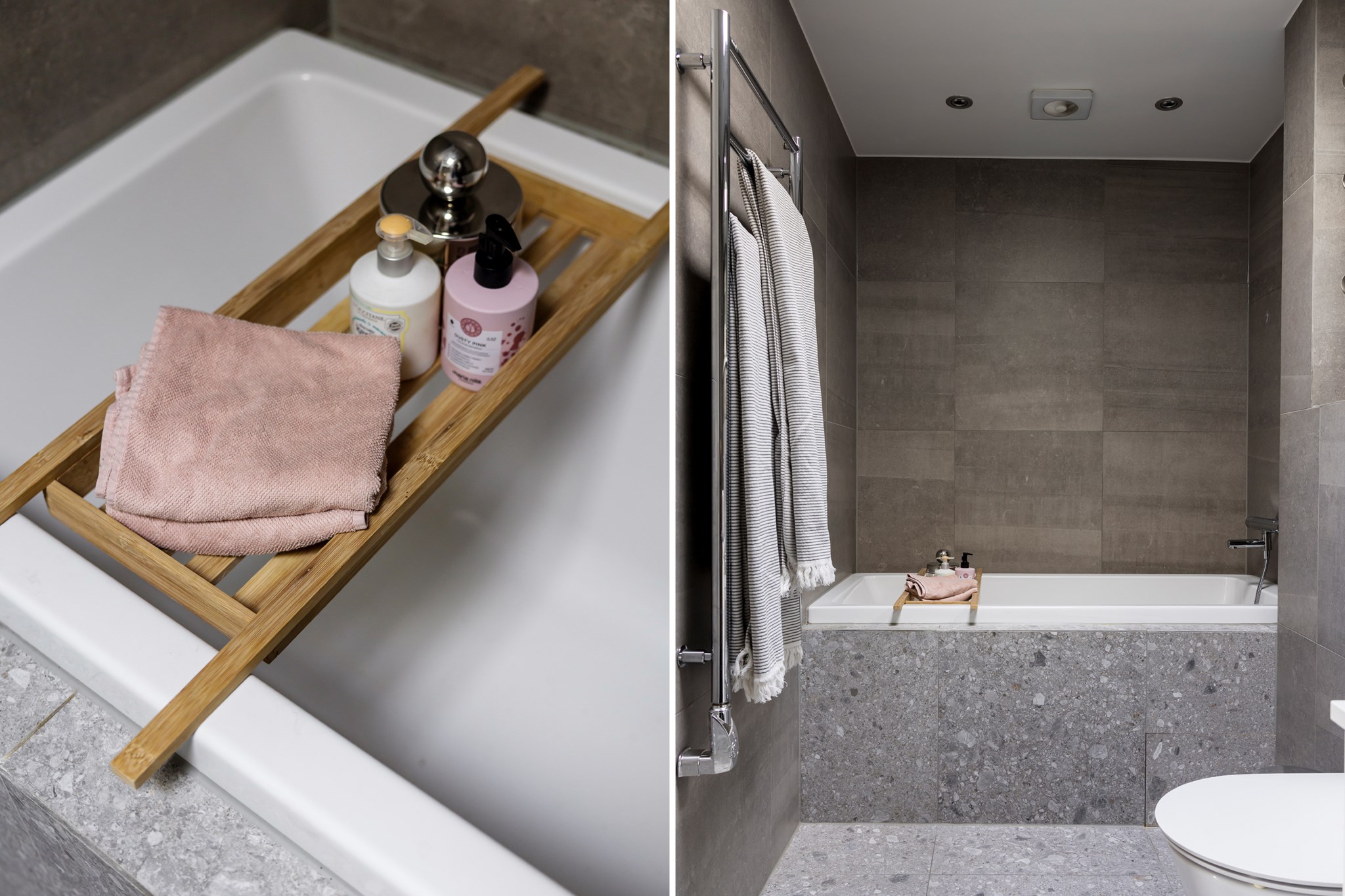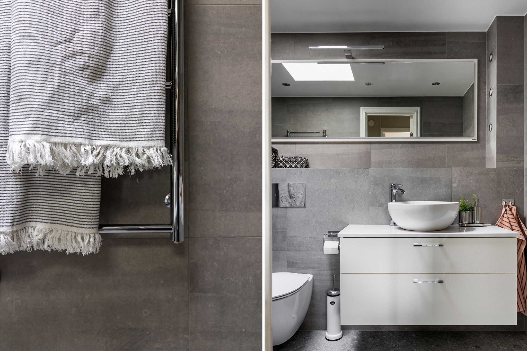 Helkaklat badrum. Terazzoklinker till golv och grå kaklade väggar. Utrustad med WC, handfat med vit kommod, handdukstork samt badkar.