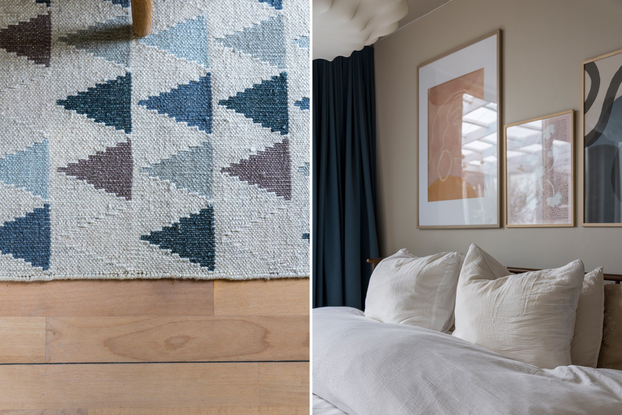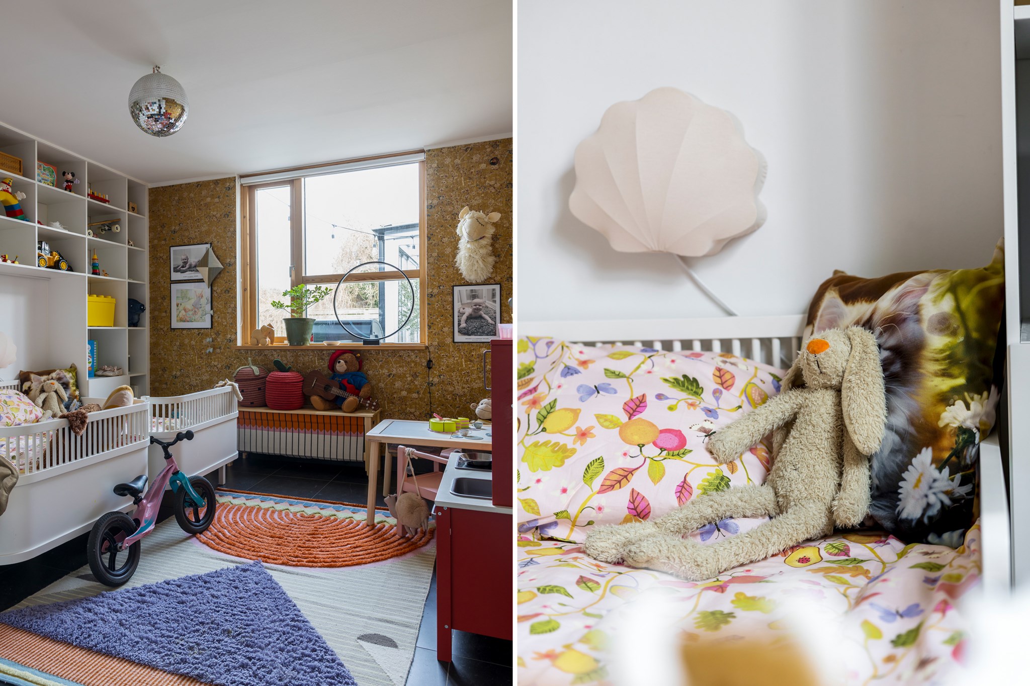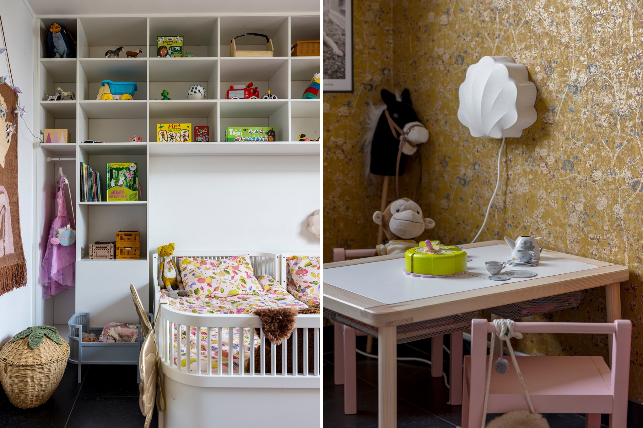 Grå klinker till golv och mönstrad gul tapet. Platsbyggd garderob.