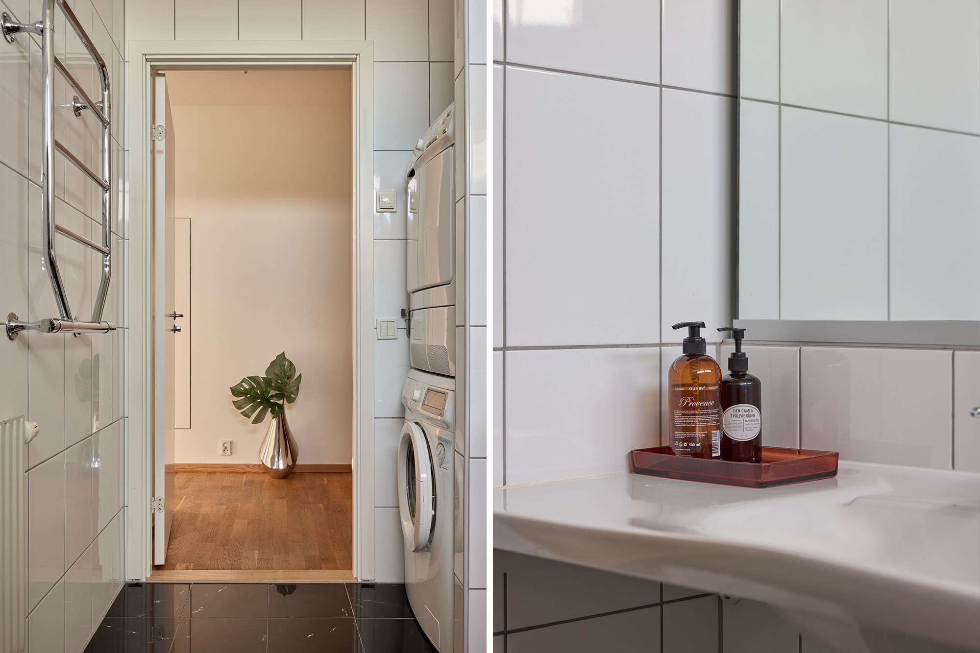 Helkaklat badrum med svart marmorgolv och vitkaklade väggar. Inbyggt spegelskåp,