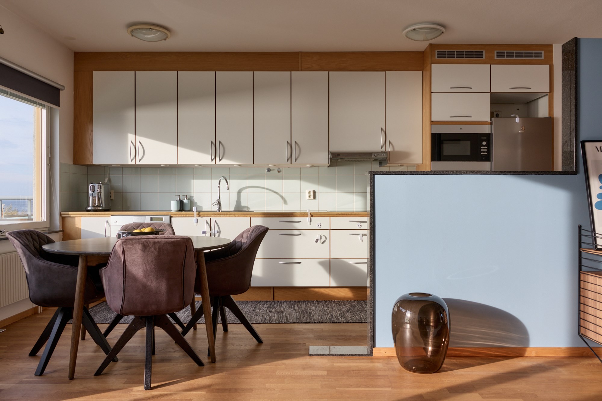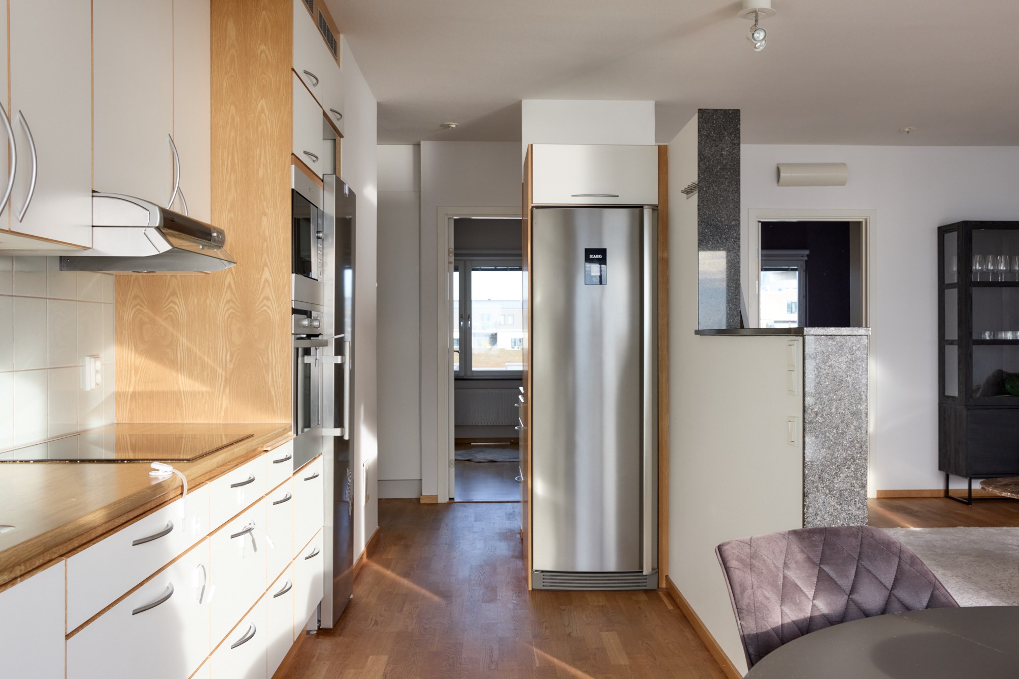 Parkettgolv och ljusa väggar. Vita luckor med rostfria beslag. Ljust kakel ovanför bänkskiva i laminat. Rostfri maskinpark bestående av kyl och frys i fullstorlek, mikrovågsugn, spishäll, diskmaskin från Electrolux samt kolfilterfläkt.