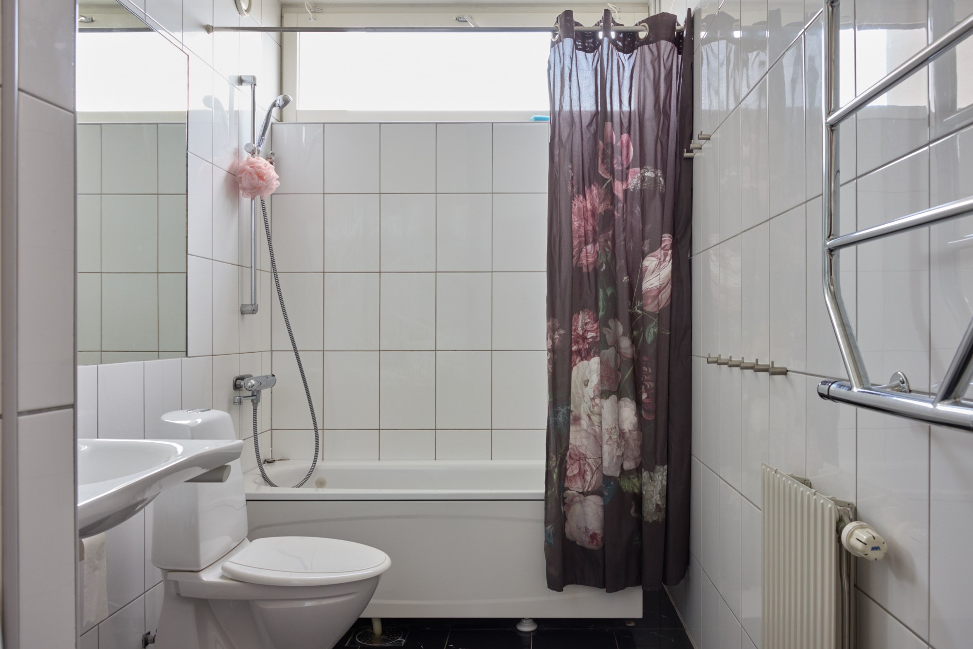 väggskåp, wc, handfat med vit kommod, badkar samt tvättpelare.