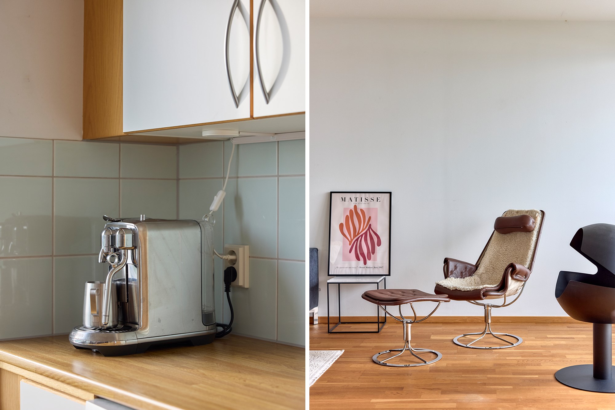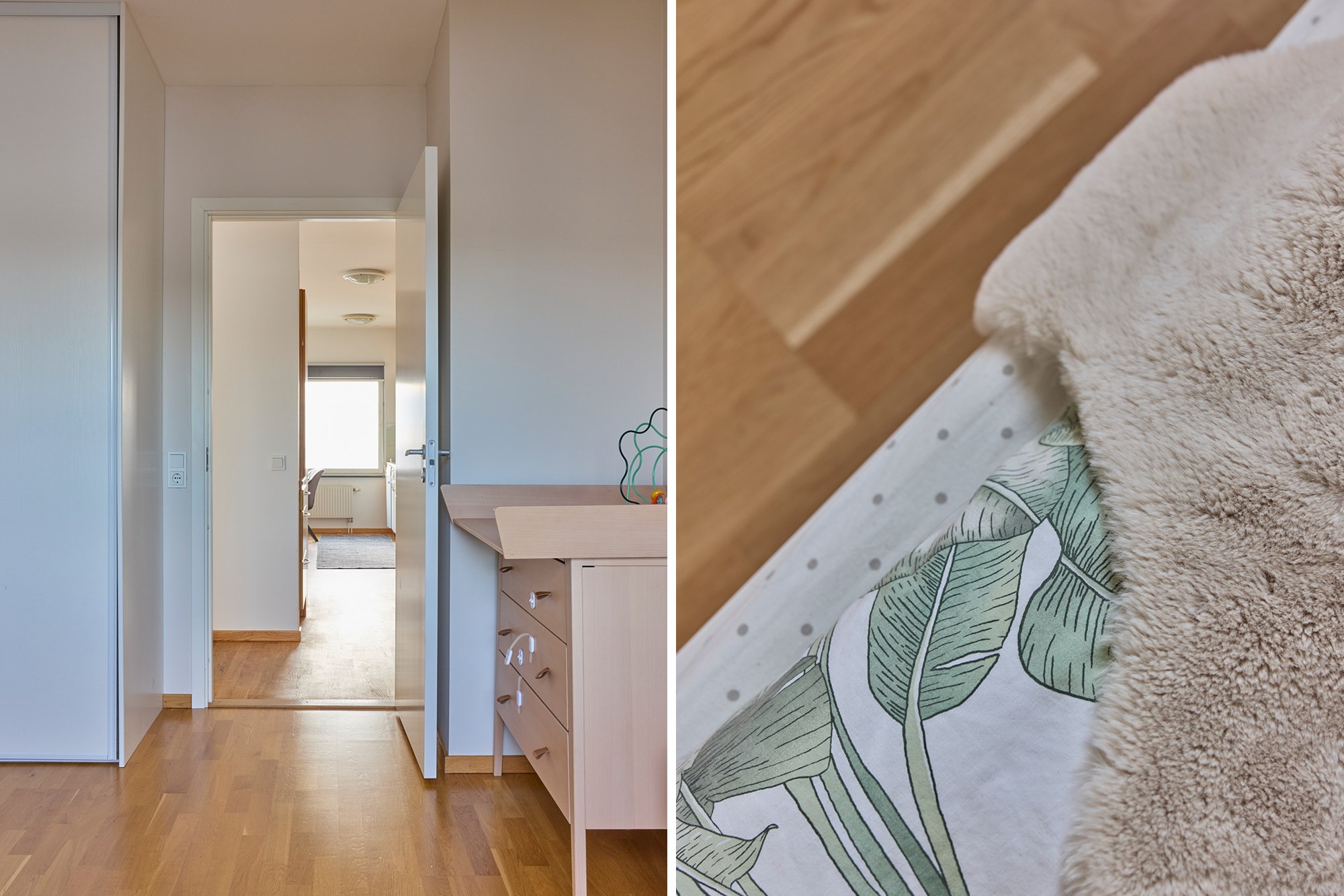 Parkettgolv och ljusa väggar. Plats för avhängning.