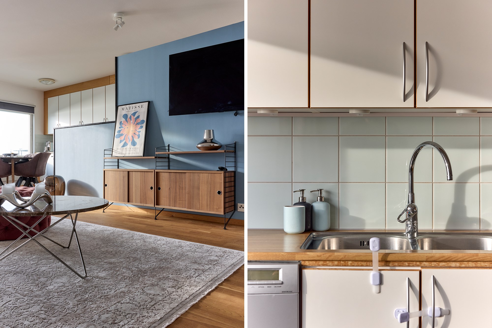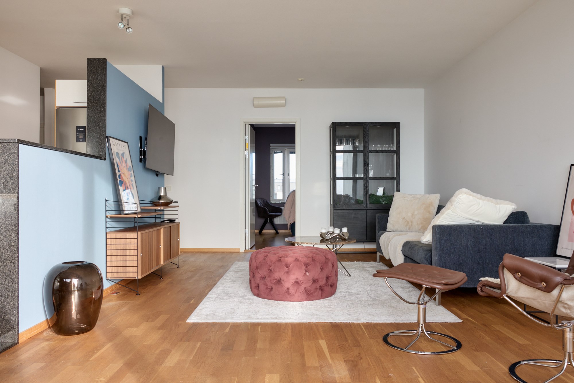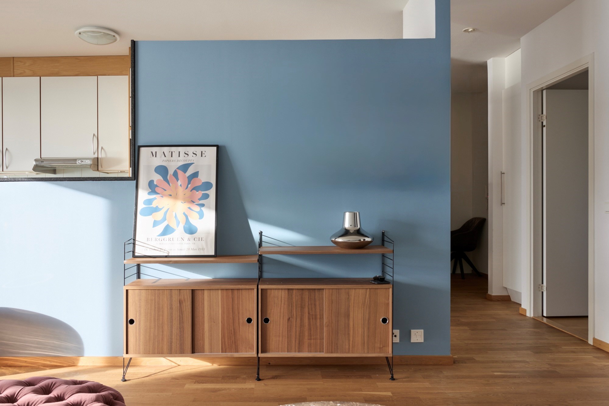 Parkettgolv och ljusa väggar. Blå fondvägg. Utgång till balkong.