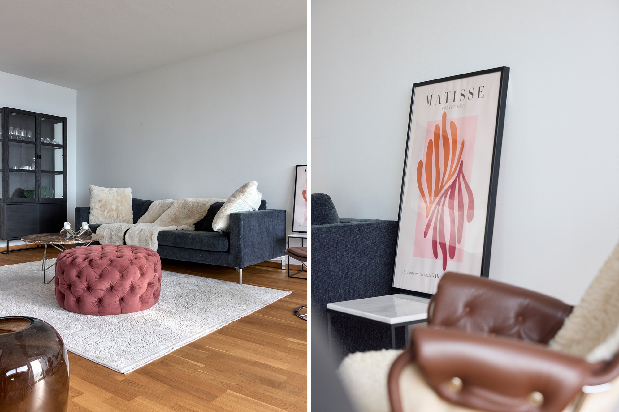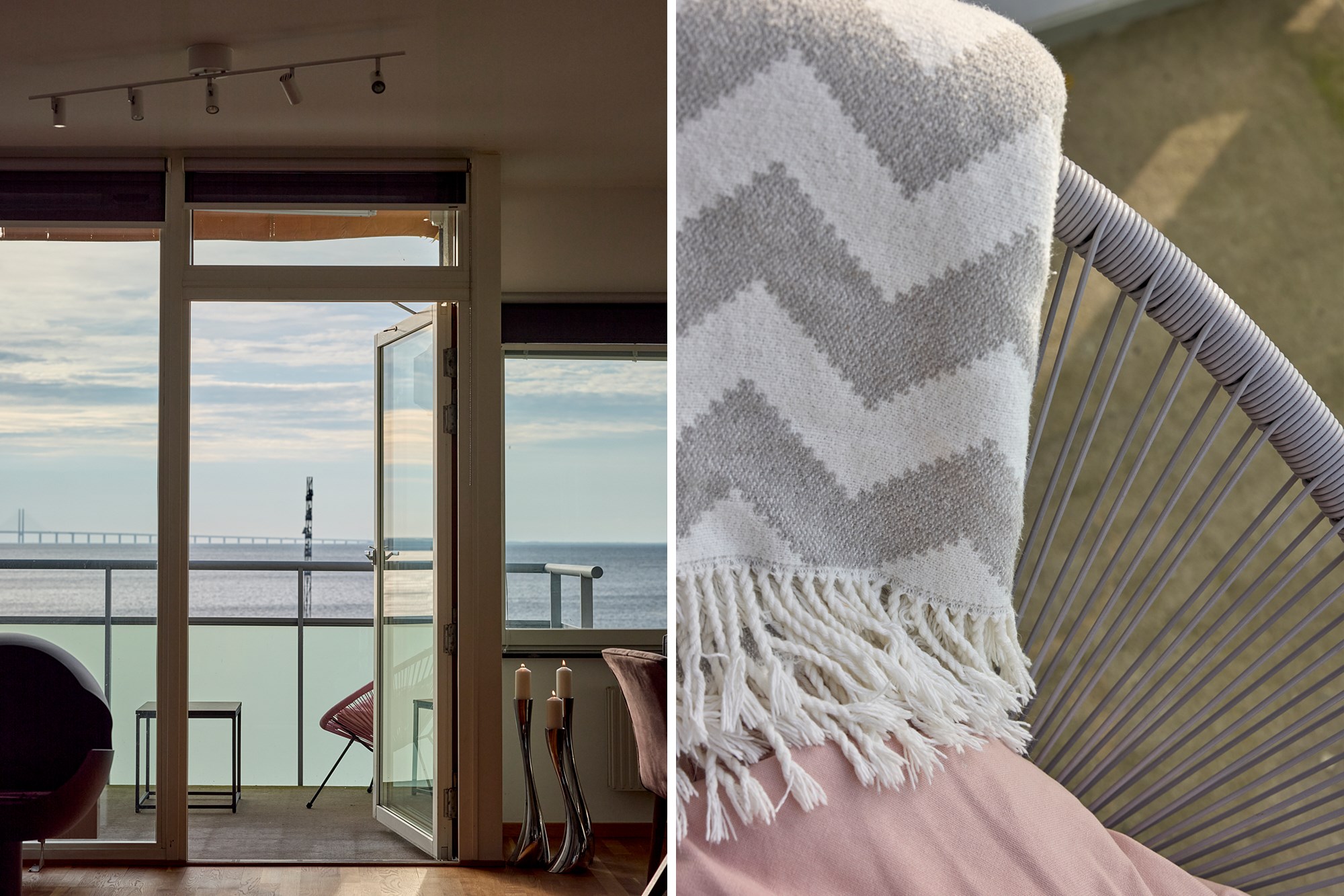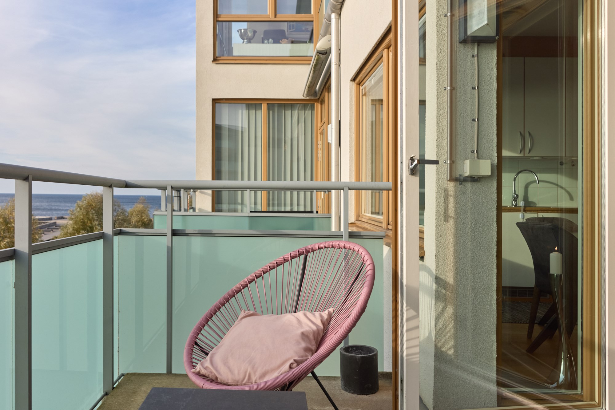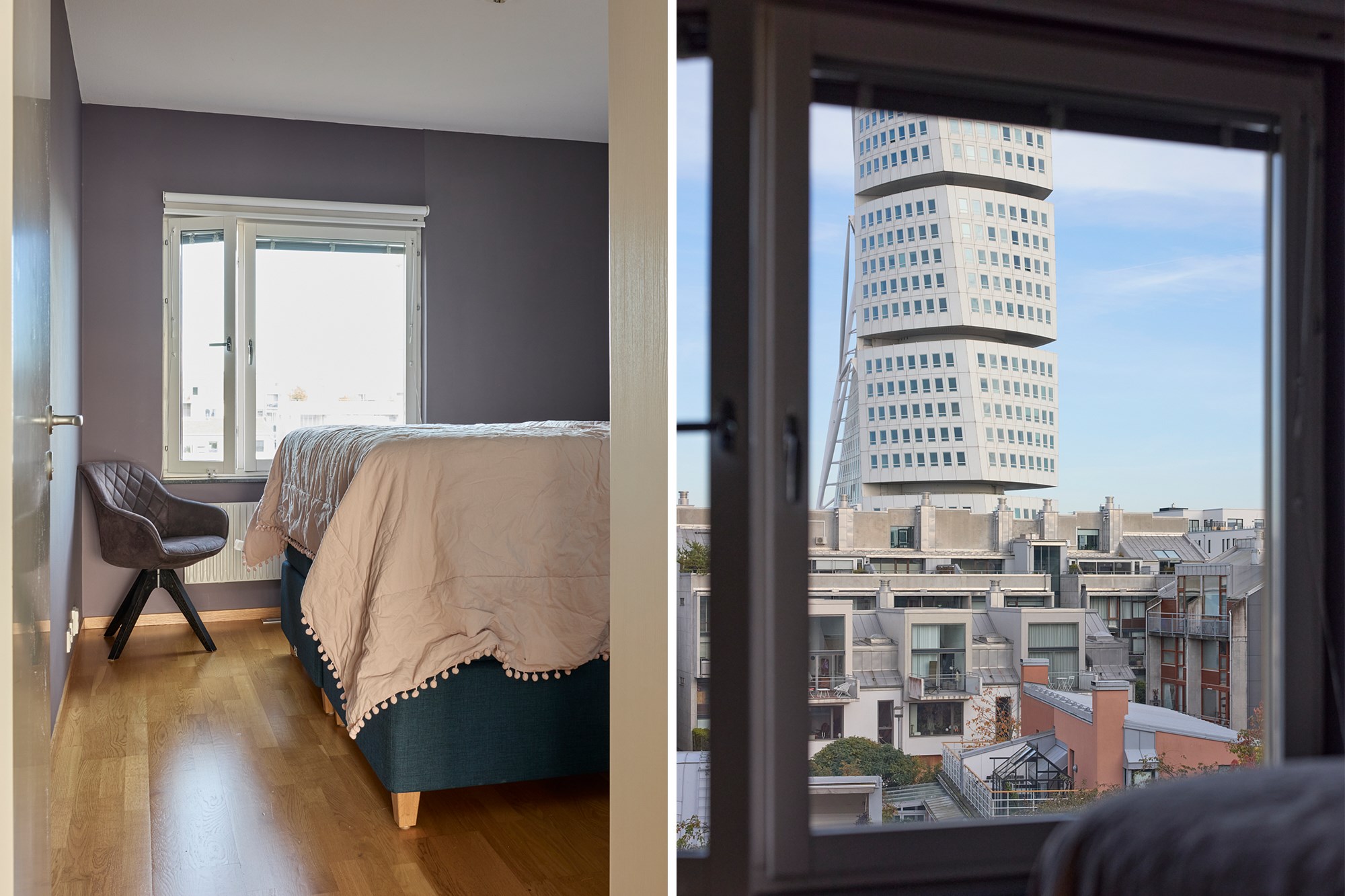 Parkettgolv och ljusa väggar. Blå fondvägg. Utgång till balkong.