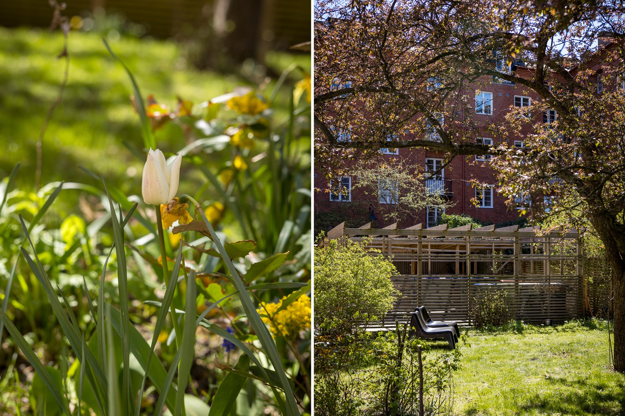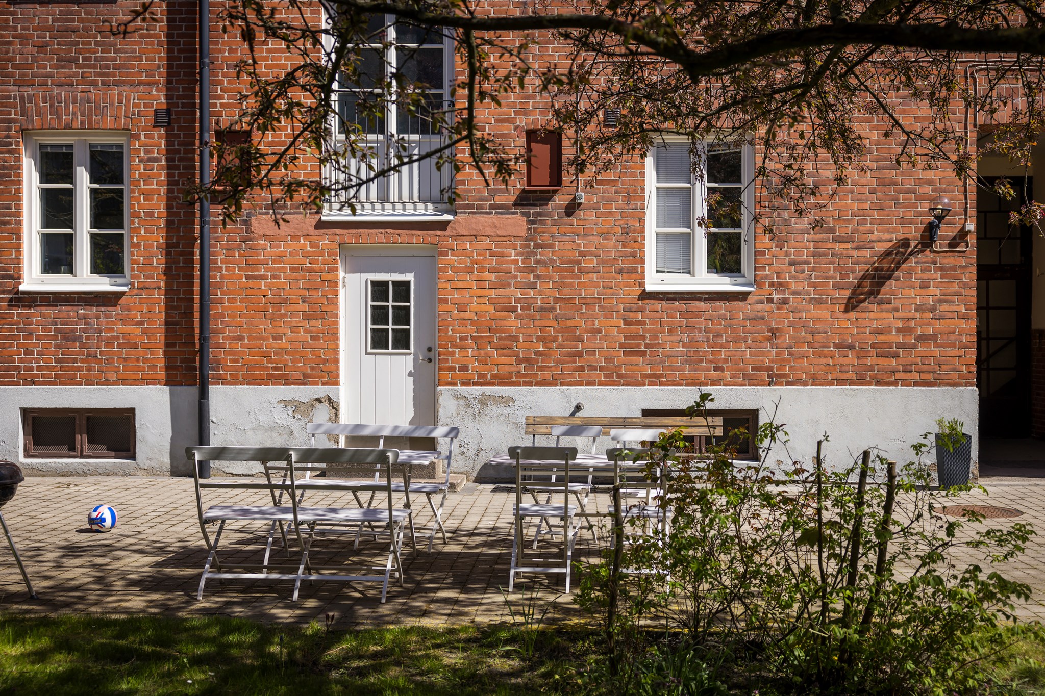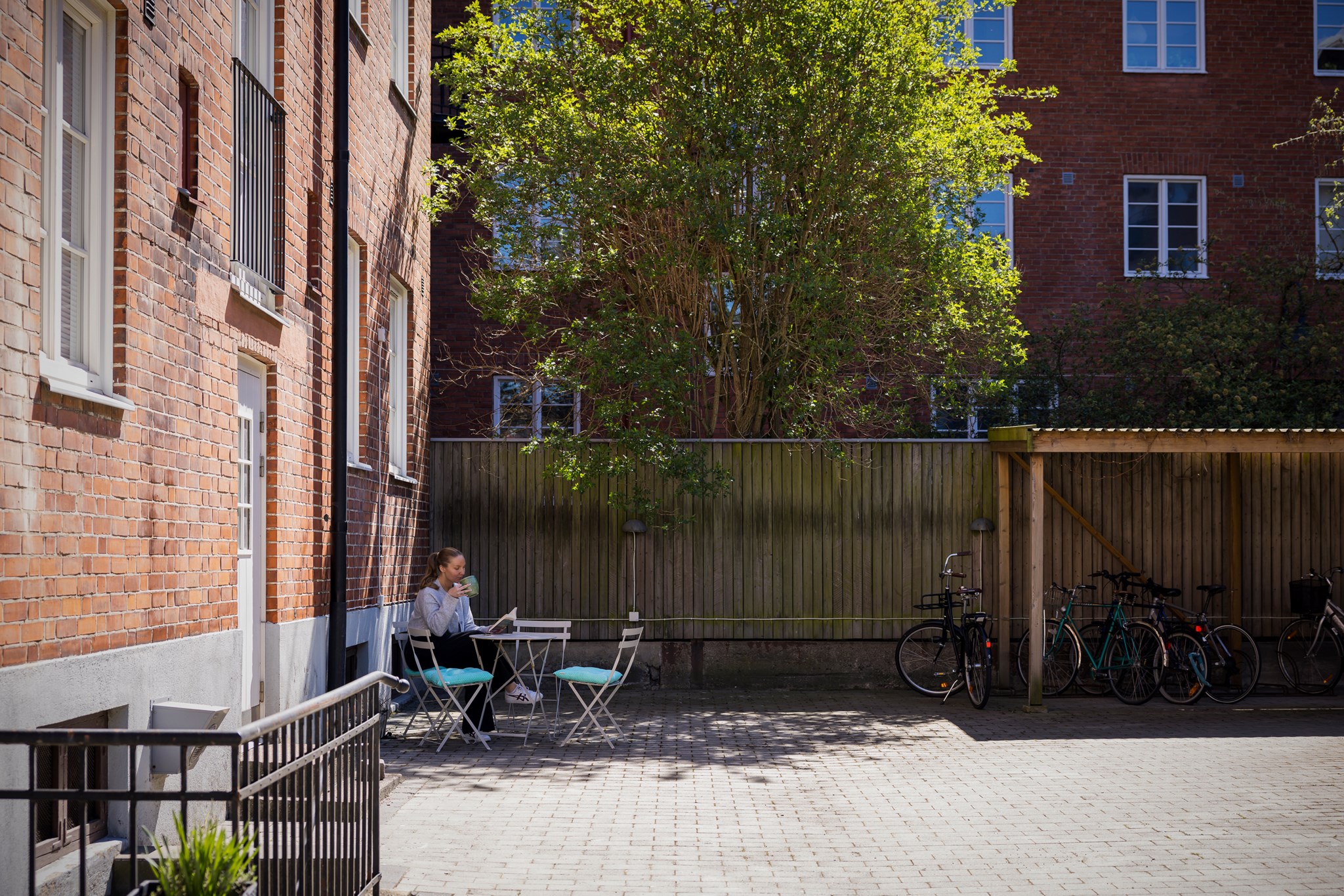 Föreningens gemensamma innergård har grill- och sittmöjligheter. Cykelställ finns på gården och även cykelparkering under tak.