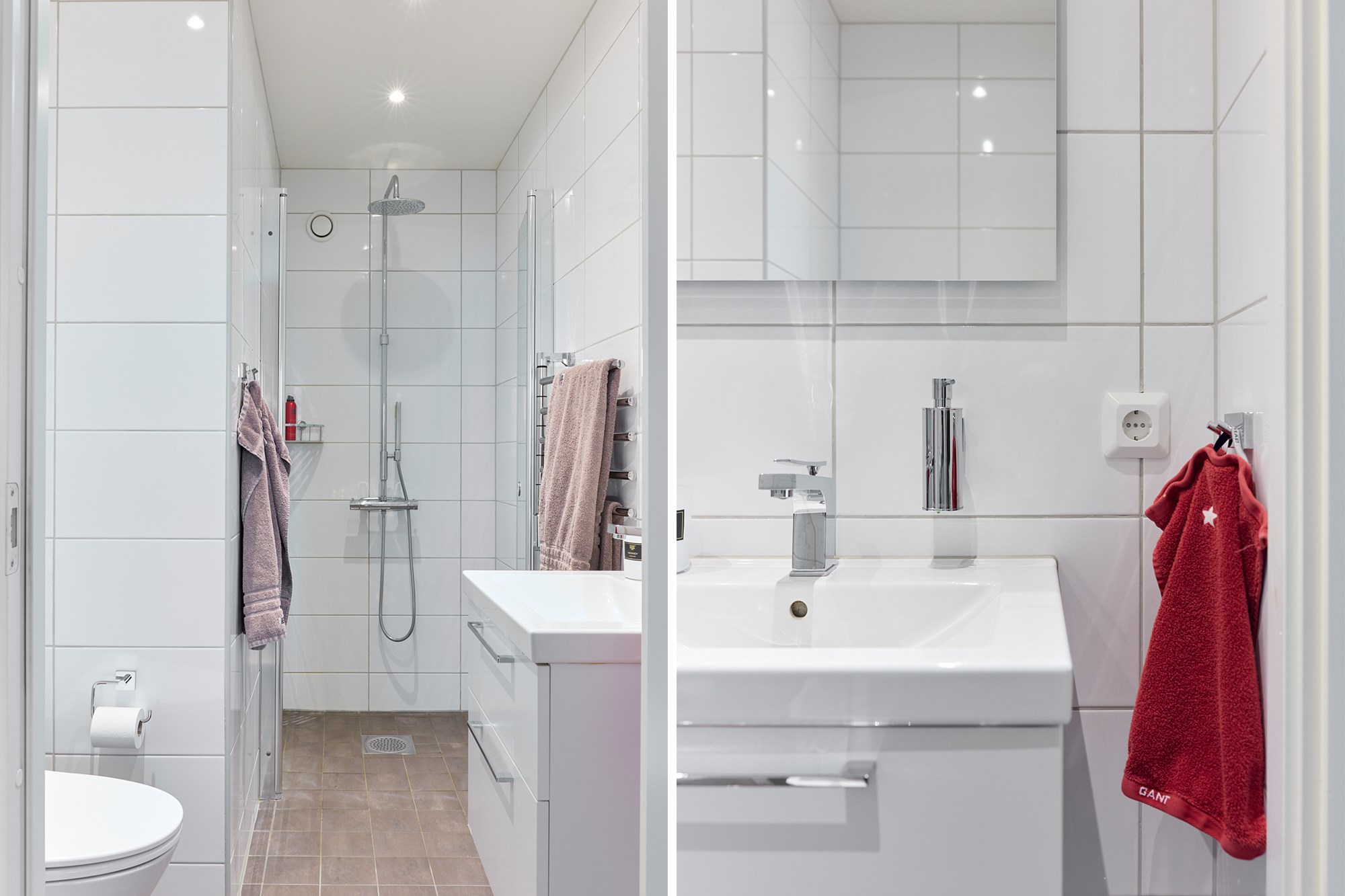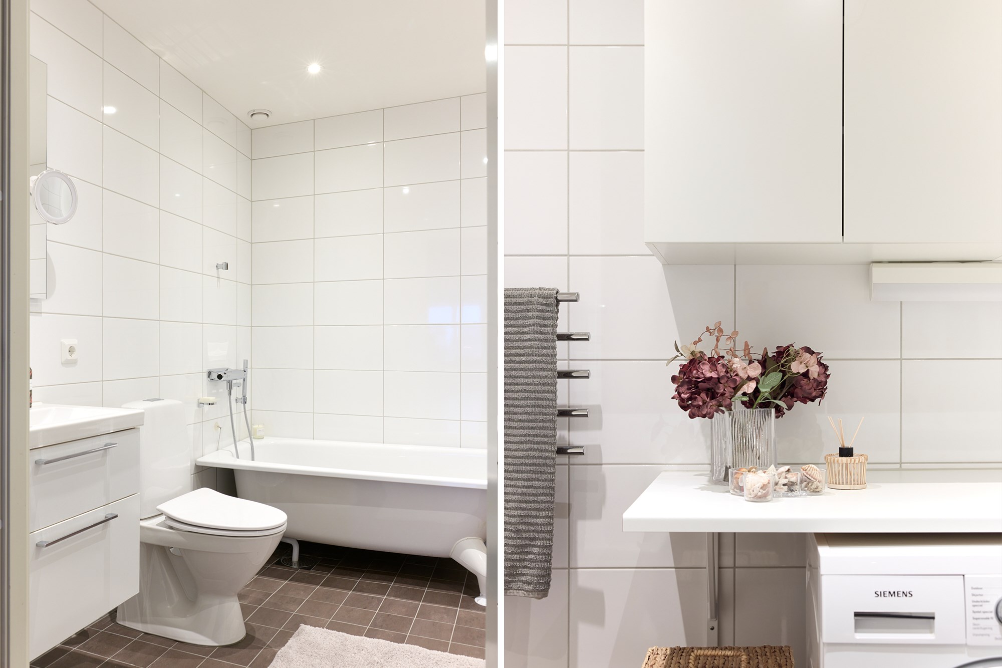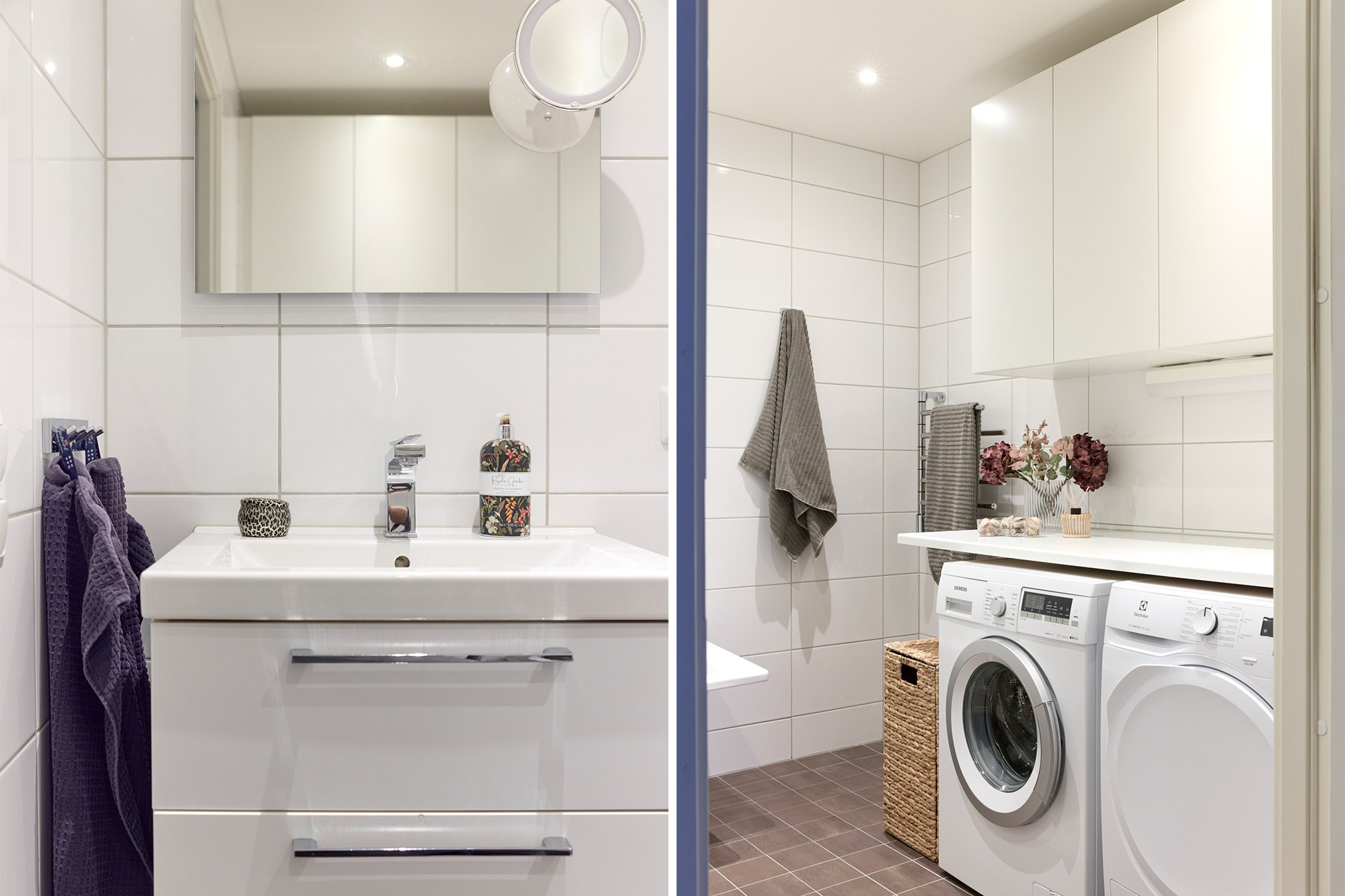 Helkaklat badrum. Grå klinker till golv och vita kaklade väggar. Utrustad med badkar, handfat med kommod, dusch, handdukstork, tvättmaskin och torktumlare. Arbetsbänk och förvaringsskåp.