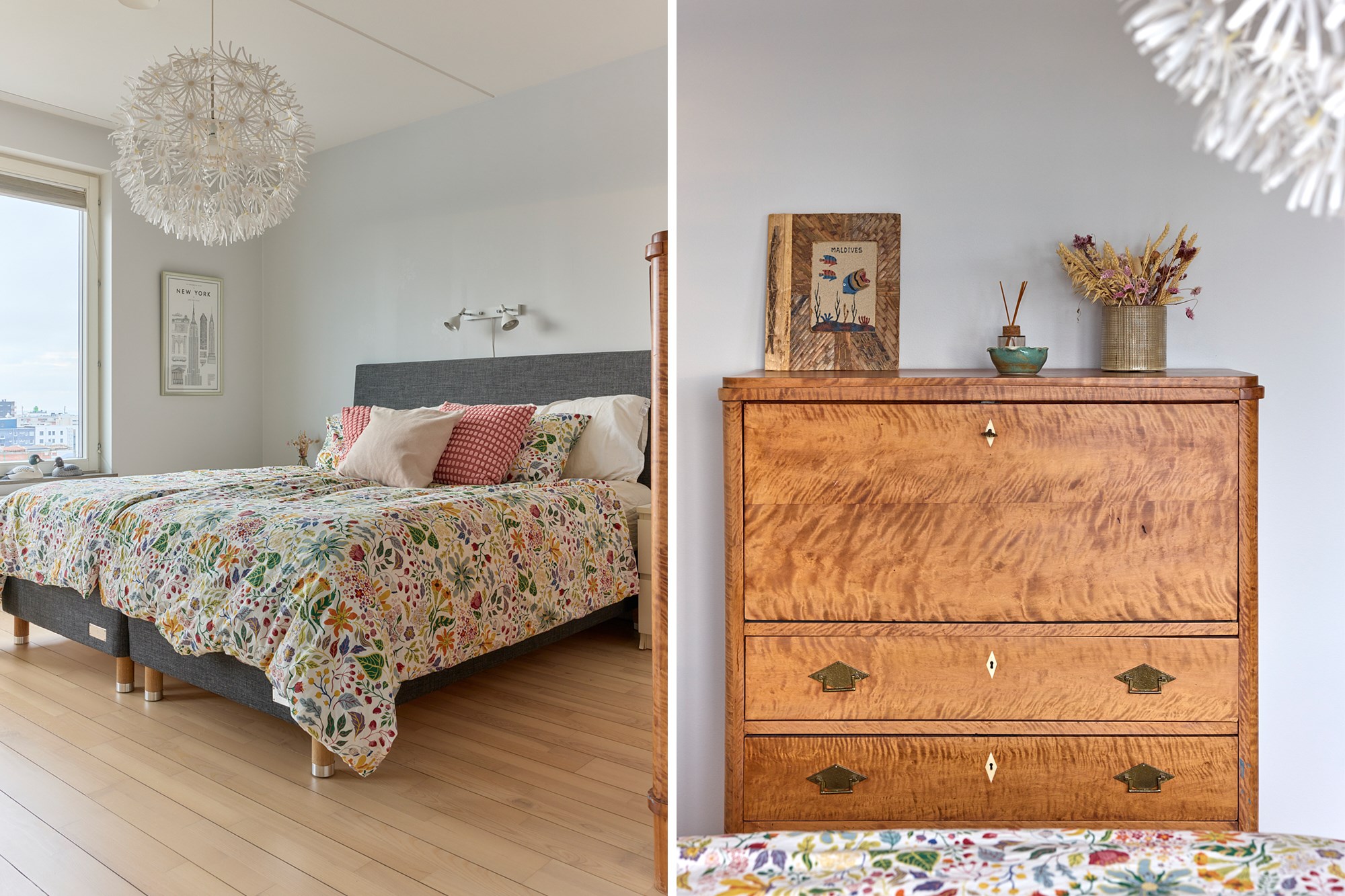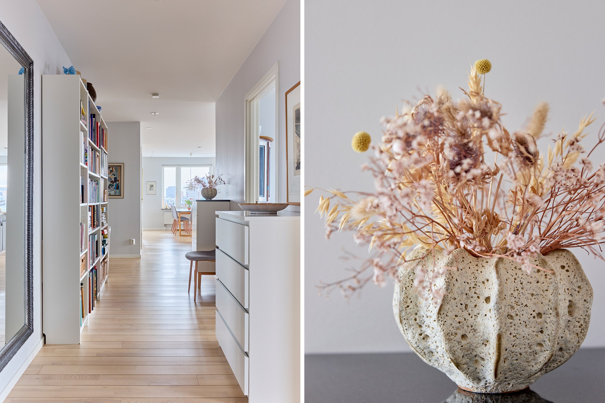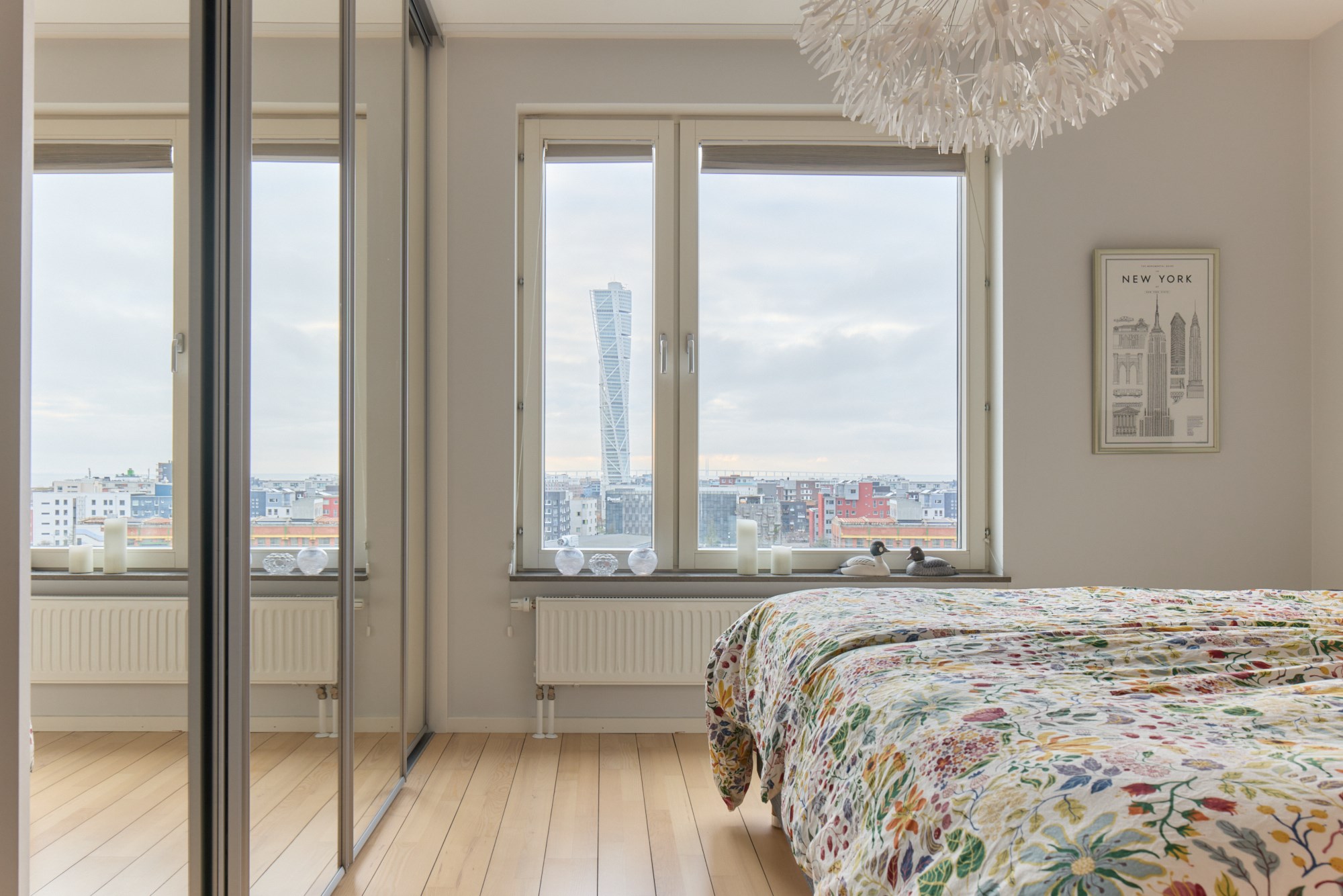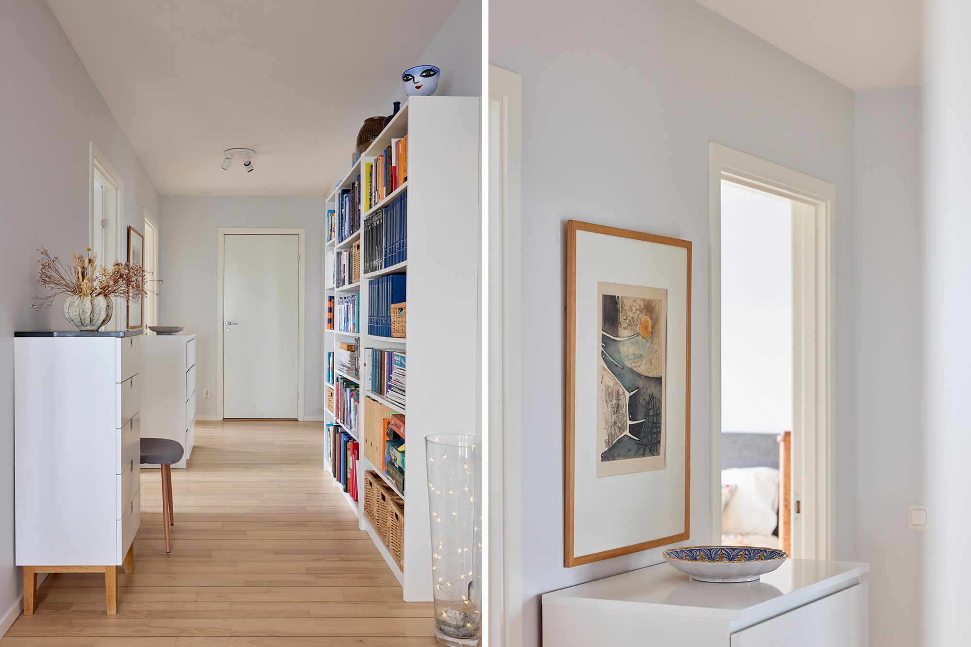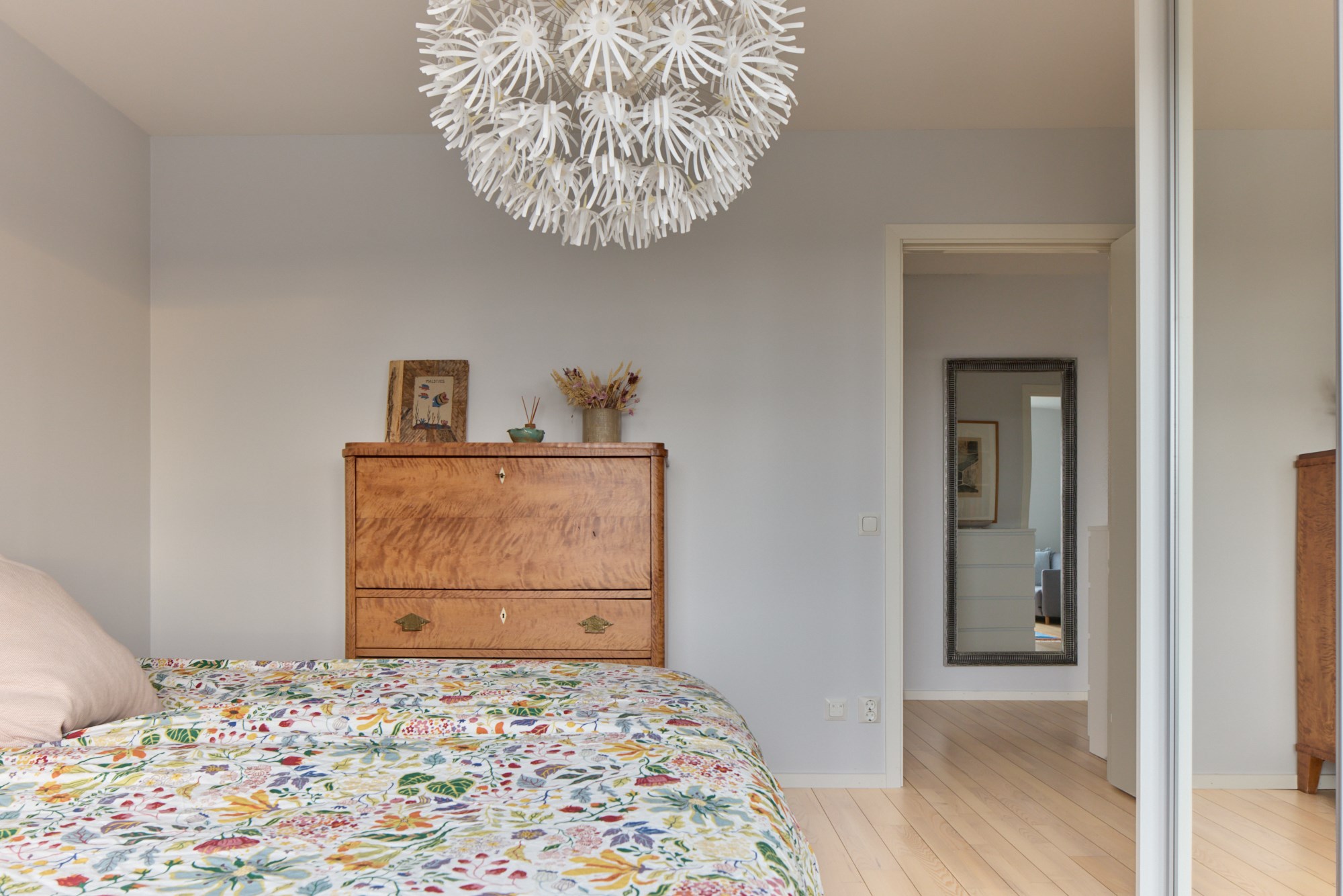 Skeppsgolv och ljusa väggar. Garderobsförvaring med skjutdörrar.