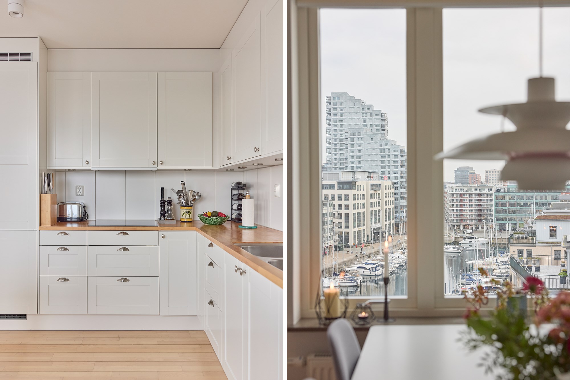 Skeppsgolv och ljusa väggar. Vit köksinredning och bänkskiva i trä. Maskinell utrustning utrustning i form av induktionshäll och fläkt, ugn, integrerad mikro, diskmaskin, kyl och frys. Köksö med bänkskiva i sten och förvaring undertill.