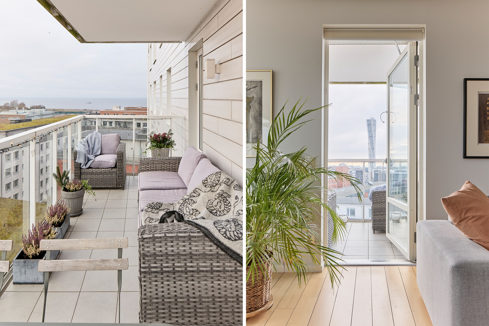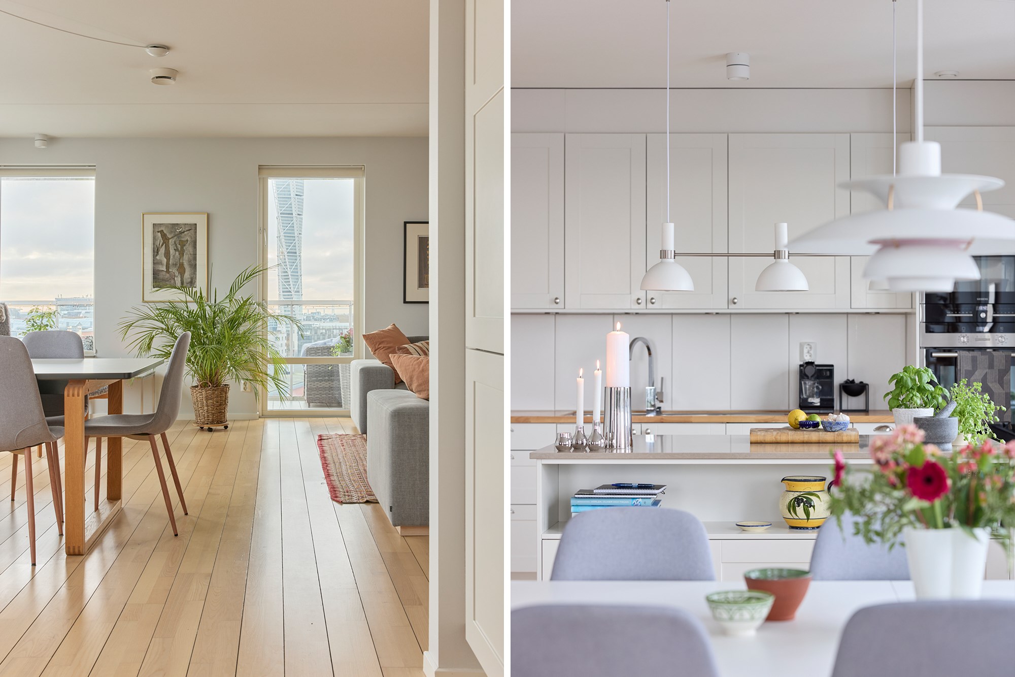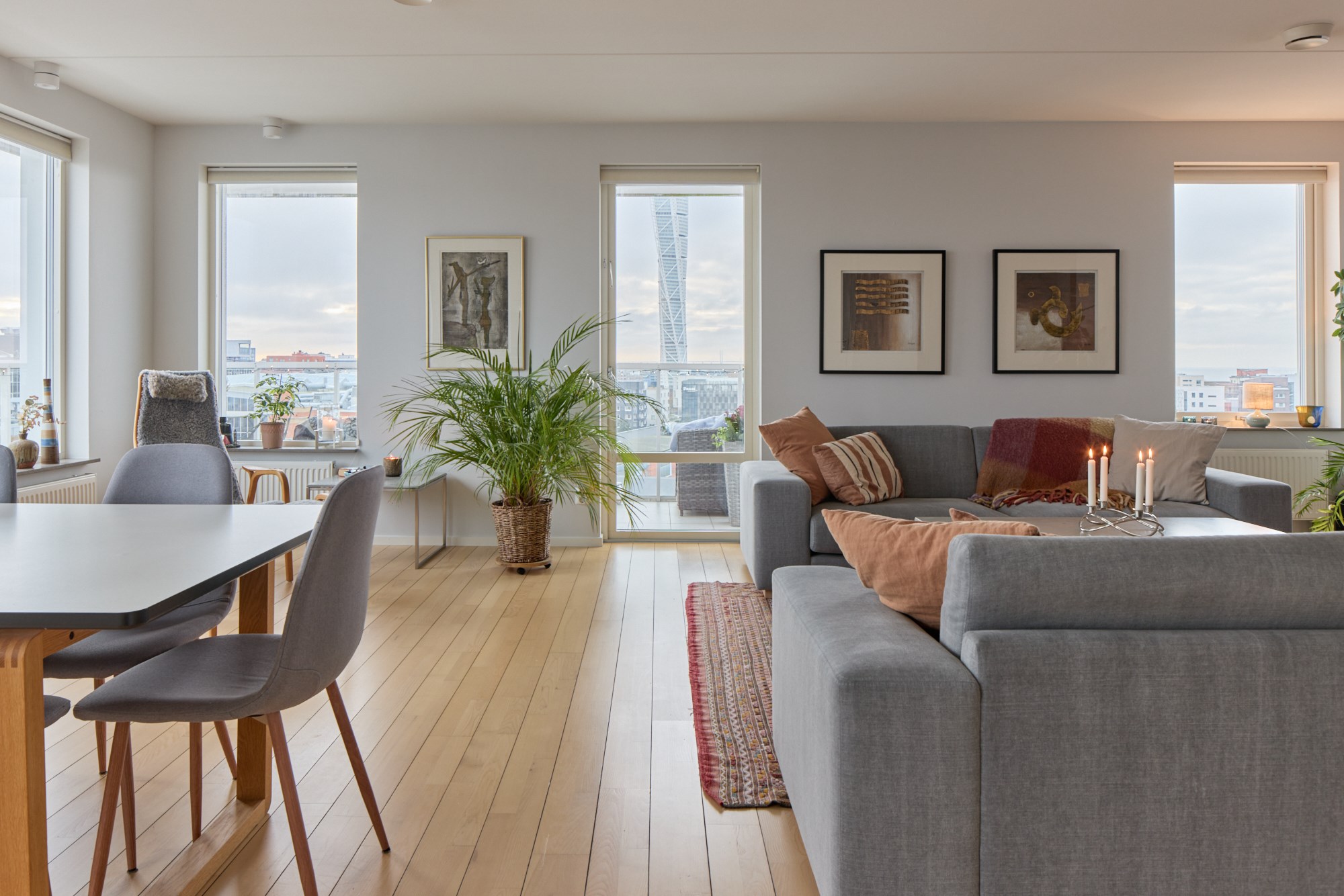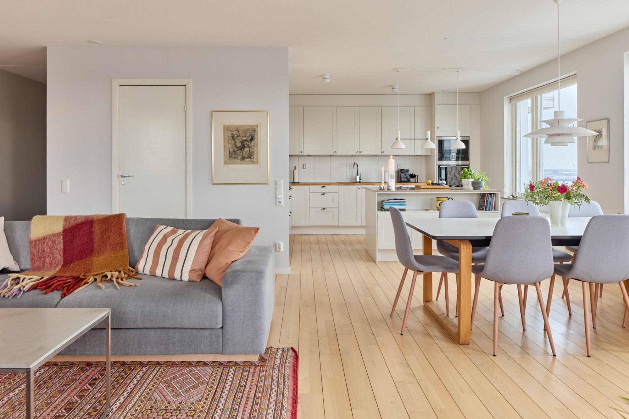 Skeppsgolv och ljusa väggar. Plats för soffgrupp och matplats. Utgång till balkong.