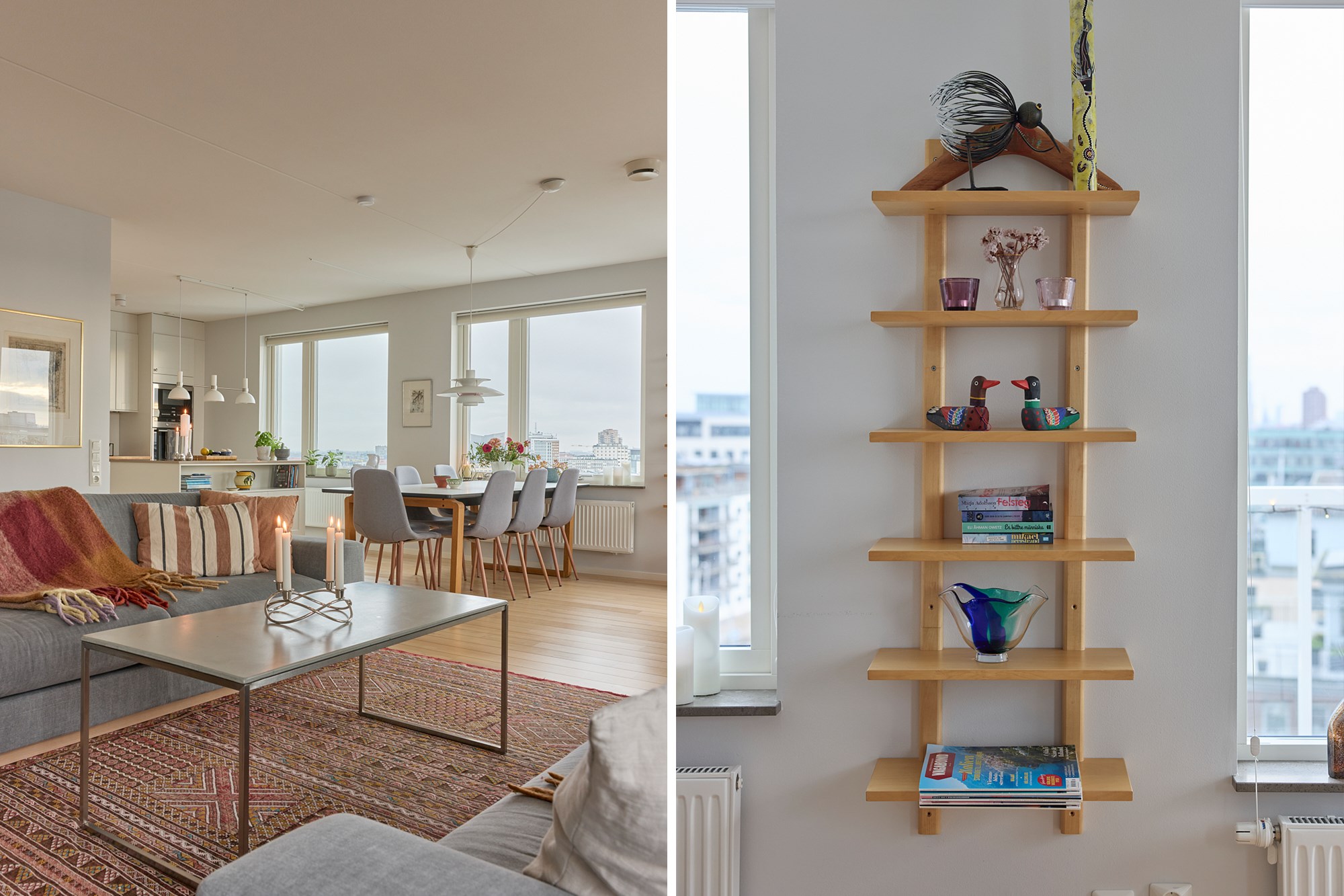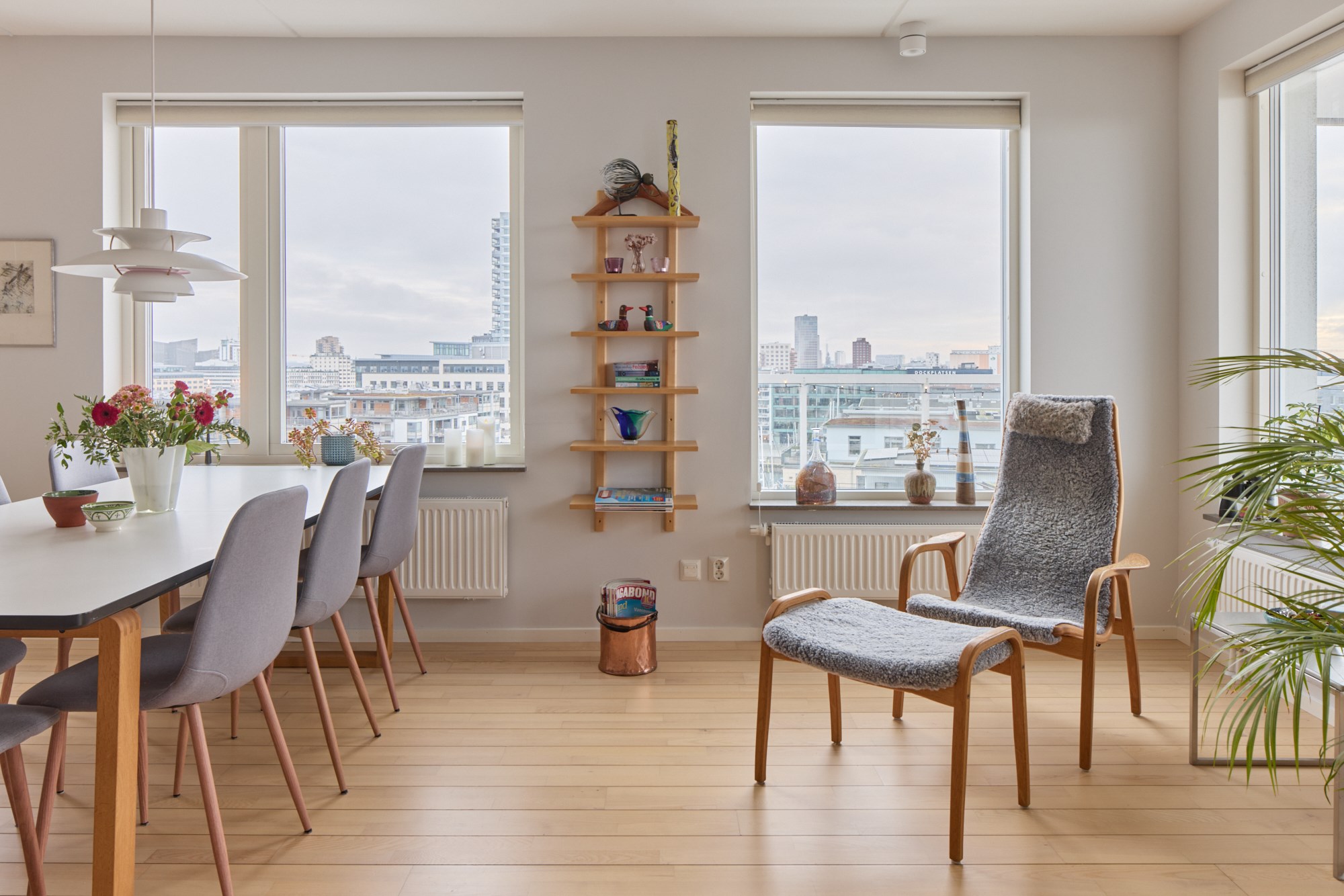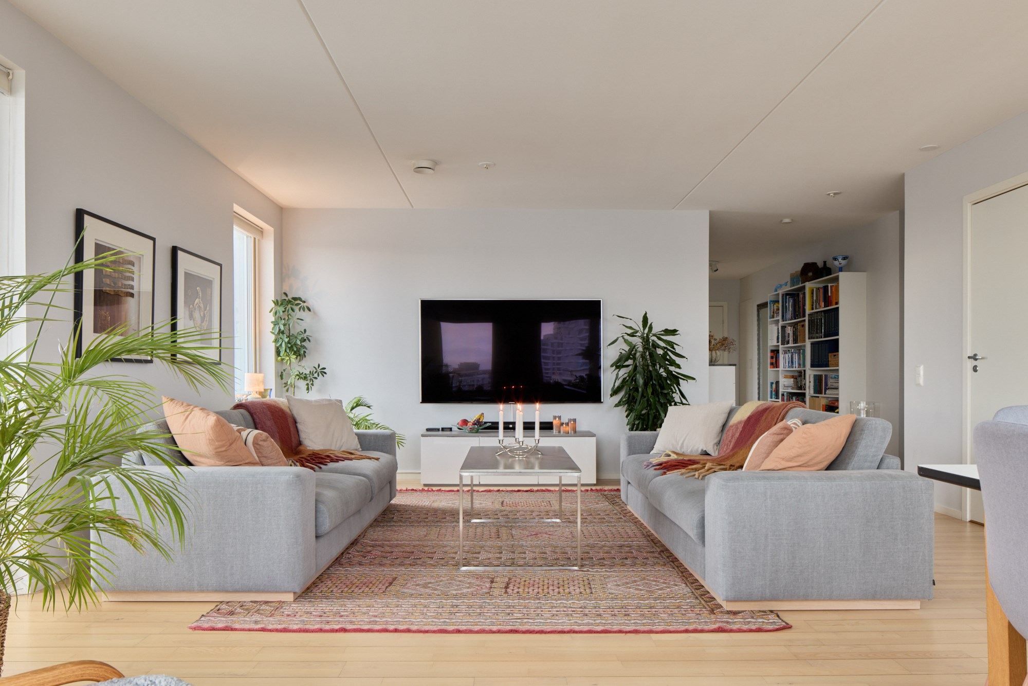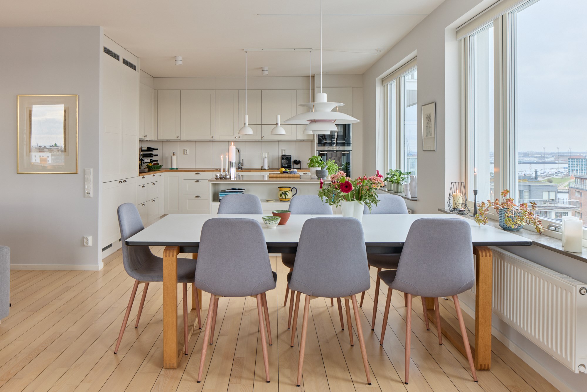 Skeppsgolv och ljusa väggar. Plats för soffgrupp och matplats. Utgång till balkong.