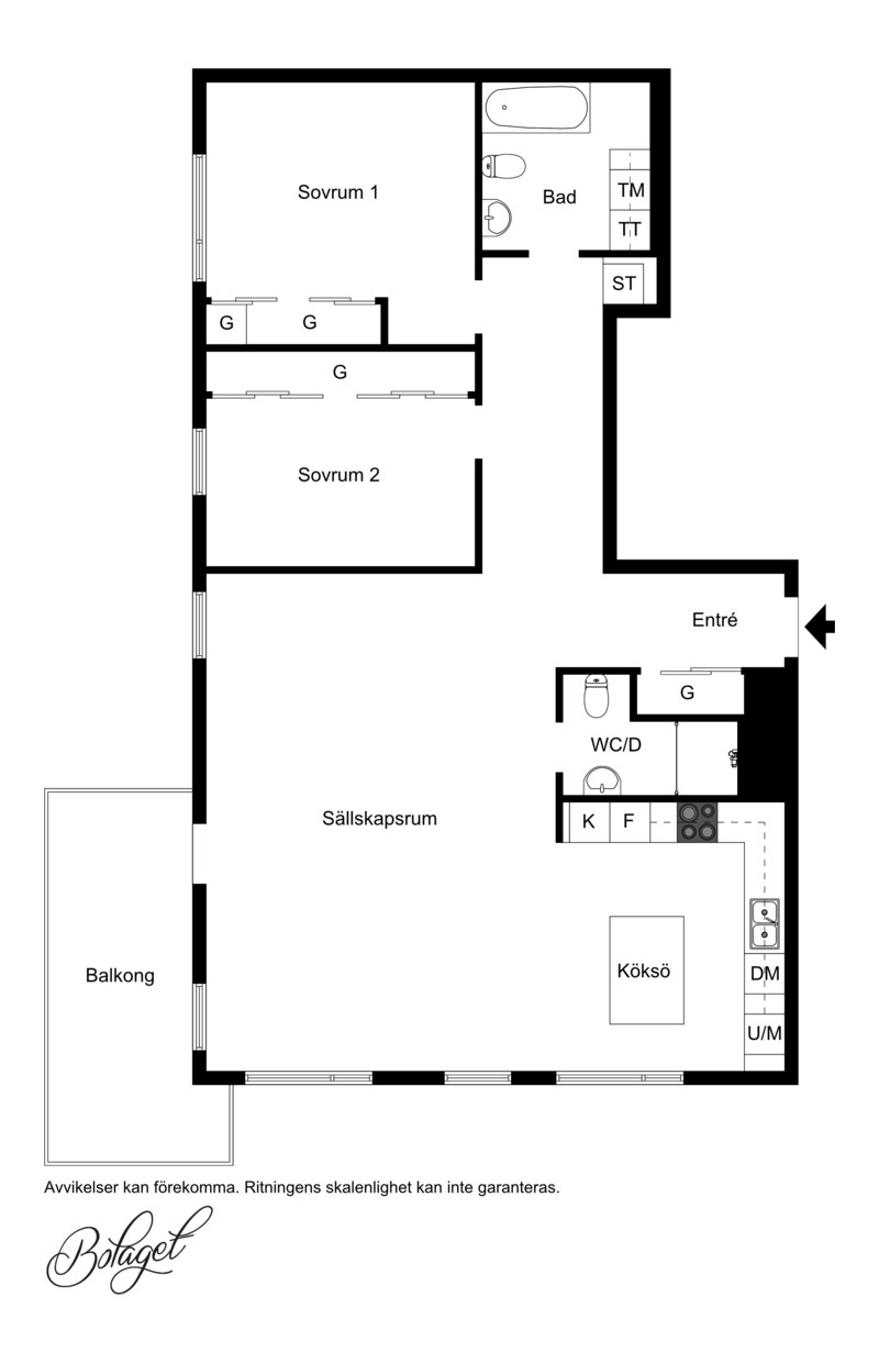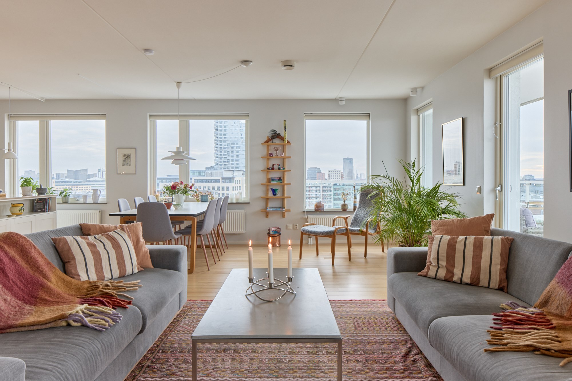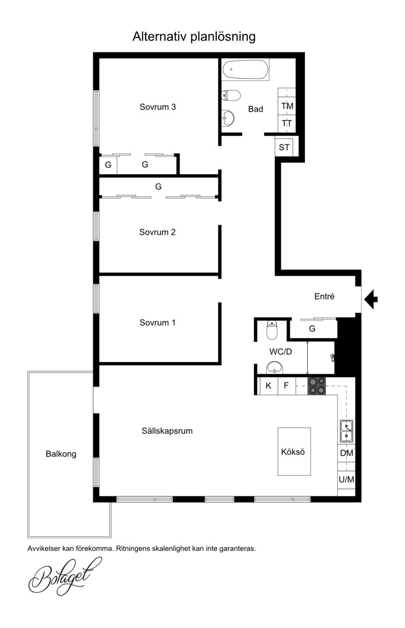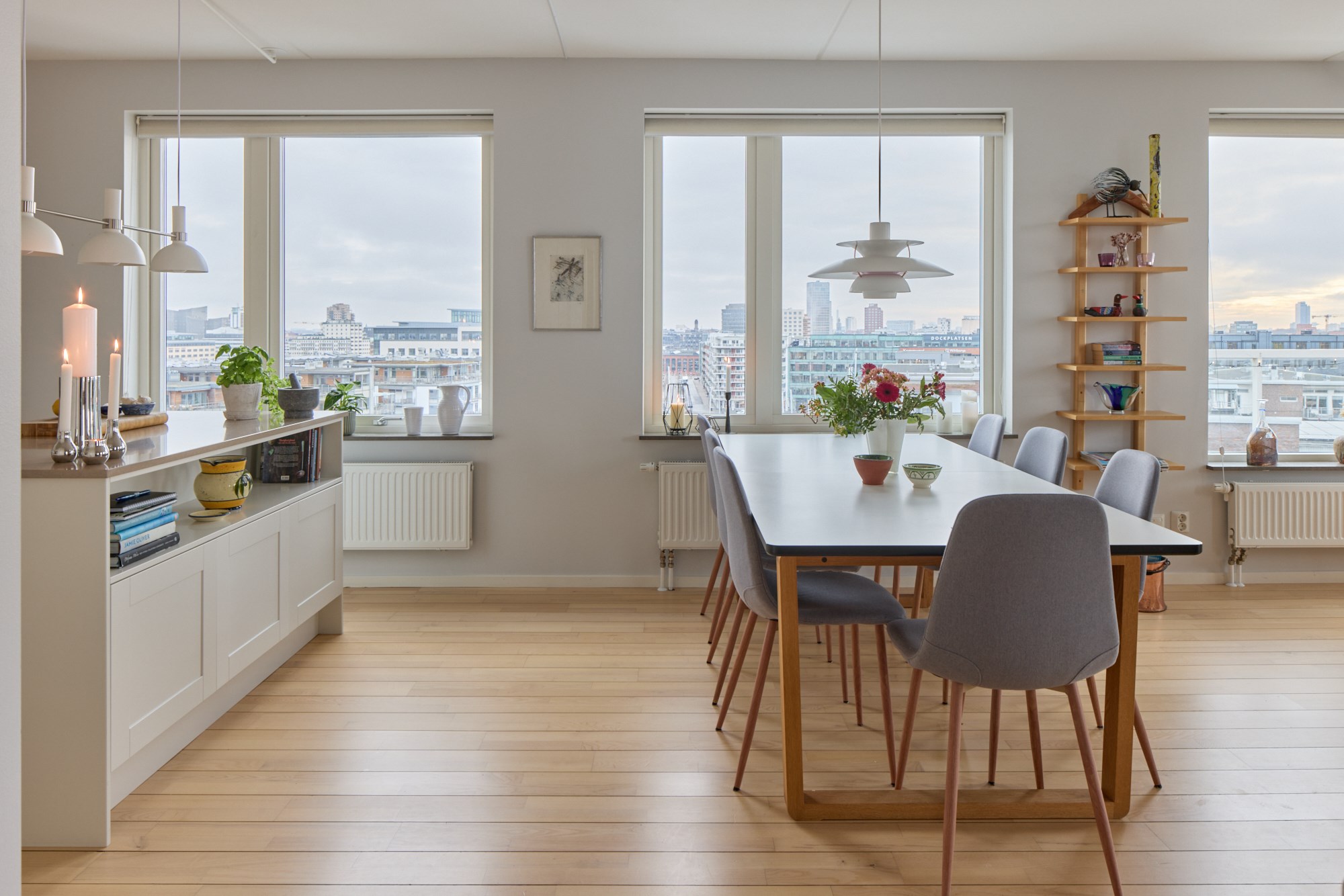 Skeppsgolv och ljusa väggar. Plats för soffgrupp och matplats. Utgång till balkong.
