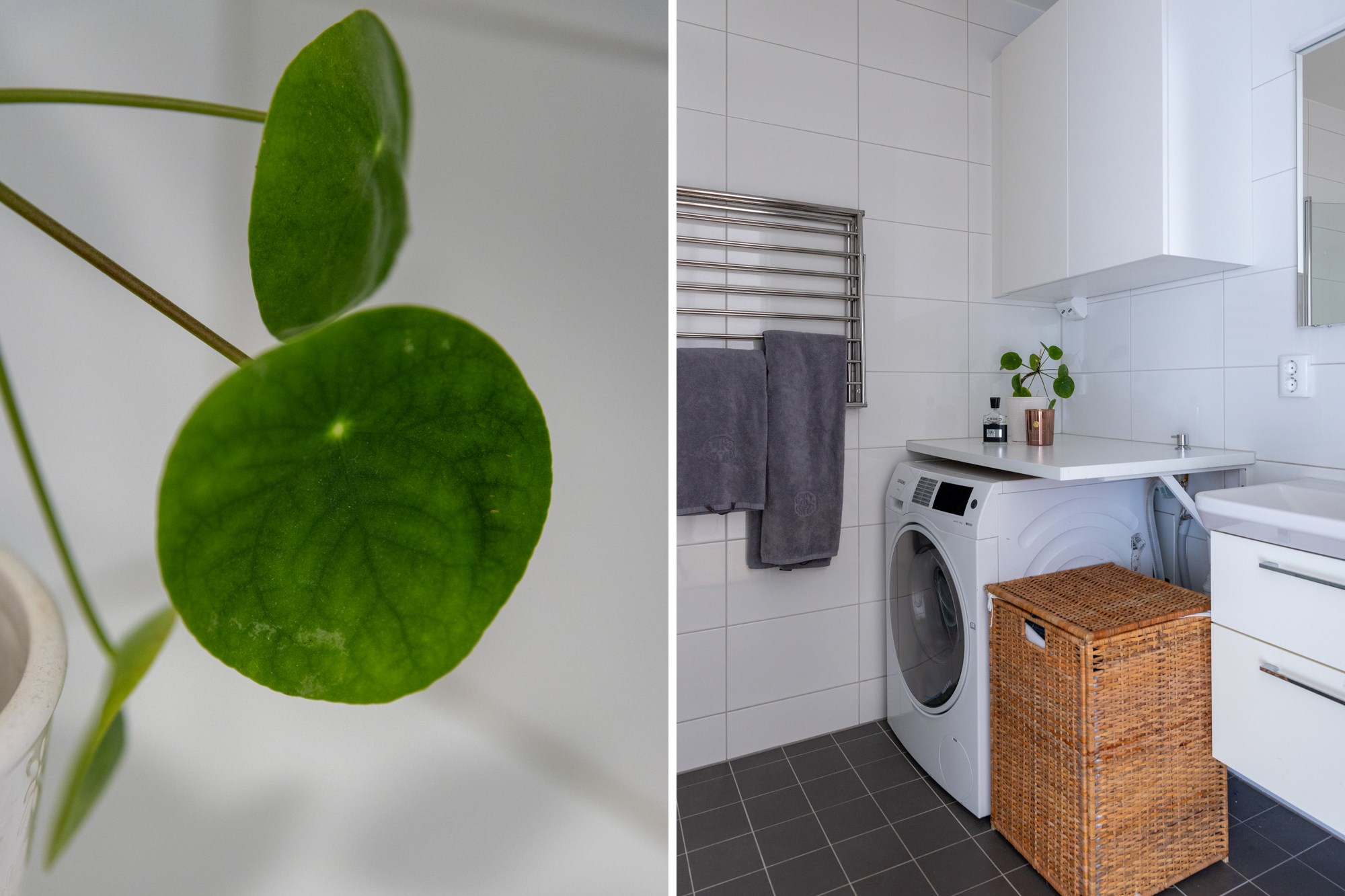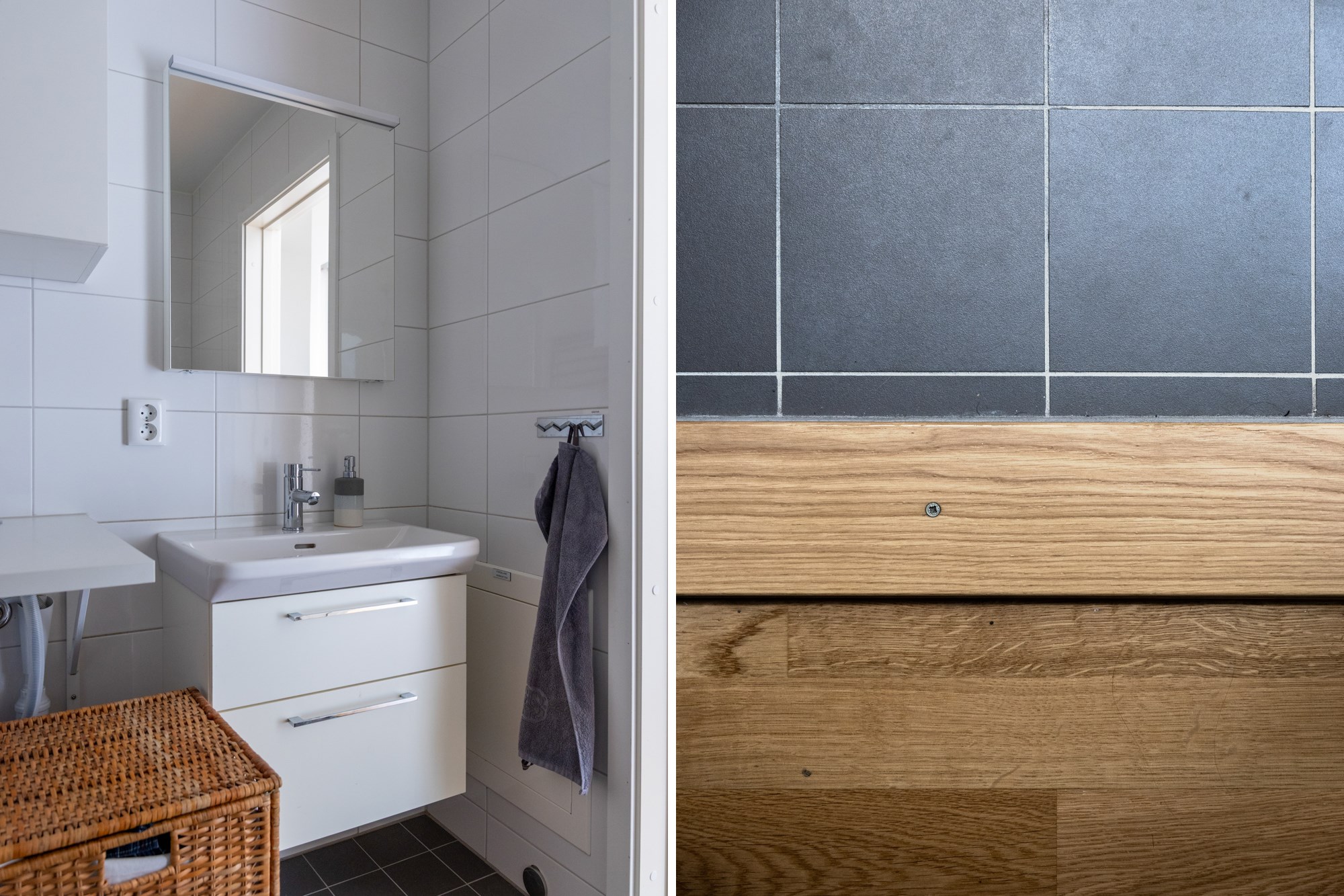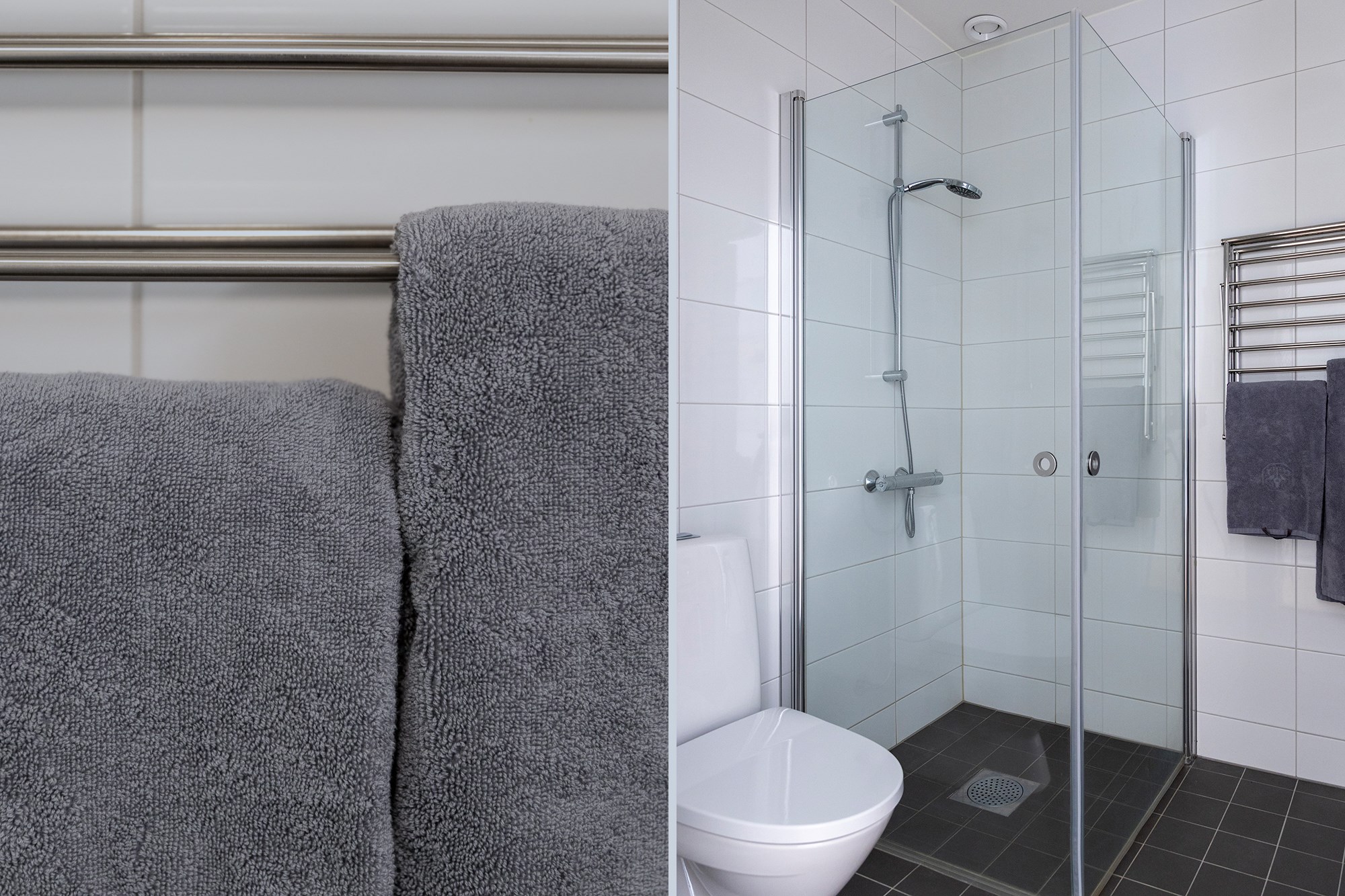 Helkaklat badrum. Grå klinker till golv och vita kaklade väggar. Utrustad med WC, handfat med kommod, dusch, handdukstork, tvättmaskin/torktumlare. Arbetsbänk och förvaringsskåp.