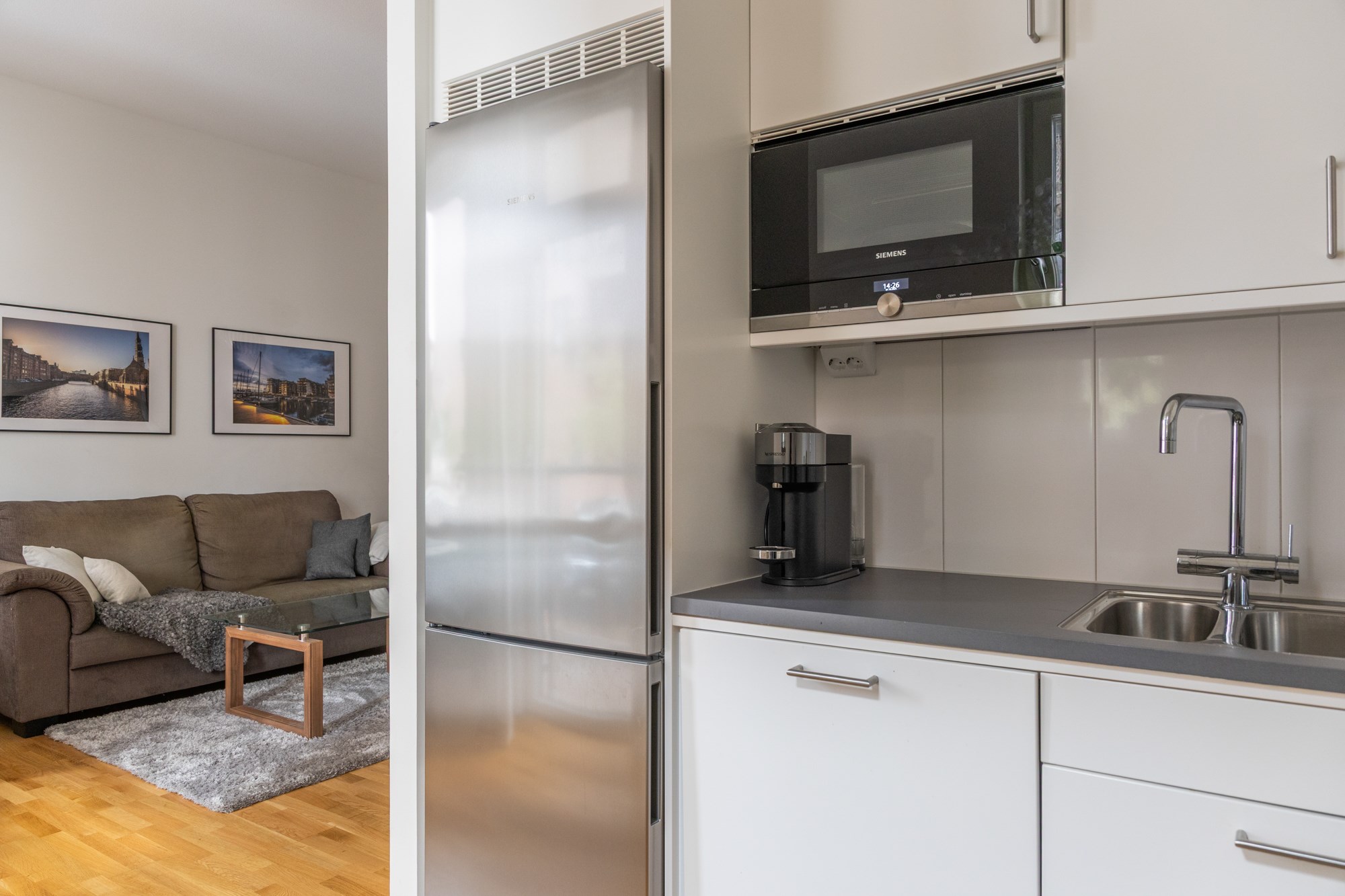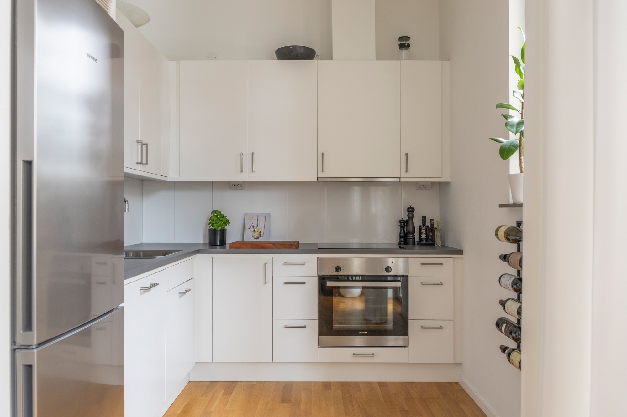 Parkettgolv och ljusa väggar. Vit köksinredning och bänkskiva i grå laminat. Maskinell utrustning i form av induktionshäll och fläkt, integrerad mikro, diskmaskin, kyl/frys.
