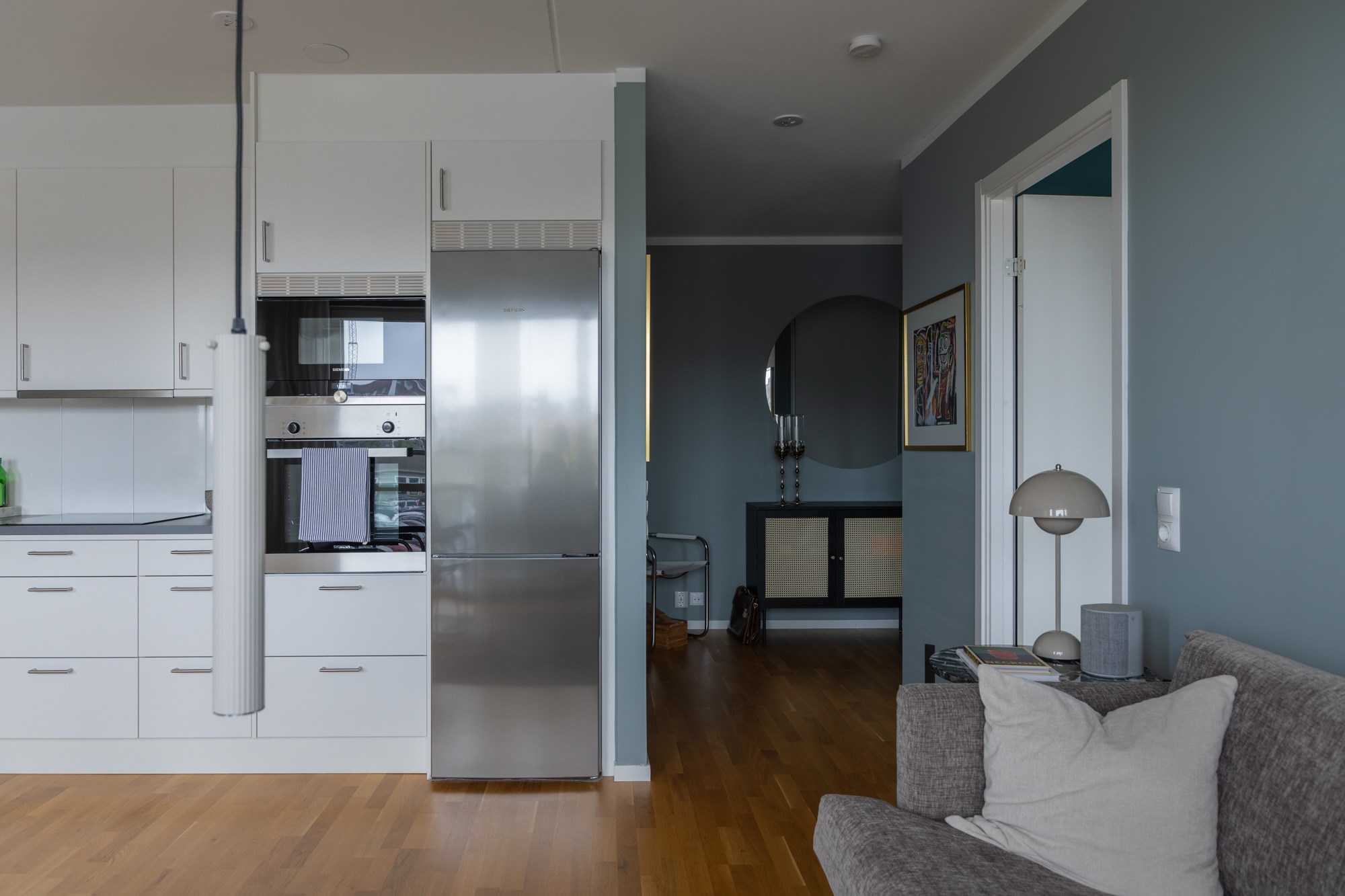 Parkettgolv och väggar målade i en blå färg. Vit köksinredning och grå bänkskiva i laminat. Maskinell utrustning i form av induktionshäll och fläkt, integrerad mikro, ugn, diskmaskin, kyl och frys.