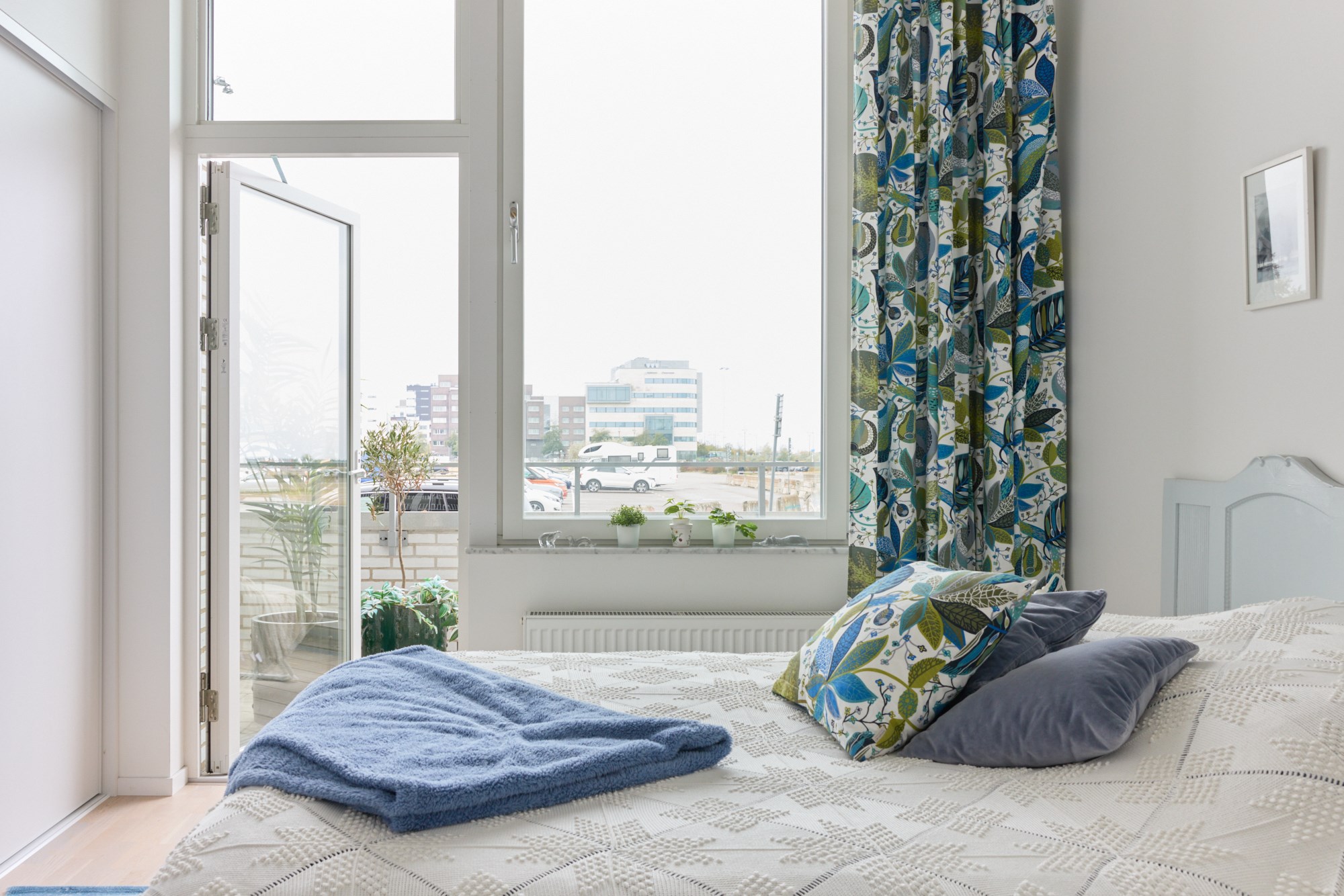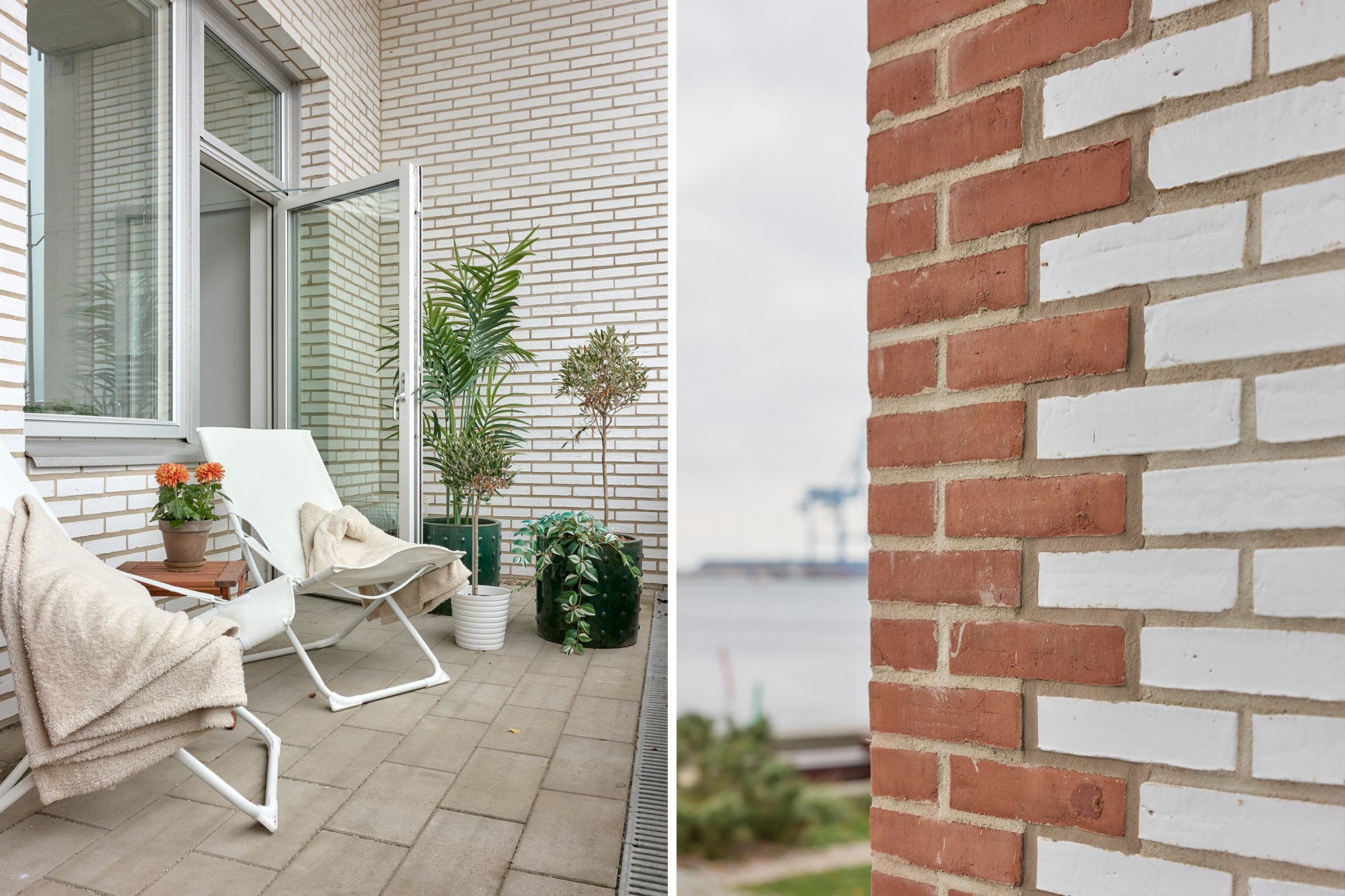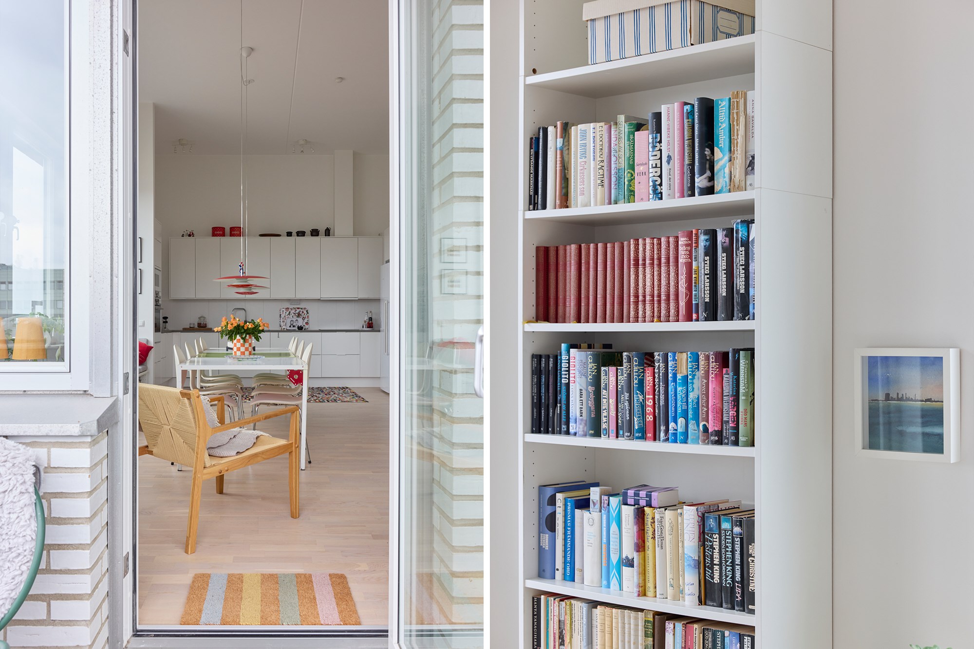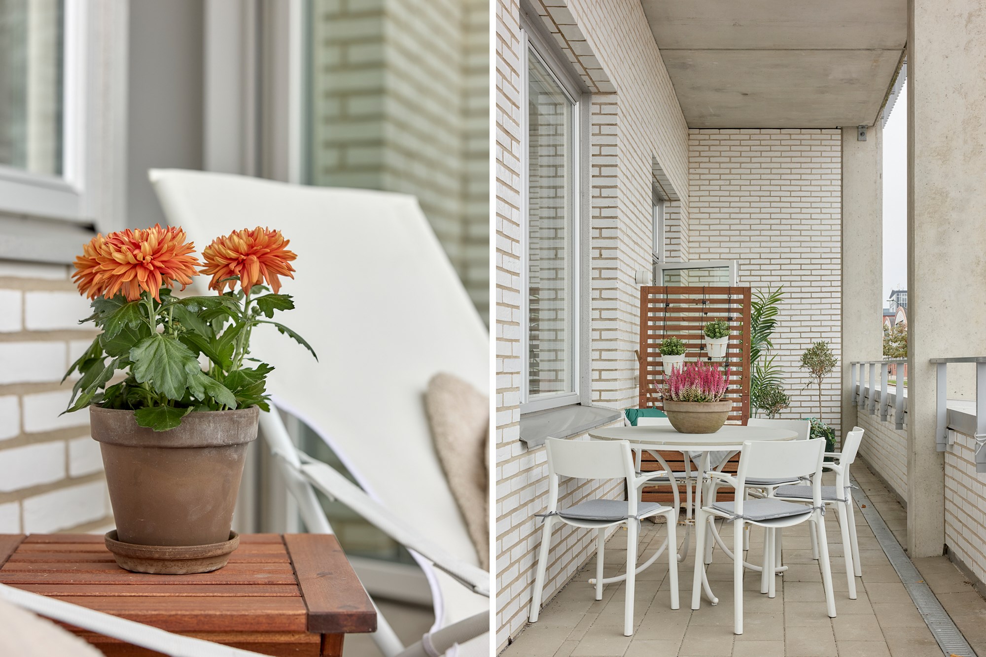Parkettgolv och ljusa väggar. Utgång till balkong.