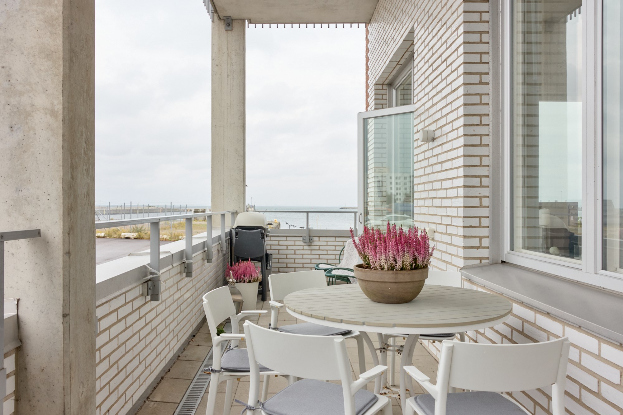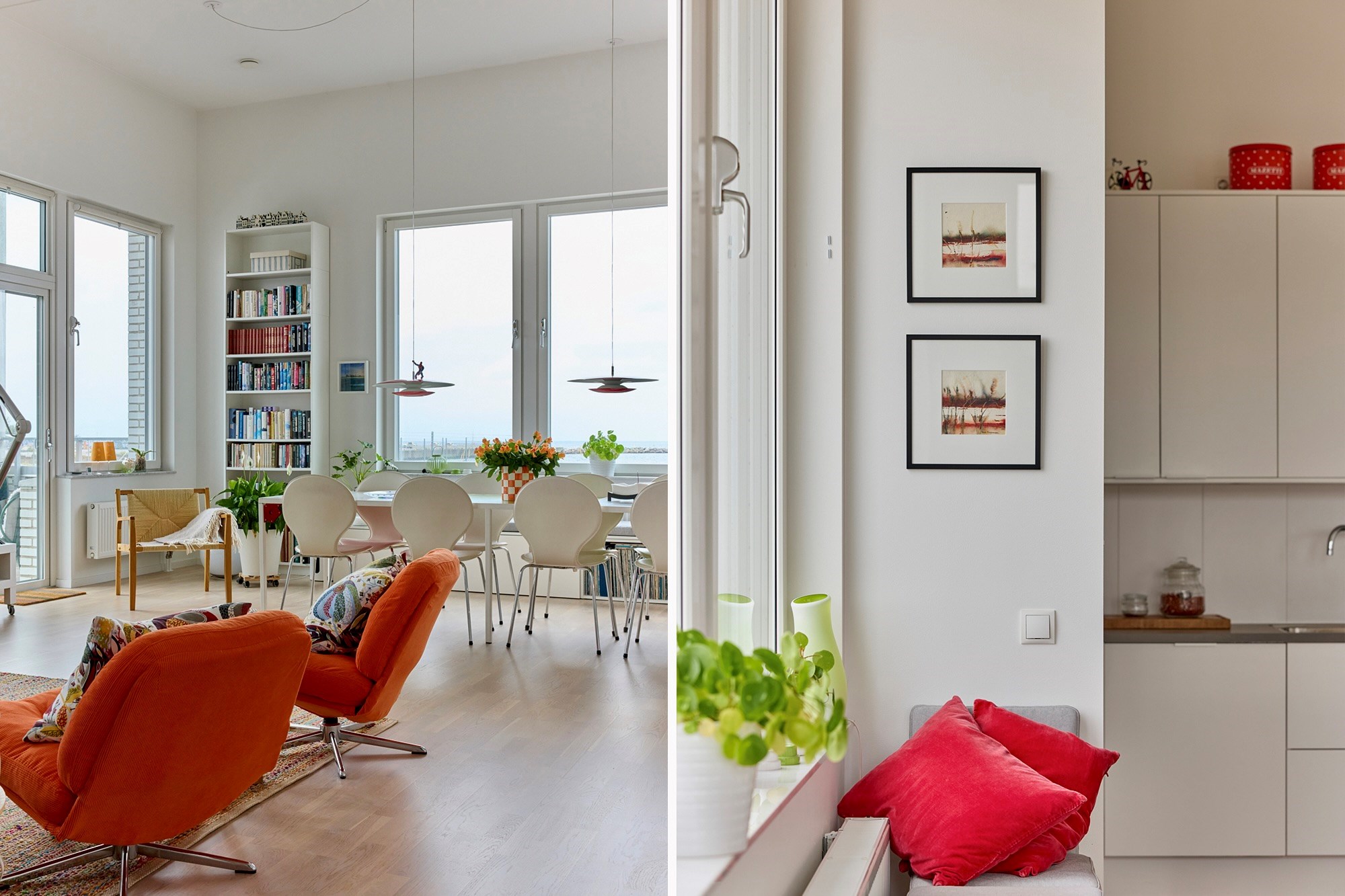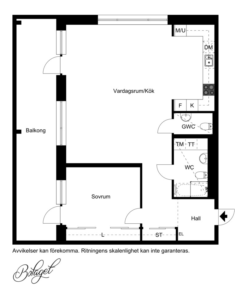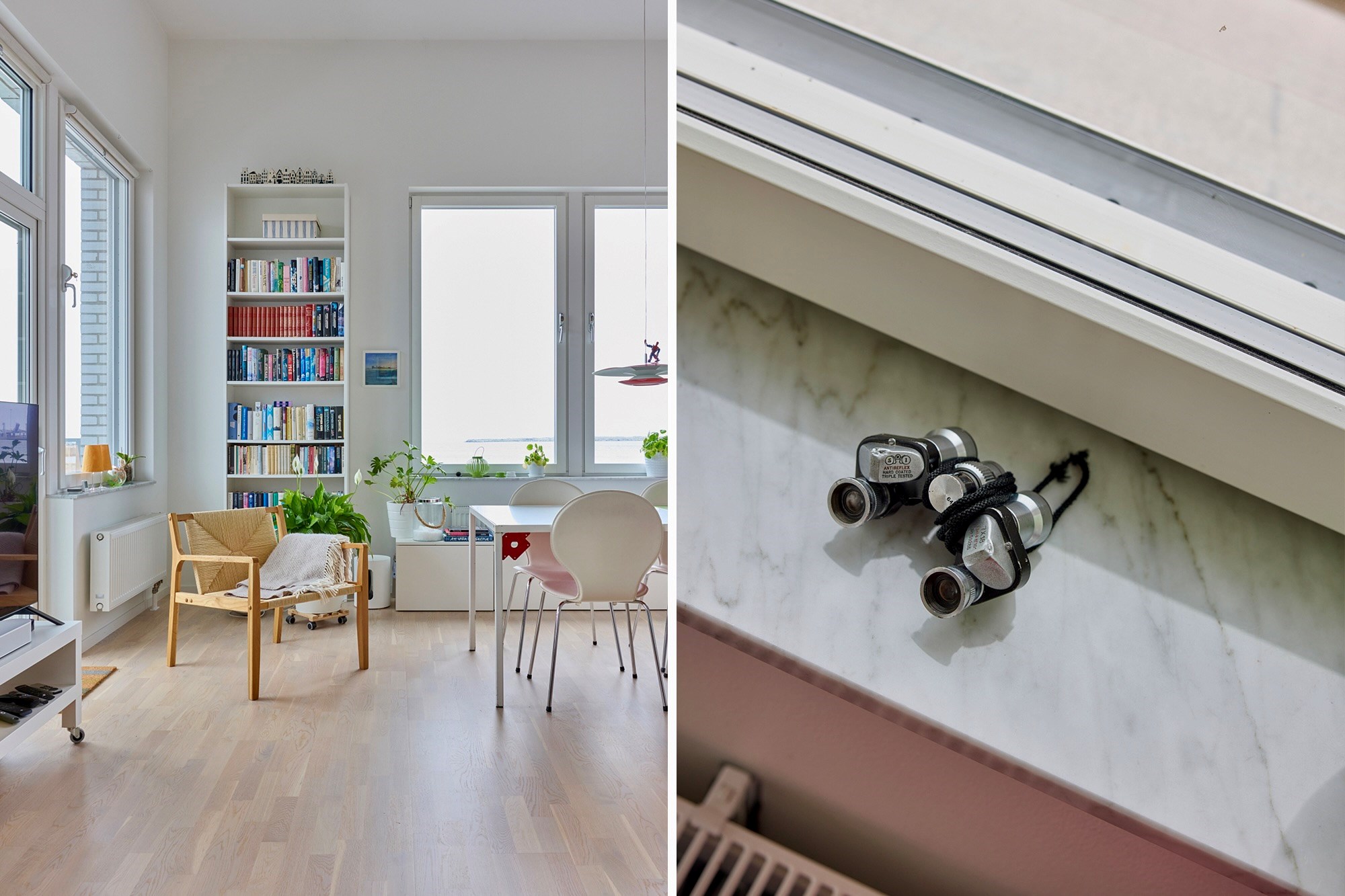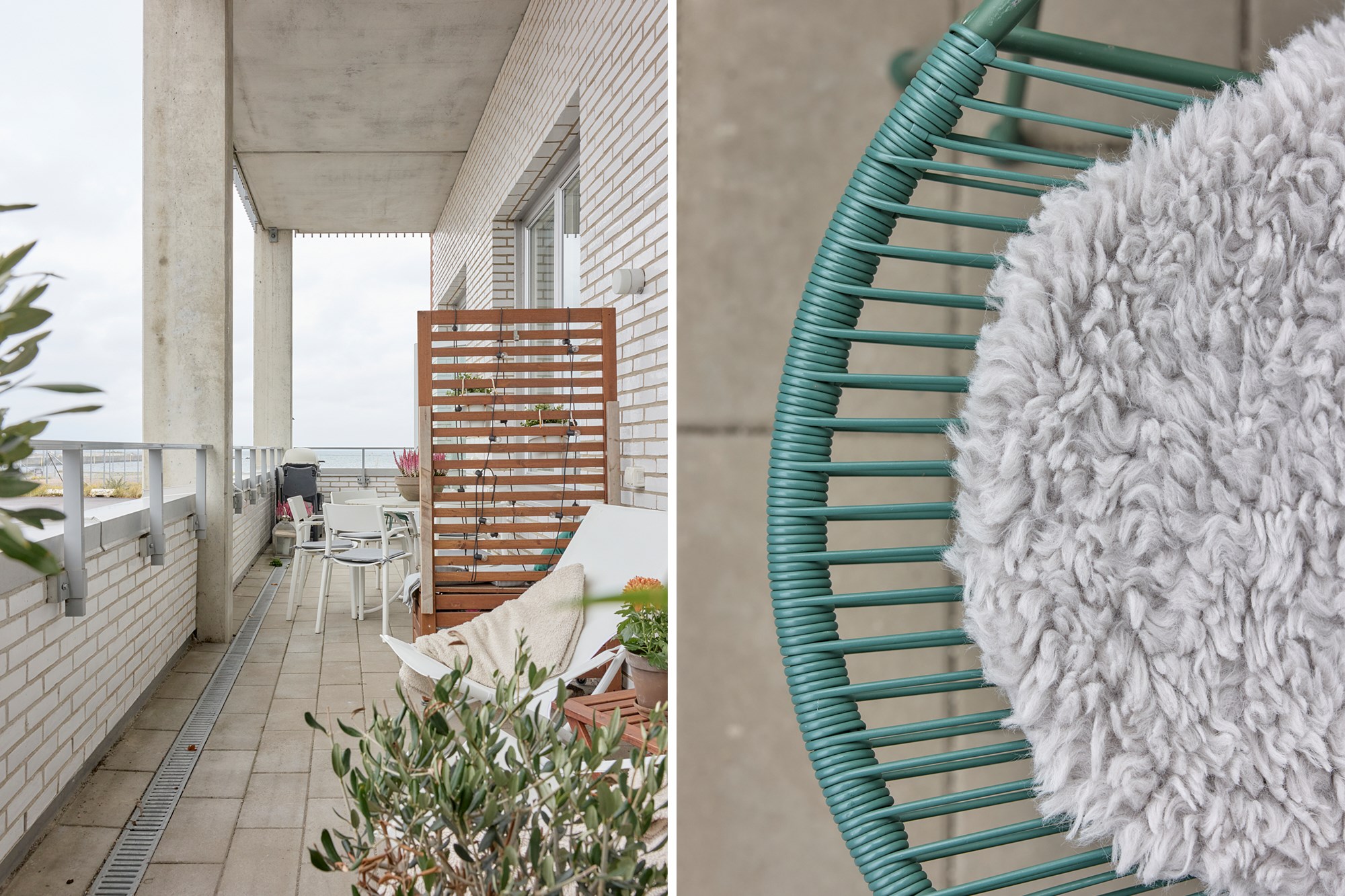 Parkettgolv och ljusa väggar. Utgång till balkong.