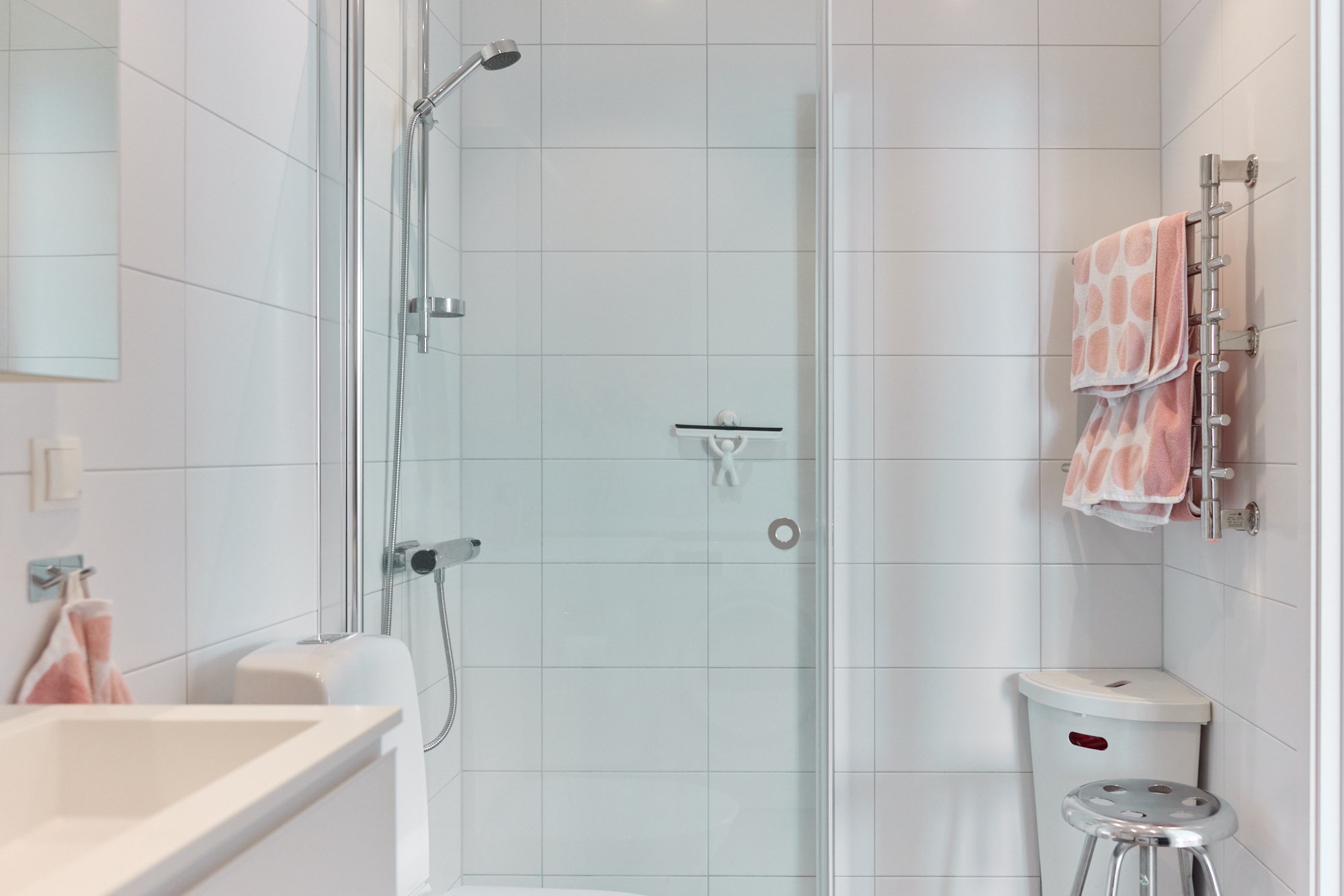Helkaklat badrum. Grå klinker till golv och vita kaklade väggar. Utrustad med WC, handfat med kommod, dusch, handdukstork, tvättmaskin och torktumlare. Arbetsbänk och förvaringsskåp.