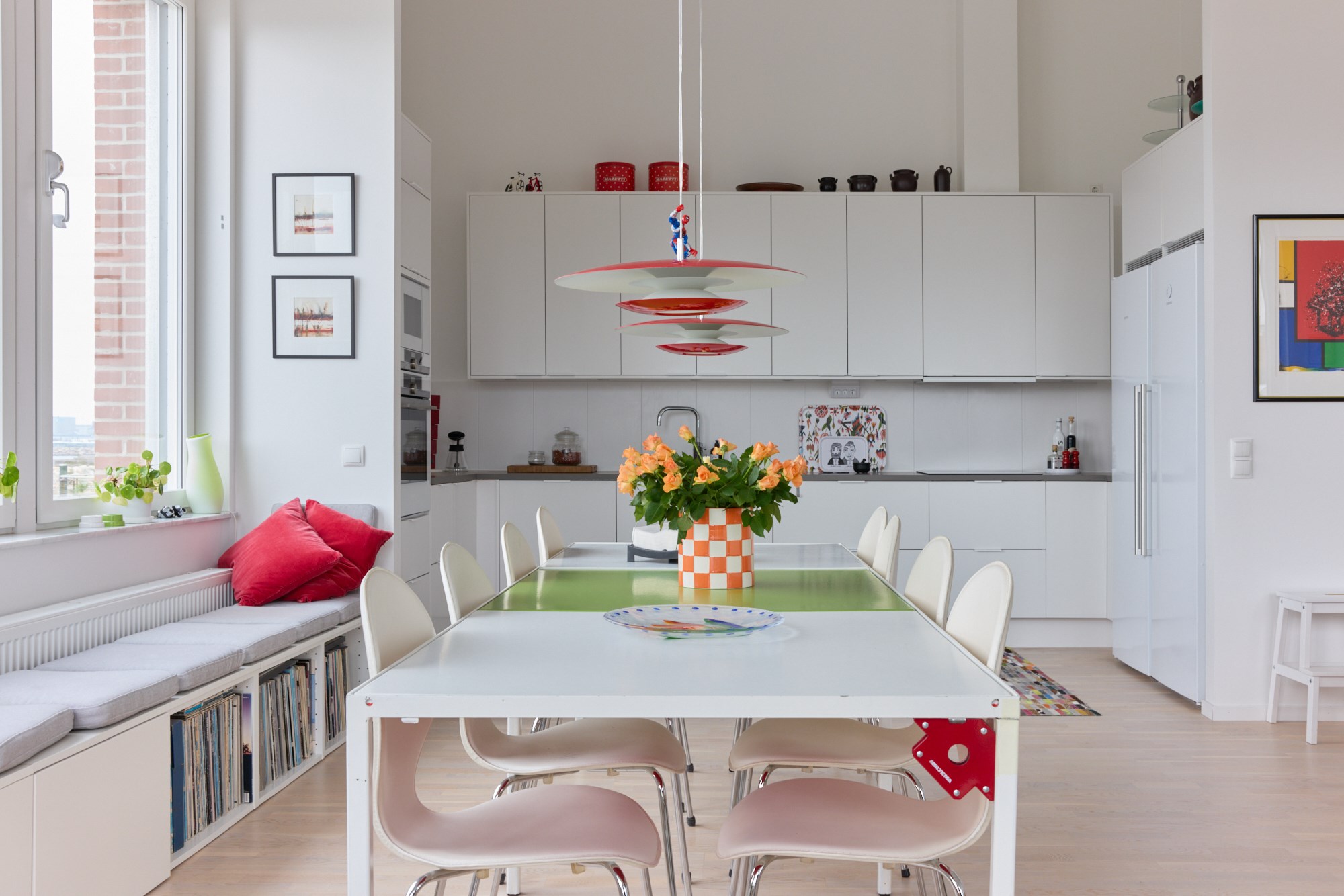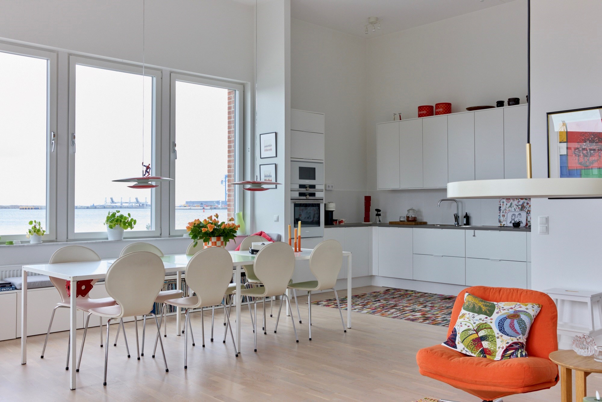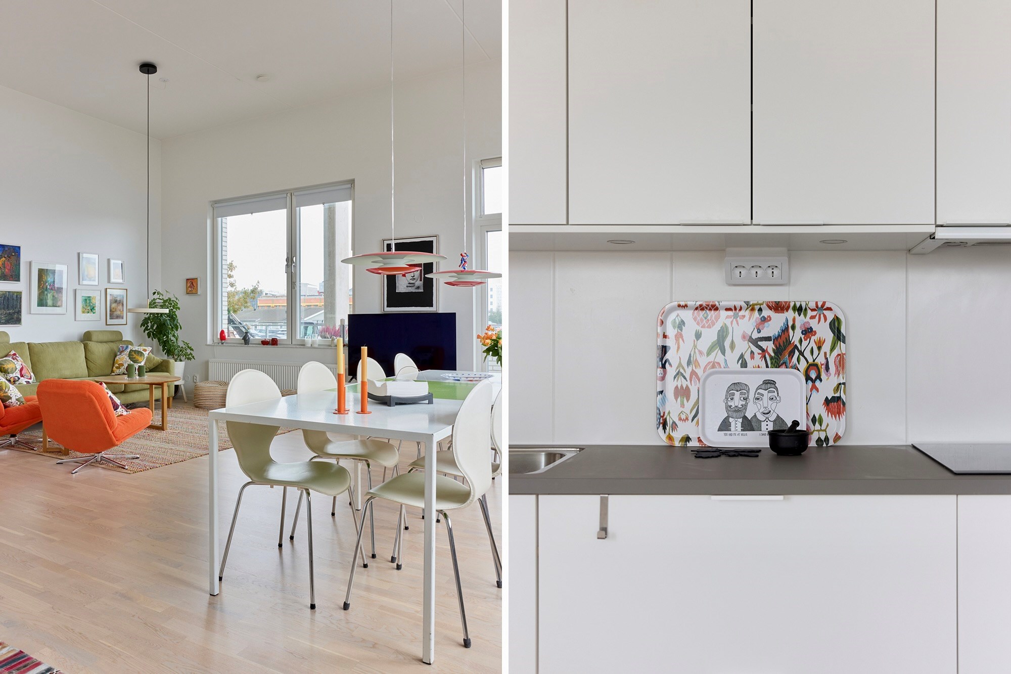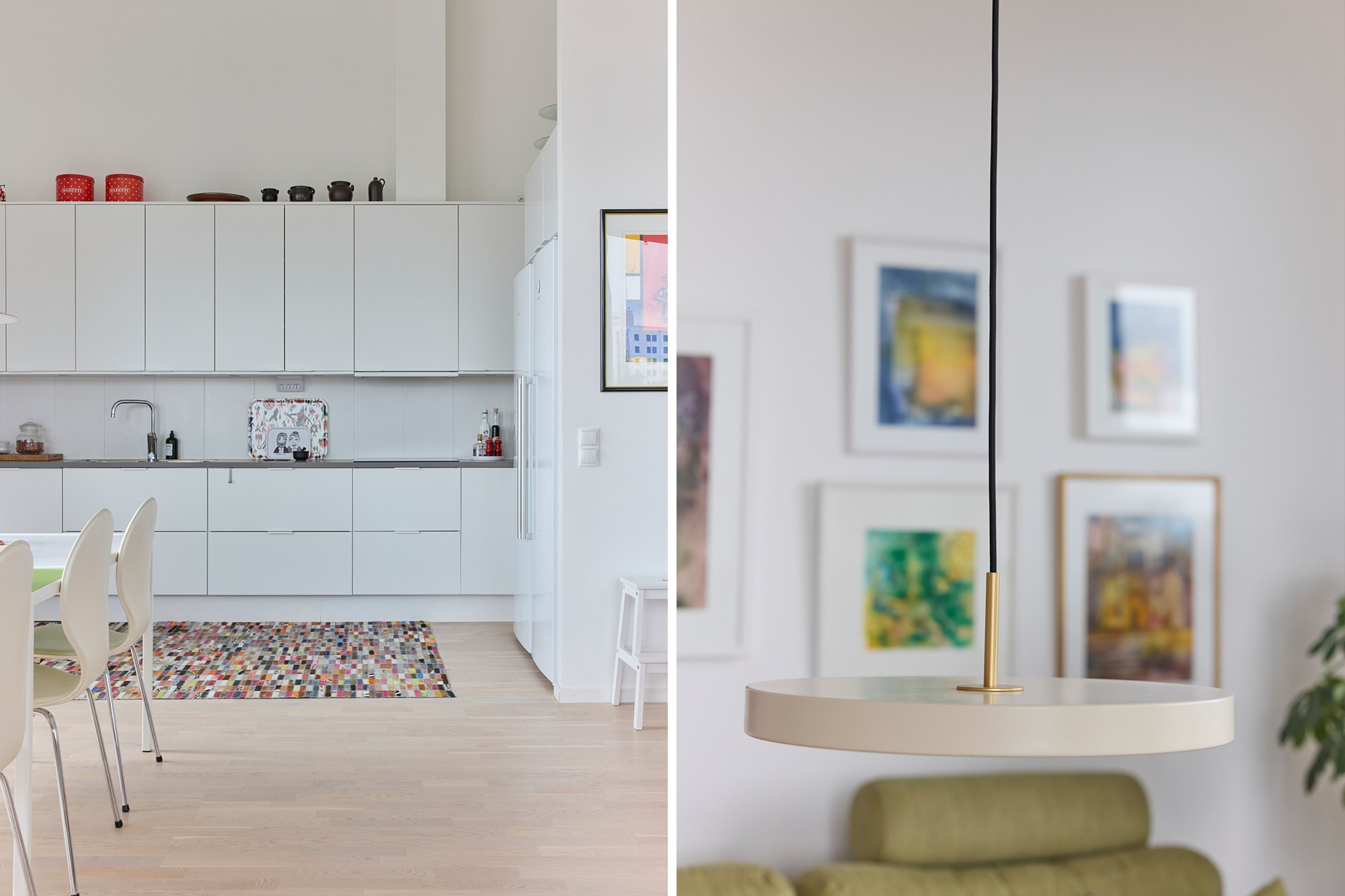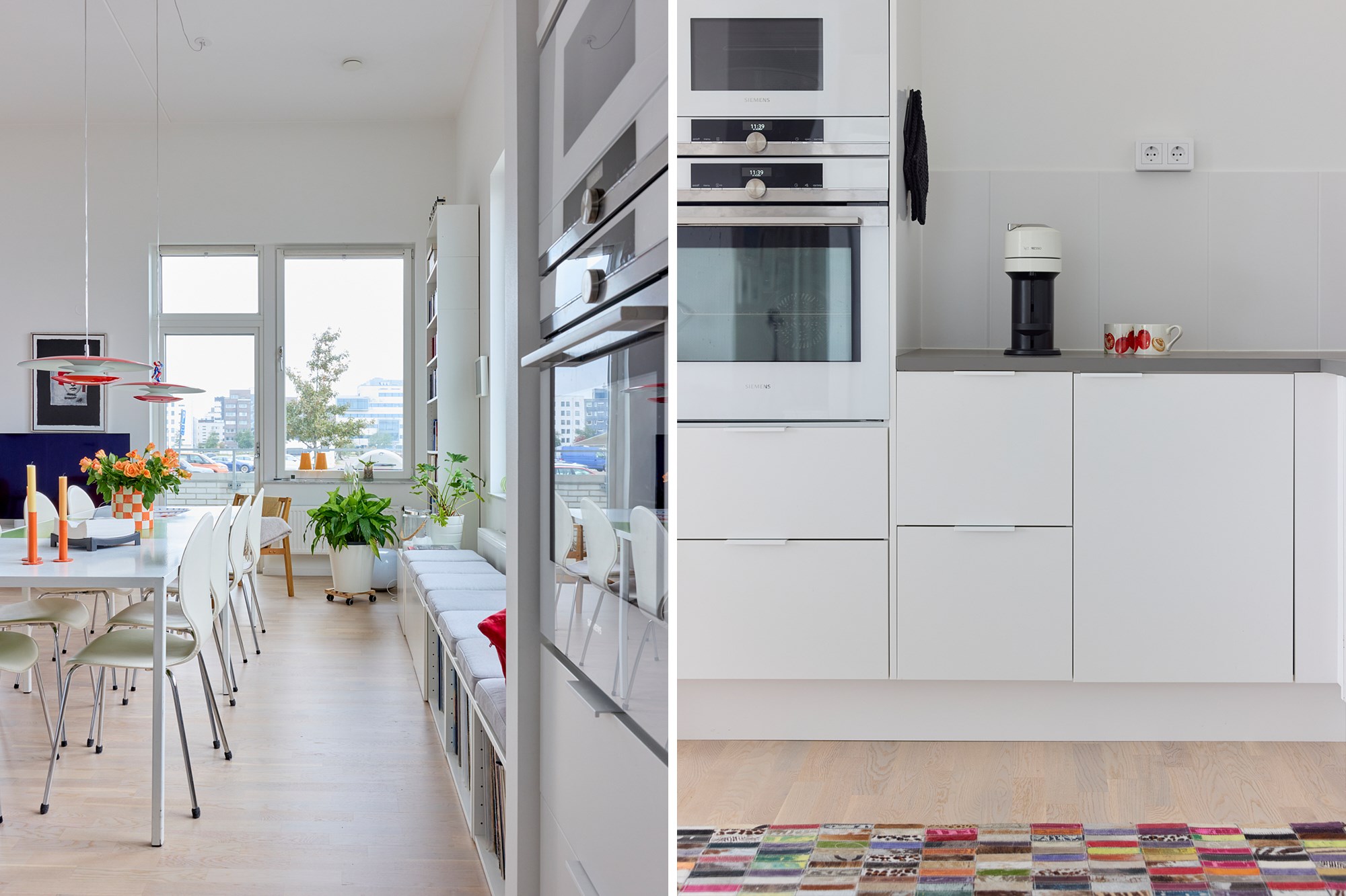 Parkettgolv och ljusa väggar. Vit köksinredning och bänkskiva i grått. Maskinell utrustning i form av induktionshäll och fläkt, ugn, integrerad mikro, diskmaskin, hel kyl samt hel frys.