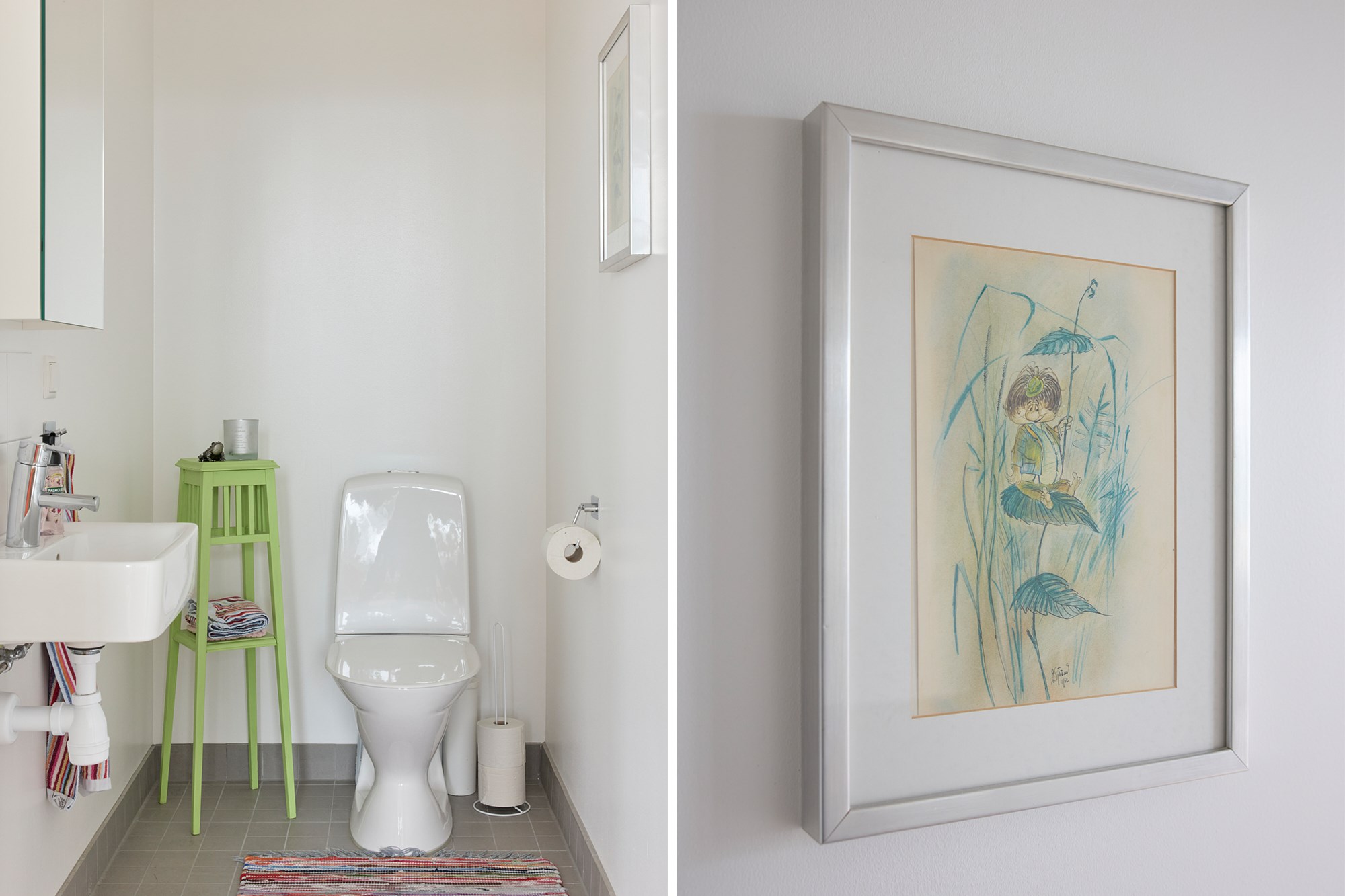 Grå klinker till golv och vita målade väggar. Utrustad med WC och handfat.