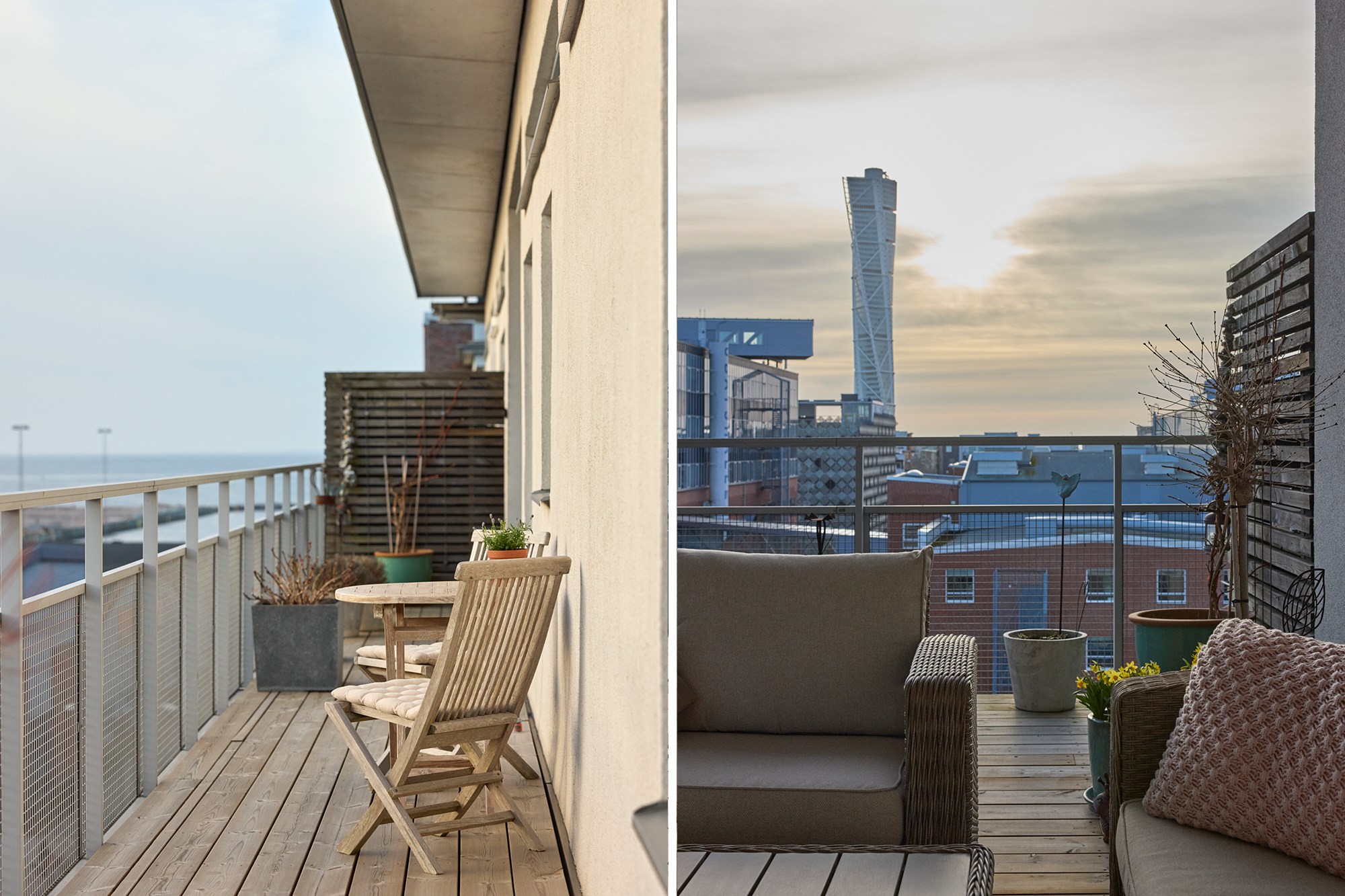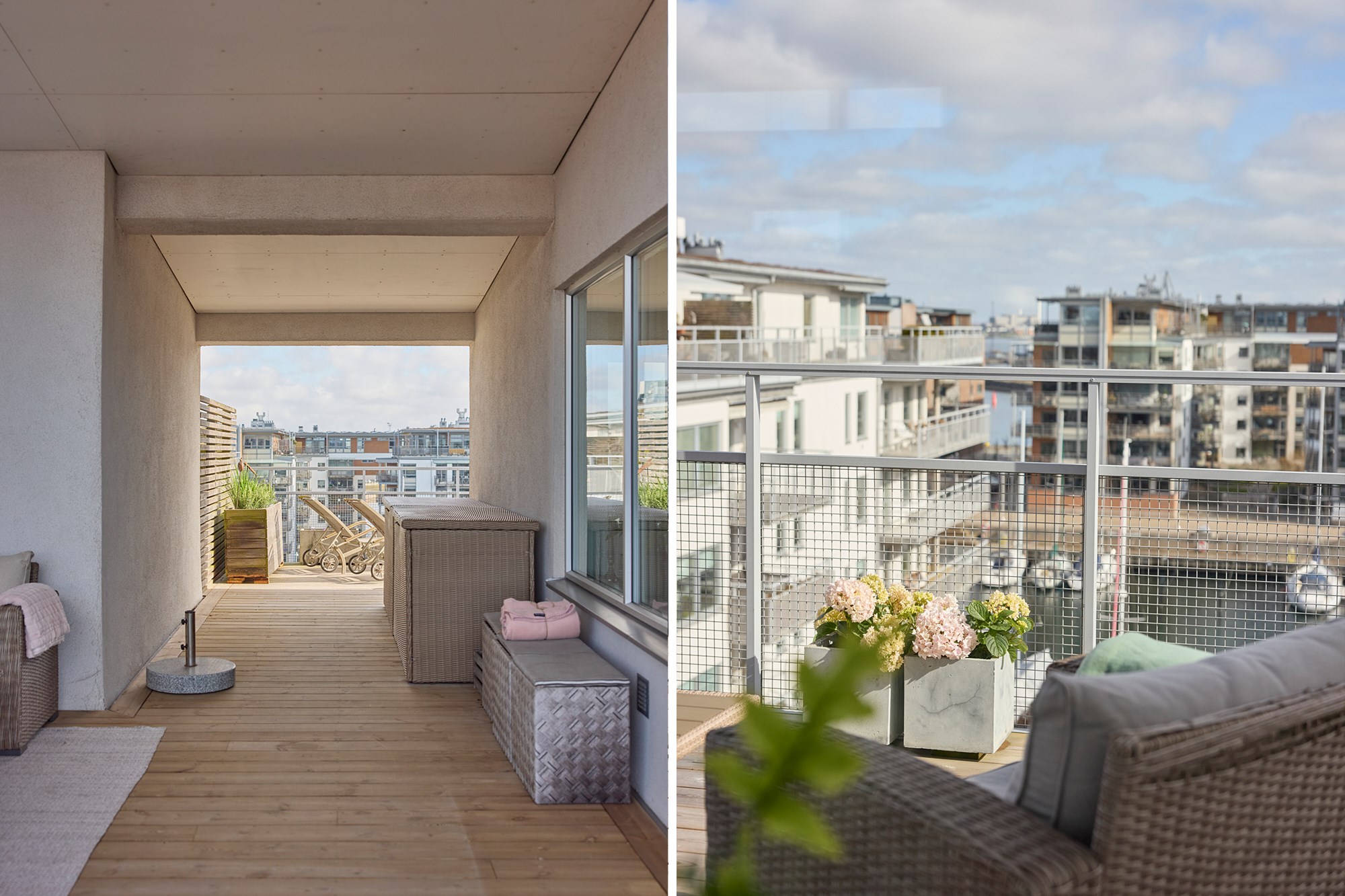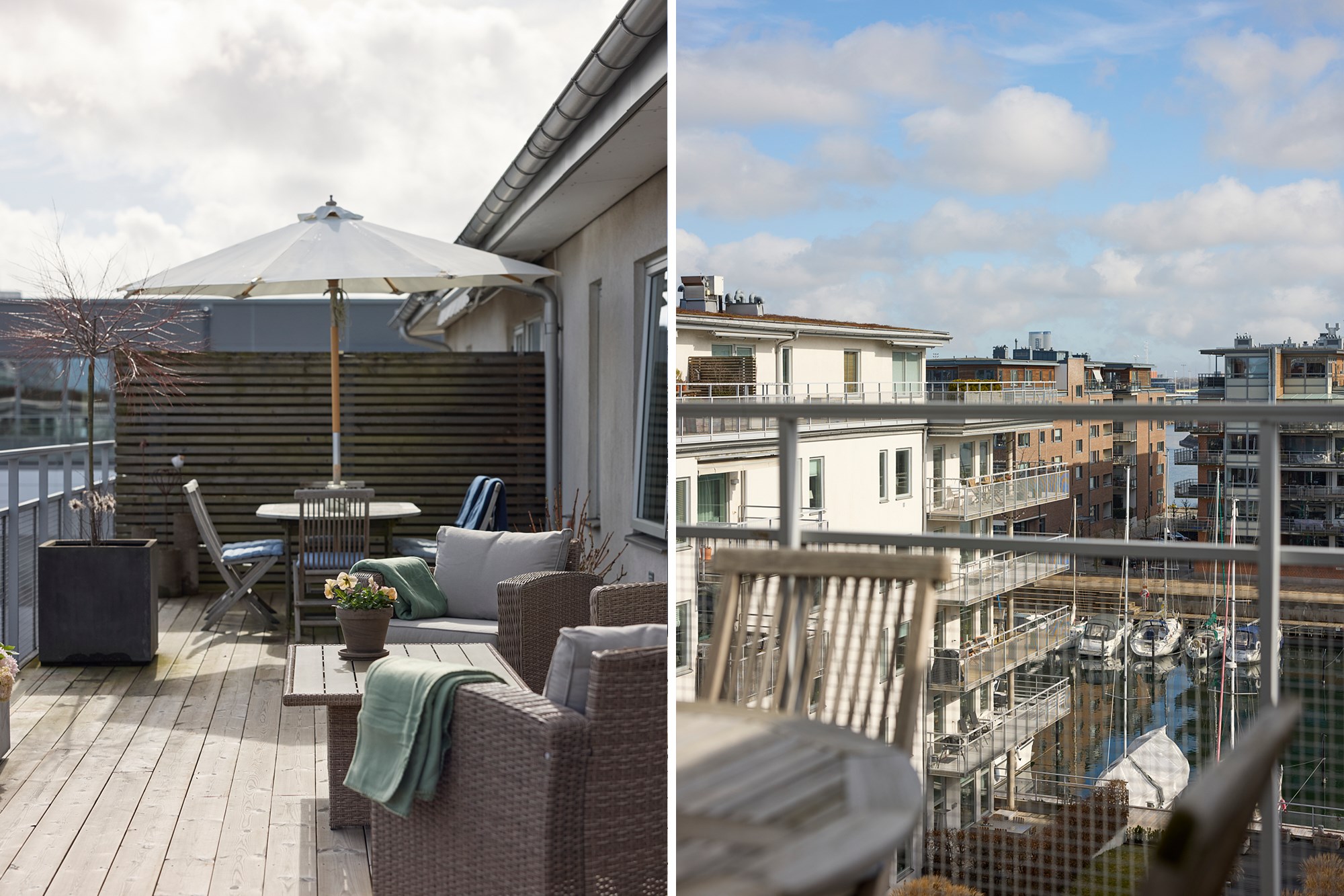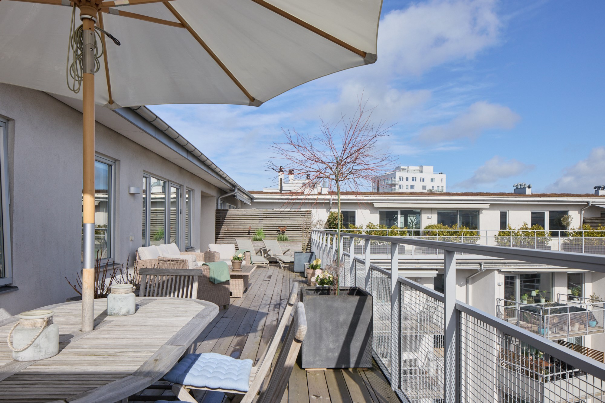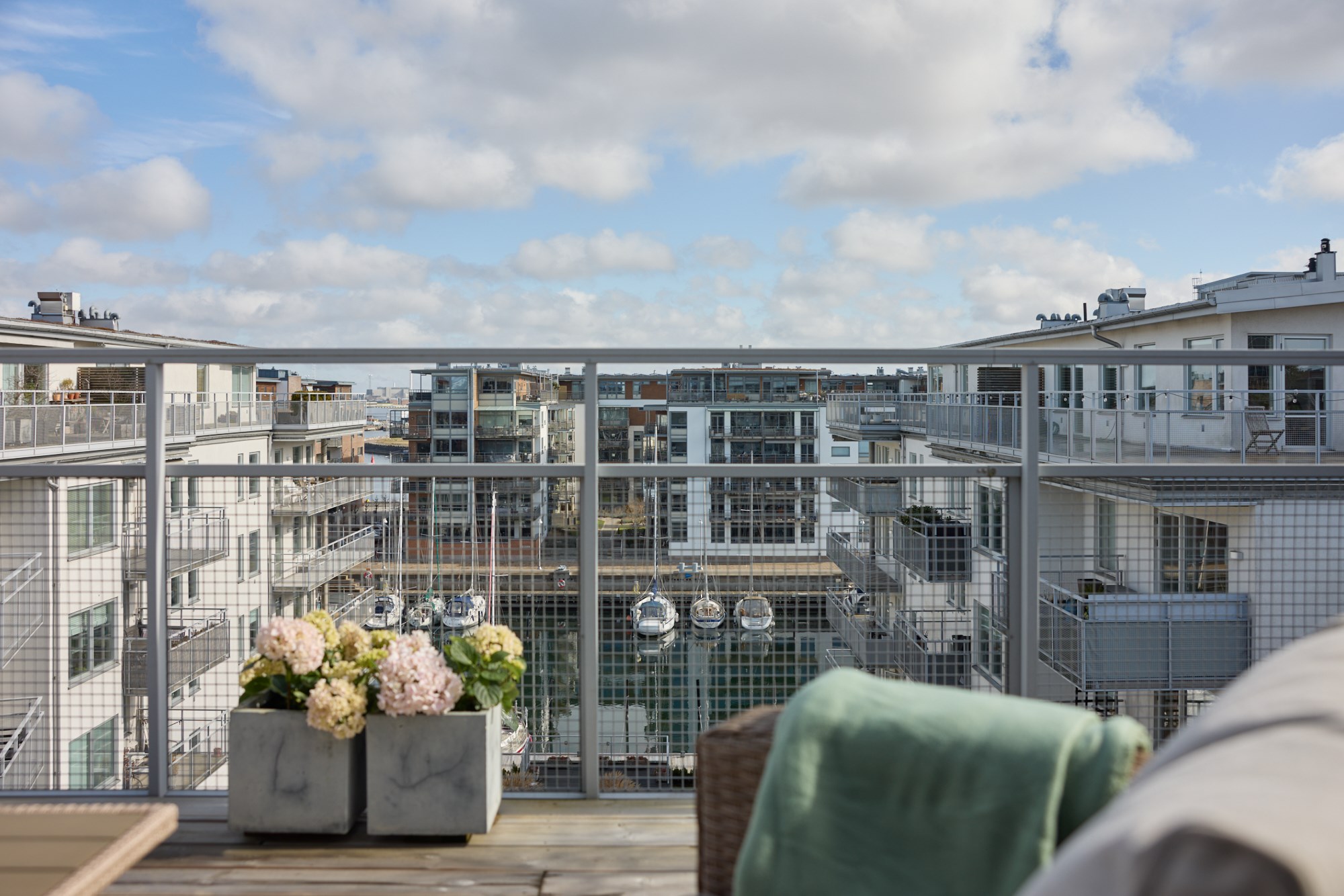 Högst upp i huset omringad av blå himmel med en spektakulär utsikt över marinan och havet i horisonten ligger ett unikt boende med takterass i tre väderstreck. Våningens 99 kvadrat är omringad av en uteplats på hela 108 kvadrat. Himlen, en förnäm utsikt och vattenblänk nere i småbåtshamnen präglar hela våningen. Sällskapsrum med integrerat kök har generösa fönsterpartier vilket skapar en utsuddad gräns mellan ute och inne. Här följer man solens uppgång tills den sänker sig ner i den vida horisonten och himlen färgas röd. Sällskapsrum, kök och tre sovrum har arkitektoniska ett sluttande tak skapar rymd och högst upp sitter överljus. Här bor ni helt utan grannar vägg i vägg och känslan av ett modernt "Karlsson på taket" - hus! Här bor ni i eftertraktade Brf Kajhusen med härlig innergård och det lugna läget in mot småbåtshamnen.