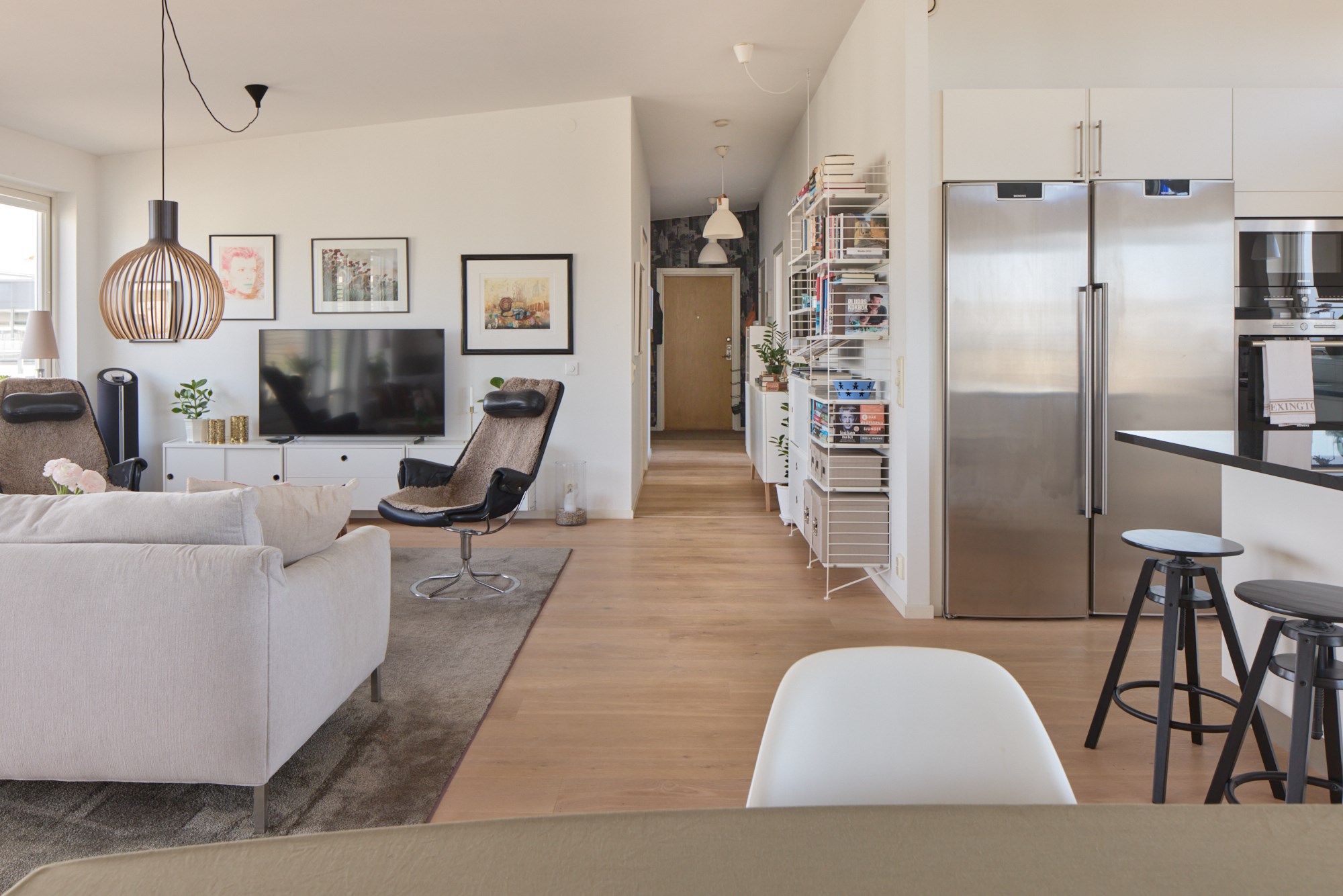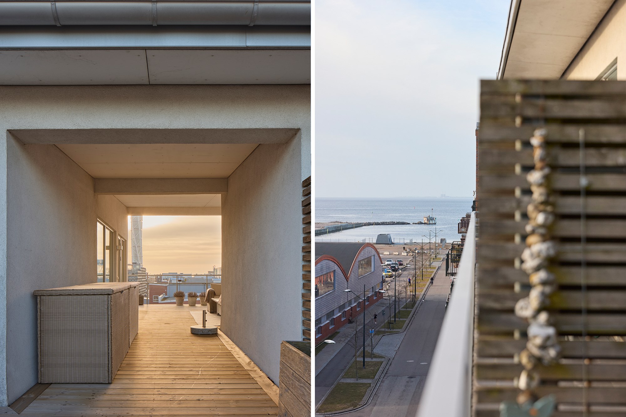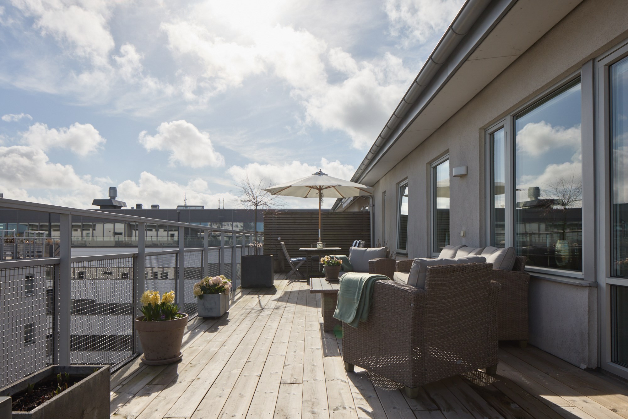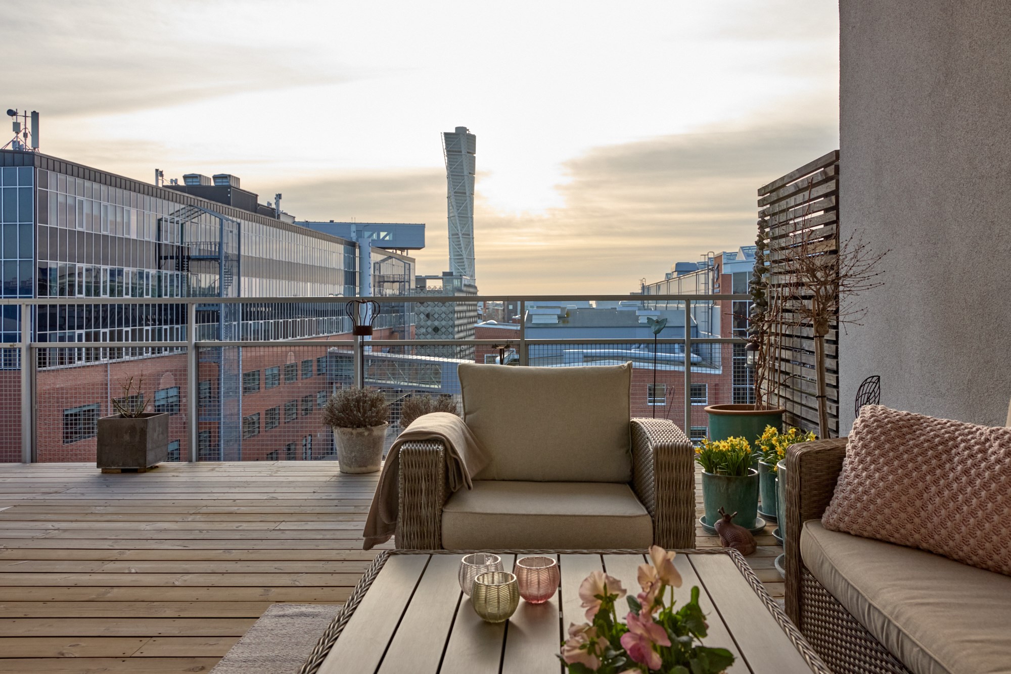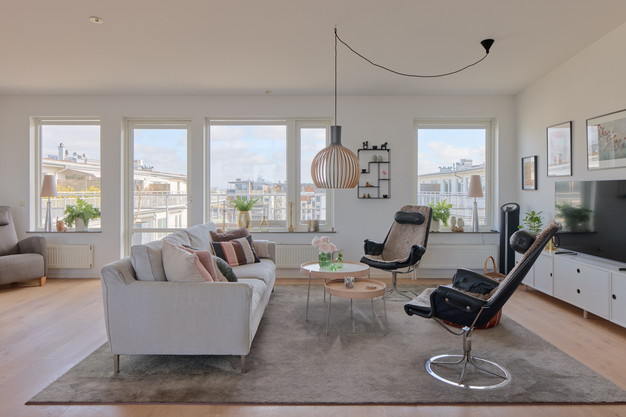 Högst upp i huset omringad av blå himmel med en spektakulär utsikt över marinan och havet i horisonten ligger ett unikt boende med takterass i tre väderstreck. Våningens 99 kvadrat är omringad av en uteplats på hela 108 kvadrat. Himlen, en förnäm utsikt och vattenblänk nere i småbåtshamnen präglar hela våningen. Sällskapsrum med integrerat kök har generösa fönsterpartier vilket skapar en utsuddad gräns mellan ute och inne. Här följer man solens uppgång tills den sänker sig ner i den vida horisonten och himlen färgas röd. Sällskapsrum, kök och tre sovrum har arkitektoniska ett sluttande tak skapar rymd och högst upp sitter överljus. Här bor ni helt utan grannar vägg i vägg och känslan av ett modernt "Karlsson på taket" - hus! Här bor ni i eftertraktade Brf Kajhusen med härlig innergård och det lugna läget in mot småbåtshamnen.