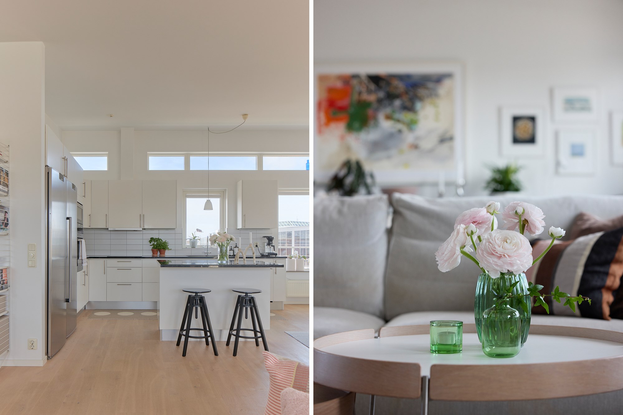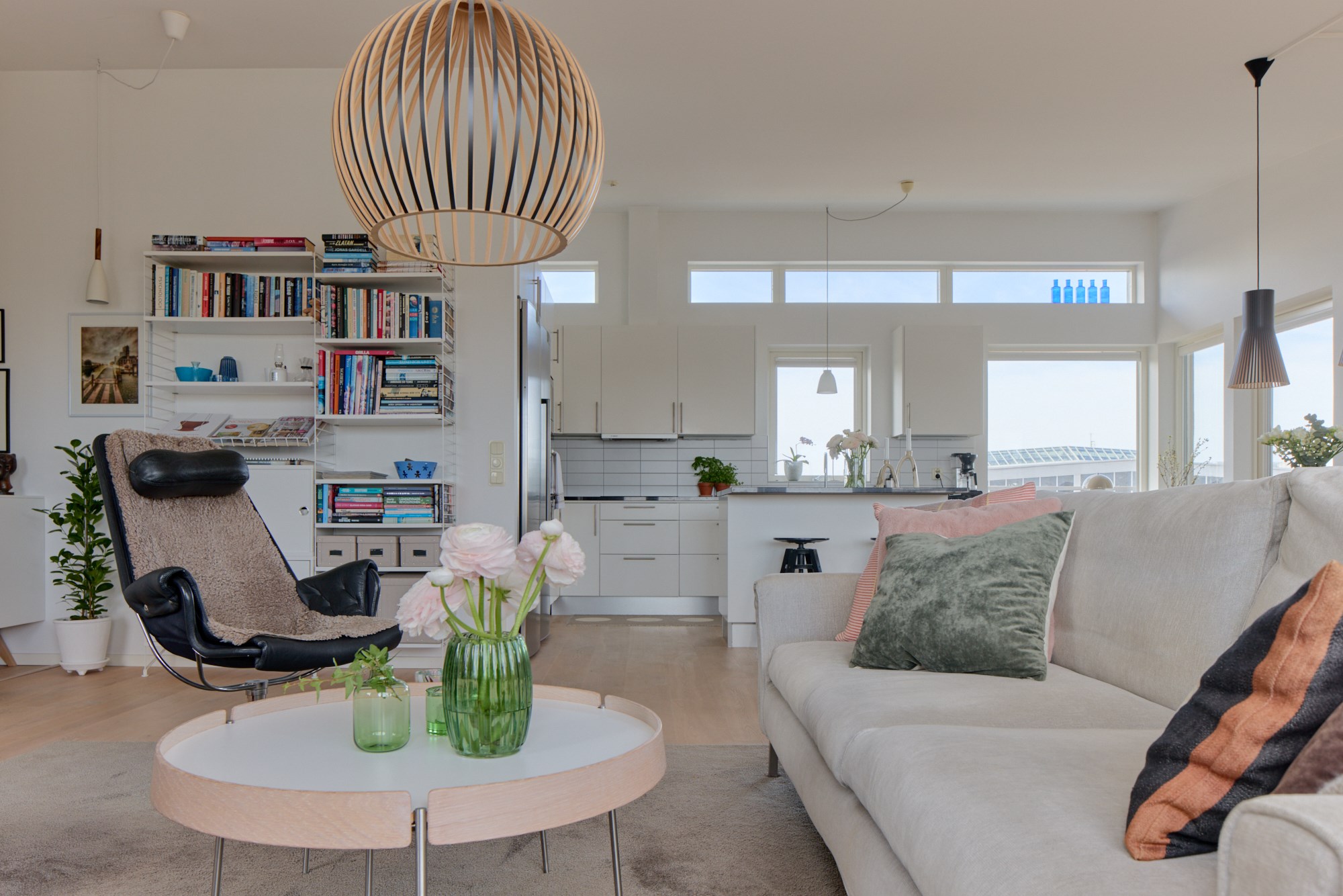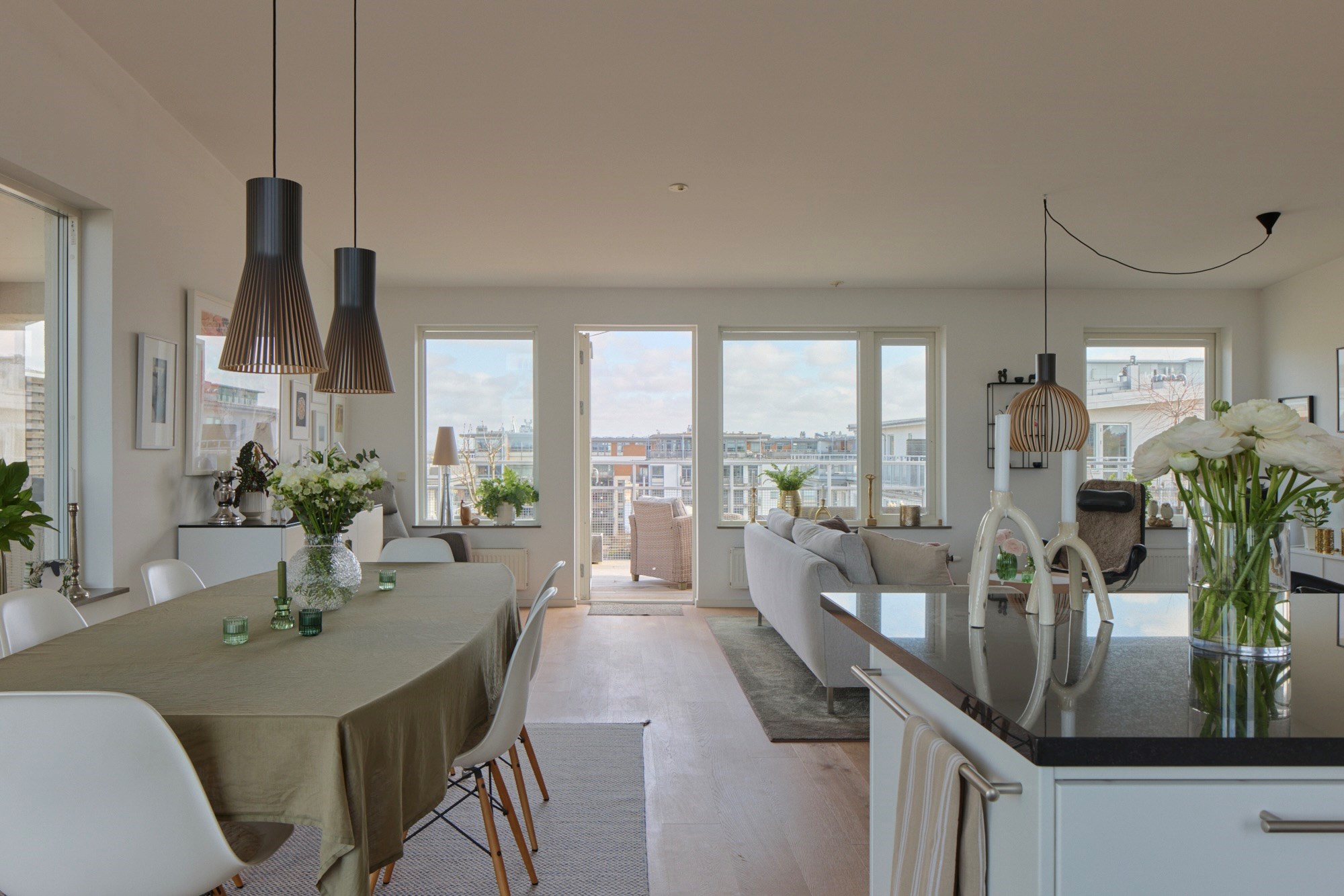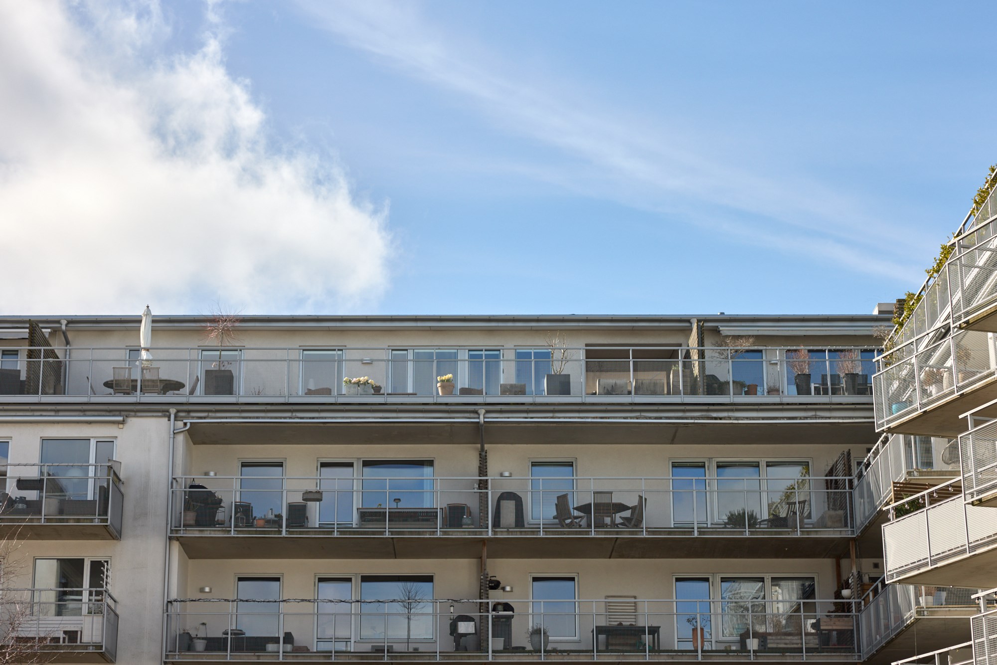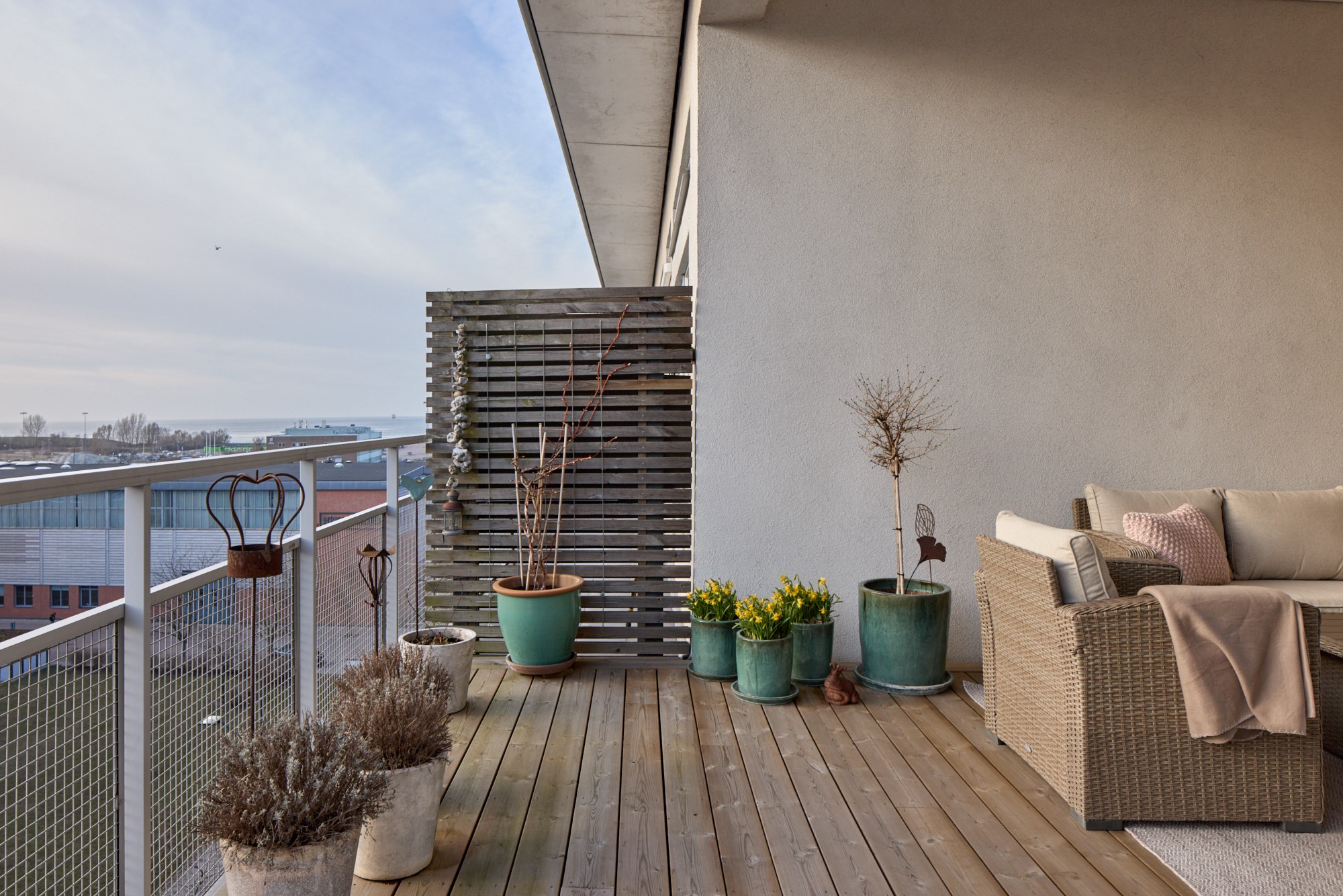 Högst upp i huset omringad av blå himmel med en spektakulär utsikt över marinan och havet i horisonten ligger ett unikt boende med takterass i tre väderstreck. Våningens 99 kvadrat är omringad av en uteplats på hela 108 kvadrat. Himlen, en förnäm utsikt och vattenblänk nere i småbåtshamnen präglar hela våningen. Sällskapsrum med integrerat kök har generösa fönsterpartier vilket skapar en utsuddad gräns mellan ute och inne. Här följer man solens uppgång tills den sänker sig ner i den vida horisonten och himlen färgas röd. Sällskapsrum, kök och tre sovrum har arkitektoniska ett sluttande tak skapar rymd och högst upp sitter överljus. Här bor ni helt utan grannar vägg i vägg och känslan av ett modernt "Karlsson på taket" - hus! Här bor ni i eftertraktade Brf Kajhusen med härlig innergård och det lugna läget in mot småbåtshamnen.