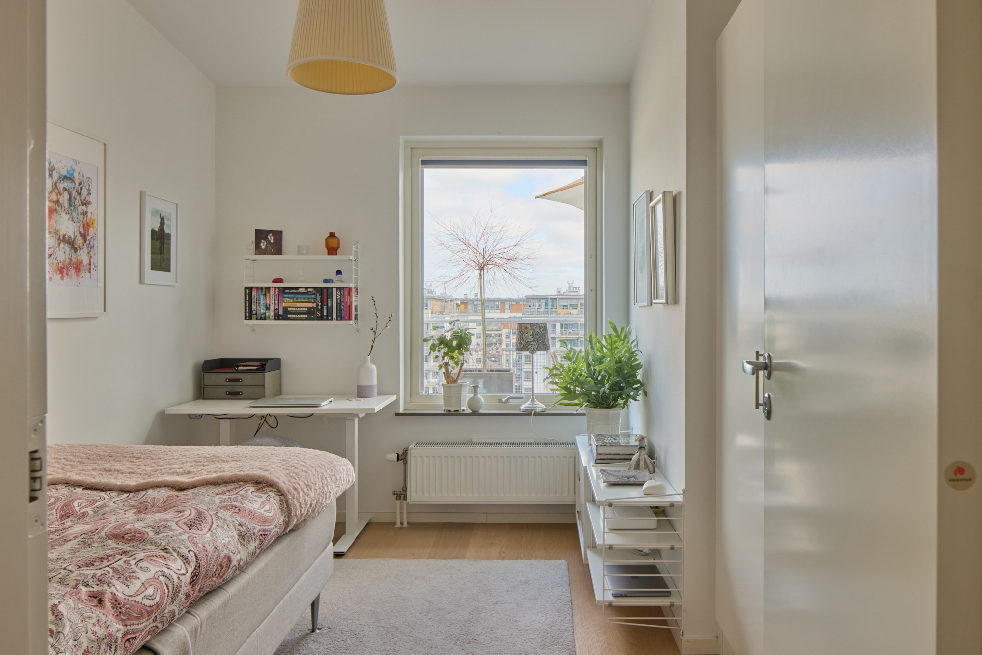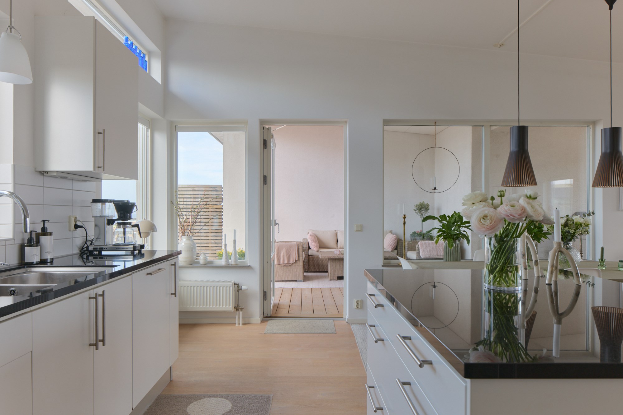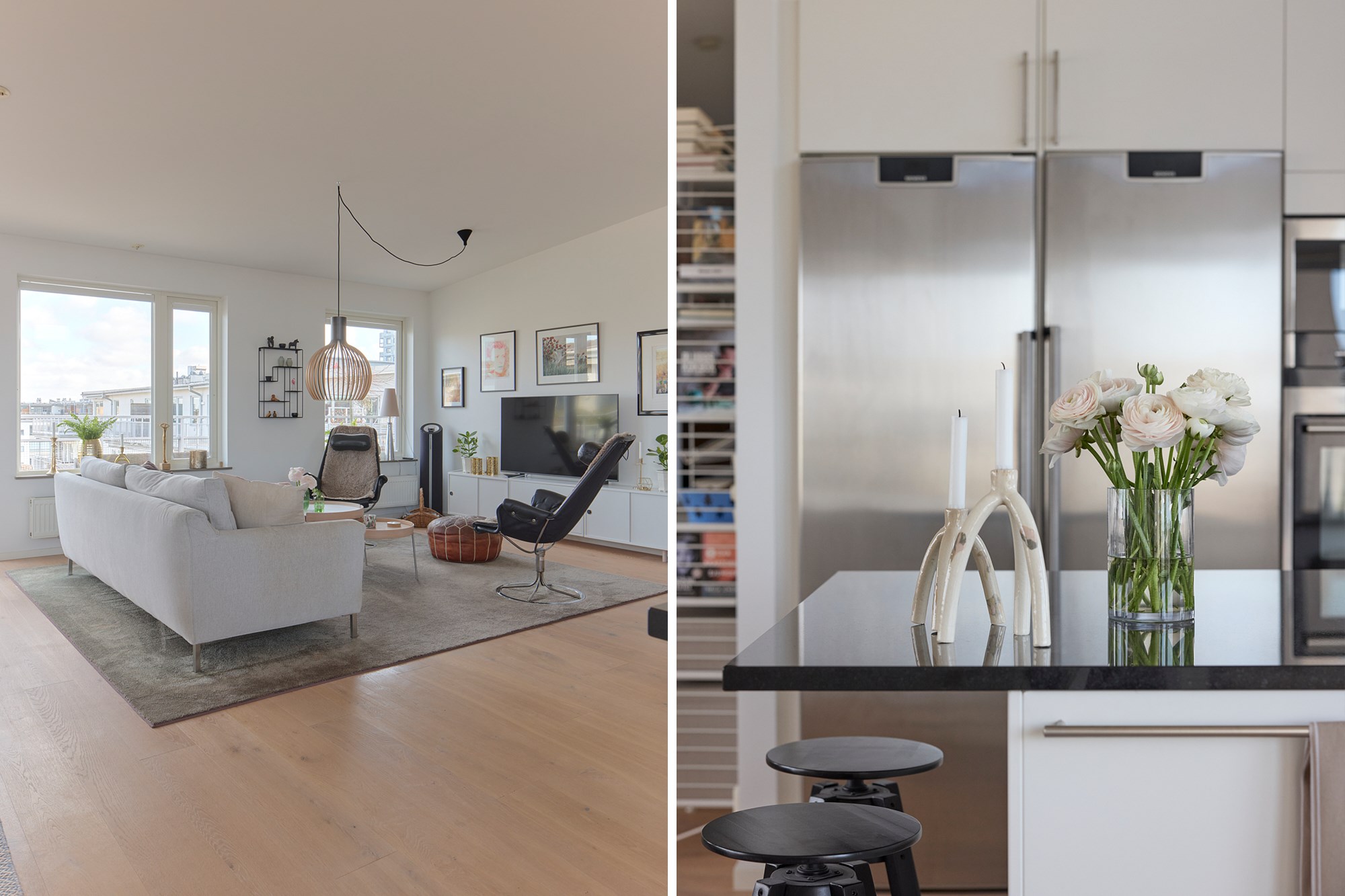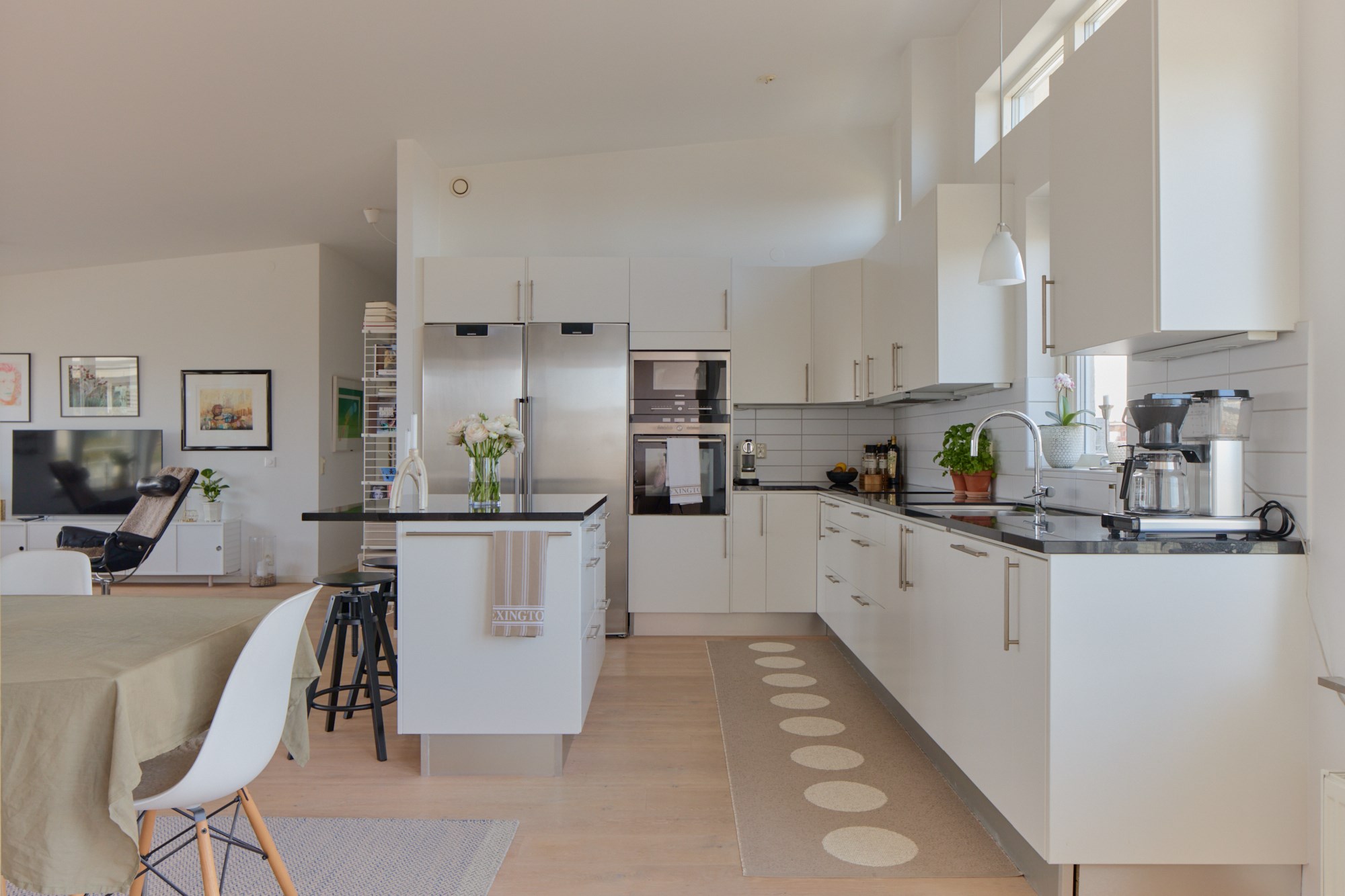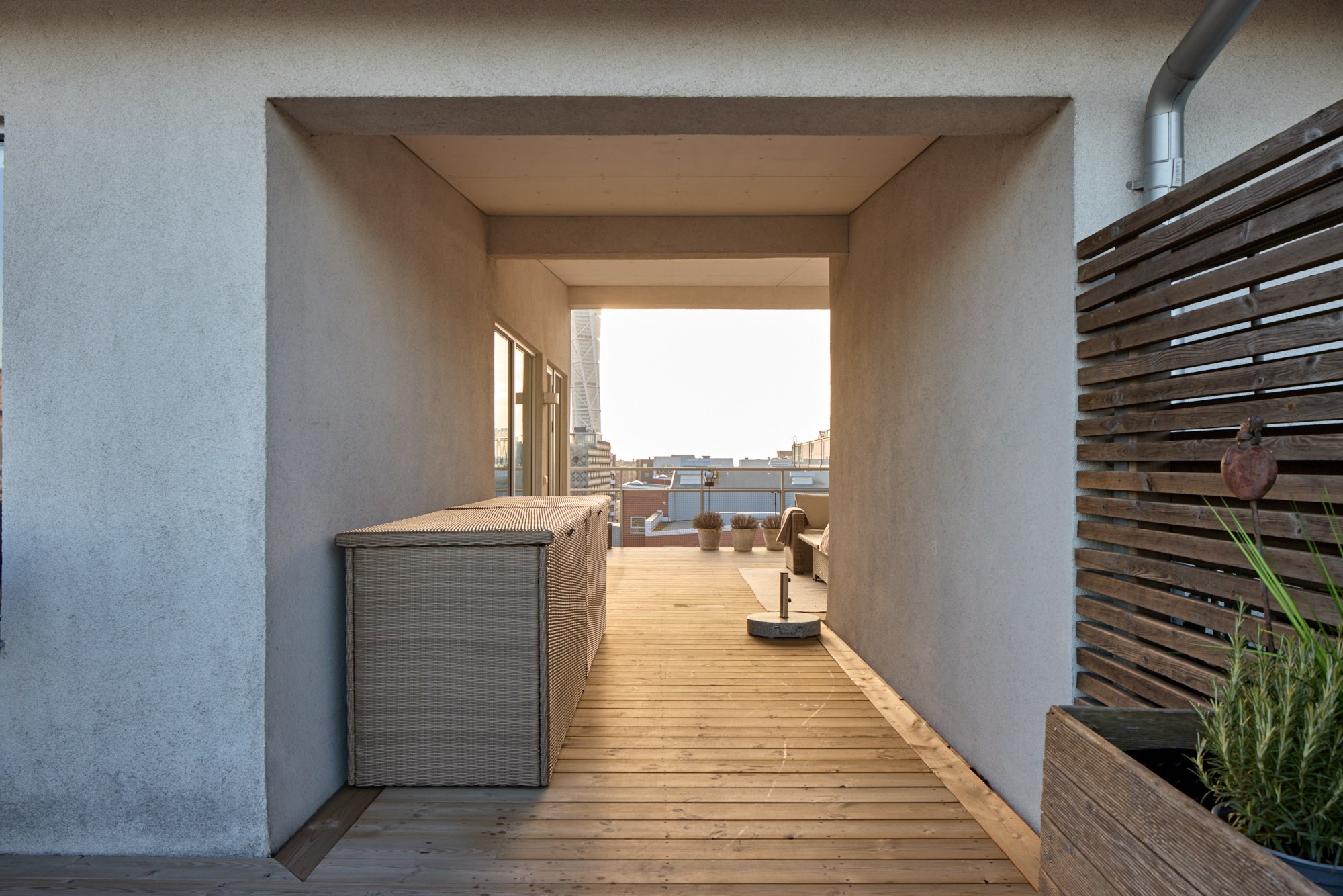 Högst upp i huset omringad av blå himmel med en spektakulär utsikt över marinan och havet i horisonten ligger ett unikt boende med takterass i tre väderstreck. Våningens 99 kvadrat är omringad av en uteplats på hela 108 kvadrat. Himlen, en förnäm utsikt och vattenblänk nere i småbåtshamnen präglar hela våningen. Sällskapsrum med integrerat kök har generösa fönsterpartier vilket skapar en utsuddad gräns mellan ute och inne. Här följer man solens uppgång tills den sänker sig ner i den vida horisonten och himlen färgas röd. Sällskapsrum, kök och tre sovrum har arkitektoniska ett sluttande tak skapar rymd och högst upp sitter överljus. Här bor ni helt utan grannar vägg i vägg och känslan av ett modernt "Karlsson på taket" - hus! Här bor ni i eftertraktade Brf Kajhusen med härlig innergård och det lugna läget in mot småbåtshamnen.