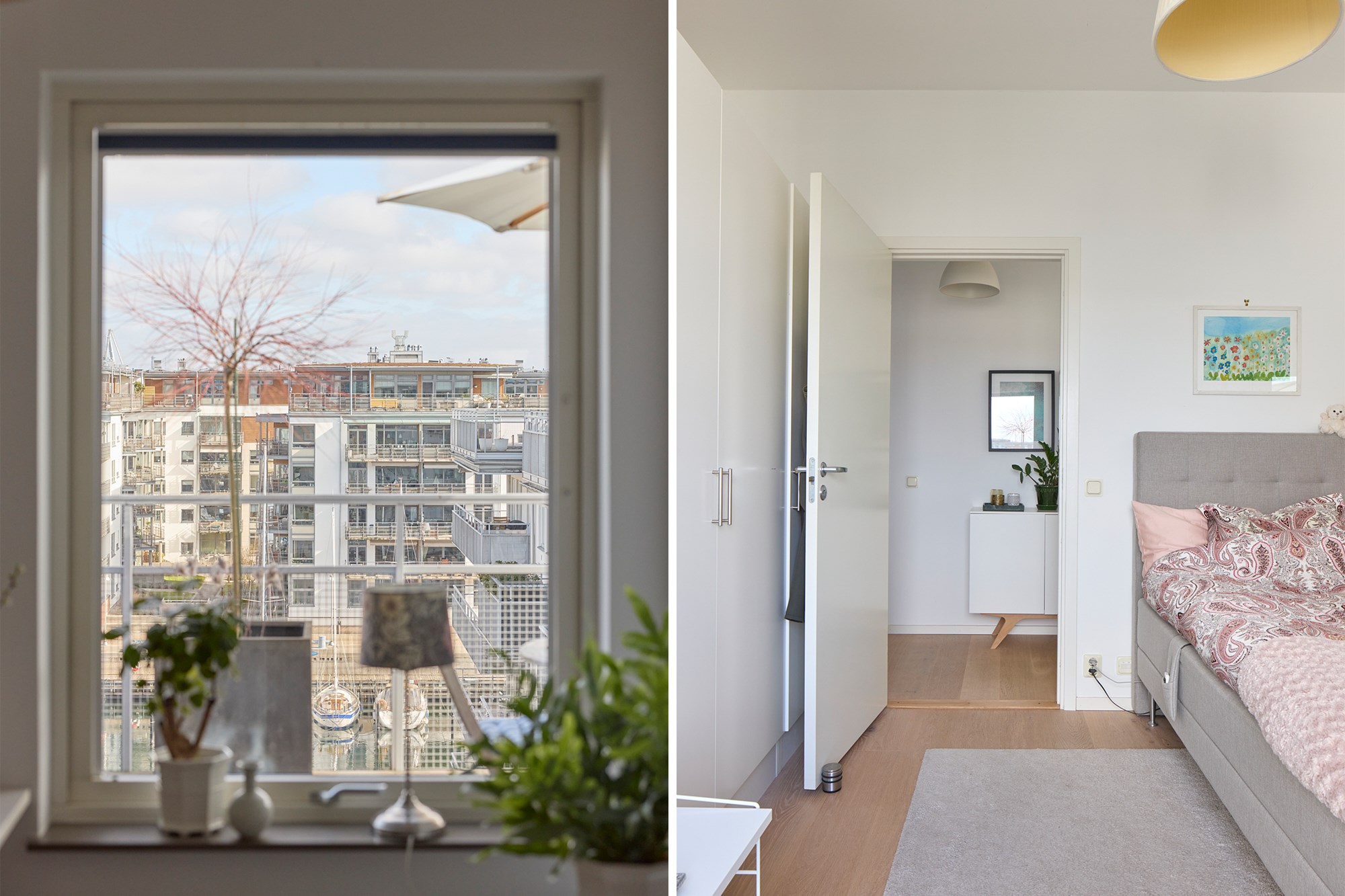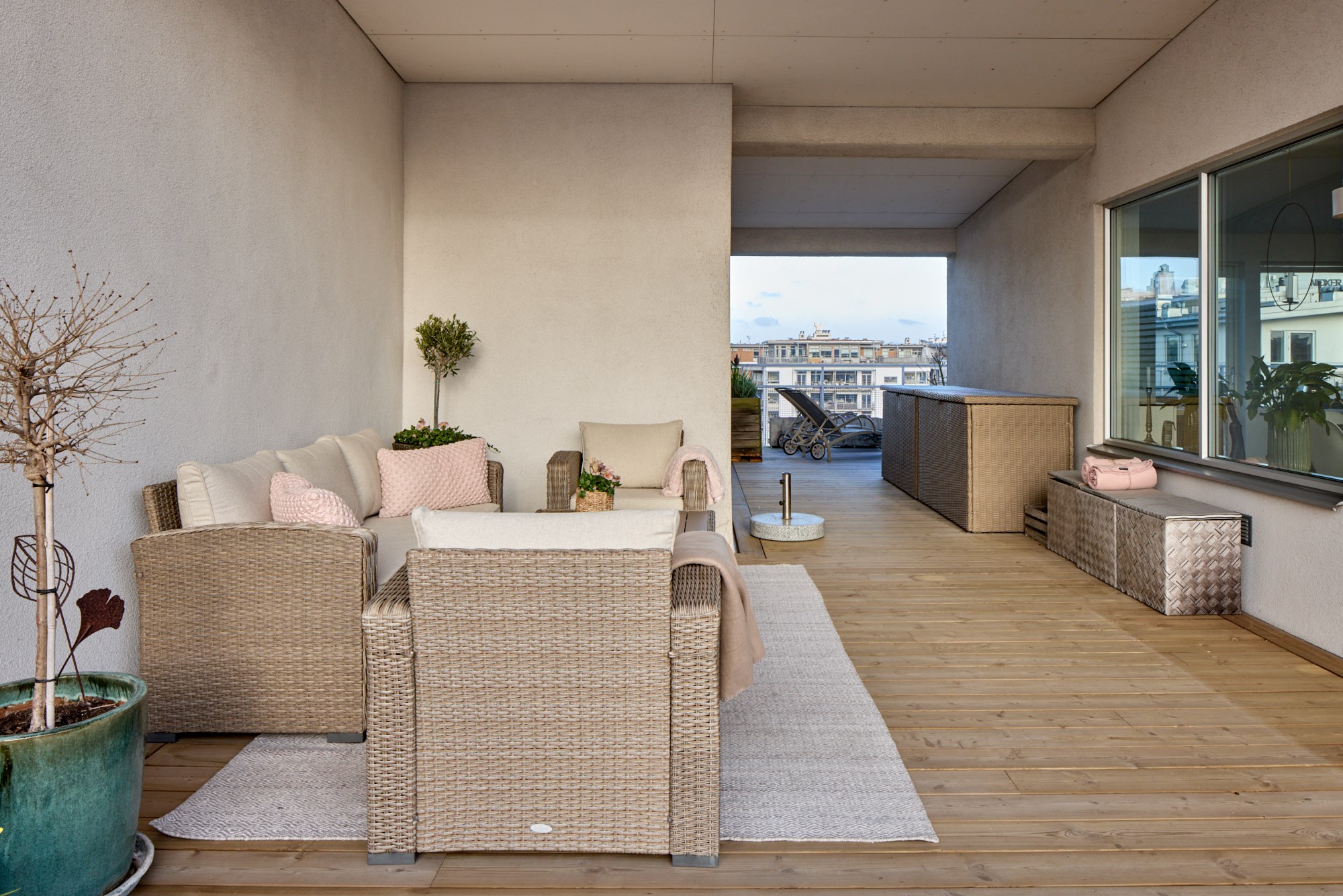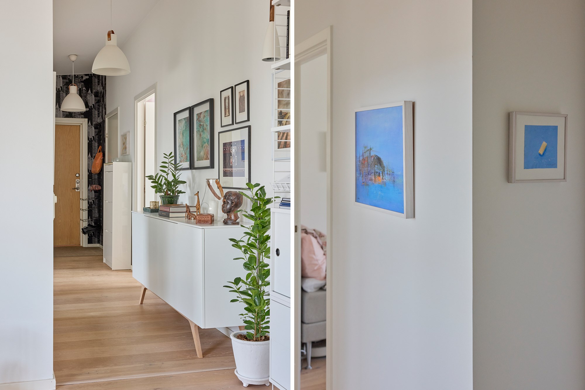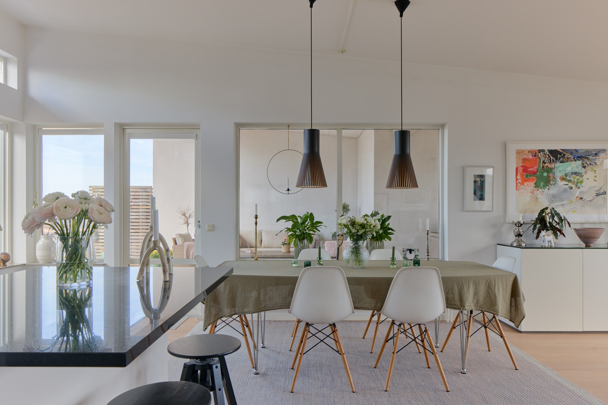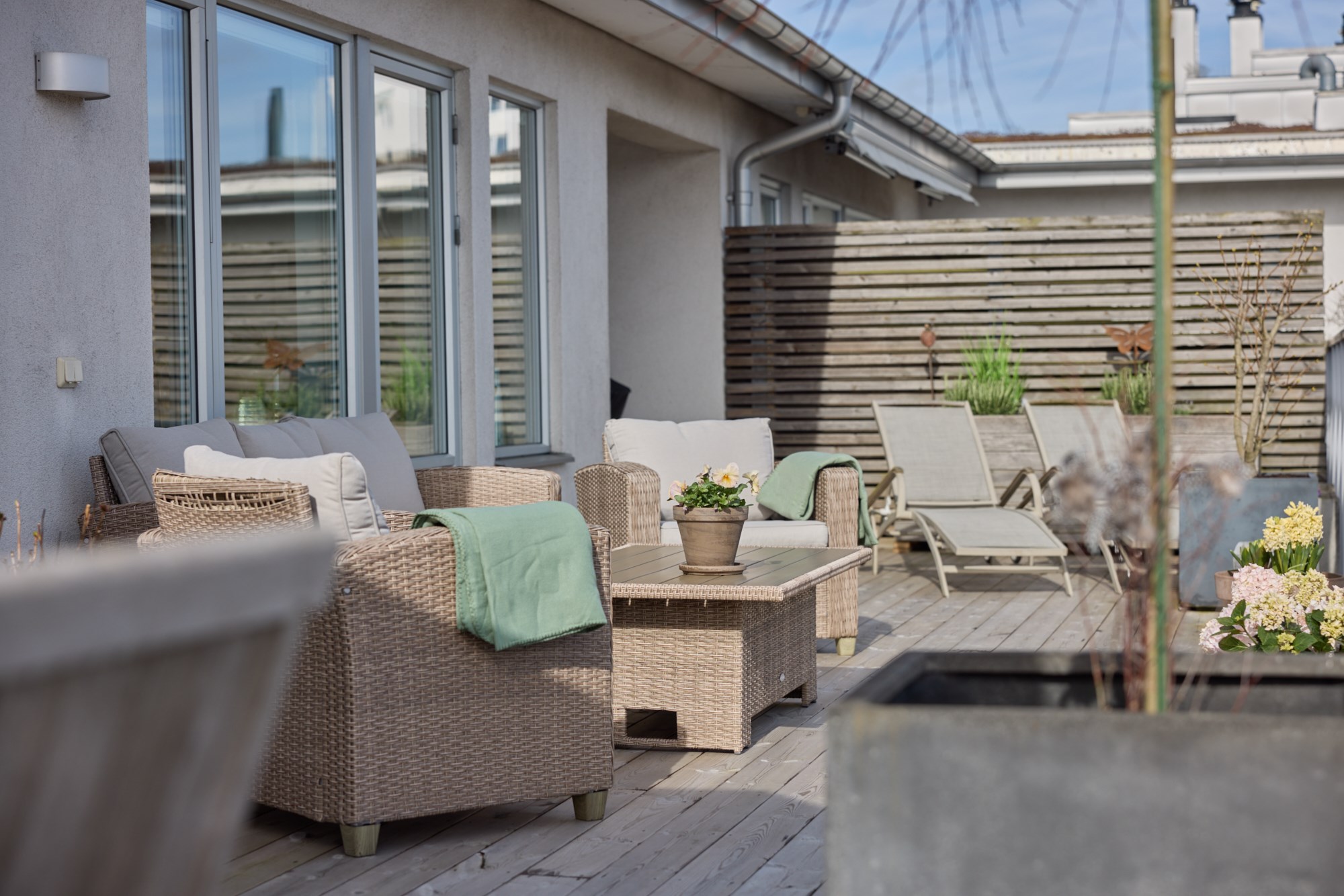 Högst upp i huset omringad av blå himmel med en spektakulär utsikt över marinan och havet i horisonten ligger ett unikt boende med takterass i tre väderstreck. Våningens 99 kvadrat är omringad av en uteplats på hela 108 kvadrat. Himlen, en förnäm utsikt och vattenblänk nere i småbåtshamnen präglar hela våningen. Sällskapsrum med integrerat kök har generösa fönsterpartier vilket skapar en utsuddad gräns mellan ute och inne. Här följer man solens uppgång tills den sänker sig ner i den vida horisonten och himlen färgas röd. Sällskapsrum, kök och tre sovrum har arkitektoniska ett sluttande tak skapar rymd och högst upp sitter överljus. Här bor ni helt utan grannar vägg i vägg och känslan av ett modernt "Karlsson på taket" - hus! Här bor ni i eftertraktade Brf Kajhusen med härlig innergård och det lugna läget in mot småbåtshamnen.