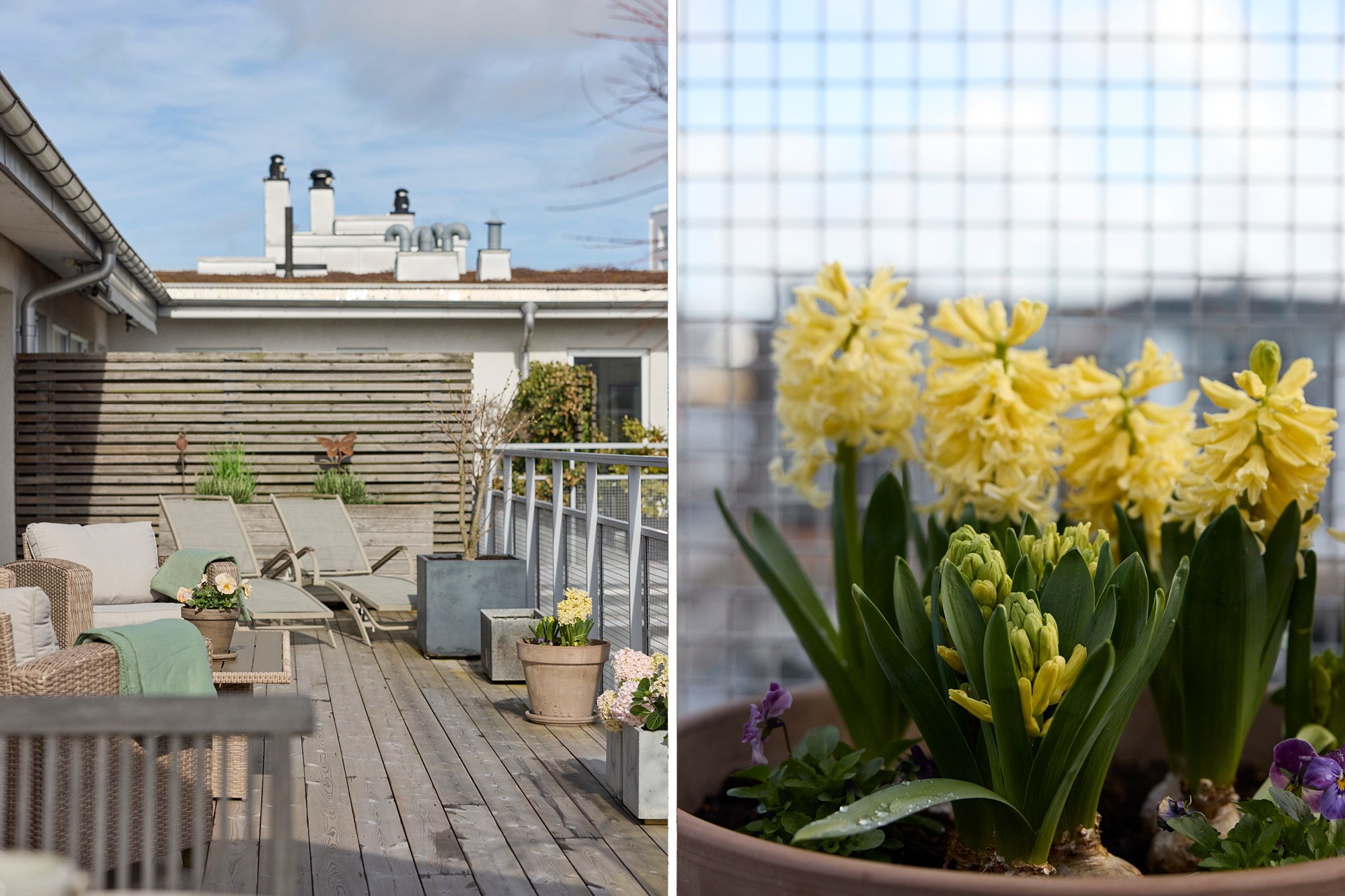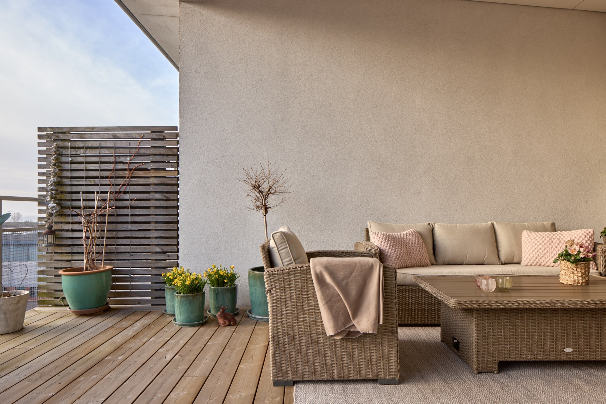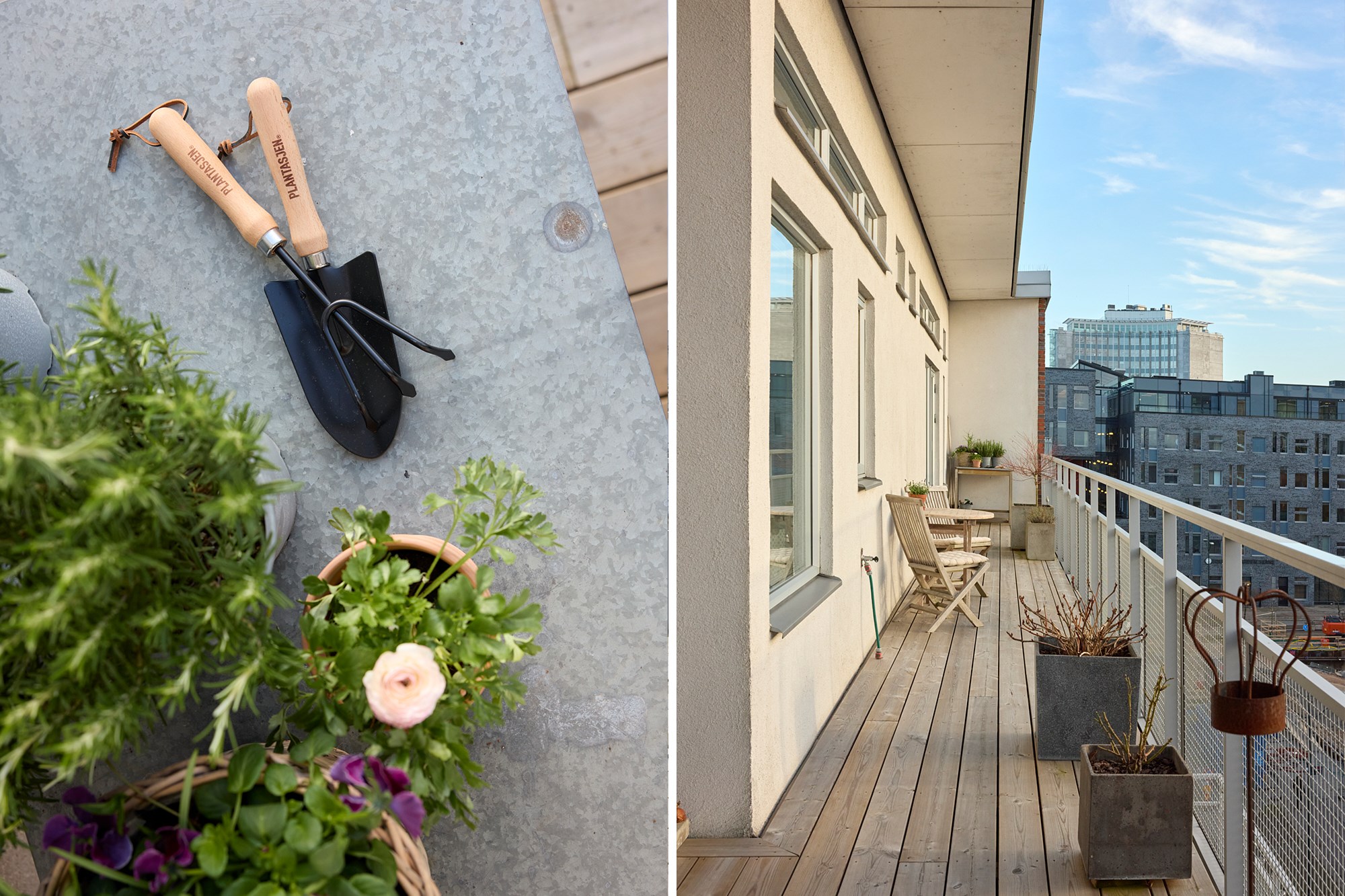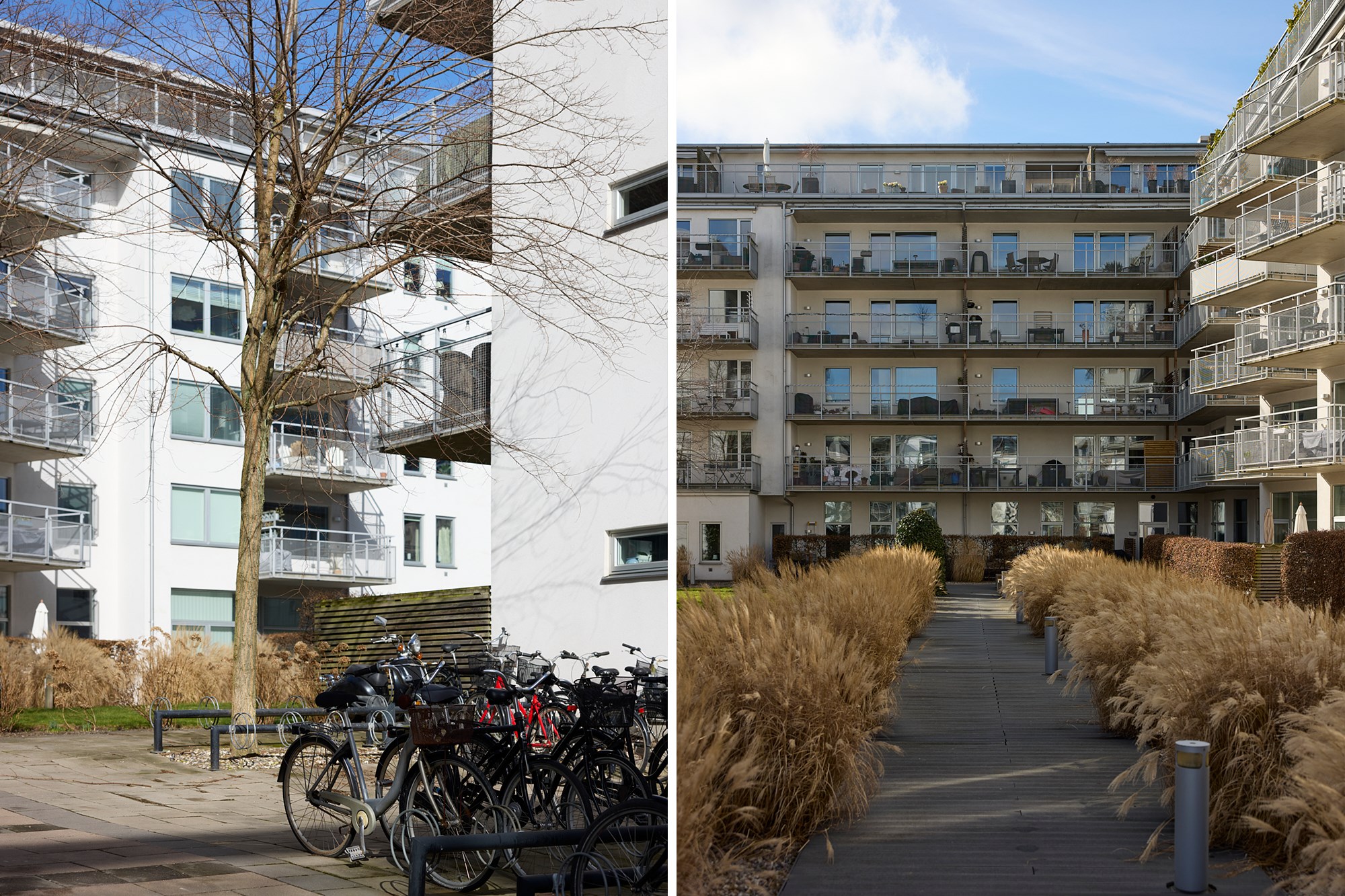 Innergård med vackra planteringar med strandängsbetonad växtlighet. På sommarhalvåret finns en sittgrupp och solstolar tillgängliga för medlemmar att nyttja.