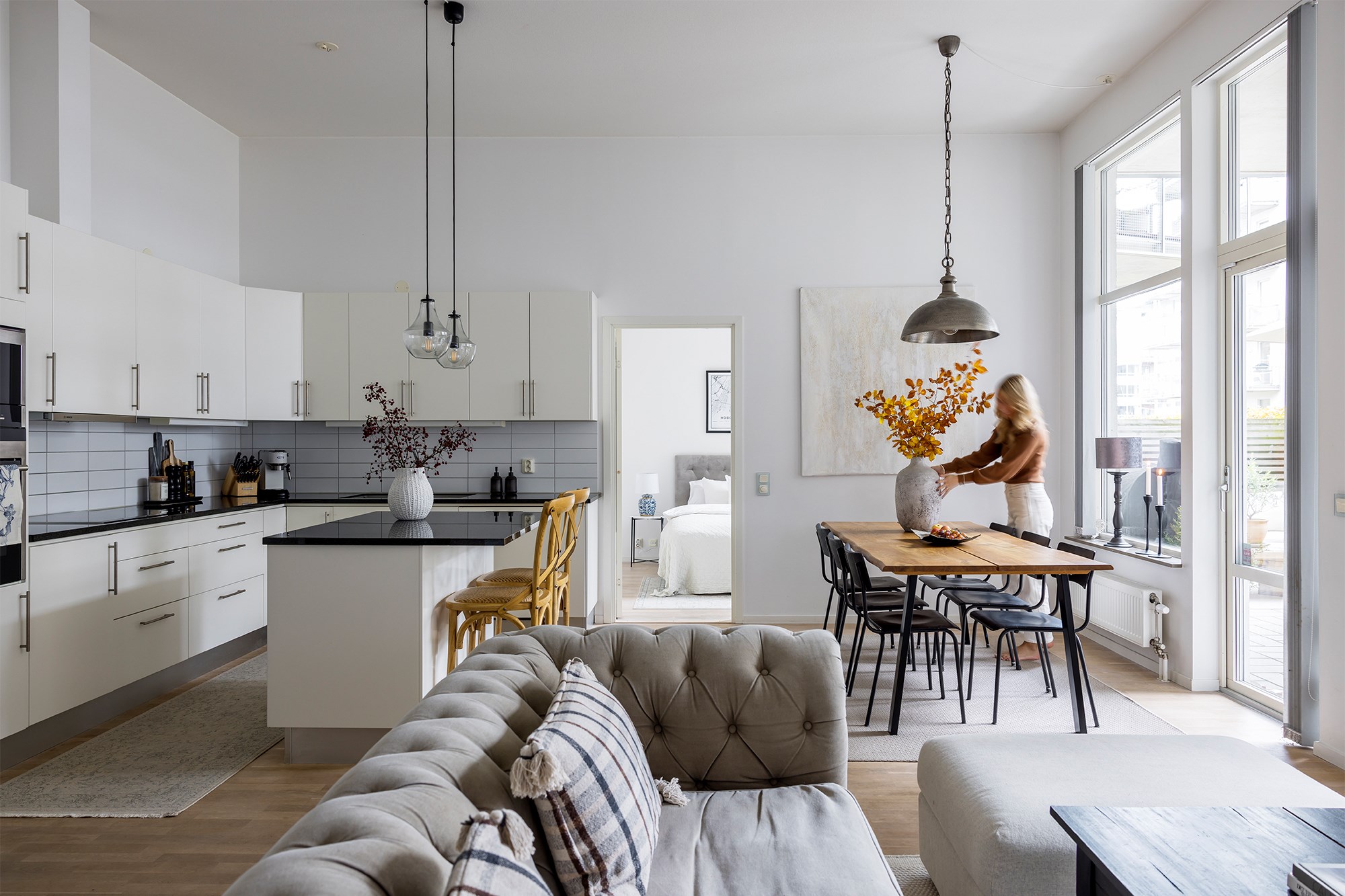 Volym, kvalitet och närheten till havet. På Dockgatan 7 väntar moderna 81 kvadrat med känslan av ett eget Town house, här suddas gränserna ut mellan ute och inne vilket ger en alldeles speciell atmosfär. Ett stenkast bort väntar kajpromenaden och en lunch på någon av restaurangerna eller kanske ett friskt dopp i Öresund? Vida fönster från golv till tak präglar den moderna våningen och ger en storslagen rymd till öppna sociala kvadrat ut mot en inbjudande uteplats mot gården och småbåtshamnen. Höga tak tillsammans med vit pigmenterad ekparkett och skira vita gardiner från golv till tak skapar harmoni. Här finns eleganta sittgrupper i sober stil tillsammans med ett ljust integrerat kök med köksö i svart granit och fin förvaring. Den höga glasdörren står på glänt ut mot den generösa uteplatsen, här finns lounge del, matbord och bardisk, allt inramat av vacker grönska. Master Bedroom intill känns luftigt med de höga fönstren, det mindre sovrummet likaså, här finns även en lyxig walk in closet. Dekorativa valv mellan sällskapsyta och hall skapar extra rymd. Välkomna till en fantastisk våning med livskvalitet här på Dockan.
