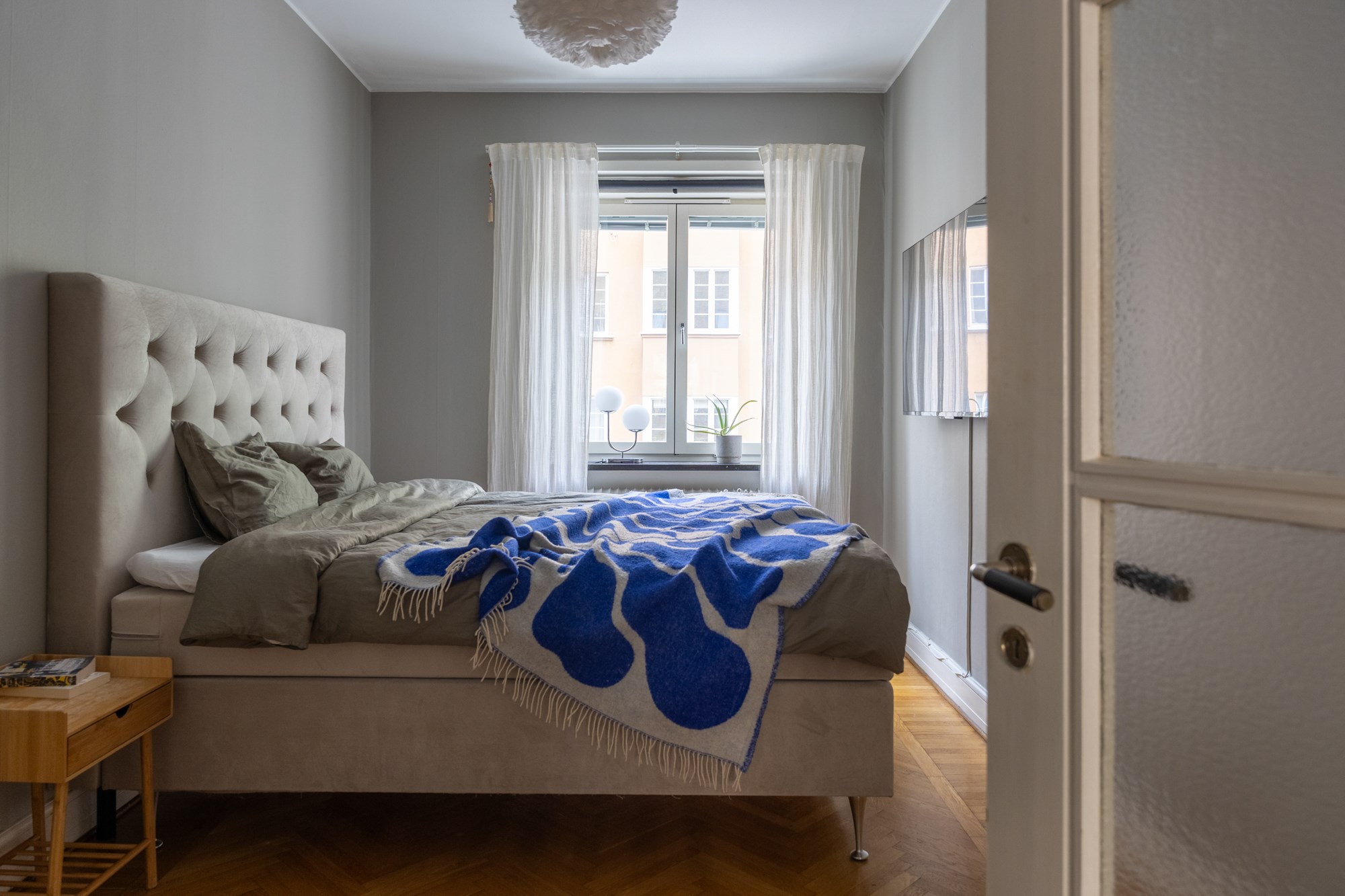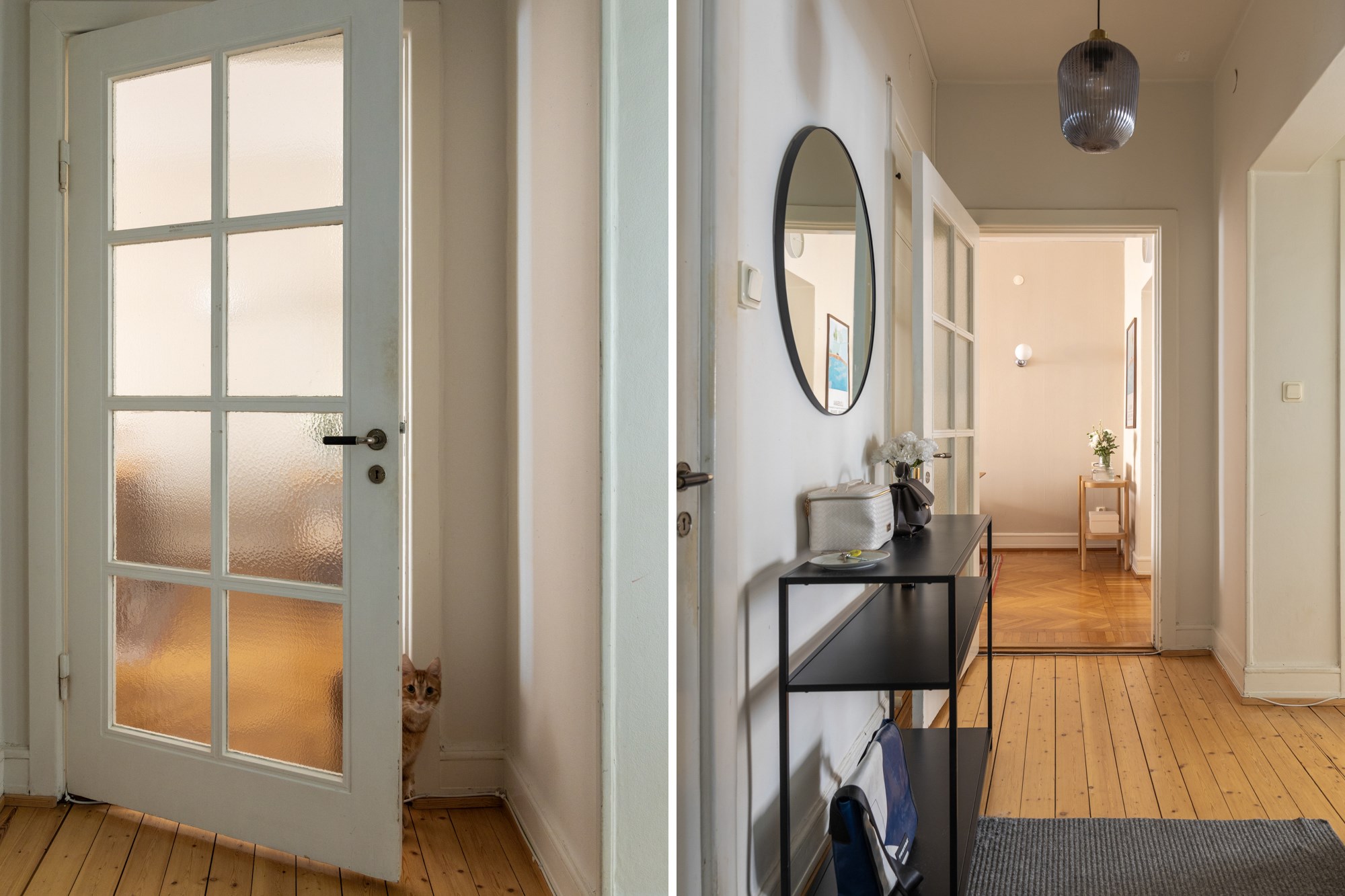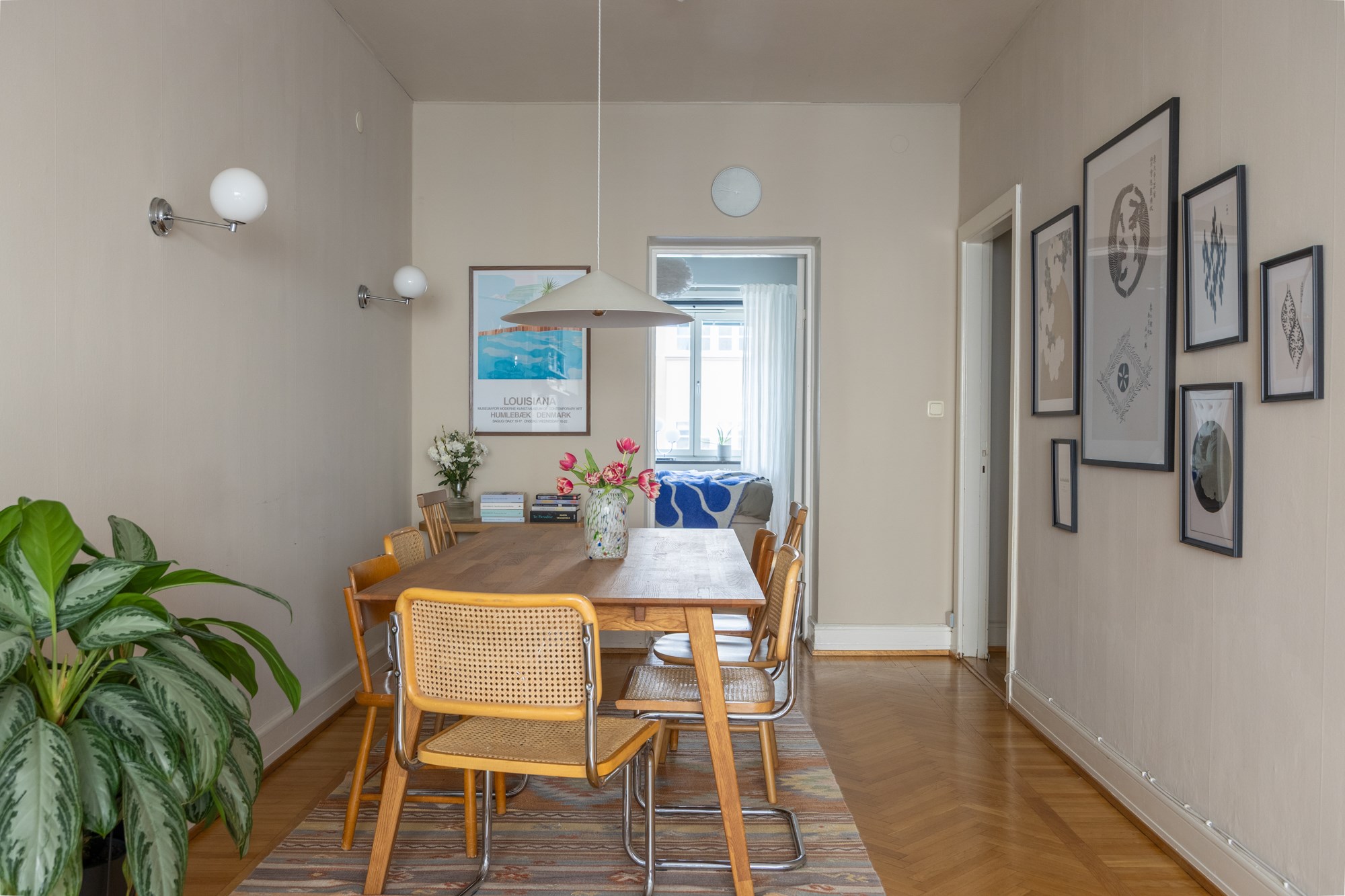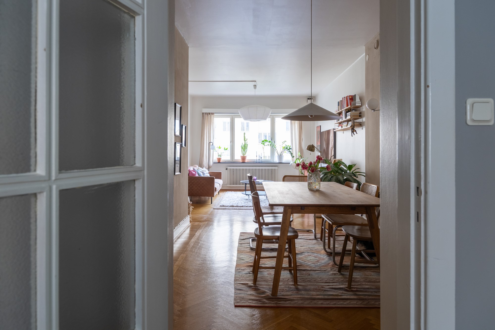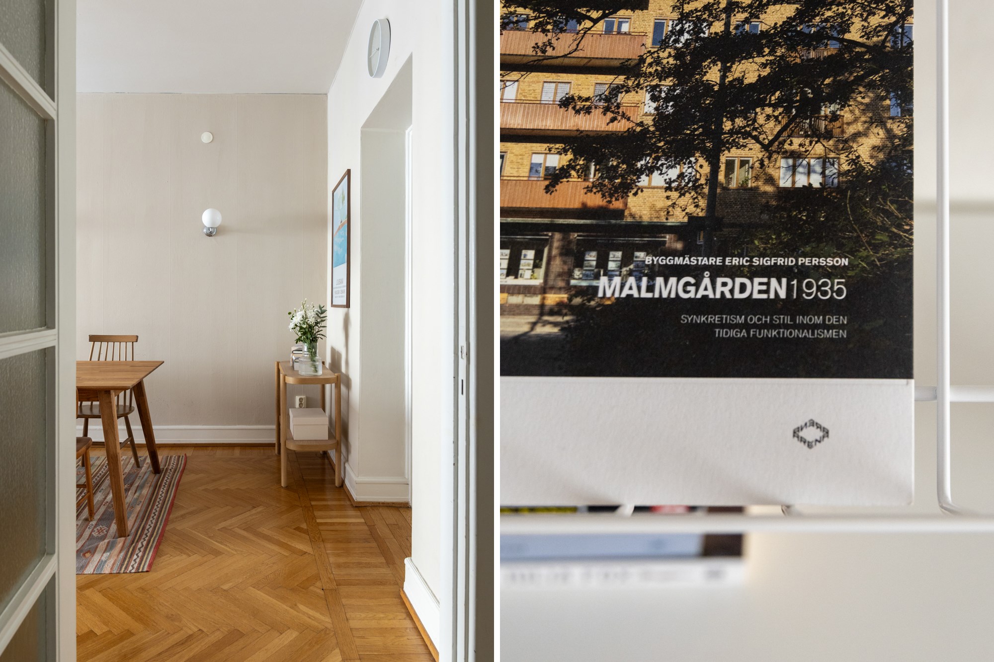 Det är vintrigt i staden och ett tunt lager is ligger blankt på kanalen som följer oss från city till Rörsjöparken. Intill parken ligger Malmgården, det arkitektoniskt berömda huset från trettiotalet, uppfört av byggmästare Eric Sigfrid Persson år 1934. Huset blev ett praktexempel på modernt boende i funkisstil. På våning två med fönster ut mot Ehrensvärdsgatan väntar 73 kvadrat disponerade på tre rum och kök. Ljusa färger på väggar ramar in harmoniska rum där sällskapsytan kopplas ihop med matplats, de båda sovrummen ligger intill varandra. Det generösa sällskapsrummet har plats för både matbord och soffgrupp. Trettiotalets charm ses tydligt i breda fönsterpartier, spegeldörrar och stilren arkitektur. Det genomgående läget ger ljus och långa siktlinjer. Kökets originalluckor har fått nytt liv och diskbänken har höjts med den tidsenliga diskbänken i metall kvar. Vildvinet klättrar upp längs fasaderna här runt innergården där det finns sittplatser, öppna grönområden och fina planteringar. Utanför porten väntar kaffebarer och restauranger kring torget, busskommunikationerna är många och promenaden inåt gågatan eller Centralen tar en kvart.