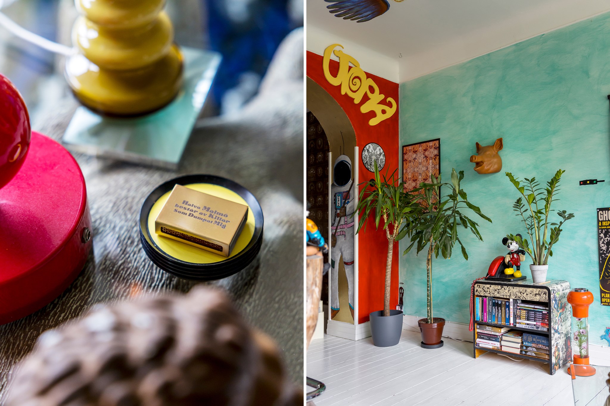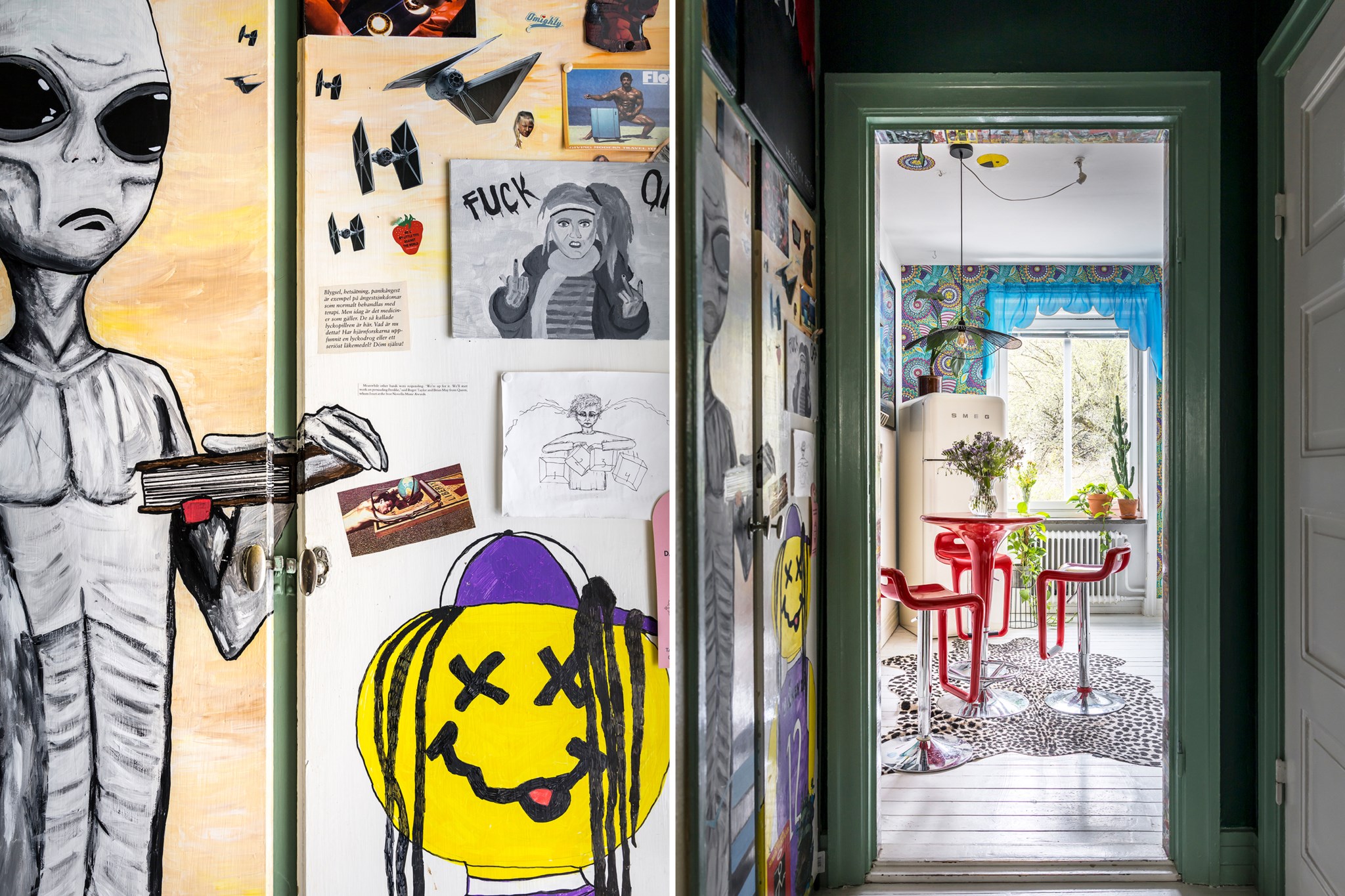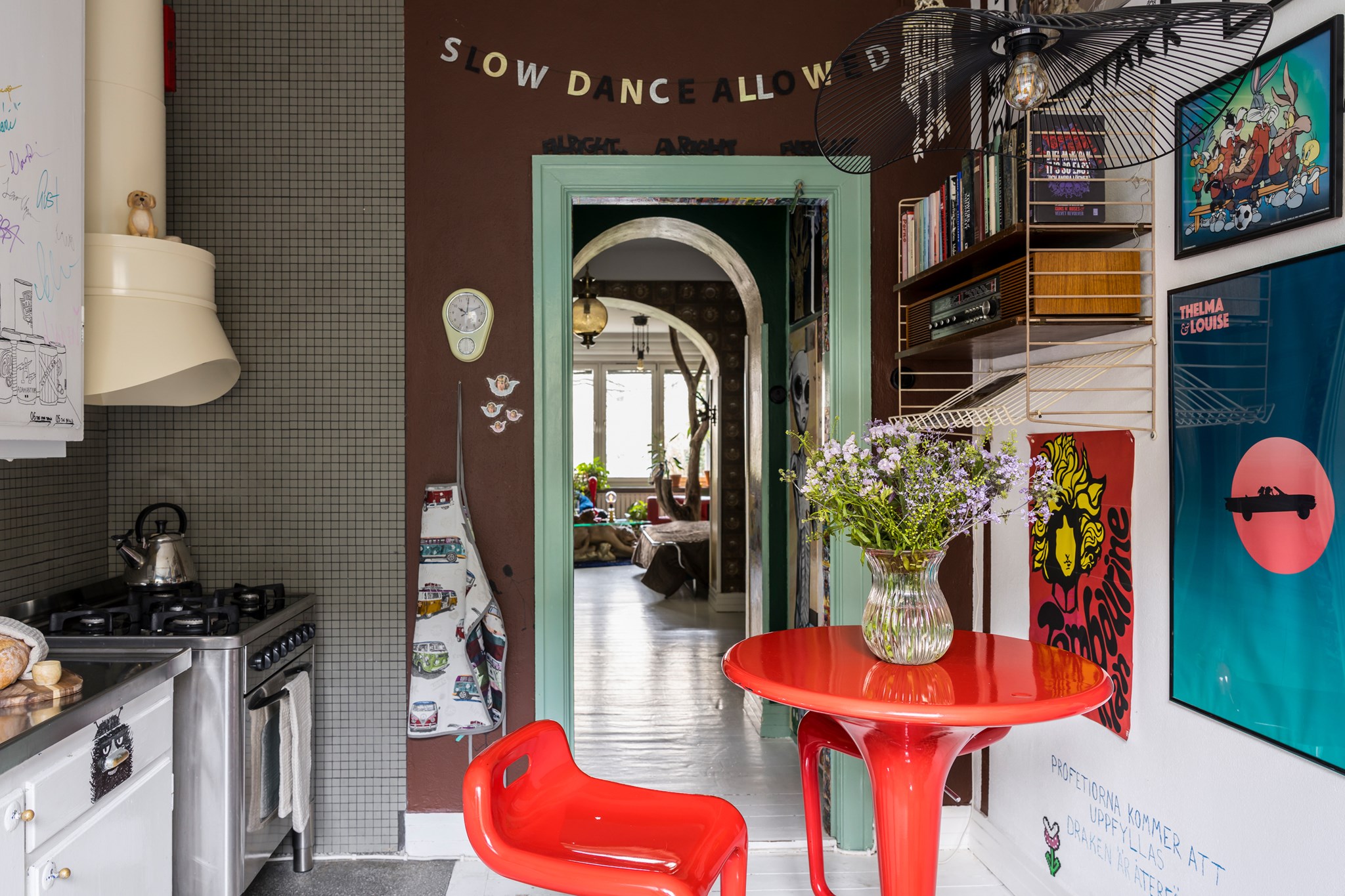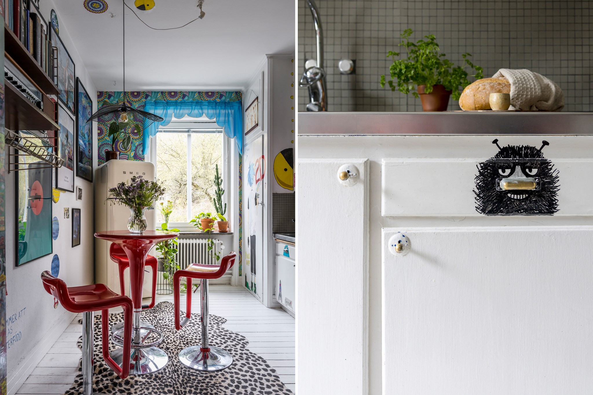 Lekfullt, brokigt och personligt. En halvtrappa upp på Eslövsgatan 9E väntar en färgstark våning inredd direkt från hjärtat. Här möts vi av 44 kvadratmeter med genomgående planlösning och originalkök. Det vitmålade brädgolvet utgör en ljus bas för färgsprakande detaljer och personlig konst. Istället för ”less is more” regerar här mottot ”mer av allt”. Det är ett hem där taket fungerar som en tavla och hela atmosfären påminner om ett levande konstgalleri; här samsas helgonbilder och actionfigurer med unika väggmålningar. Genom konstnärliga uttryck har små rum i rummen skapats, samtidigt som tidstypiska originaldetaljer som takrosetter, spegeldörrar och gjutjärnselement bevarats. Mötet mellan den påhittiga inredningen och 30-tals charmen skapar en alldeles särskild karaktär. Huset är ritat av arkitekten Carl Rosell, som värnade om de stora innergårdarna – en vision som lever vidare än idag. I föreningen Häggen, stabil och anrik sedan byggåret 1936, bor en härlig blandning av pensionärer, studenter och barnfamiljer. Grannsämjan är varm och på den parkliknande innergården ryms både egna odlingar och ett gemytligt lusthus. Ljuset är på väg tillbaka och solen står allt högre över Sorgenfri. För varje dag blir kvarteren lite grönare. Välkommen till ett hem som verkligen bryter mot det strama, skandinaviska idealet och istället omfamnar maximalism och ren livsglädje.