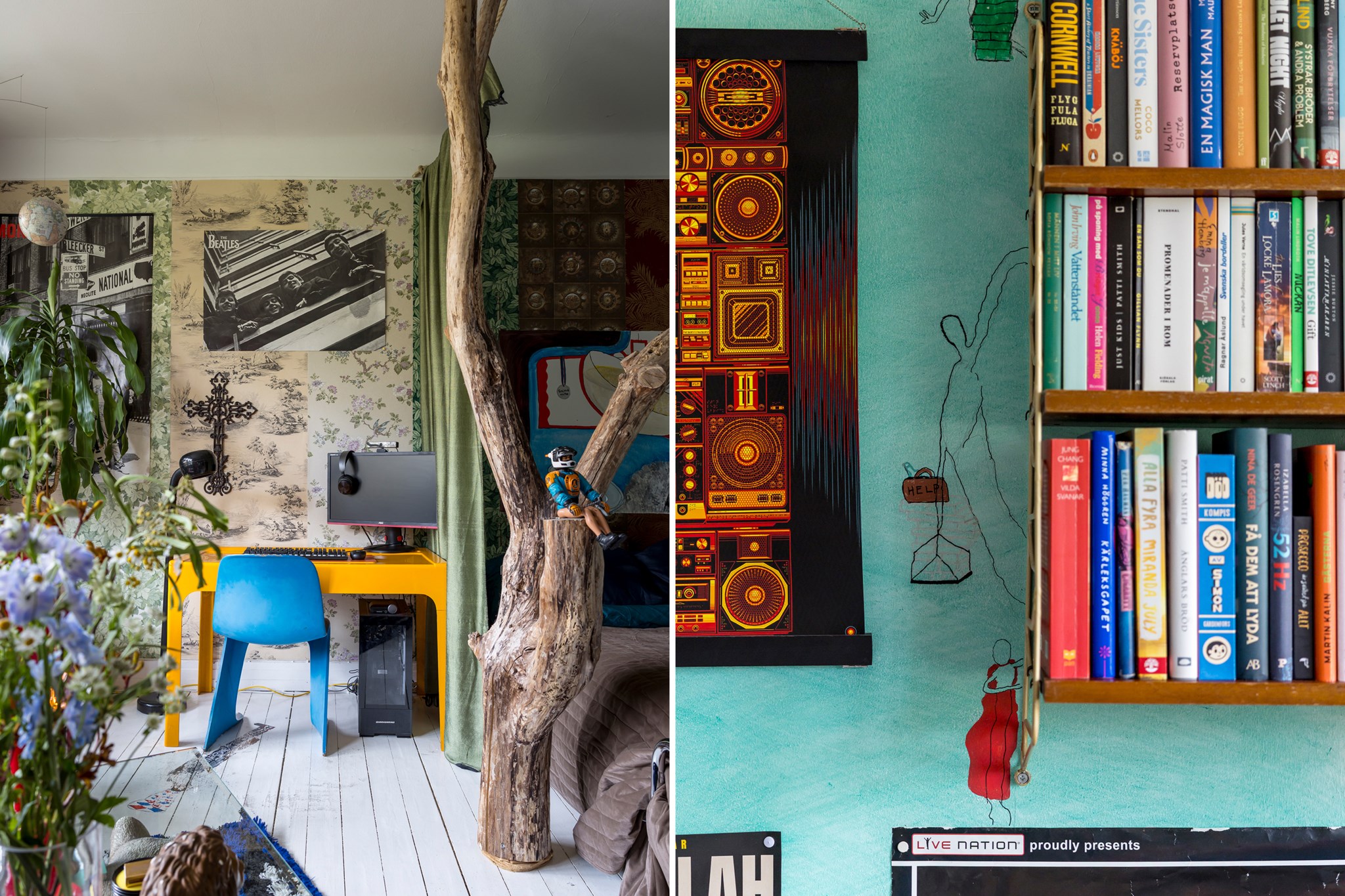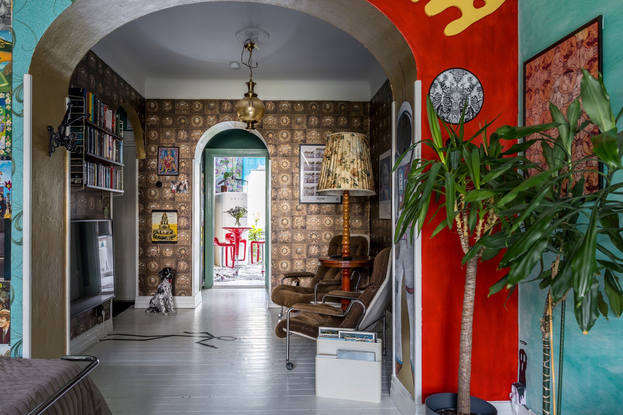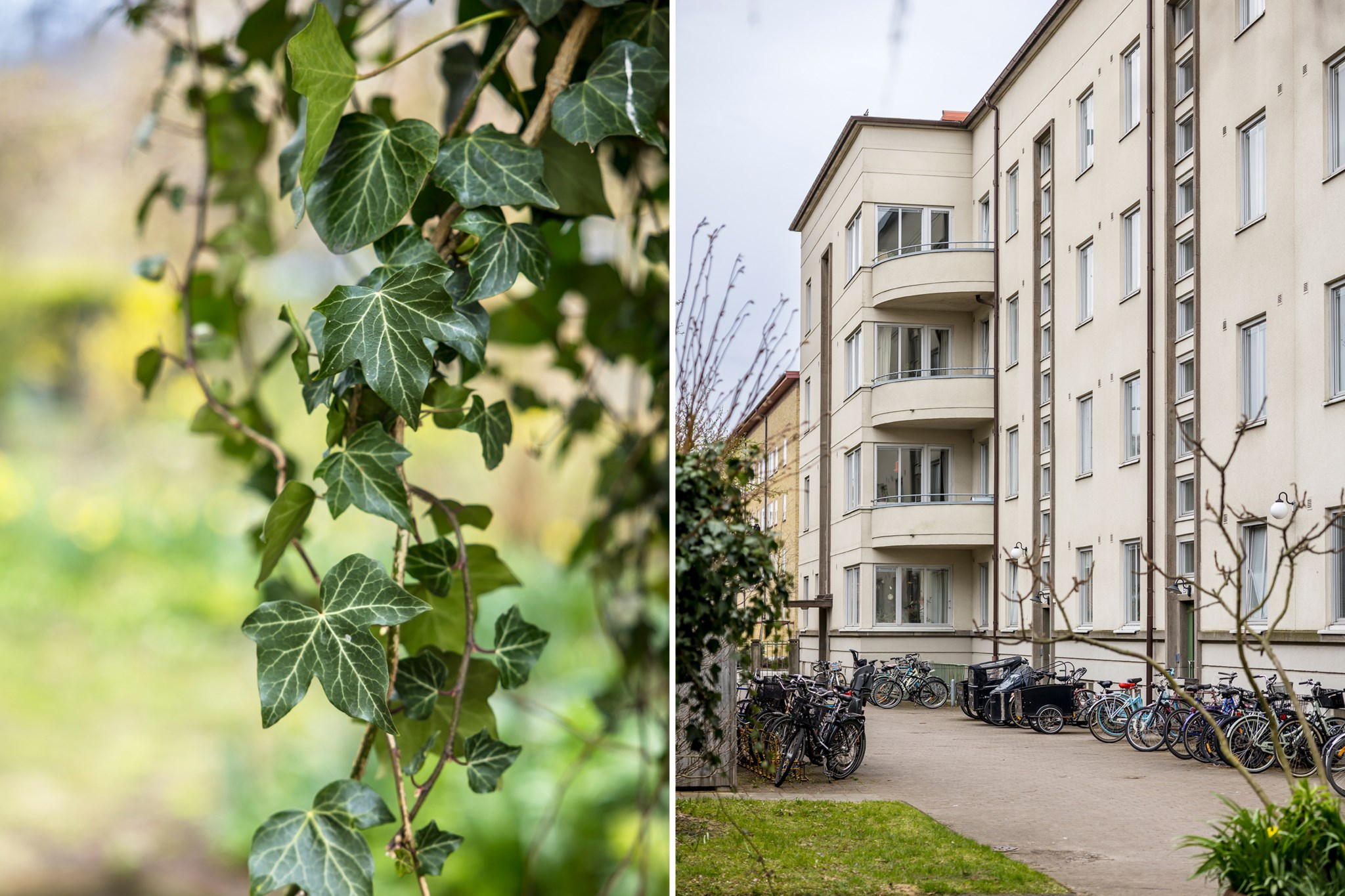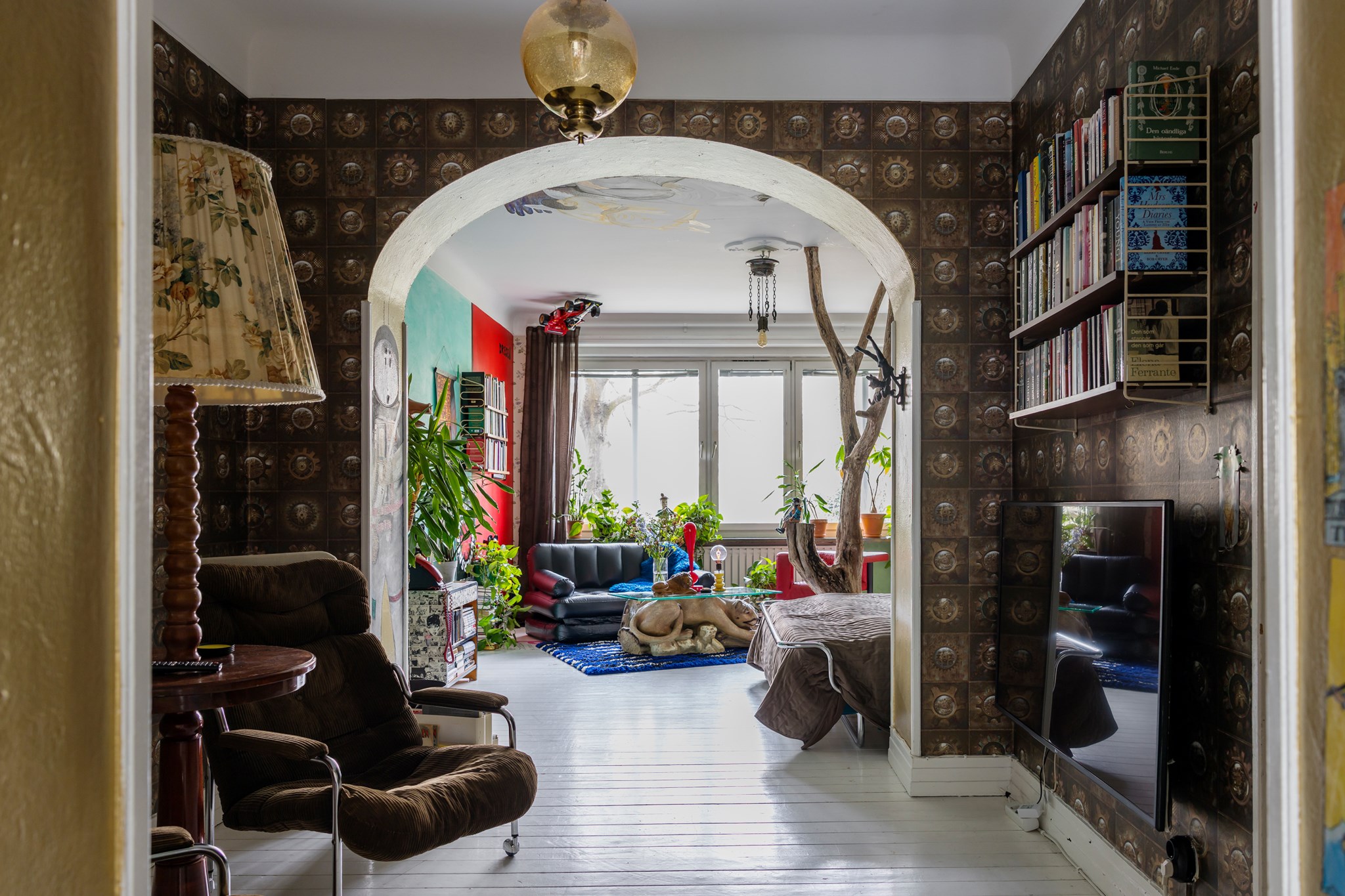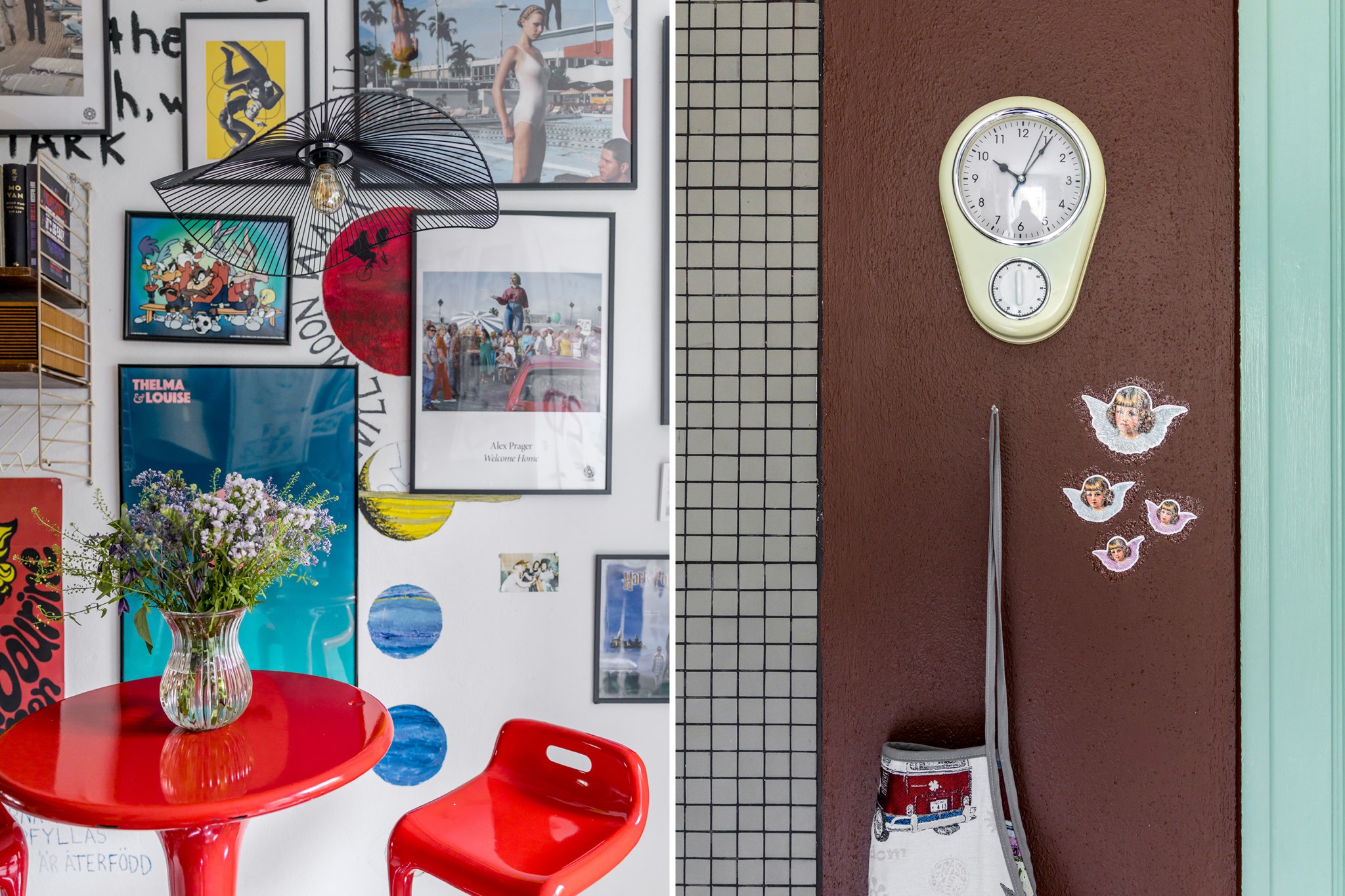 Lekfullt, brokigt och personligt. En halvtrappa upp på Eslövsgatan 9E väntar en färgstark våning inredd direkt från hjärtat. Här möts vi av 44 kvadratmeter med genomgående planlösning och originalkök. Det vitmålade brädgolvet utgör en ljus bas för färgsprakande detaljer och personlig konst. Istället för ”less is more” regerar här mottot ”mer av allt”. Det är ett hem där taket fungerar som en tavla och hela atmosfären påminner om ett levande konstgalleri; här samsas helgonbilder och actionfigurer med unika väggmålningar. Genom konstnärliga uttryck har små rum i rummen skapats, samtidigt som tidstypiska originaldetaljer som takrosetter, spegeldörrar och gjutjärnselement bevarats. Mötet mellan den påhittiga inredningen och 30-tals charmen skapar en alldeles särskild karaktär. Huset är ritat av arkitekten Carl Rosell, som värnade om de stora innergårdarna – en vision som lever vidare än idag. I föreningen Häggen, stabil och anrik sedan byggåret 1936, bor en härlig blandning av pensionärer, studenter och barnfamiljer. Grannsämjan är varm och på den parkliknande innergården ryms både egna odlingar och ett gemytligt lusthus. Ljuset är på väg tillbaka och solen står allt högre över Sorgenfri. För varje dag blir kvarteren lite grönare. Välkommen till ett hem som verkligen bryter mot det strama, skandinaviska idealet och istället omfamnar maximalism och ren livsglädje.