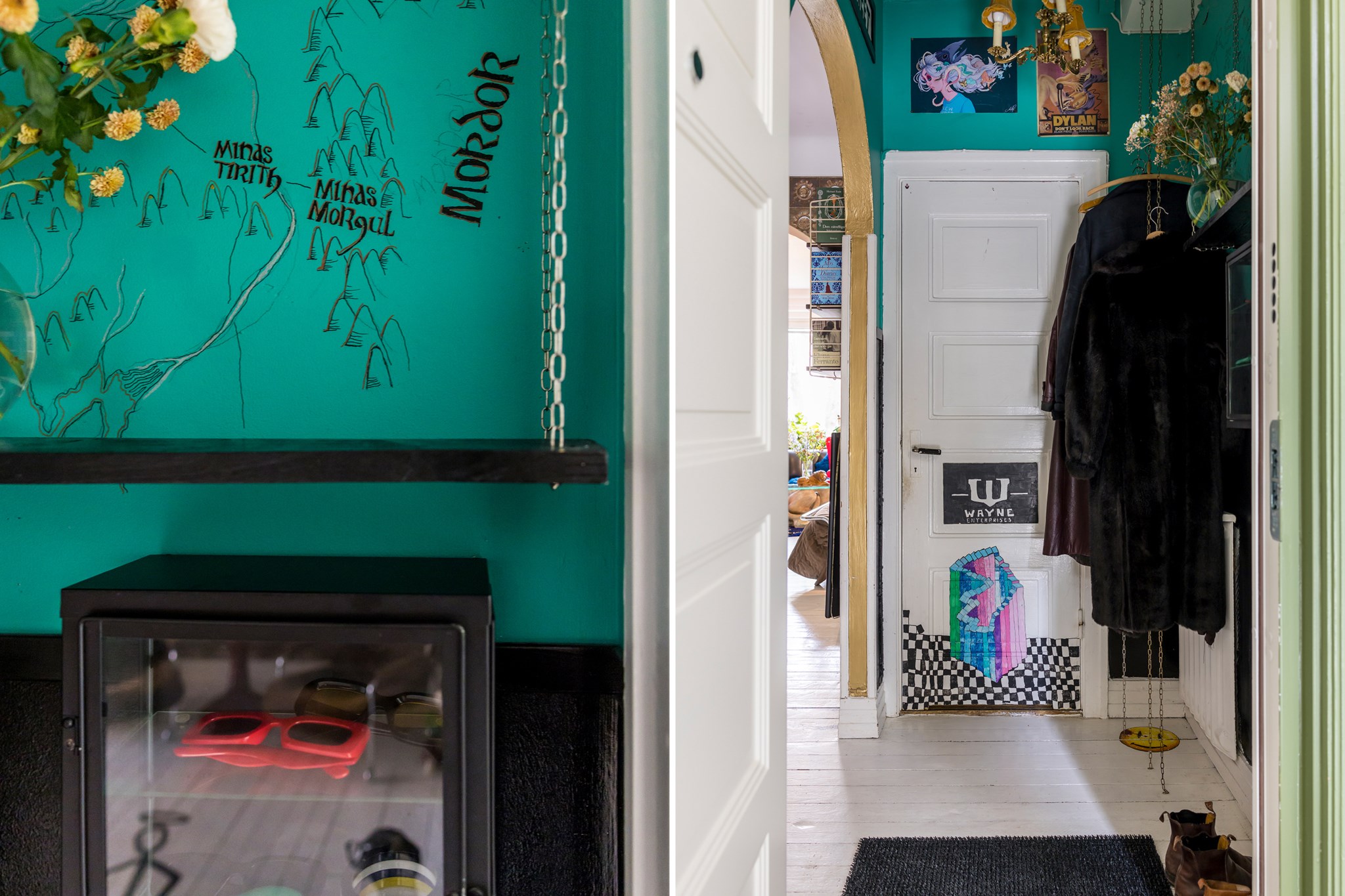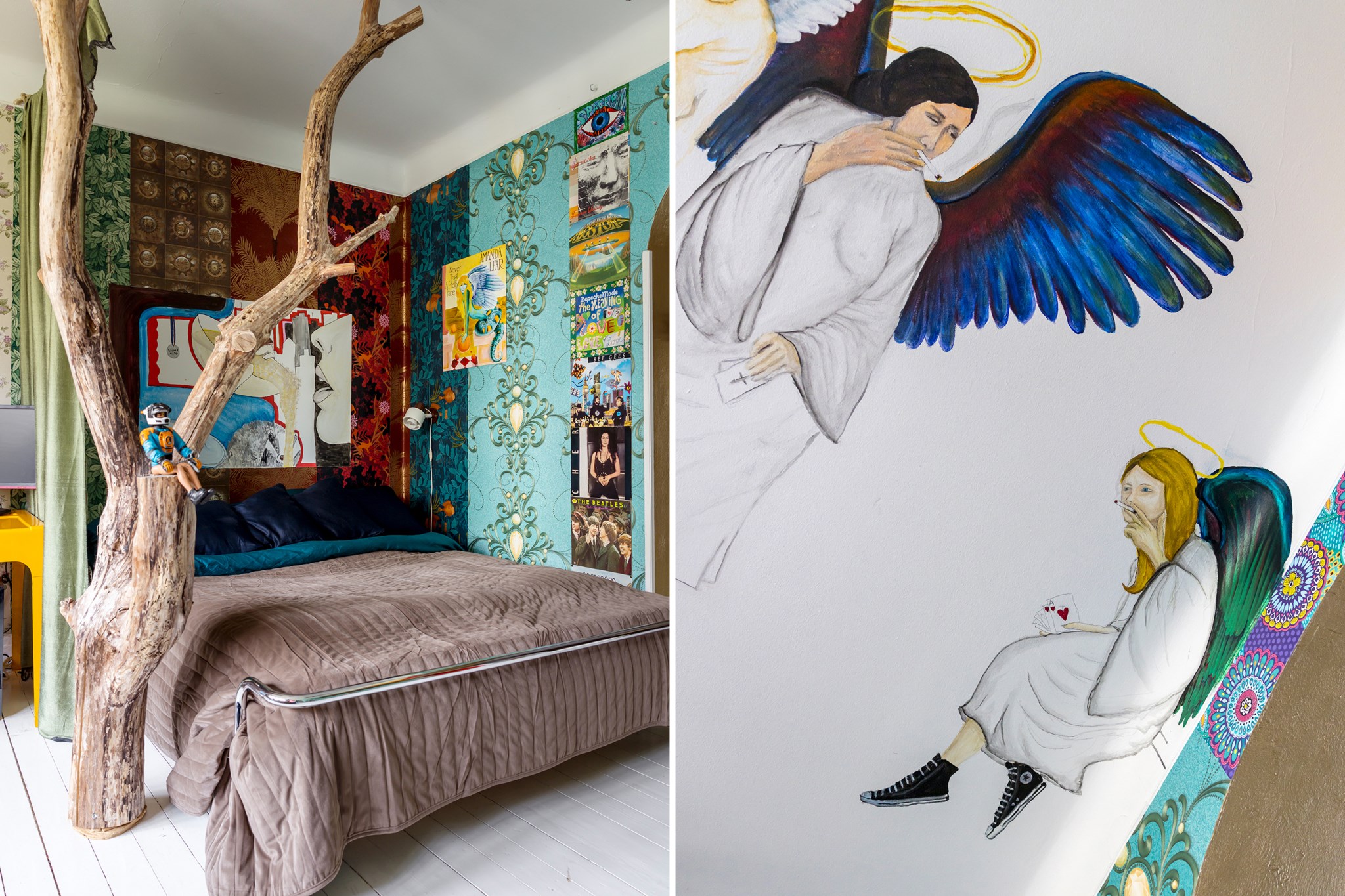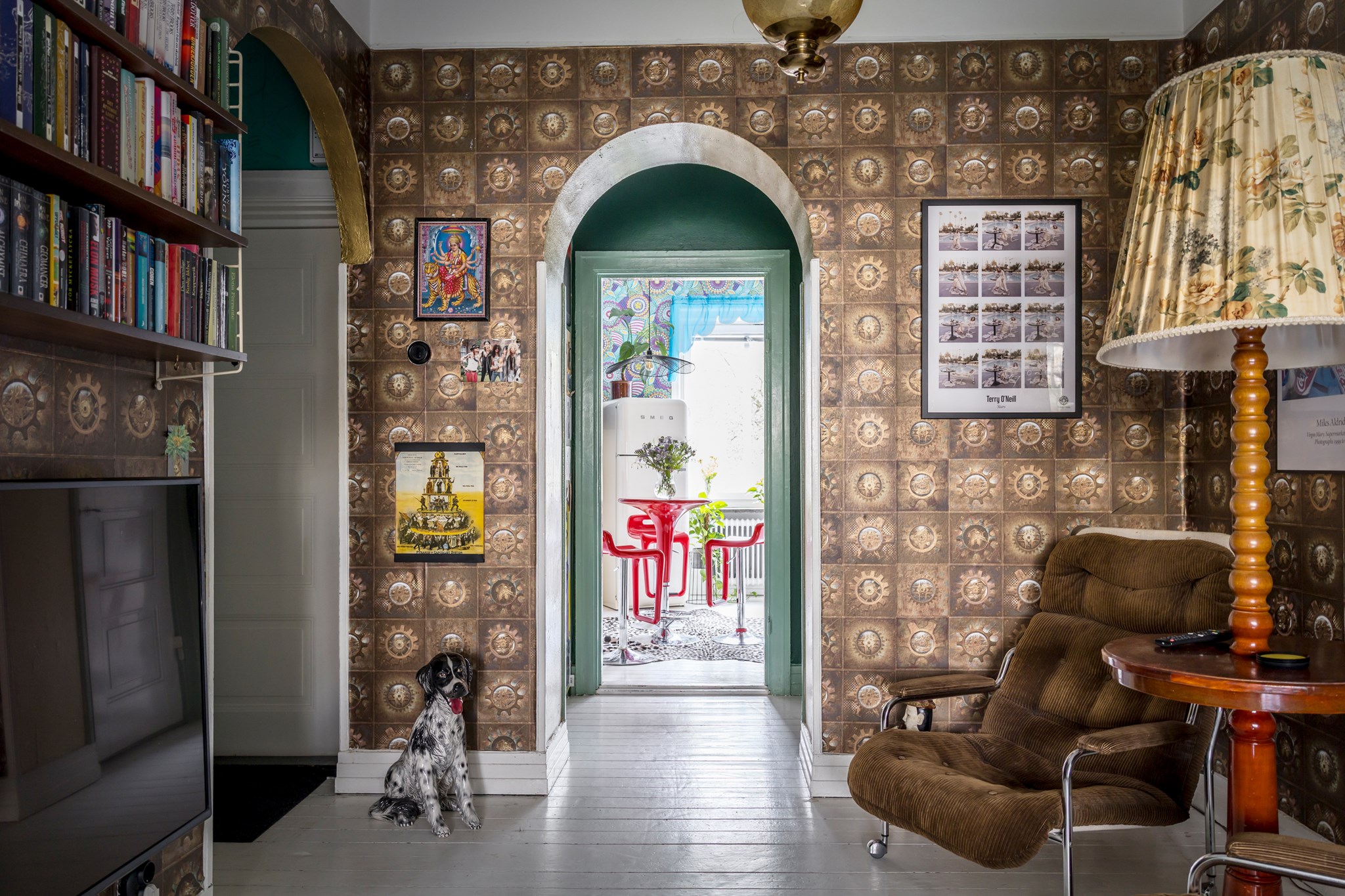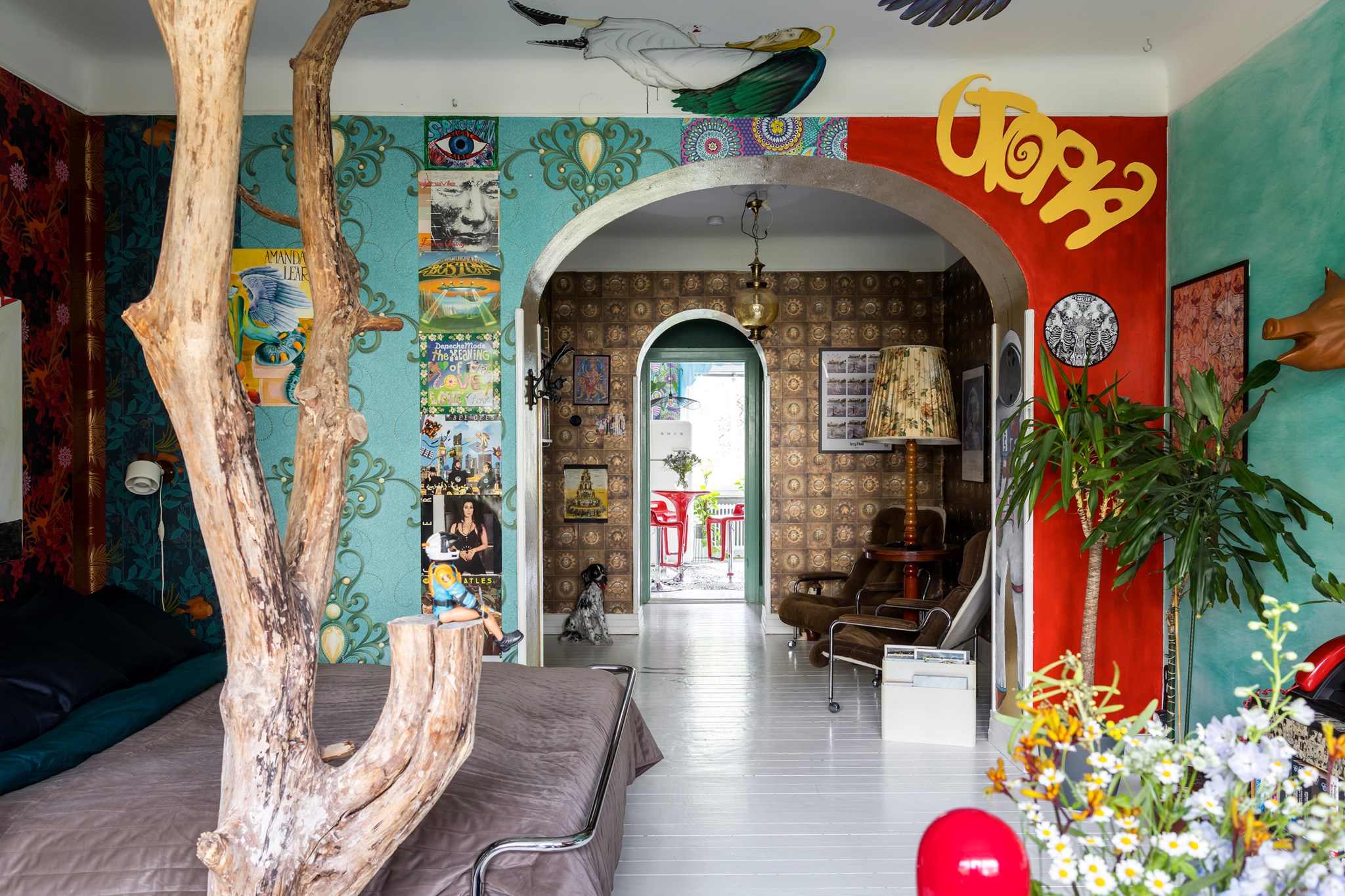 Lekfullt, brokigt och personligt. En halvtrappa upp på Eslövsgatan 9E väntar en färgstark våning inredd direkt från hjärtat. Här möts vi av 44 kvadratmeter med genomgående planlösning och originalkök. Det vitmålade brädgolvet utgör en ljus bas för färgsprakande detaljer och personlig konst. Istället för ”less is more” regerar här mottot ”mer av allt”. Det är ett hem där taket fungerar som en tavla och hela atmosfären påminner om ett levande konstgalleri; här samsas helgonbilder och actionfigurer med unika väggmålningar. Genom konstnärliga uttryck har små rum i rummen skapats, samtidigt som tidstypiska originaldetaljer som takrosetter, spegeldörrar och gjutjärnselement bevarats. Mötet mellan den påhittiga inredningen och 30-tals charmen skapar en alldeles särskild karaktär. Huset är ritat av arkitekten Carl Rosell, som värnade om de stora innergårdarna – en vision som lever vidare än idag. I föreningen Häggen, stabil och anrik sedan byggåret 1936, bor en härlig blandning av pensionärer, studenter och barnfamiljer. Grannsämjan är varm och på den parkliknande innergården ryms både egna odlingar och ett gemytligt lusthus. Ljuset är på väg tillbaka och solen står allt högre över Sorgenfri. För varje dag blir kvarteren lite grönare. Välkommen till ett hem som verkligen bryter mot det strama, skandinaviska idealet och istället omfamnar maximalism och ren livsglädje.