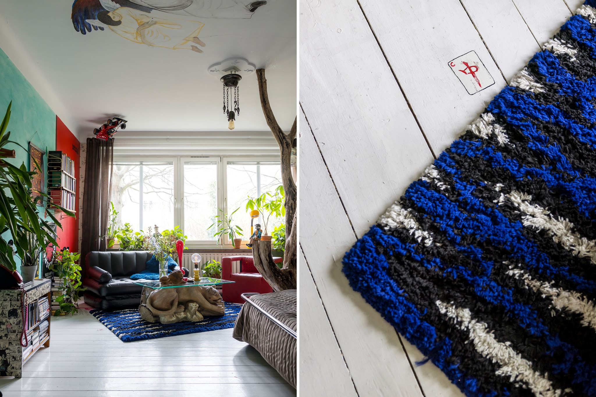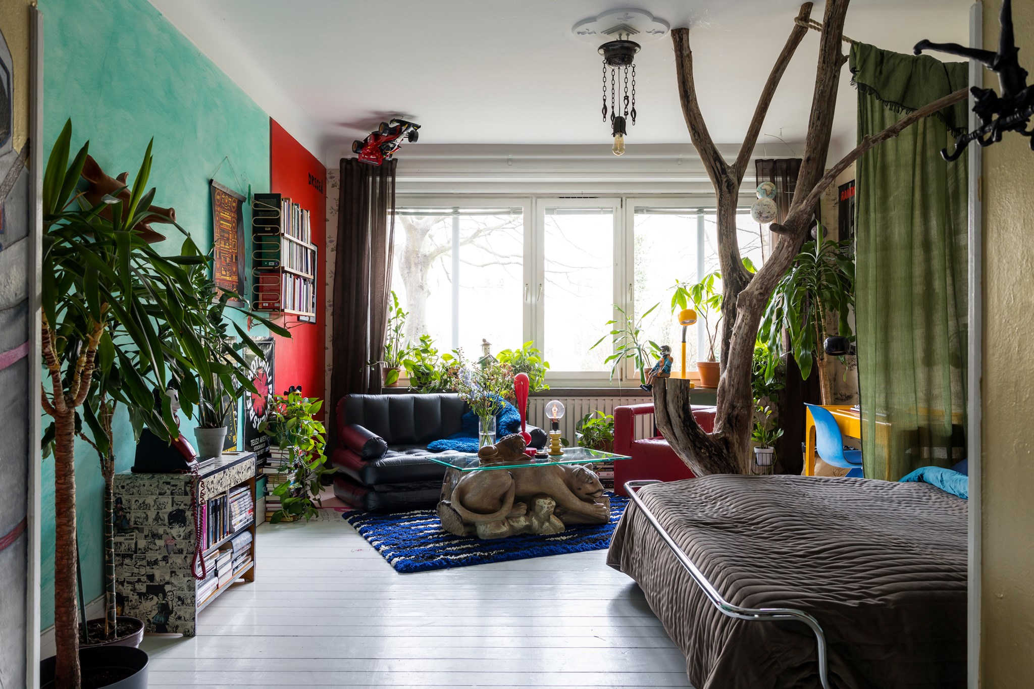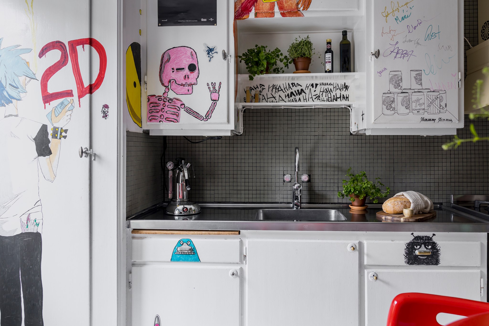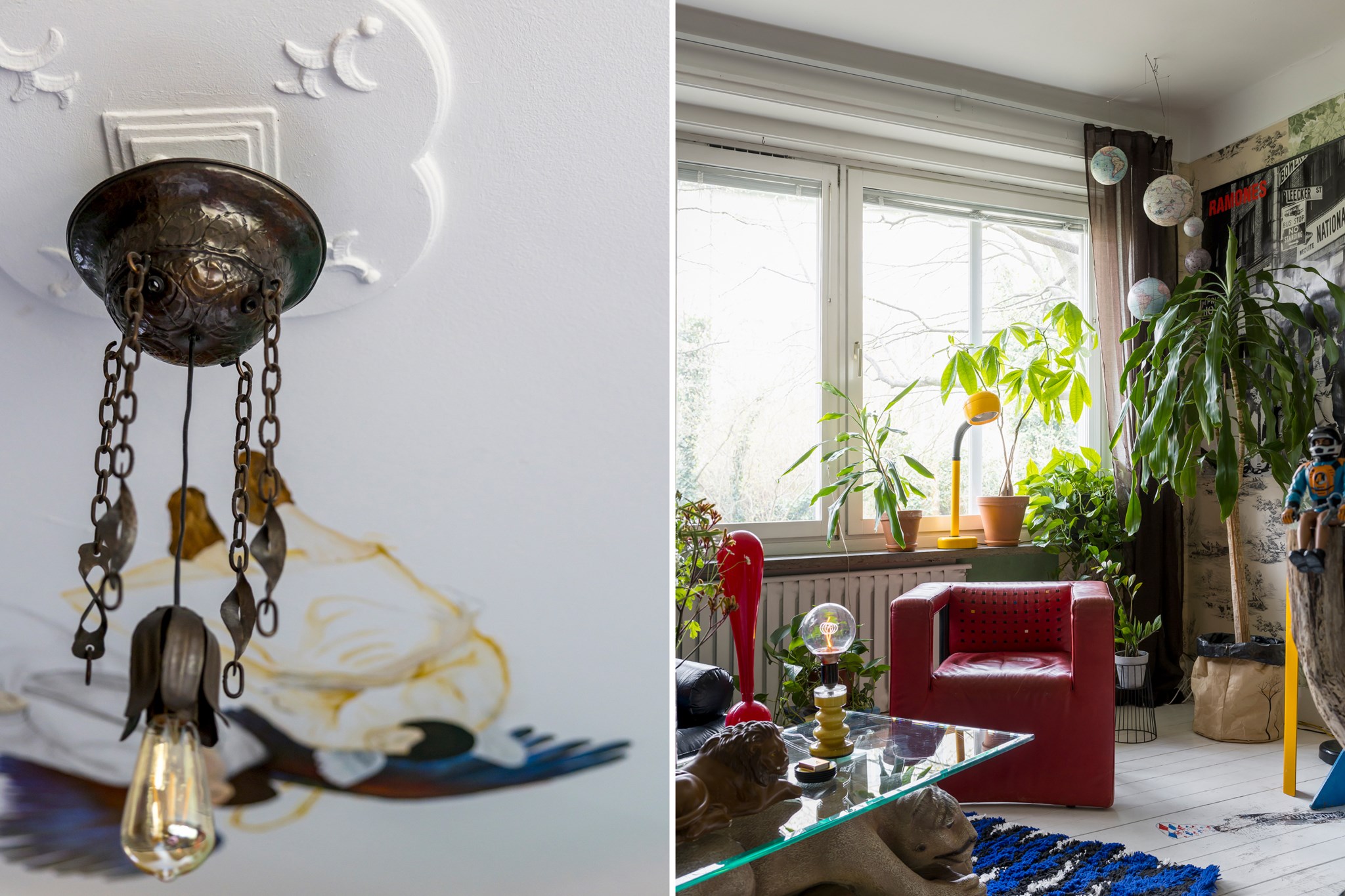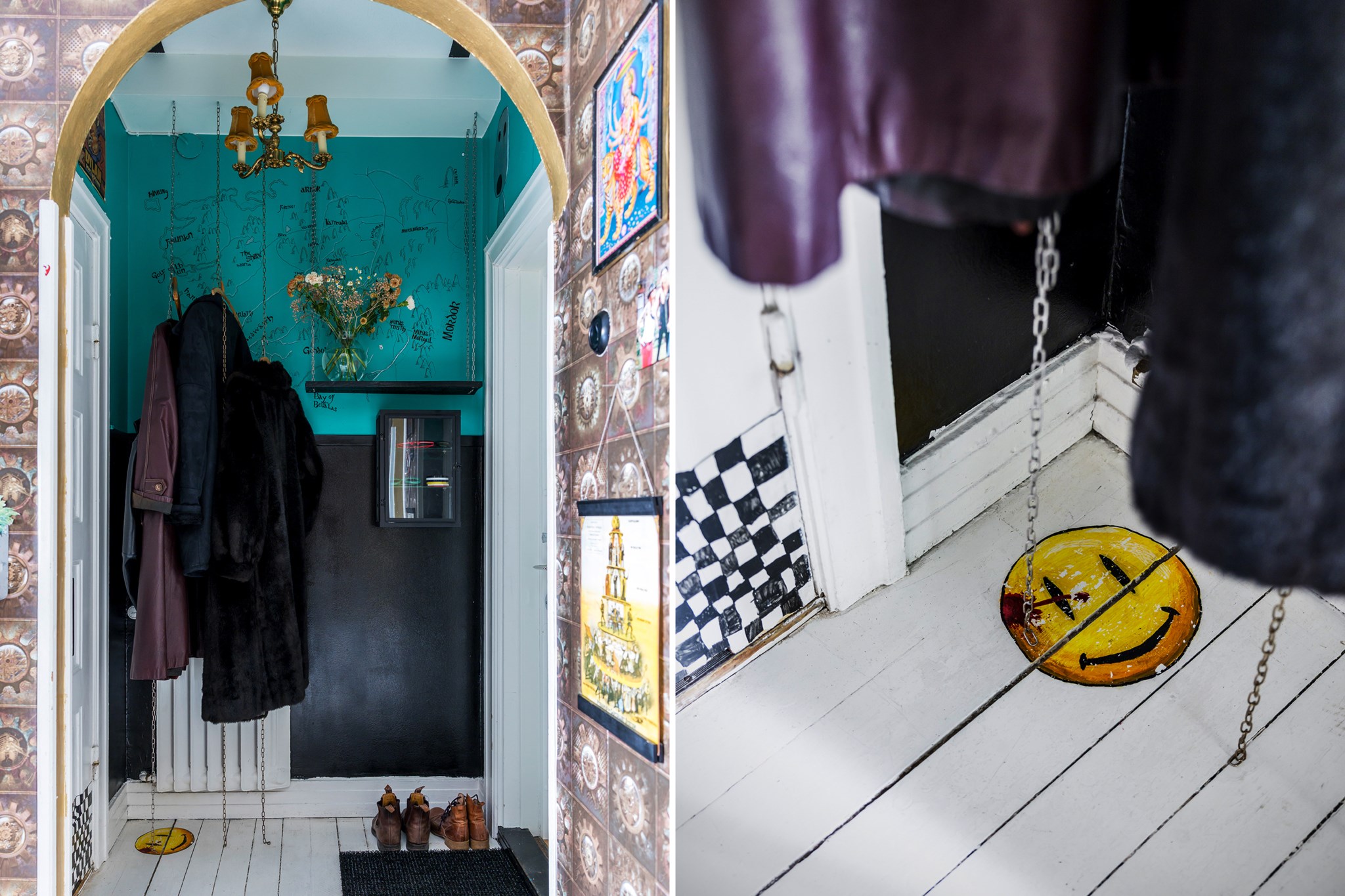 Lekfullt, brokigt och personligt. En halvtrappa upp på Eslövsgatan 9E väntar en färgstark våning inredd direkt från hjärtat. Här möts vi av 44 kvadratmeter med genomgående planlösning och originalkök. Det vitmålade brädgolvet utgör en ljus bas för färgsprakande detaljer och personlig konst. Istället för ”less is more” regerar här mottot ”mer av allt”. Det är ett hem där taket fungerar som en tavla och hela atmosfären påminner om ett levande konstgalleri; här samsas helgonbilder och actionfigurer med unika väggmålningar. Genom konstnärliga uttryck har små rum i rummen skapats, samtidigt som tidstypiska originaldetaljer som takrosetter, spegeldörrar och gjutjärnselement bevarats. Mötet mellan den påhittiga inredningen och 30-tals charmen skapar en alldeles särskild karaktär. Huset är ritat av arkitekten Carl Rosell, som värnade om de stora innergårdarna – en vision som lever vidare än idag. I föreningen Häggen, stabil och anrik sedan byggåret 1936, bor en härlig blandning av pensionärer, studenter och barnfamiljer. Grannsämjan är varm och på den parkliknande innergården ryms både egna odlingar och ett gemytligt lusthus. Ljuset är på väg tillbaka och solen står allt högre över Sorgenfri. För varje dag blir kvarteren lite grönare. Välkommen till ett hem som verkligen bryter mot det strama, skandinaviska idealet och istället omfamnar maximalism och ren livsglädje.