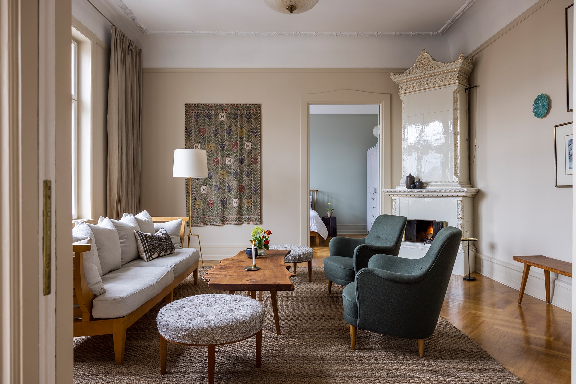 Personligt i pampiga miljöer, här har man lyckats med det smått omöjliga. Vi är näst högst upp i huset som går under namnet Gustav Adolfs palatset anno 1908, våningen har tre eleganta salonger i fil har vackert dekorerad kakelugn, pardörrar, höga originalfönster med kulturglas, burspråk och fransk balkong. Fyra rum och kök är disponerade på 110 kvadrat och har en fantastisk volym samt närvaro av den tongivande tiden kring sekelskiftet. Rummen är målade i väl avvägda toner från Farrow and Ball, mjuka färger ton i ton på väggar och foder som framhäver både arkitekturen och inredningen. Inåt gården charmas vi av det vackra köket från Kvänum, platsbyggt med bänkskiva i metall och serveringsskåp intill, bakom målad spegeldörr finns skafferiet bevarat. Vägg i vägg ligger våningens andra sovrum med utgång ut till den generösa balkongen, det stora fikonträdet vajar i vinden och innergården nedanför omgärdas av de putsade fasaderna i varm gul ton. Läget här i kvarteret Jasminen är perfekt, några minuters promenad till gågatan, Triangeln och charmiga torget vid S:t Knut. Vackra Rörsjöstaden är lätt att trivas i. Varmt välkomna!