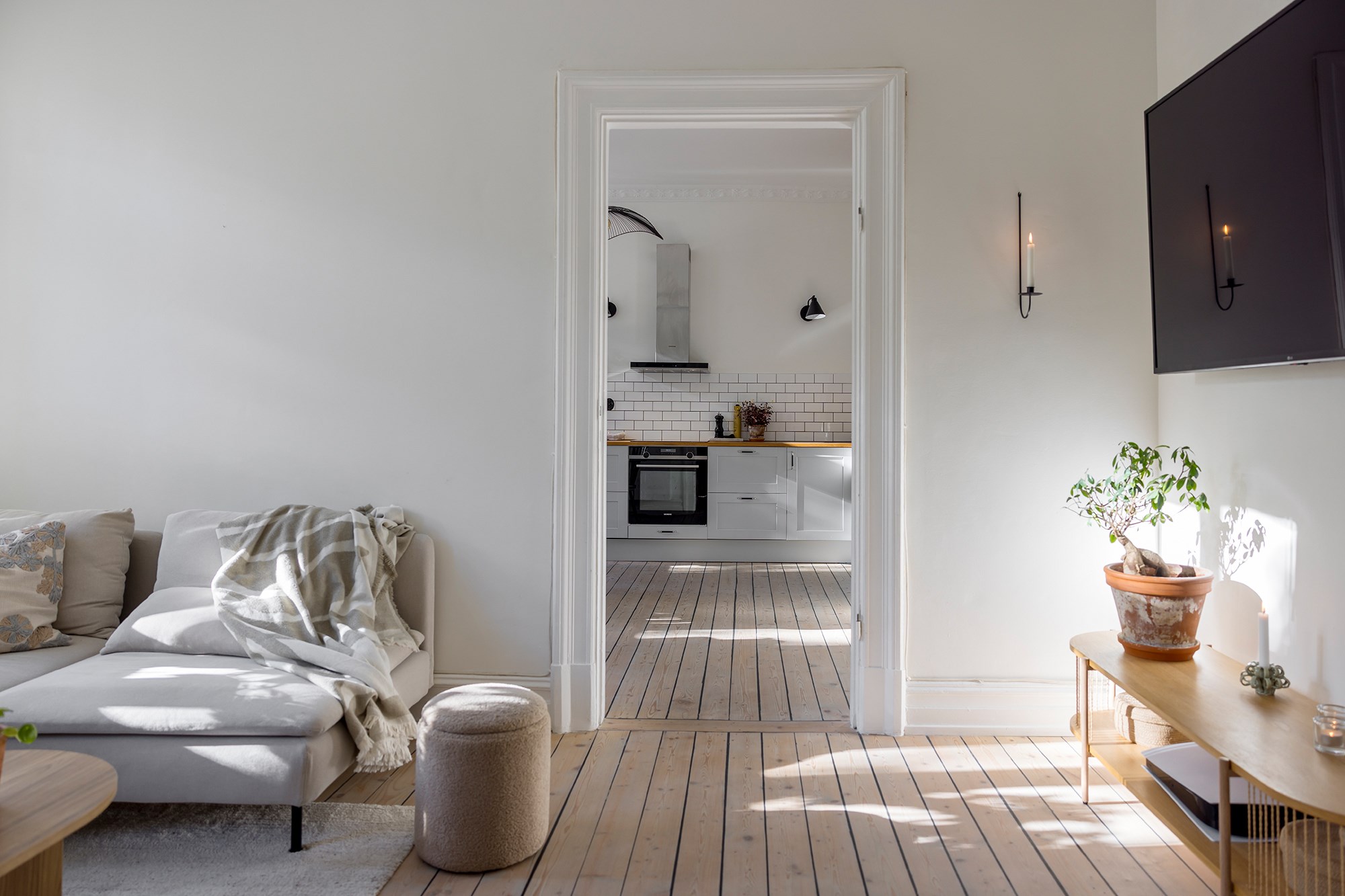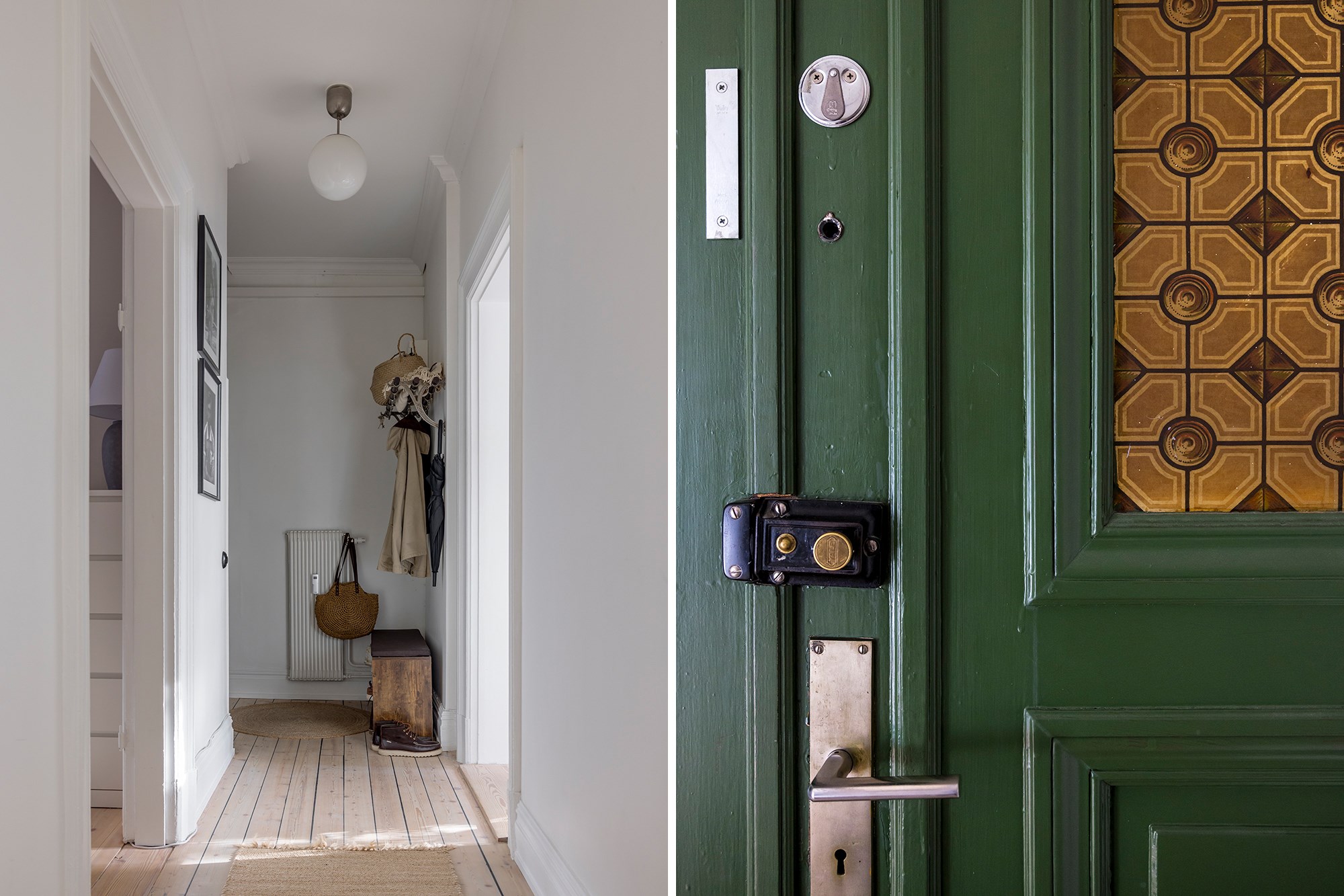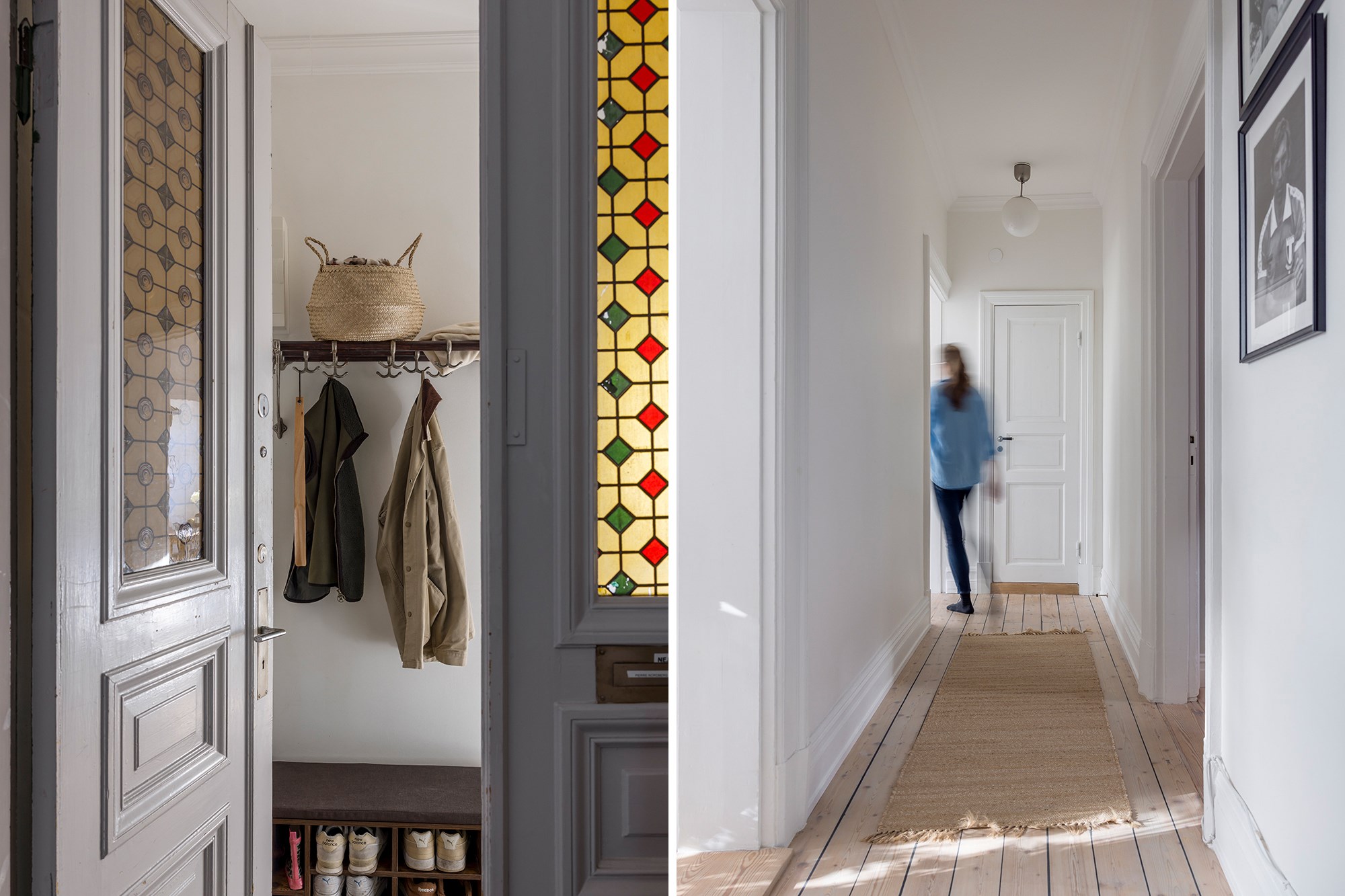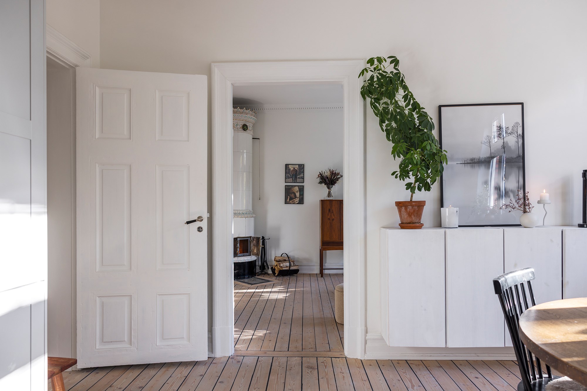 Vackra dubbeldörrar, brädgolv och ljusa väggar. Plats för avhängning direkt till vänster.