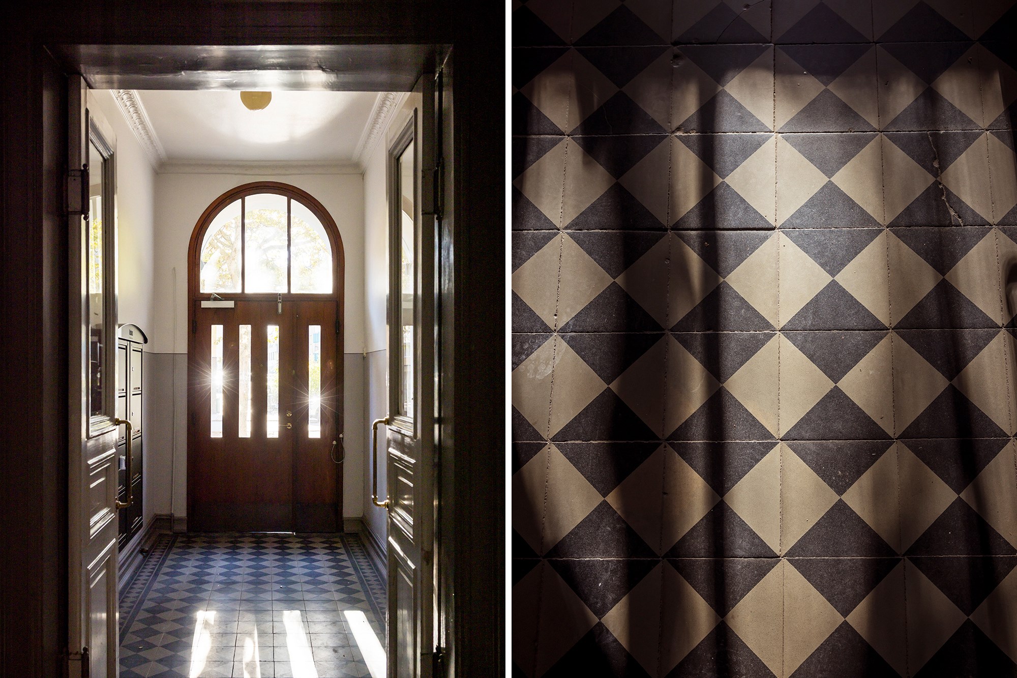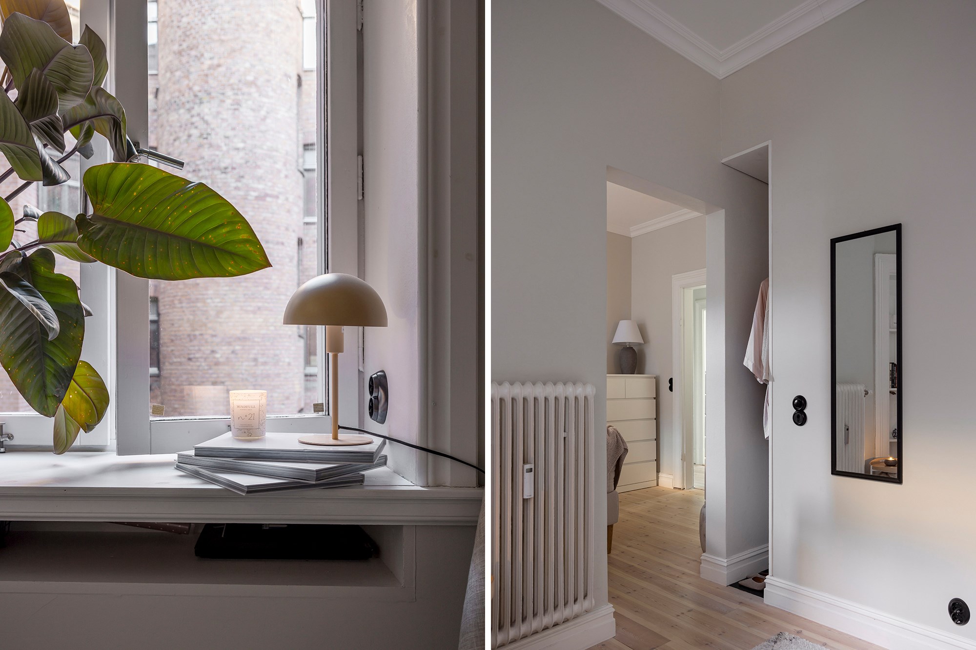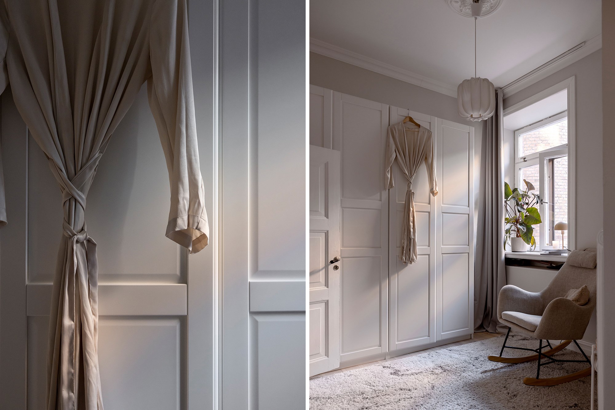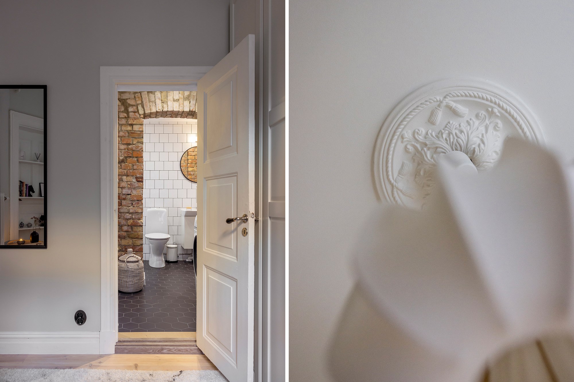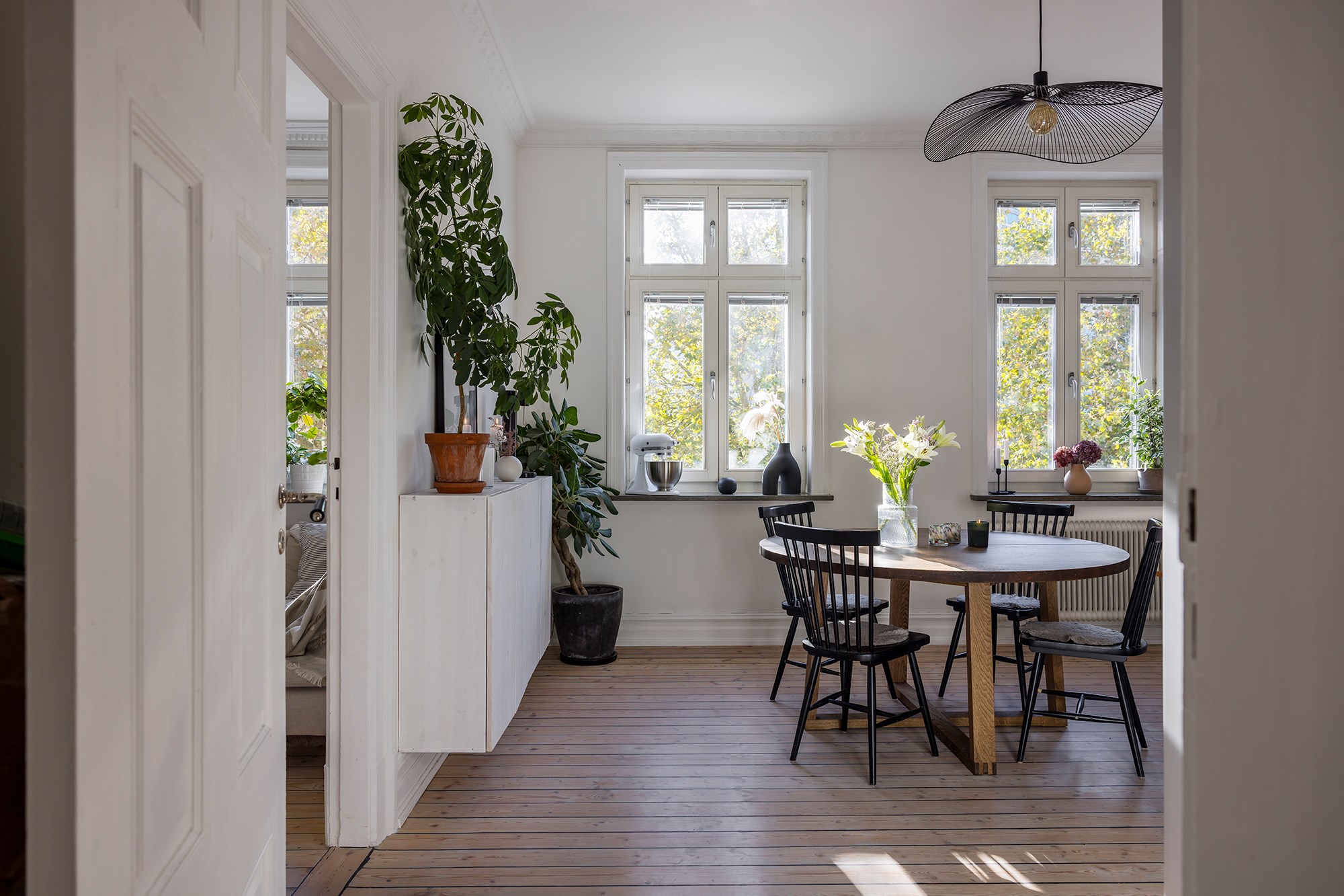 Vackra dubbeldörrar, brädgolv och ljusa väggar. Plats för avhängning direkt till vänster.