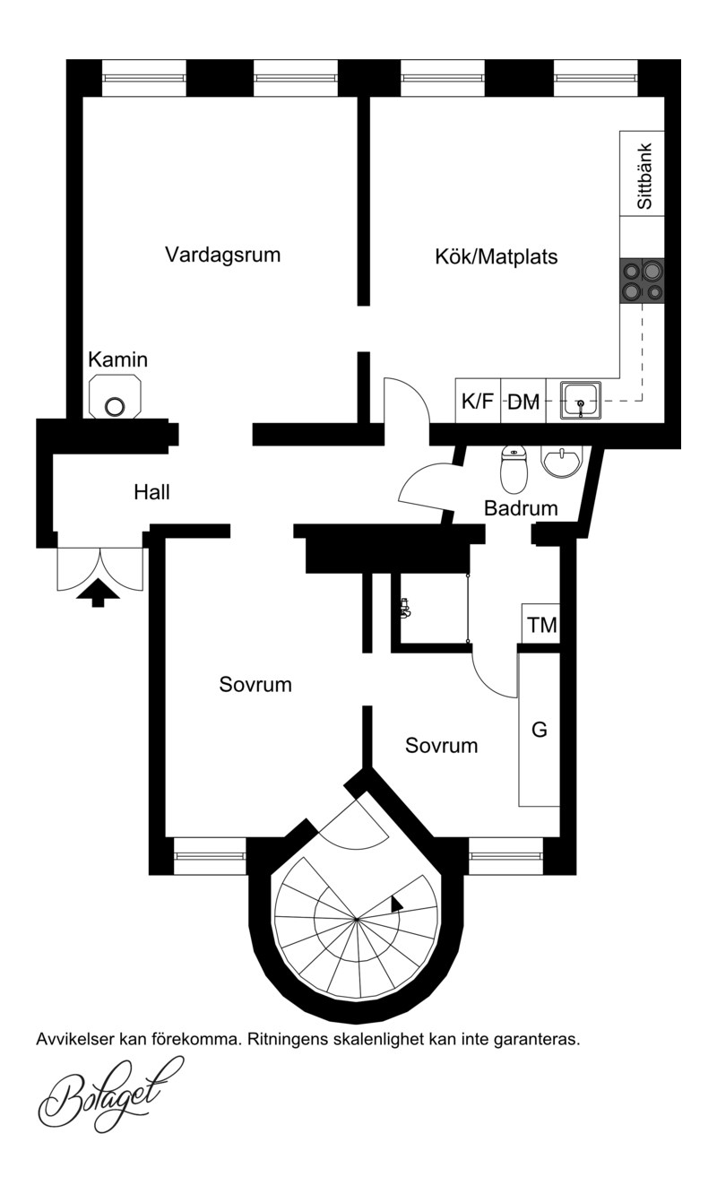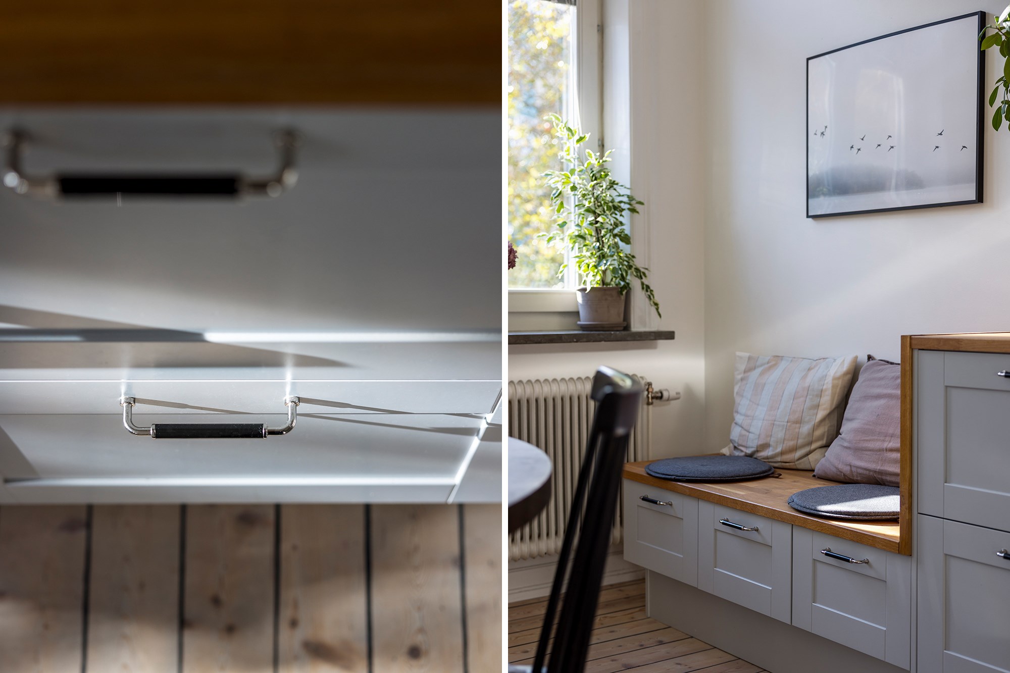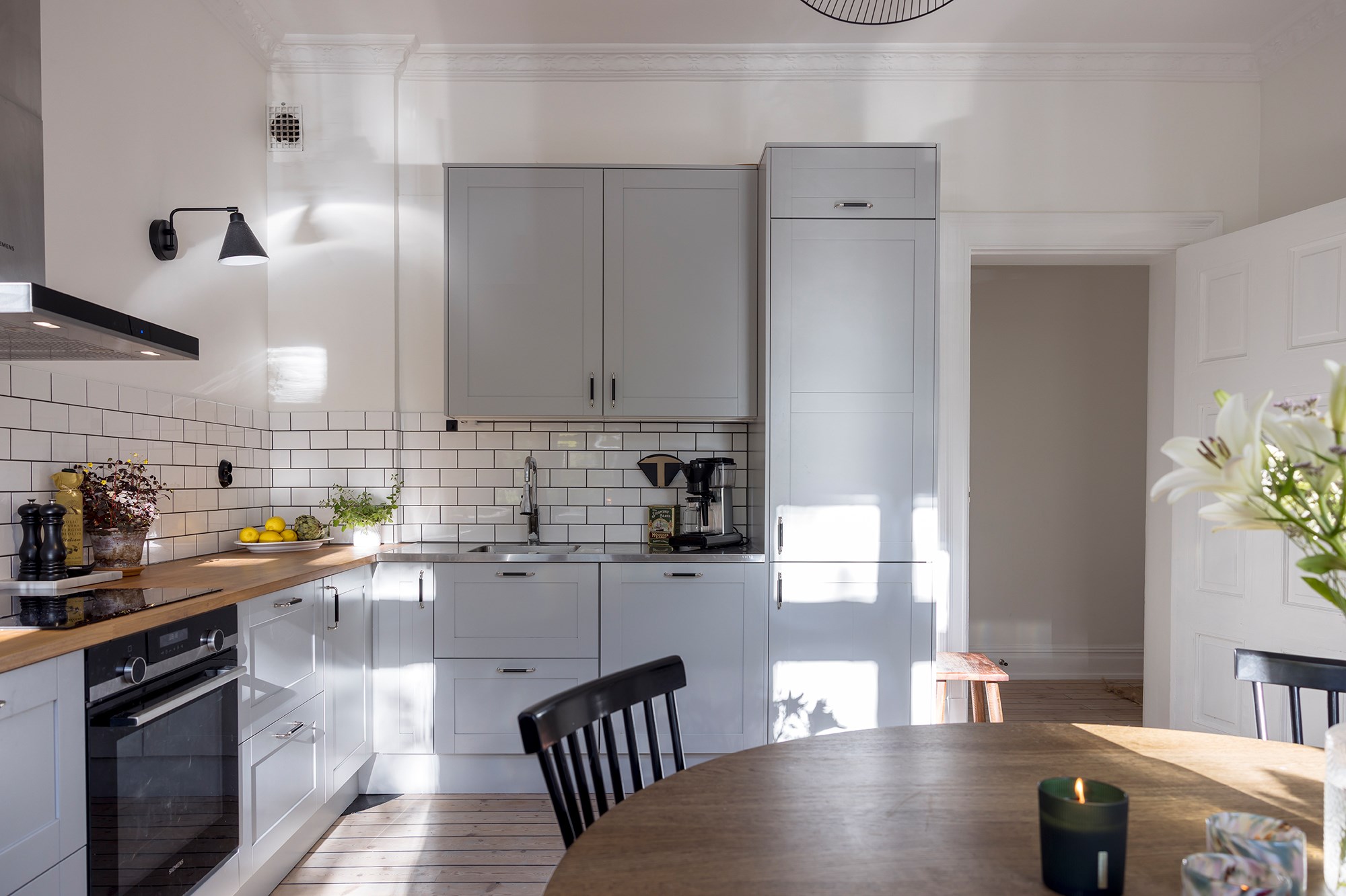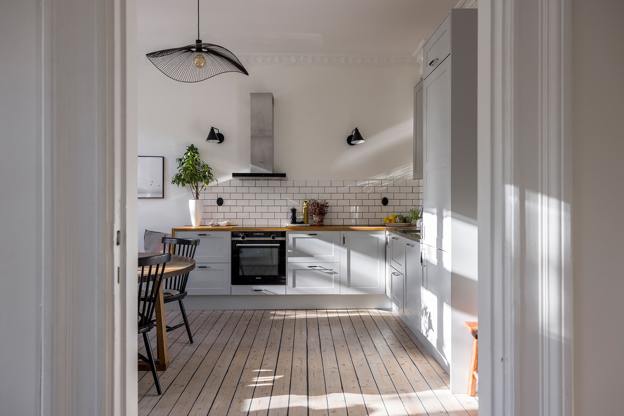 Brädgolv och ljusa väggar. Stuckaturer och högt i tak. Platsbyggt kök med plats för matbord och stolar som bjuder in till härliga middagar med familj och vänner. Här finns kyl/frys, diskmaskin, ugn, spishäll och fläkt. Ligger i fil med vardagsrummet.
