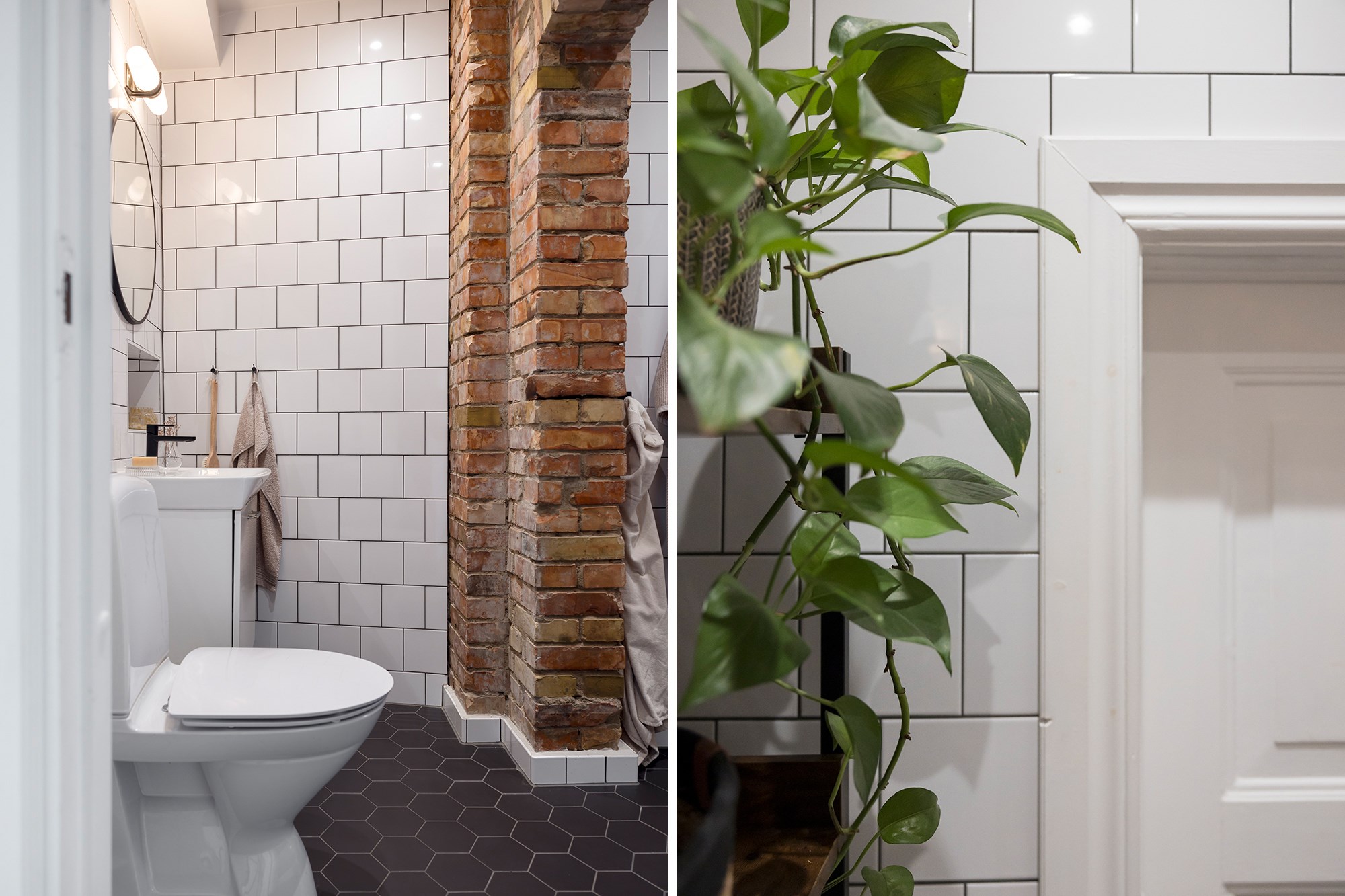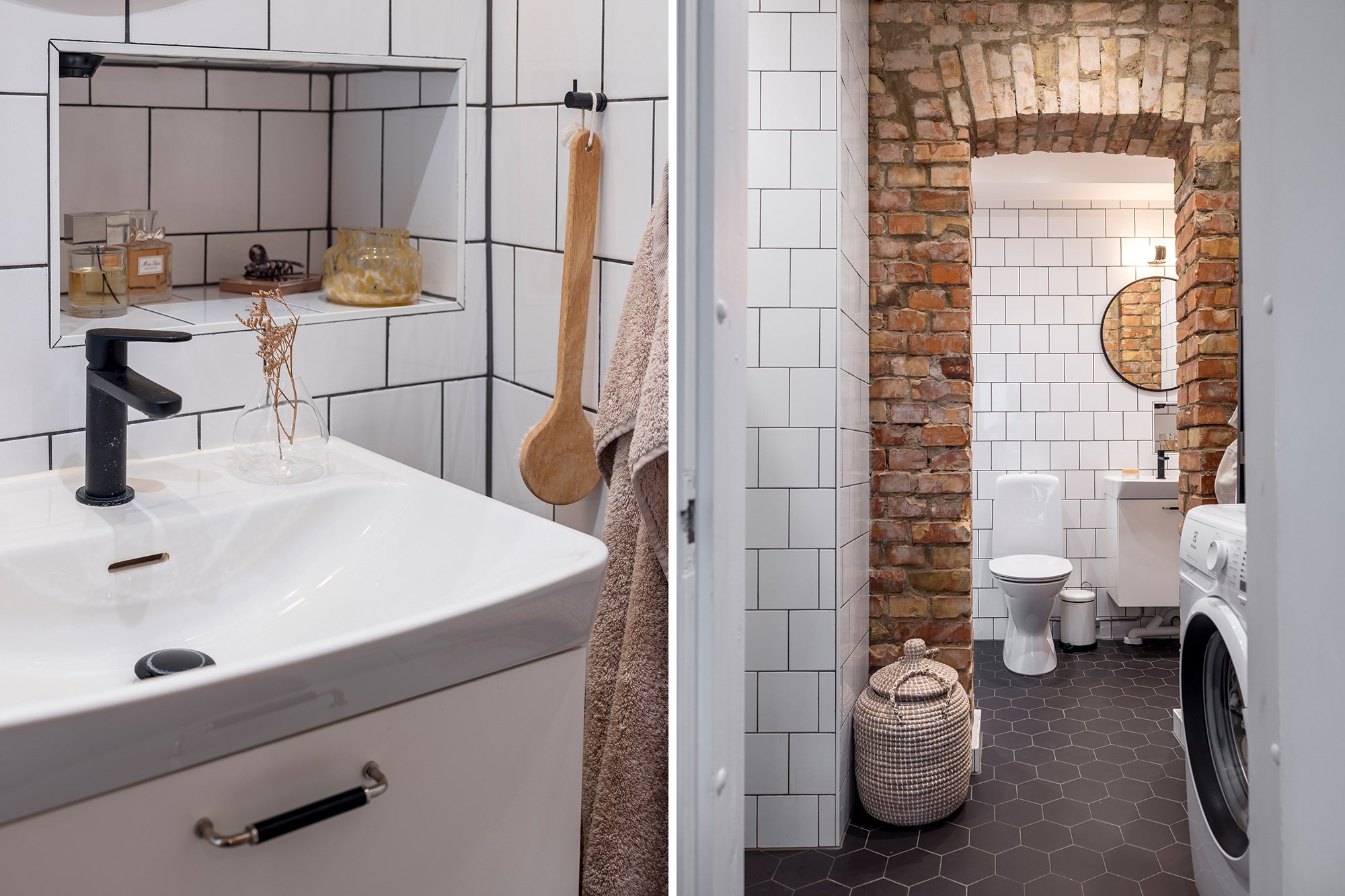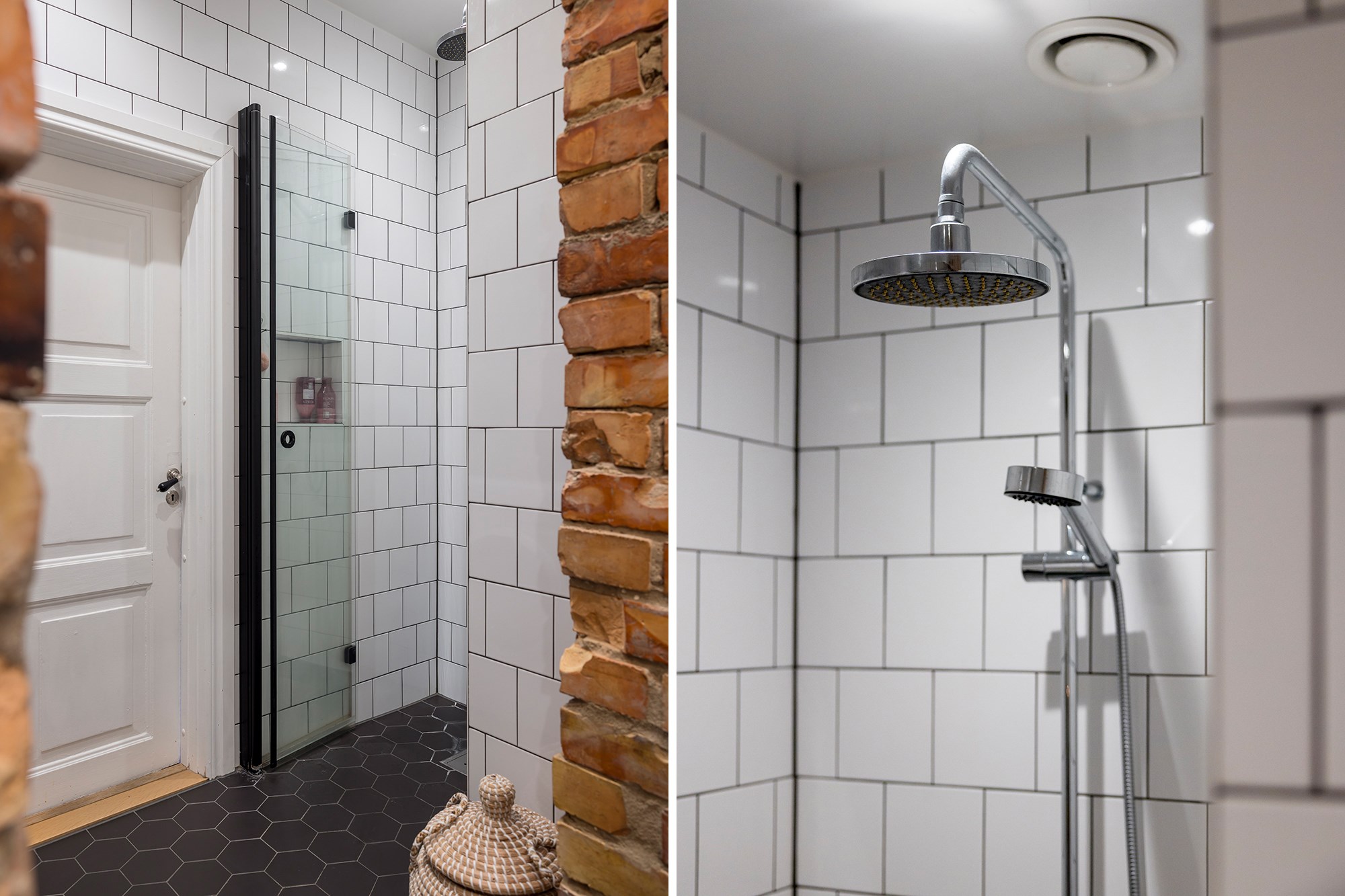 Helkaklat badrum med tvättmaskin, wc, dusch med glasvägg, handduksvärmare och handfat med kommod. Du kan nå badrummet från två håll, både från hallen och från det mindre sovrummet.