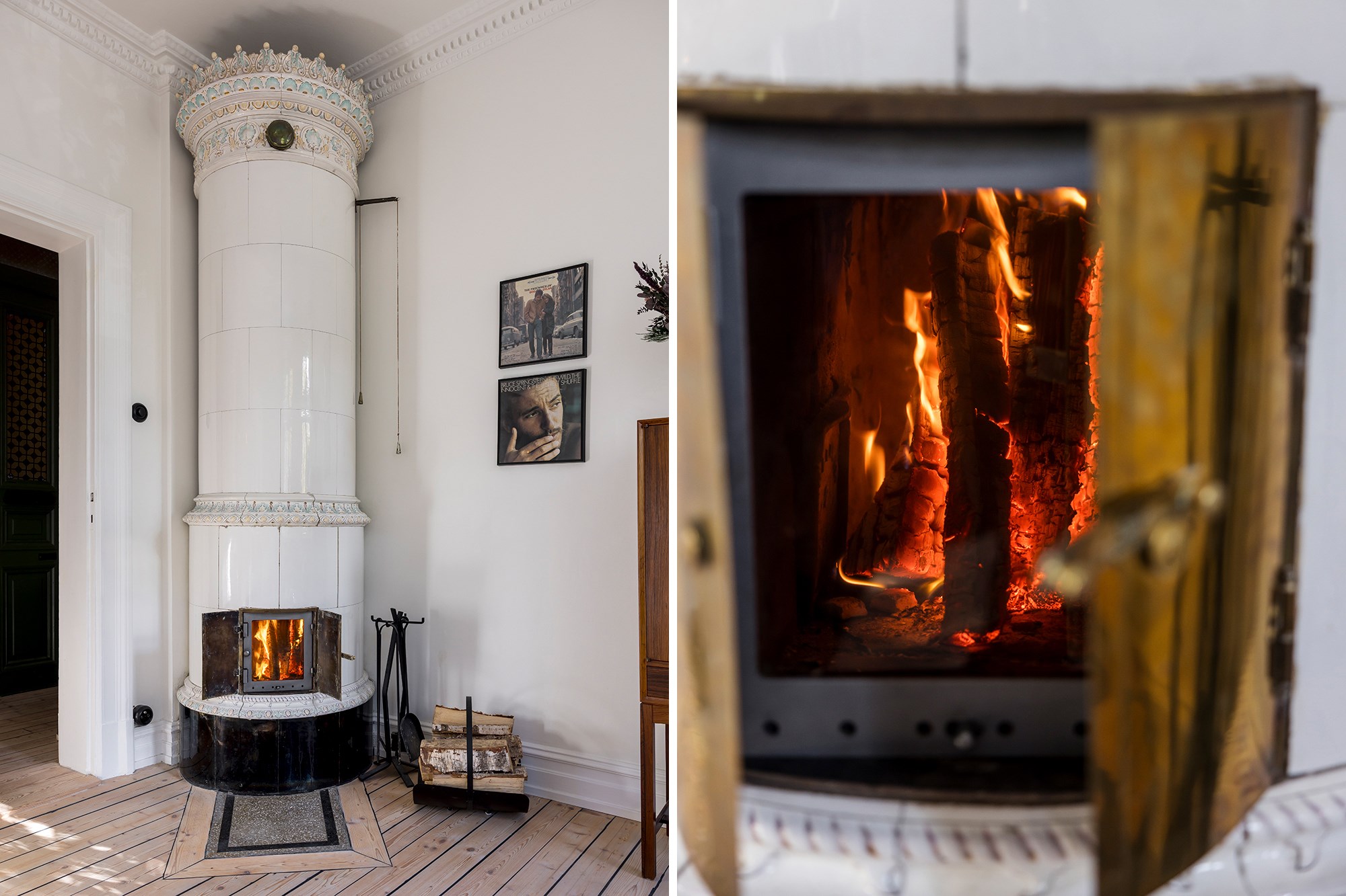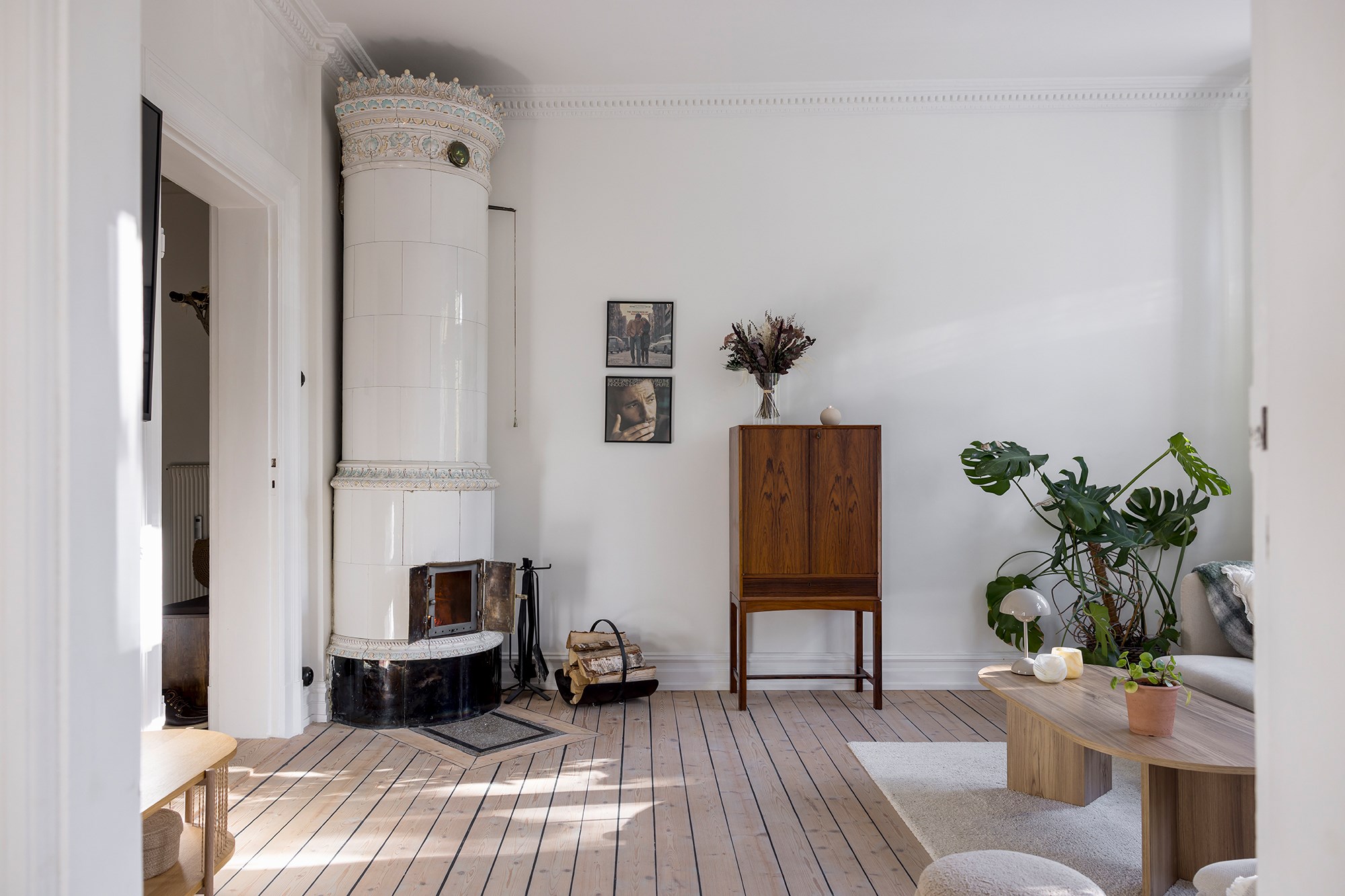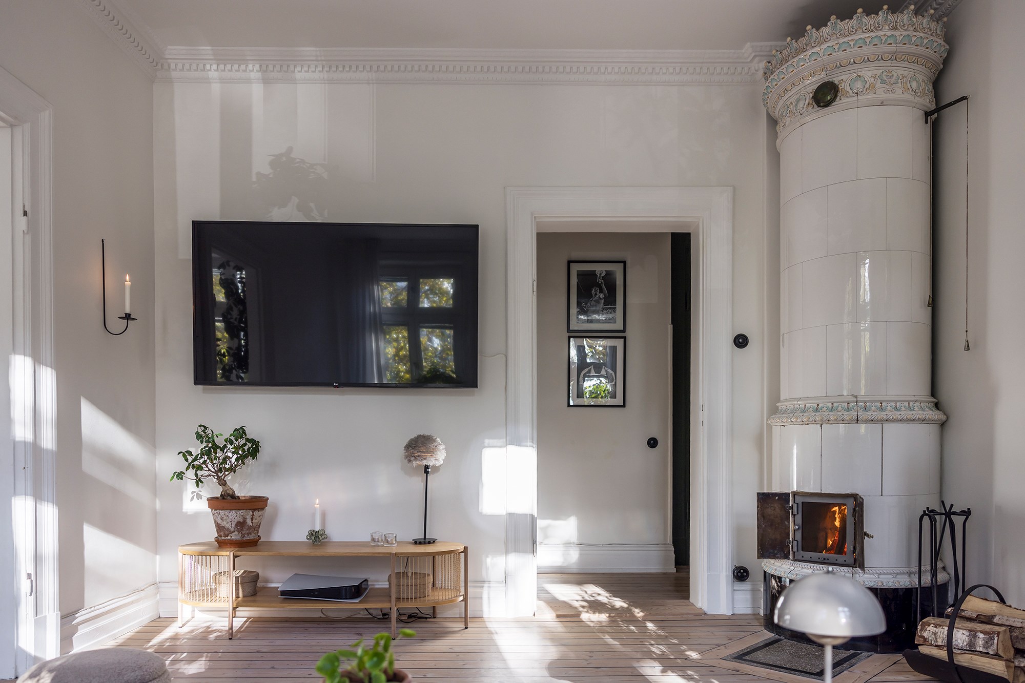 Brädgolv och ljusa väggar. Stuckaturer och högt i tak. Socialt och trivsamt rum med fungerande kakelugn och härligt ljusinsläpp. Ligger i fil med köket.